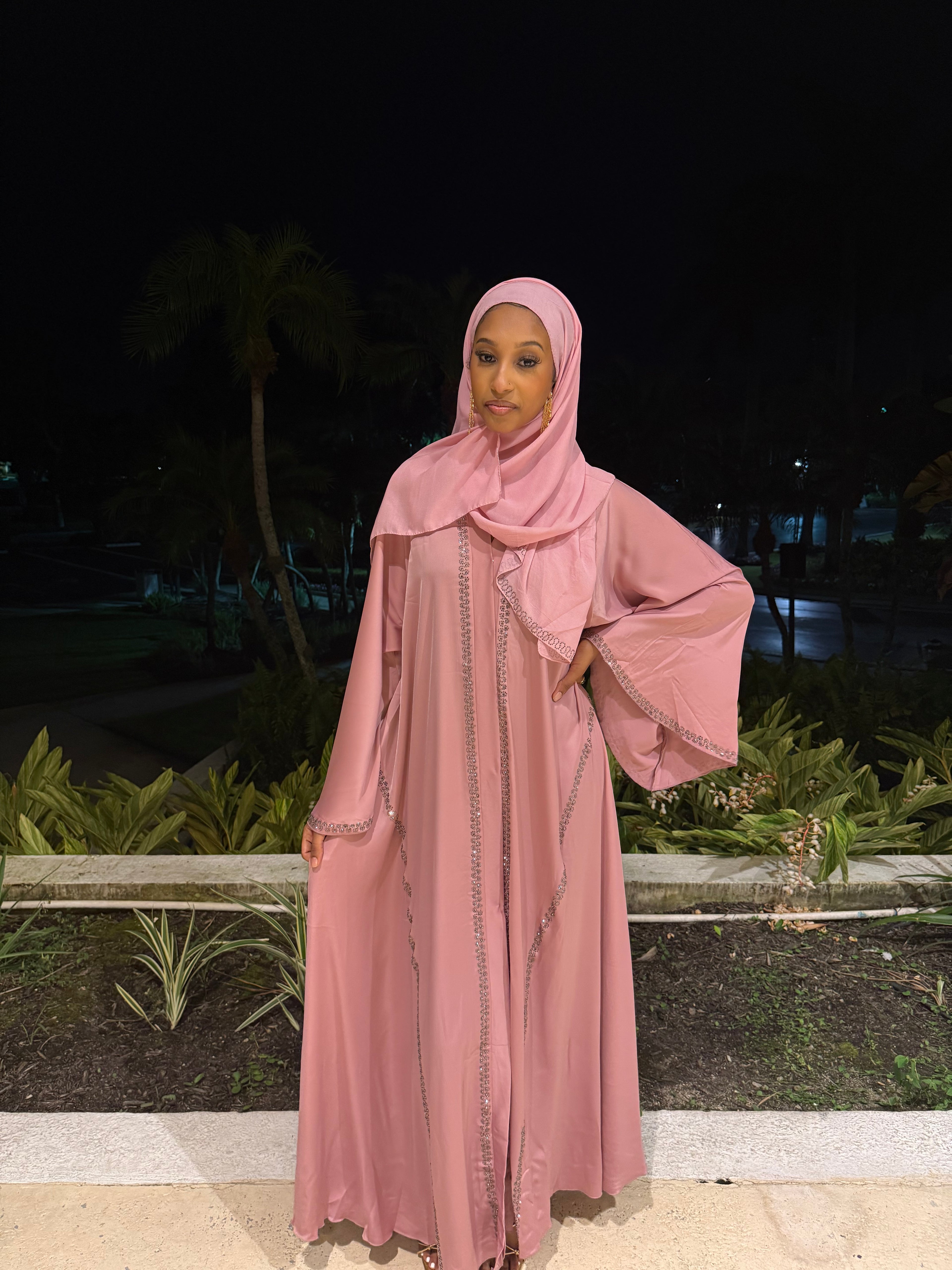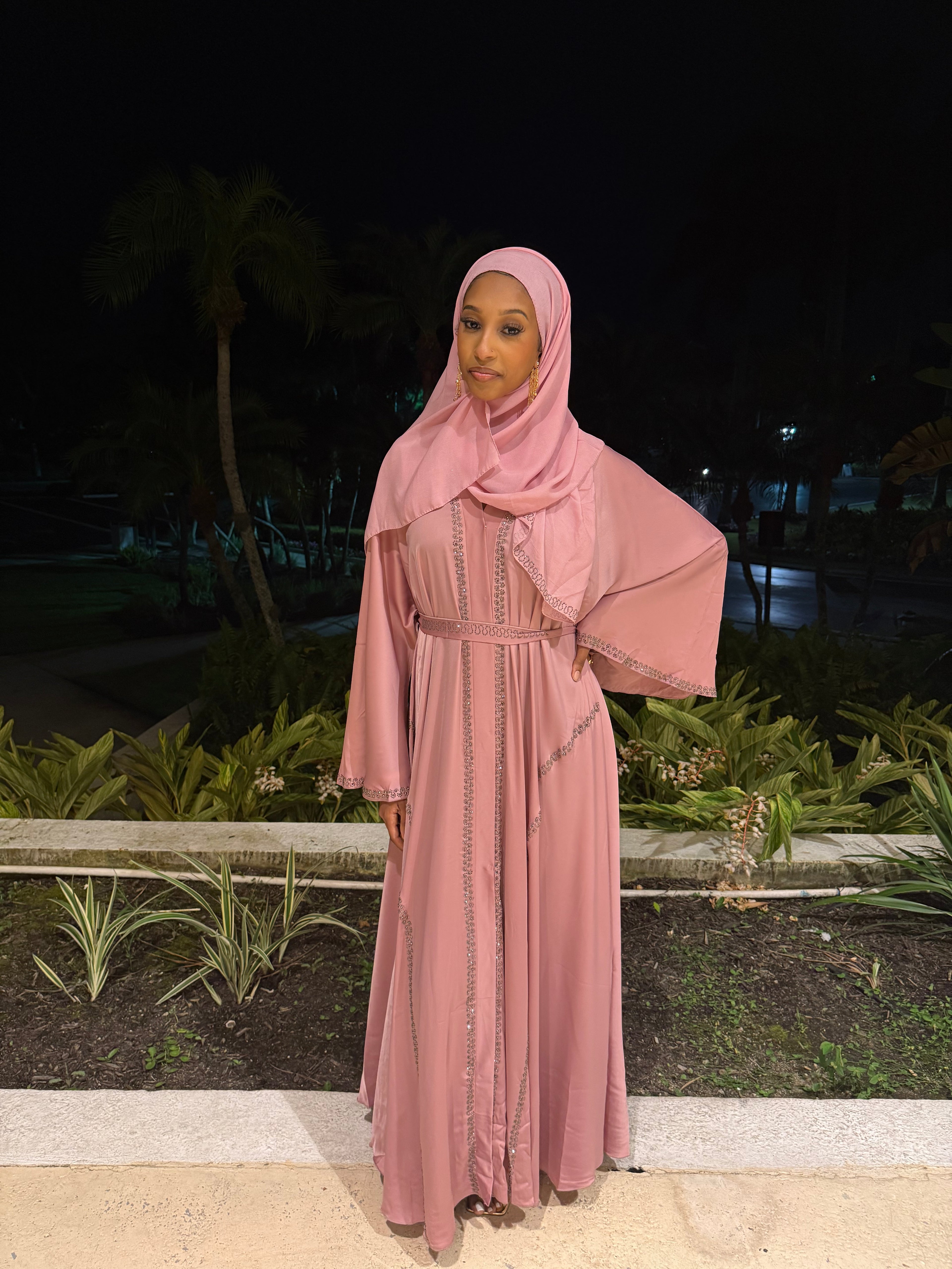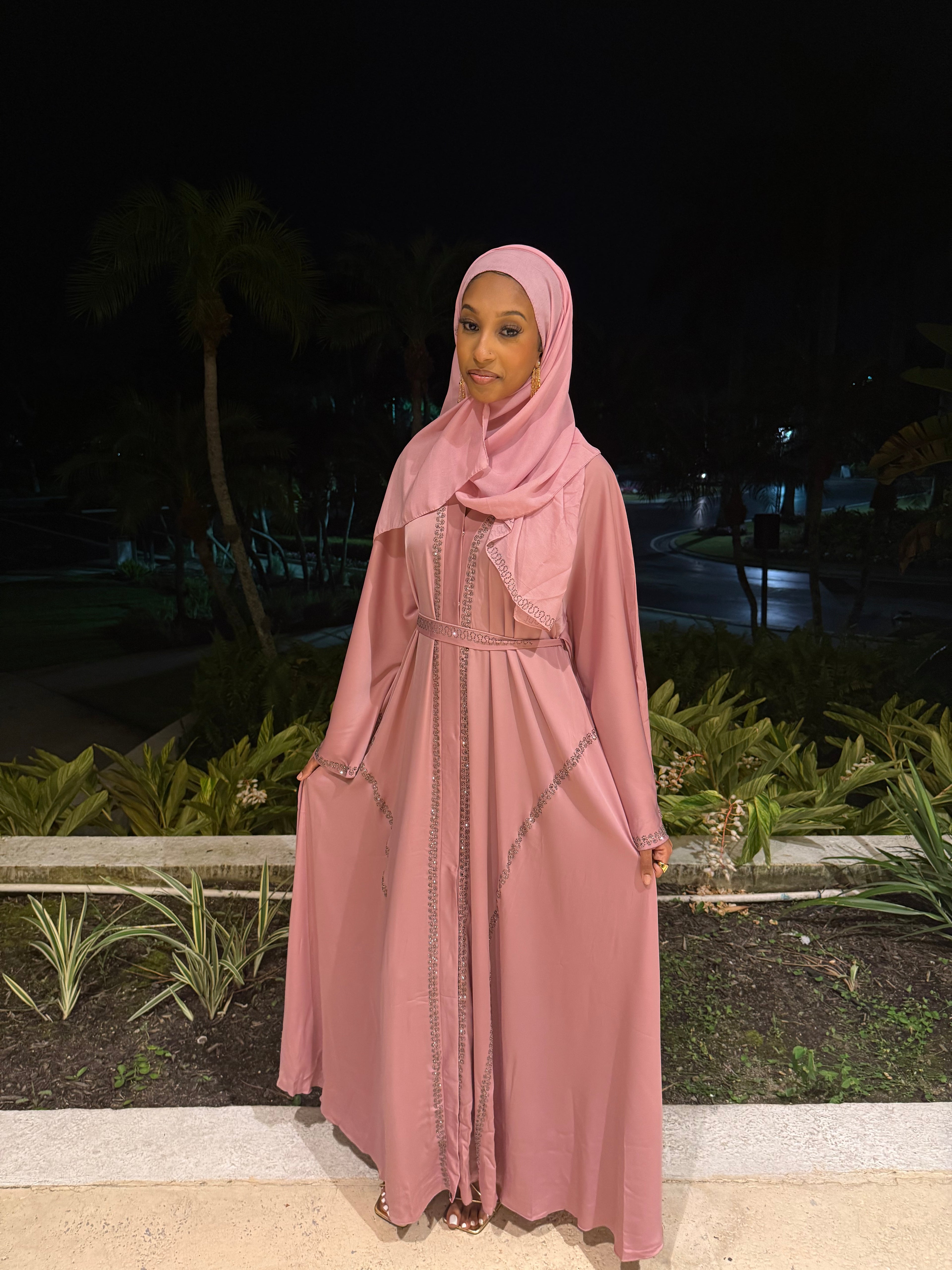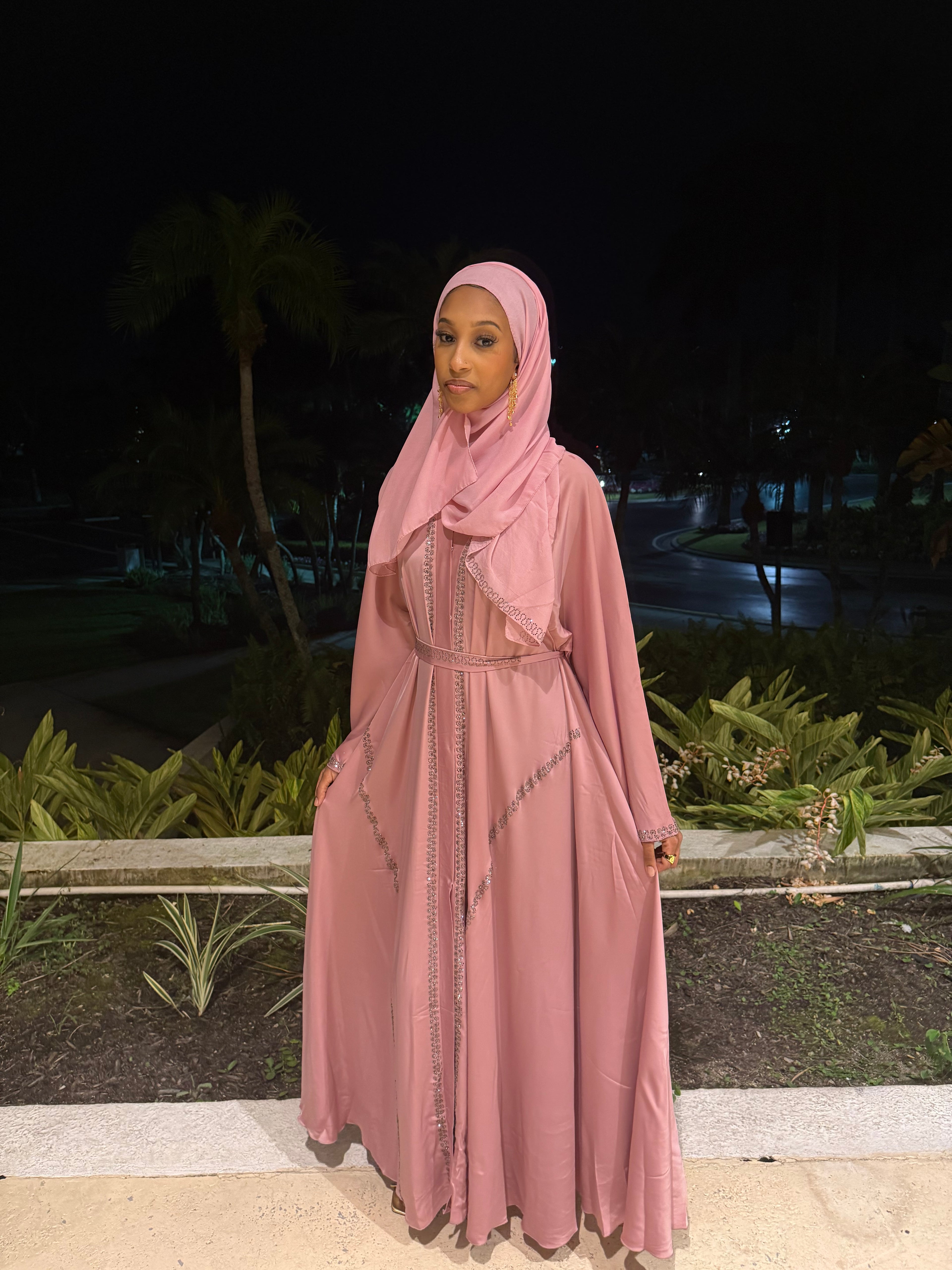 This elegant abaya set features soft pink satin adorned with silver rhinestone detailing. The set includes a matching abaya, hijab, and belt, offering a refined and cohesive look. Ideal for formal occasions, it combines modesty with timeless style.