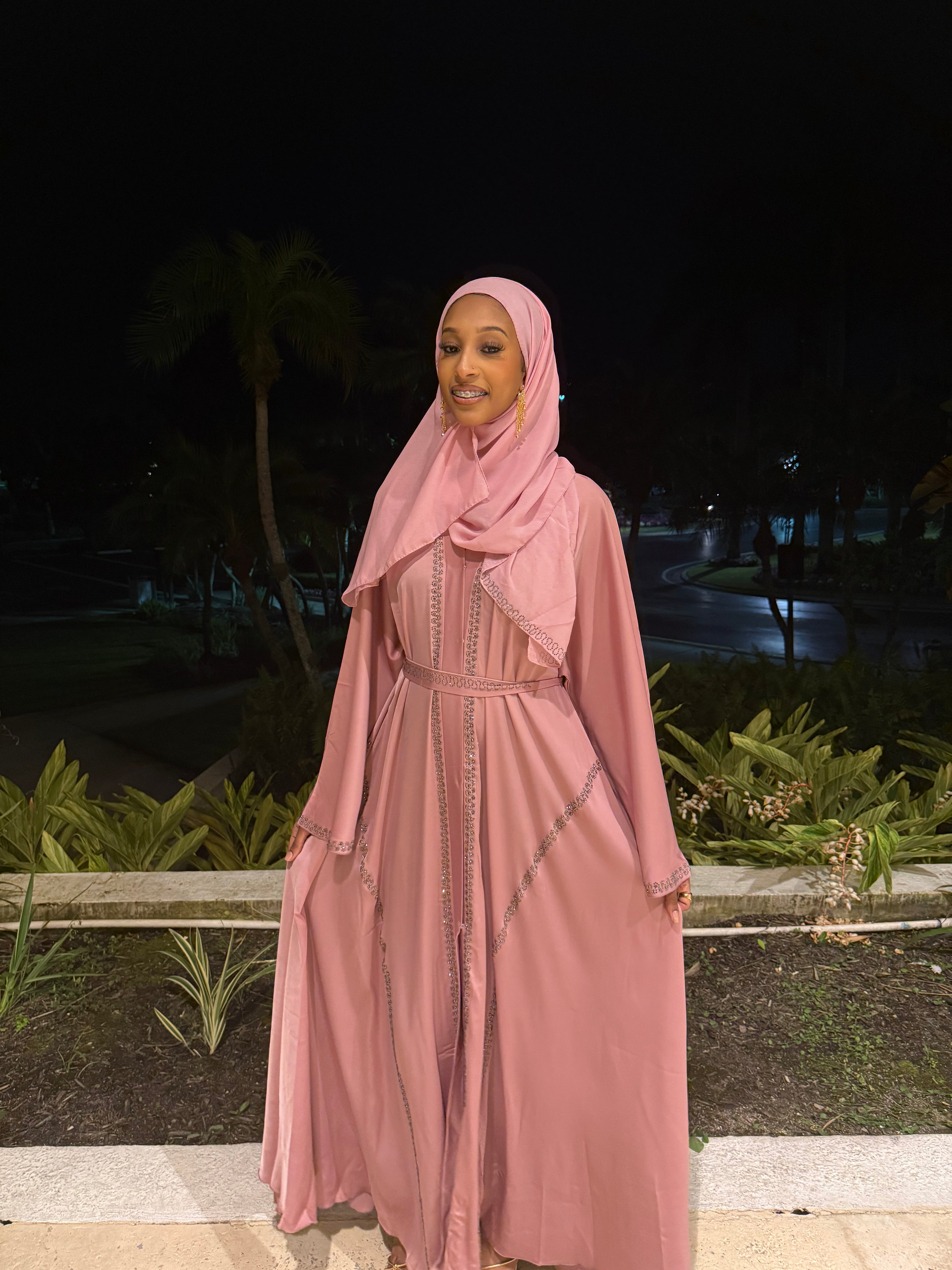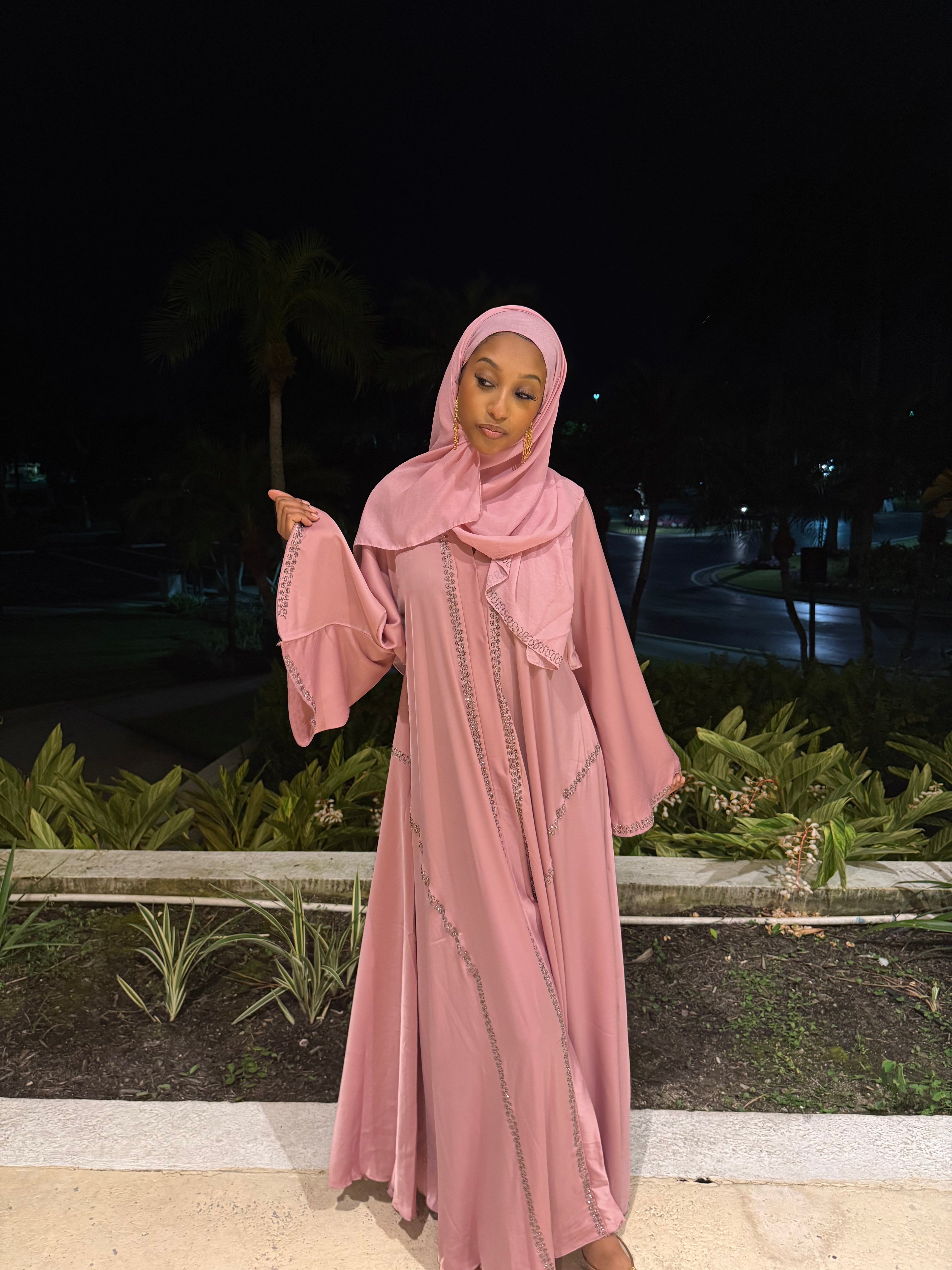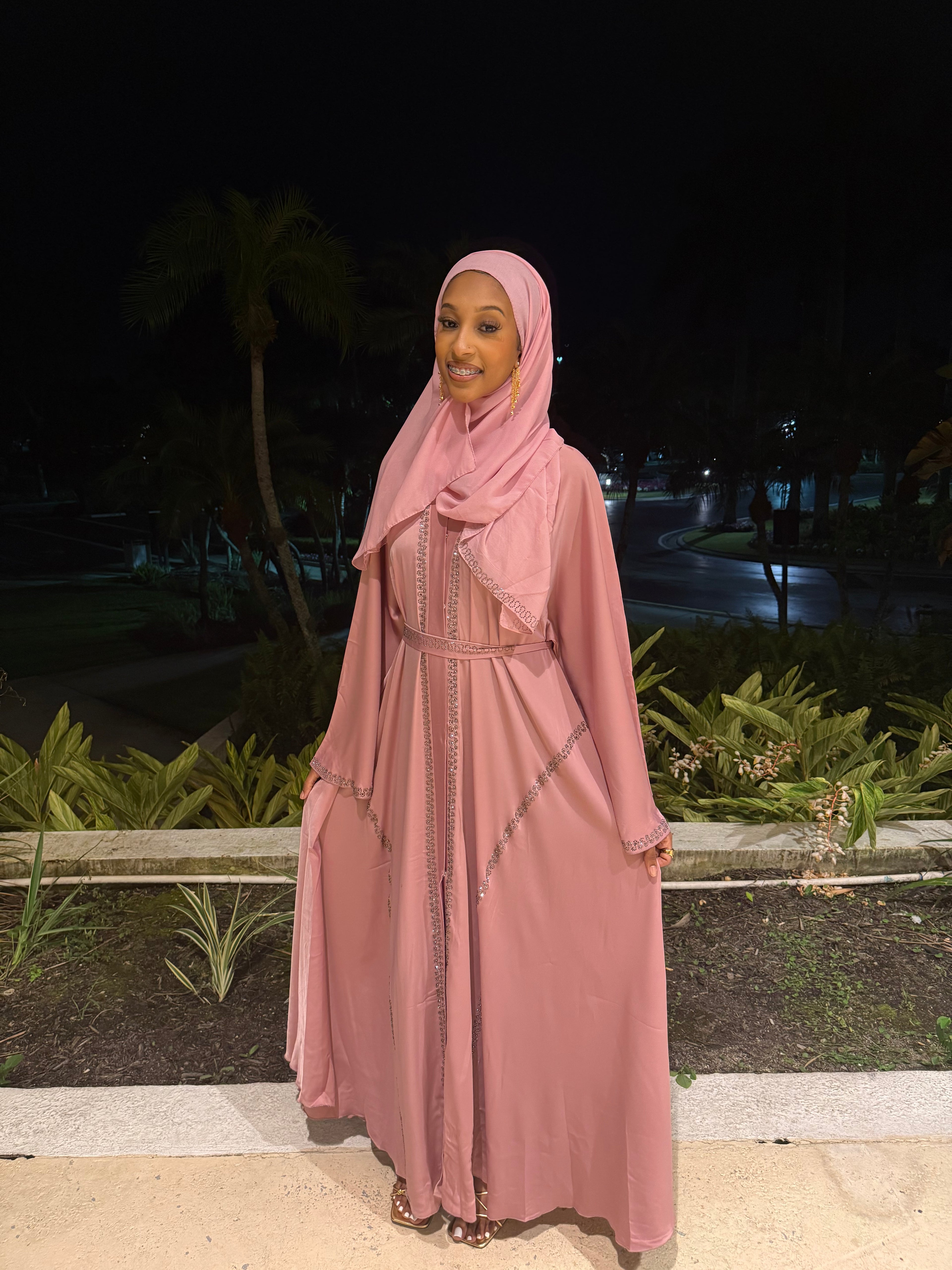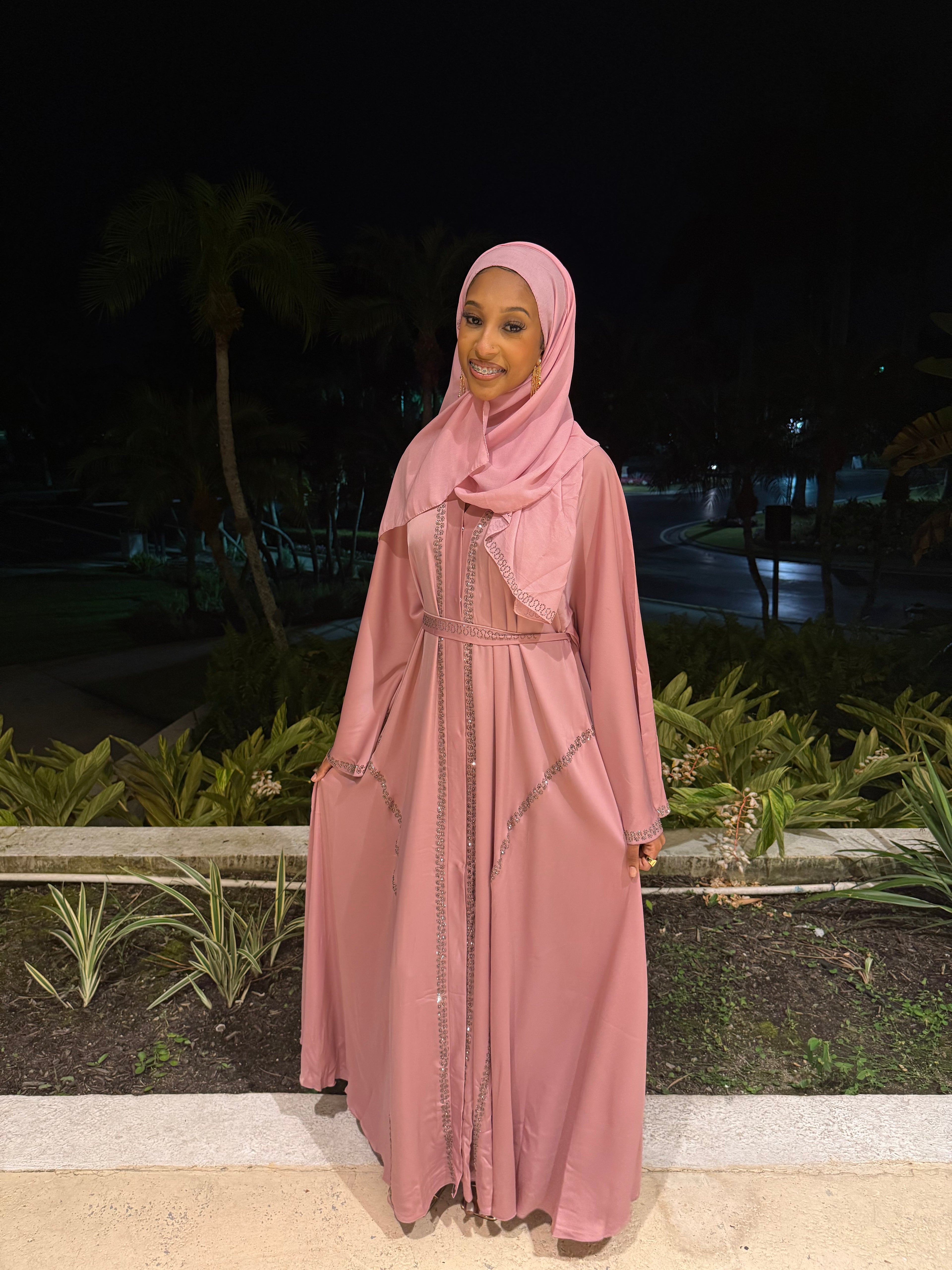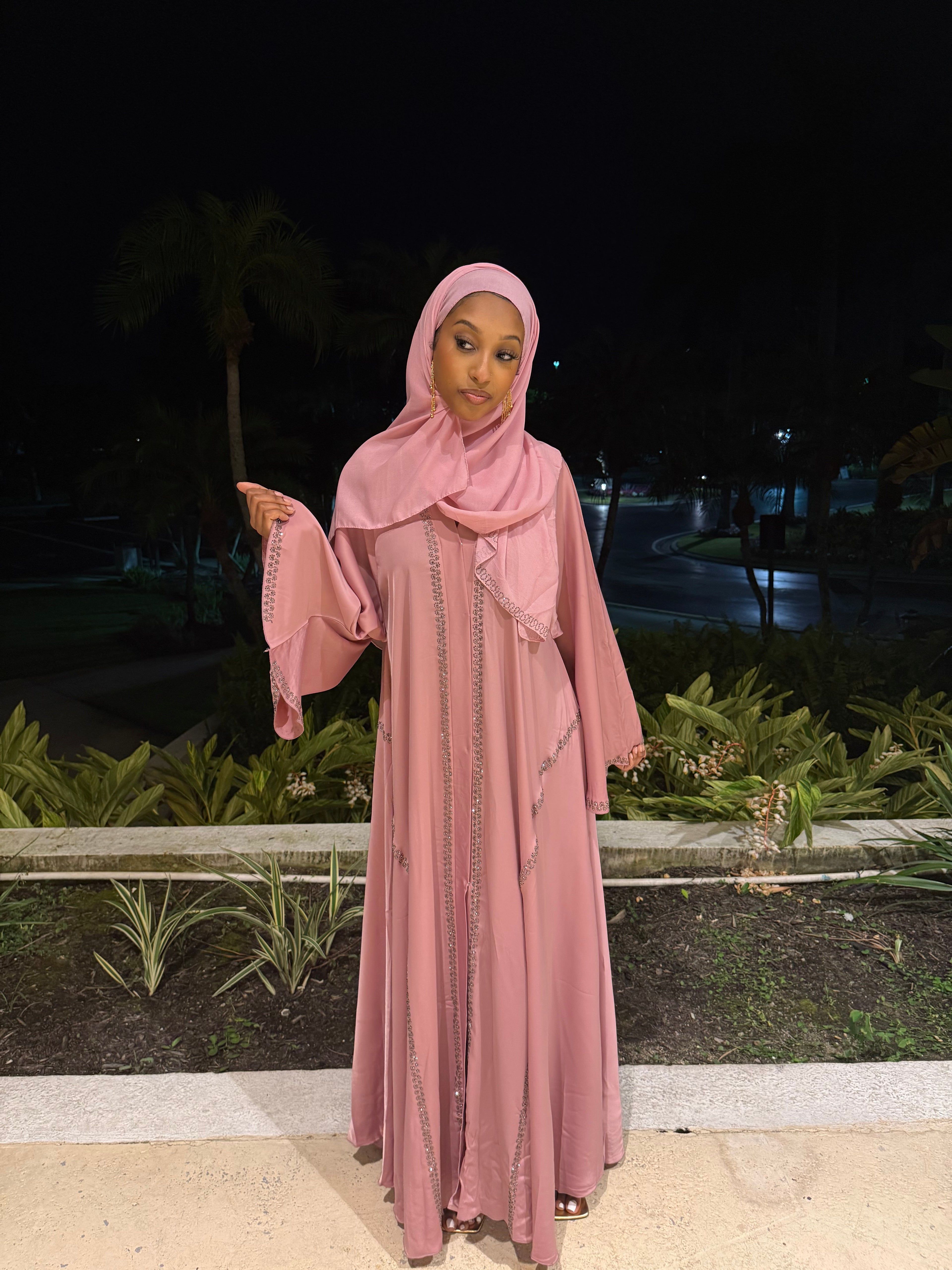 This elegant abaya set features soft pink satin adorned with silver rhinestone detailing. The set includes a matching abaya, hijab, and belt, offering a refined and cohesive look. Ideal for formal occasions, it combines modesty with timeless style.