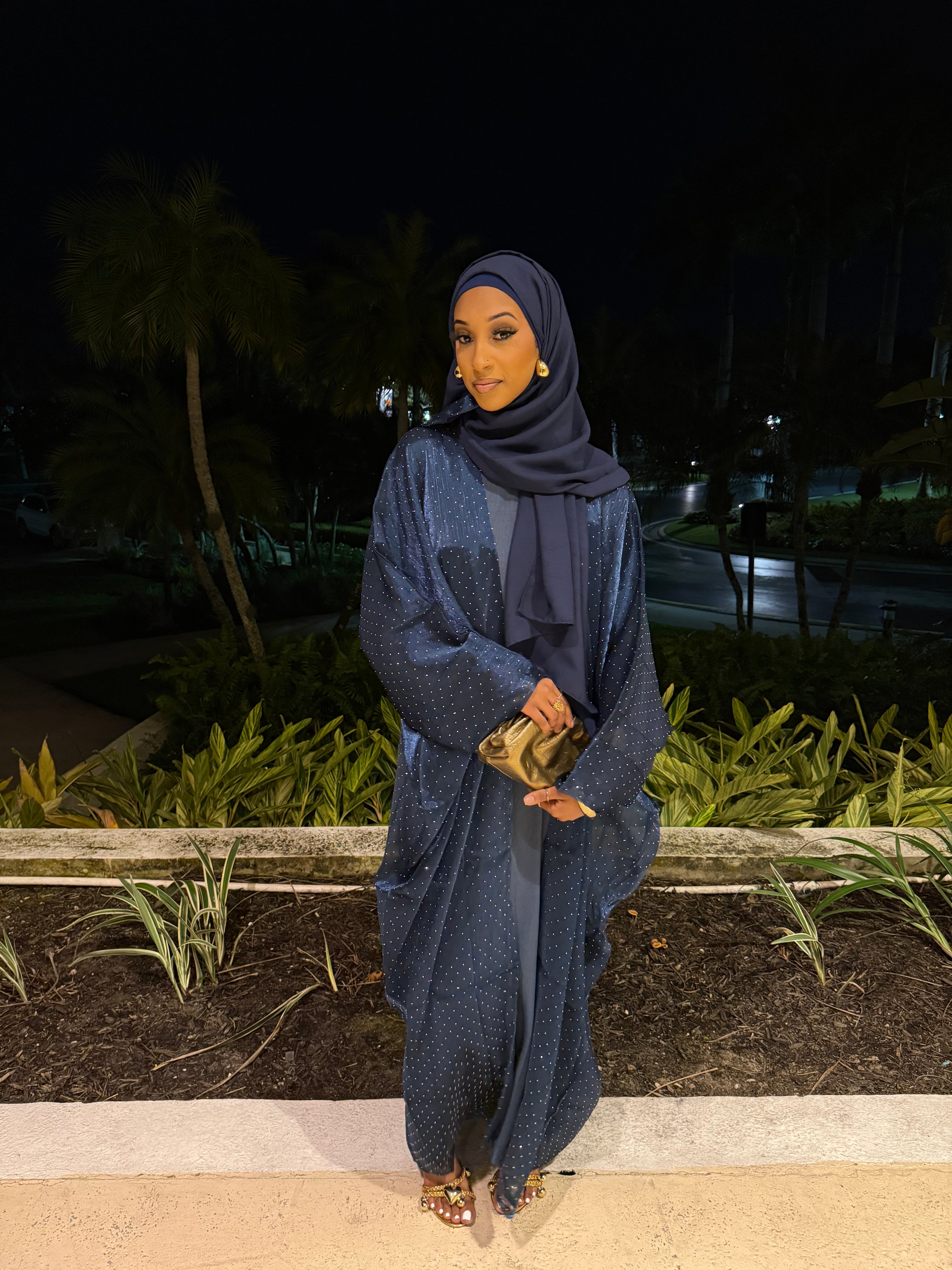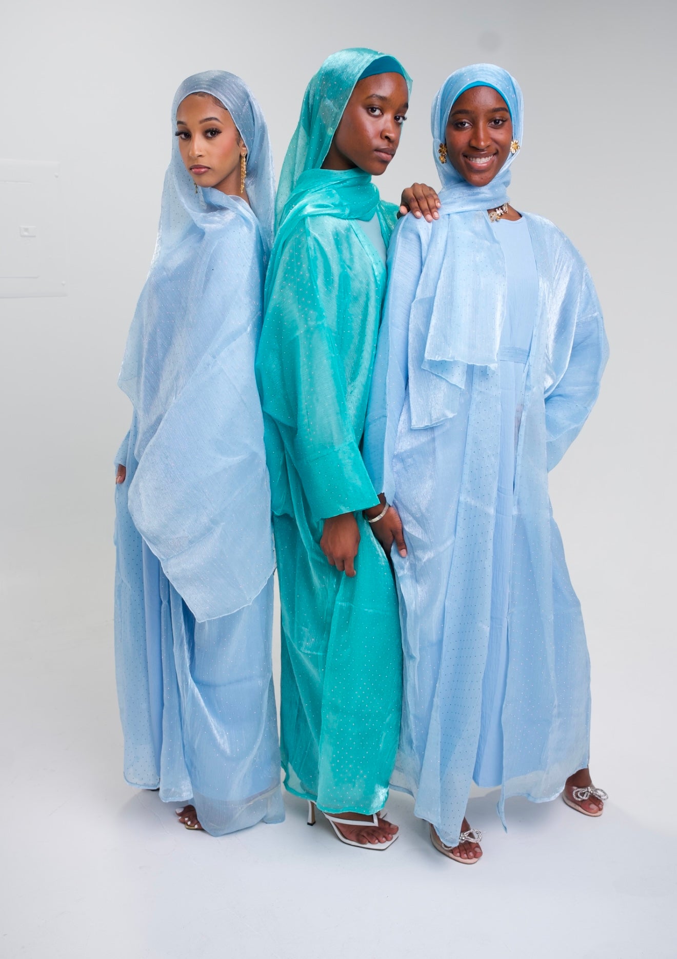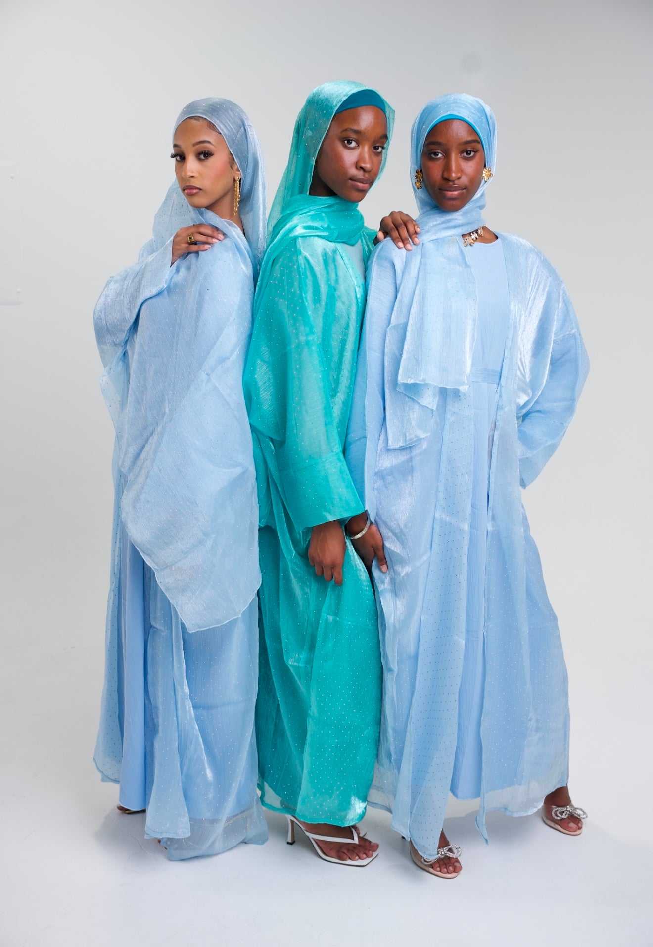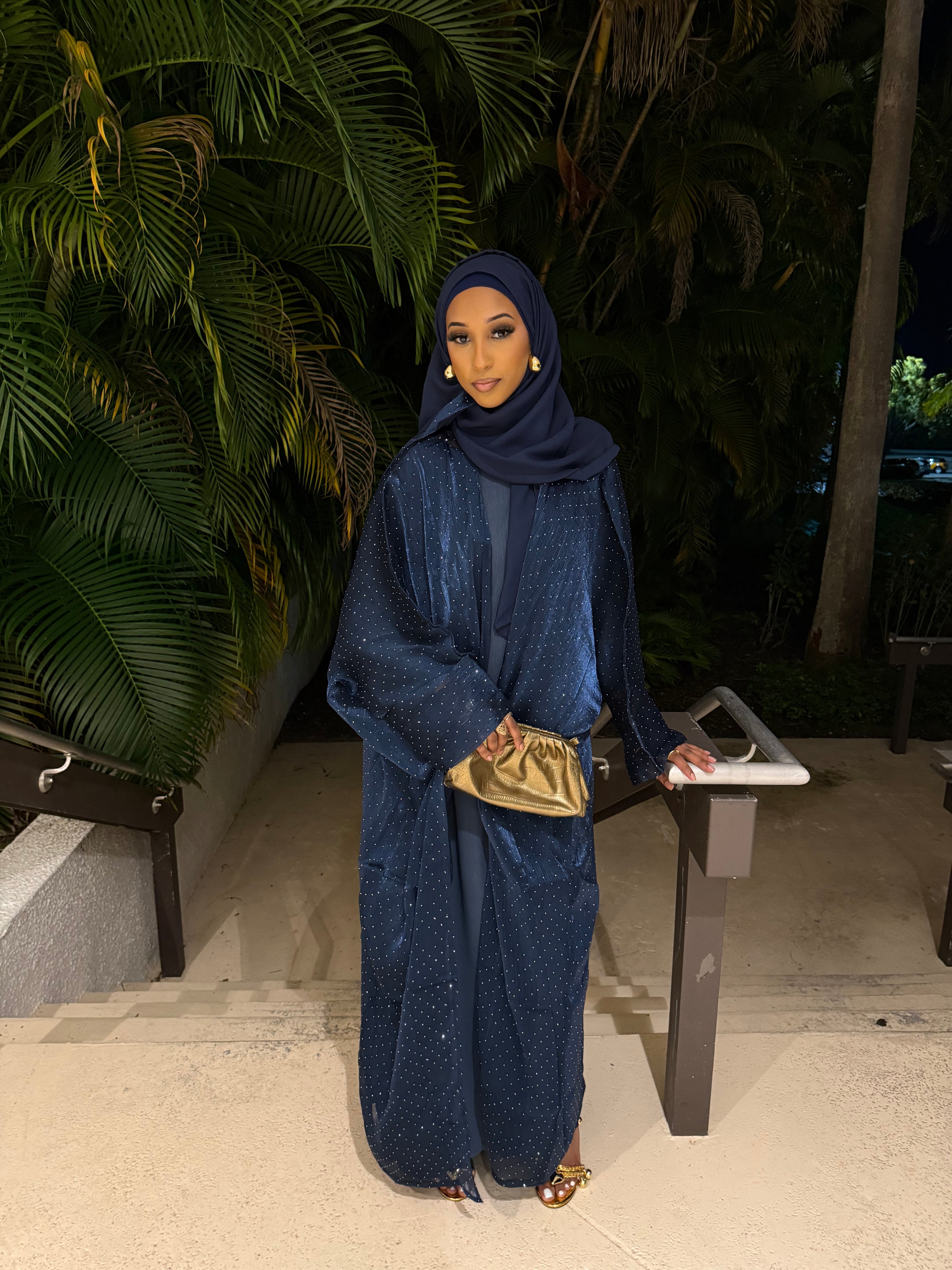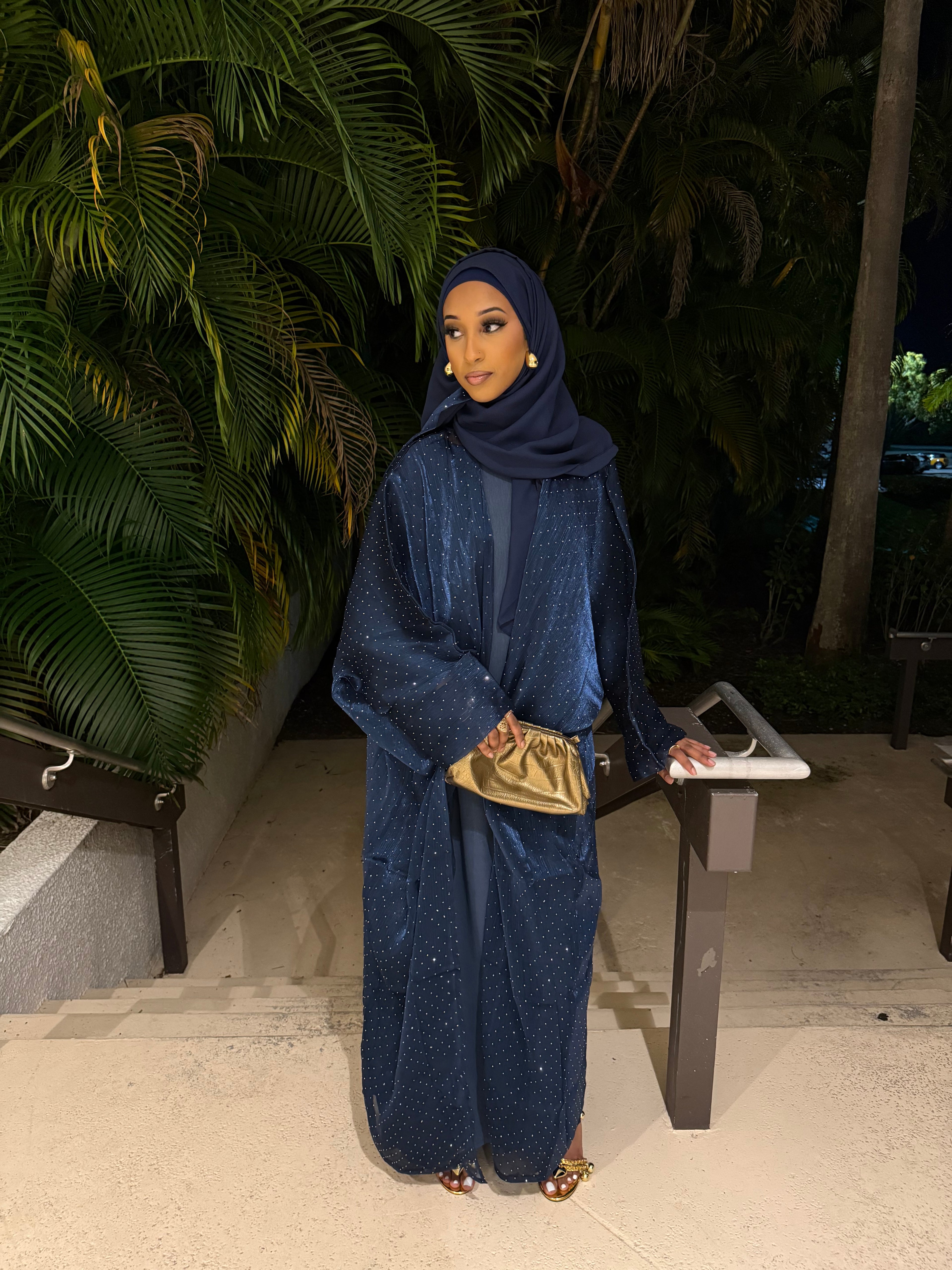 This elegant 4-piece set includes a rhinestone-embellished abaya, long-sleeved underdress, matching hijab, and coordinating belt. Available in five stunning shades—navy blue, pink, red, turquoise, and light blue—it offers both versatility and timeless style, perfect for special occasions or elevated everyday wear.