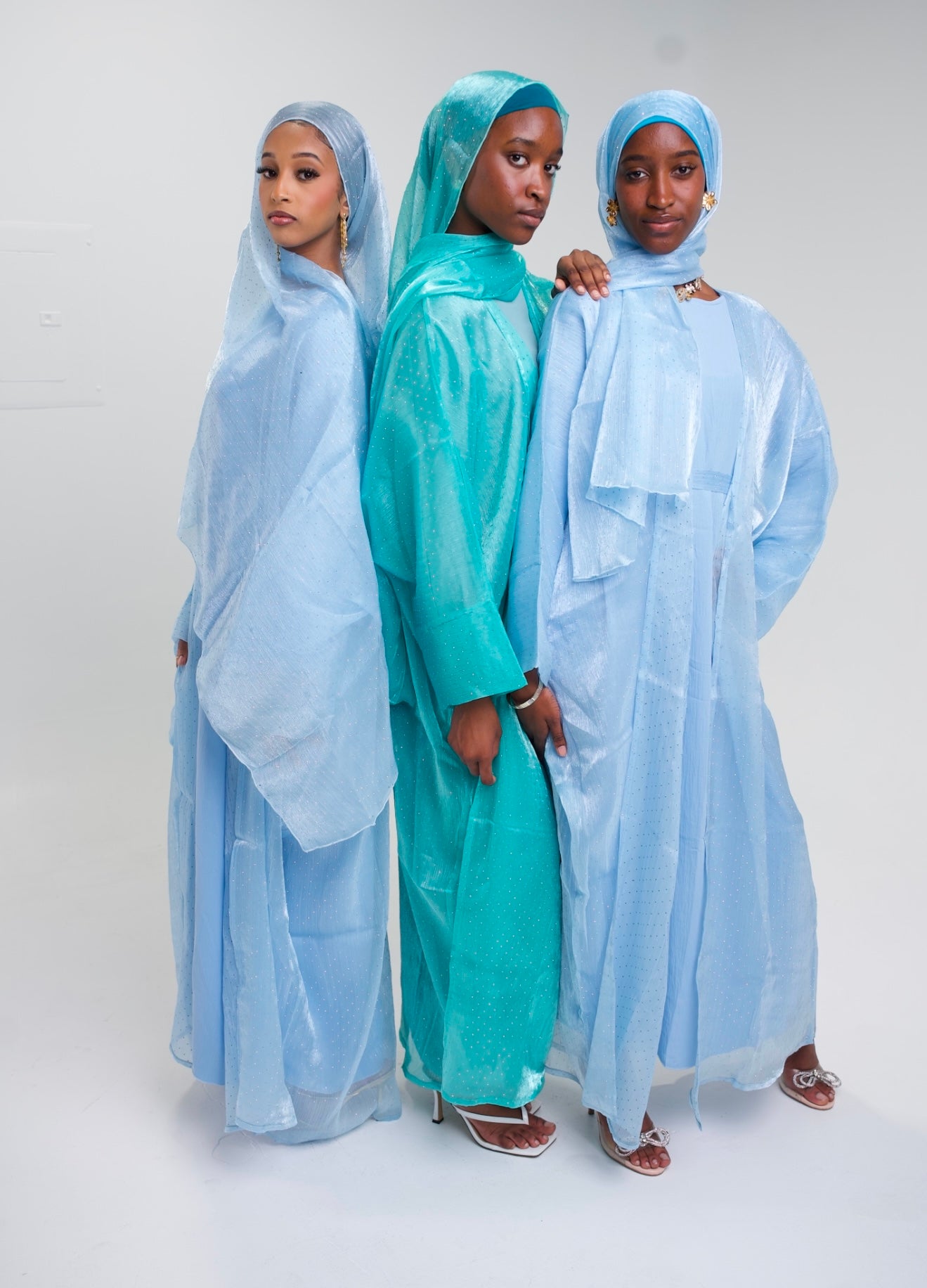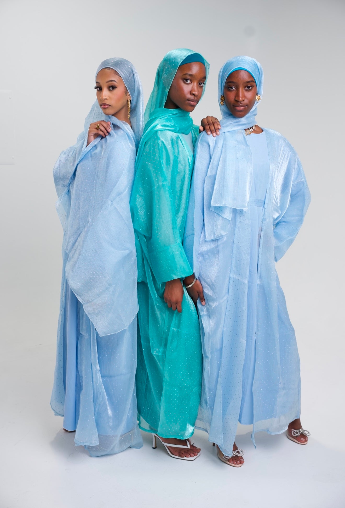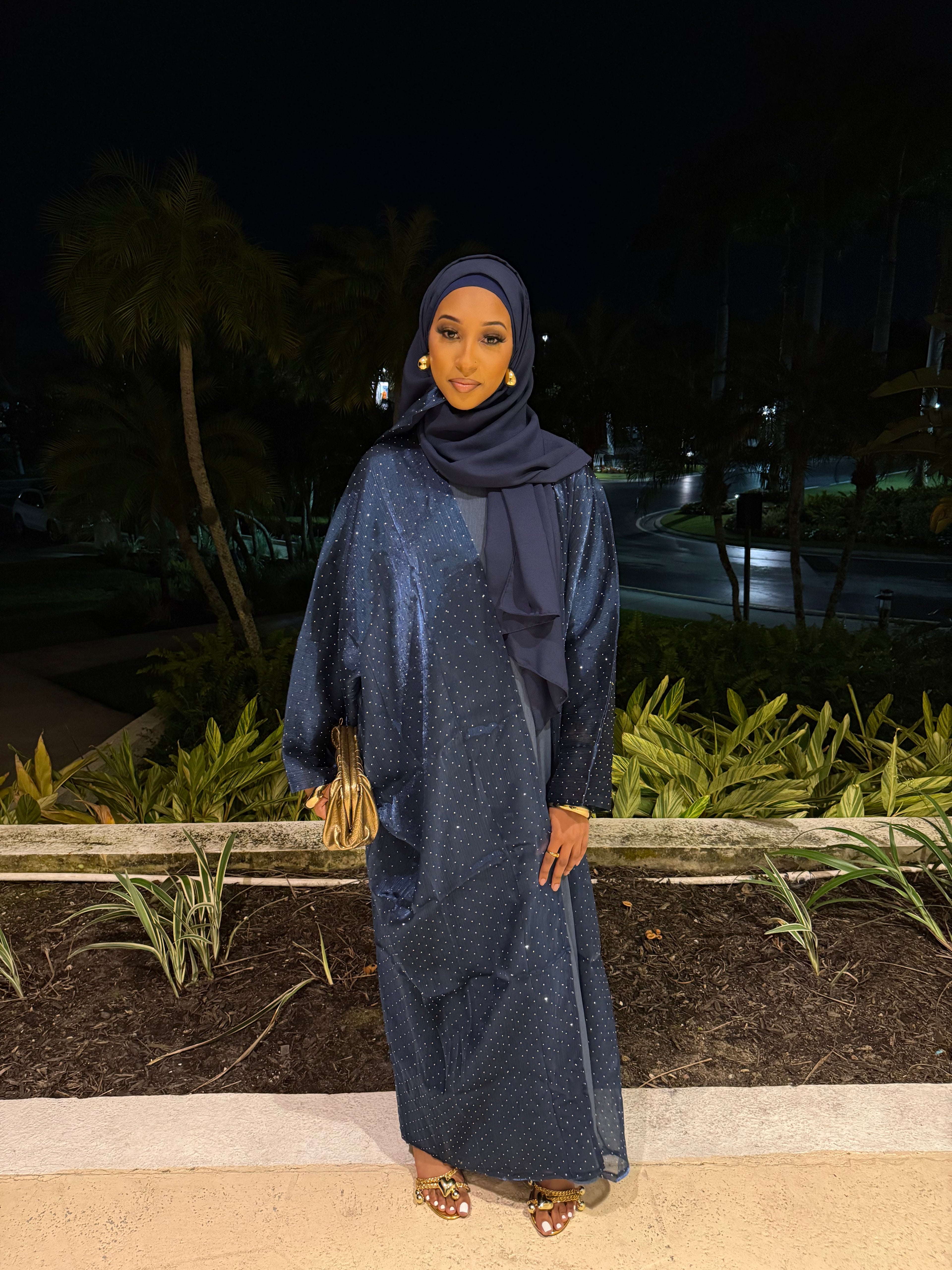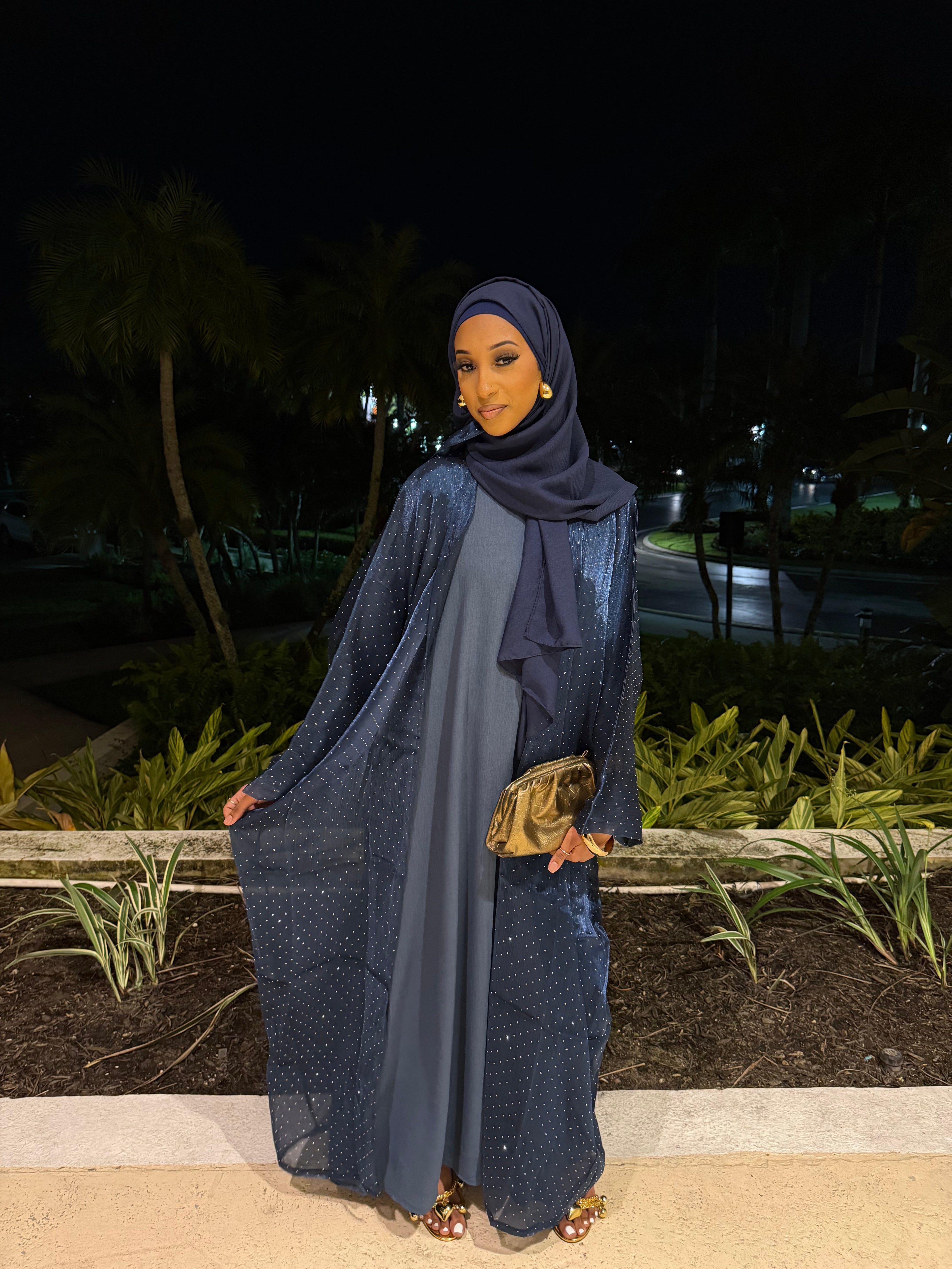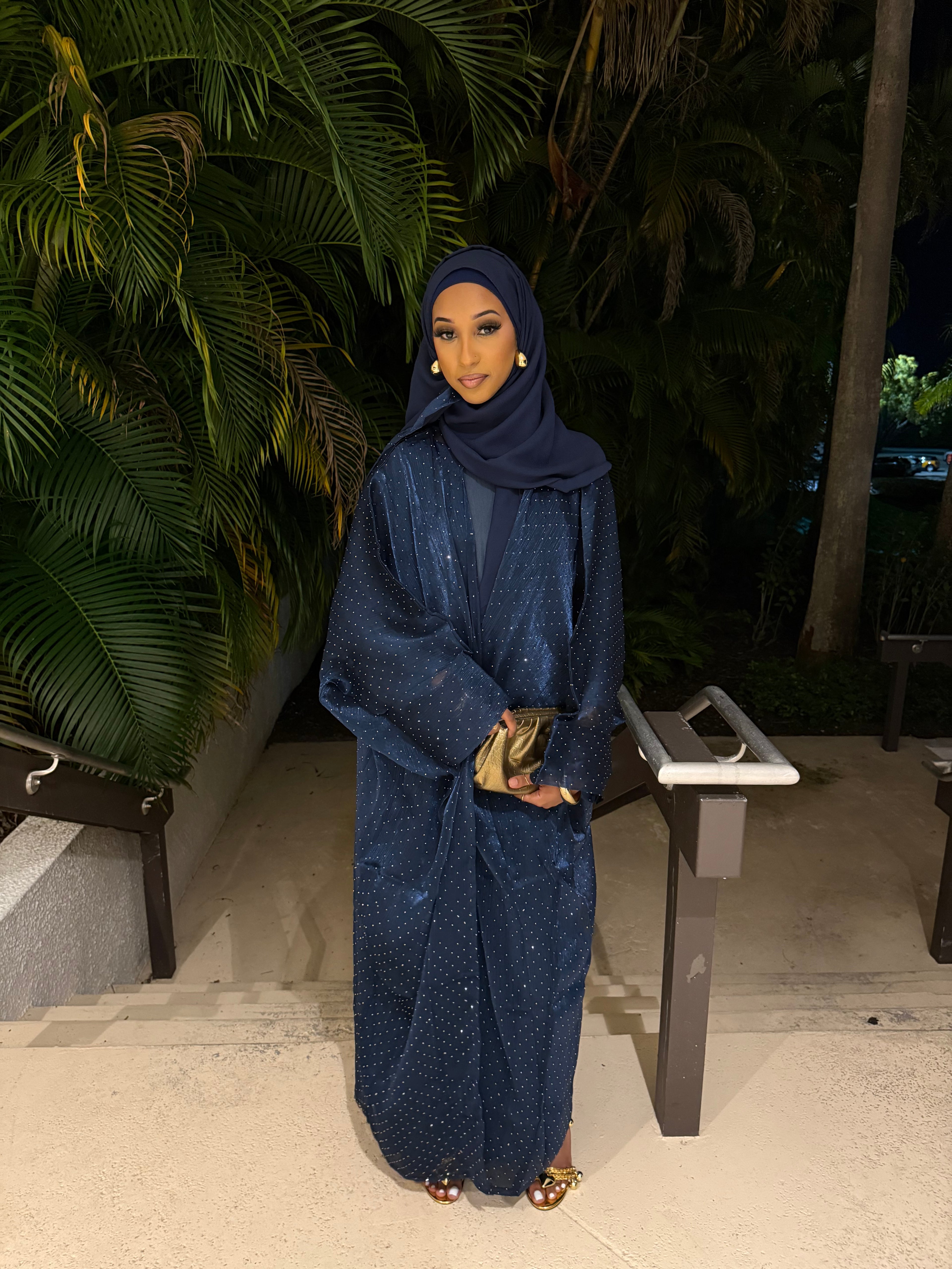 This elegant 4-piece set includes a rhinestone-embellished abaya, long-sleeved underdress, matching hijab, and coordinating belt. Available in five stunning shades—navy blue, pink, red, turquoise, and light blue—it offers both versatility and timeless style, perfect for special occasions or elevated everyday wear.