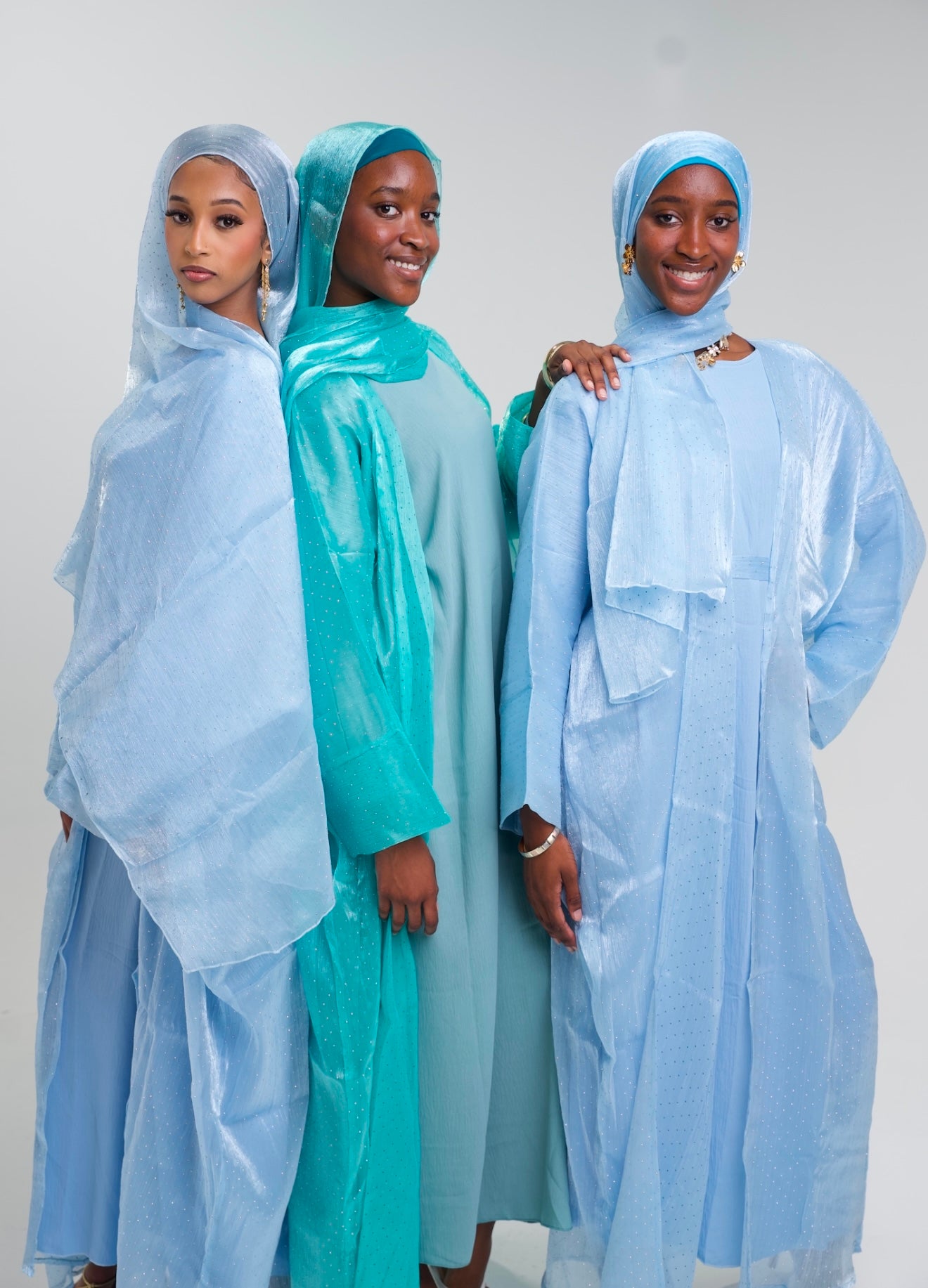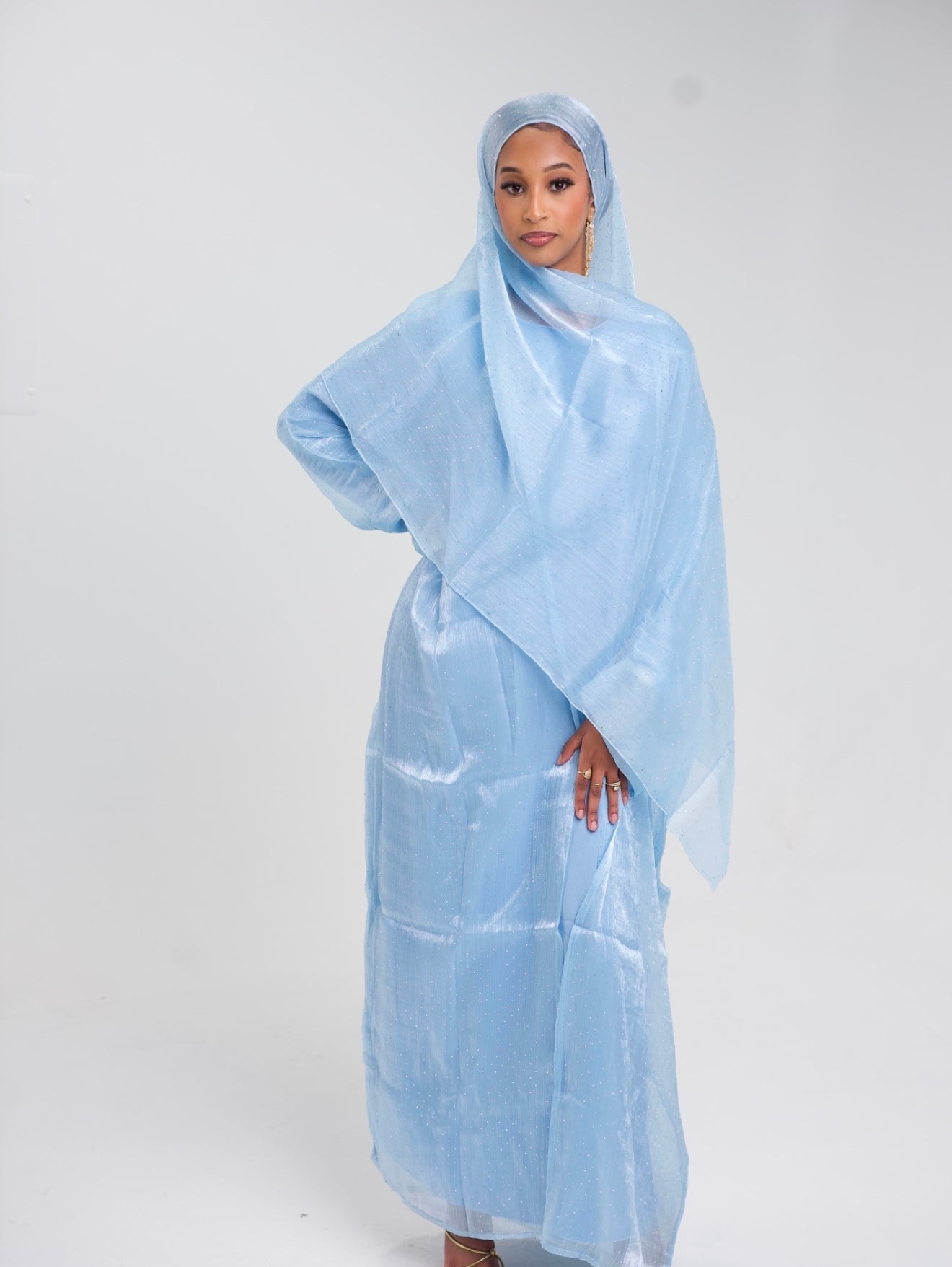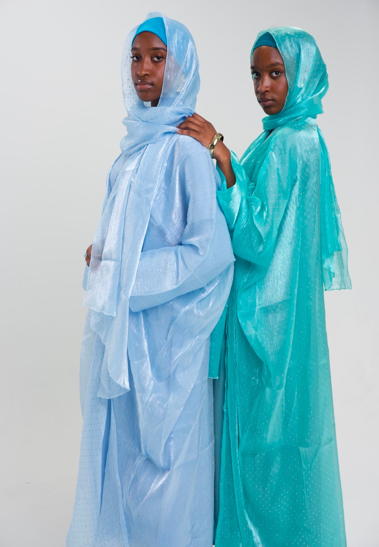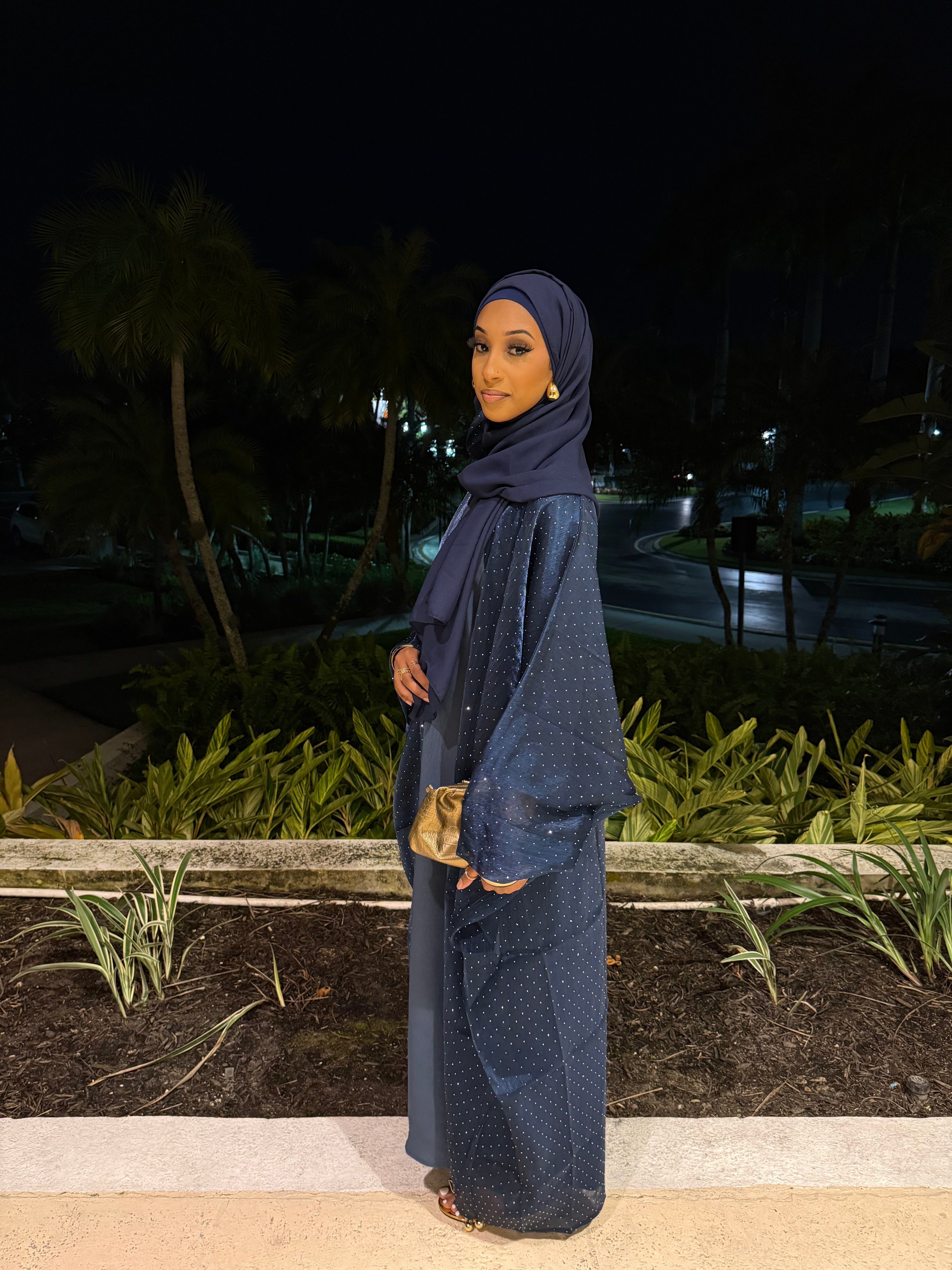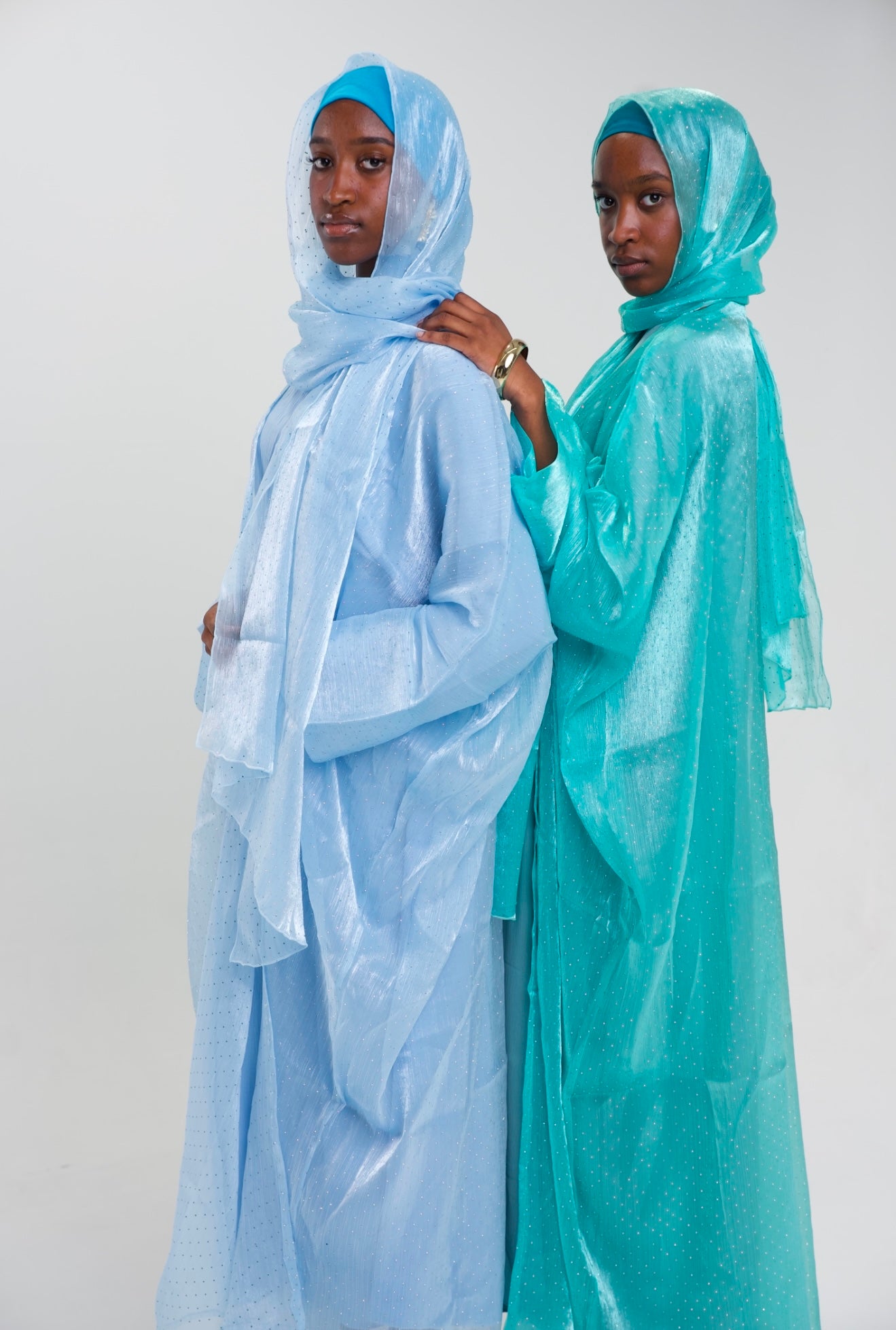 This elegant 4-piece set includes a rhinestone-embellished abaya, long-sleeved underdress, matching hijab, and coordinating belt. Available in five stunning shades—navy blue, pink, red, turquoise, and light blue—it offers both versatility and timeless style, perfect for special occasions or elevated everyday wear.