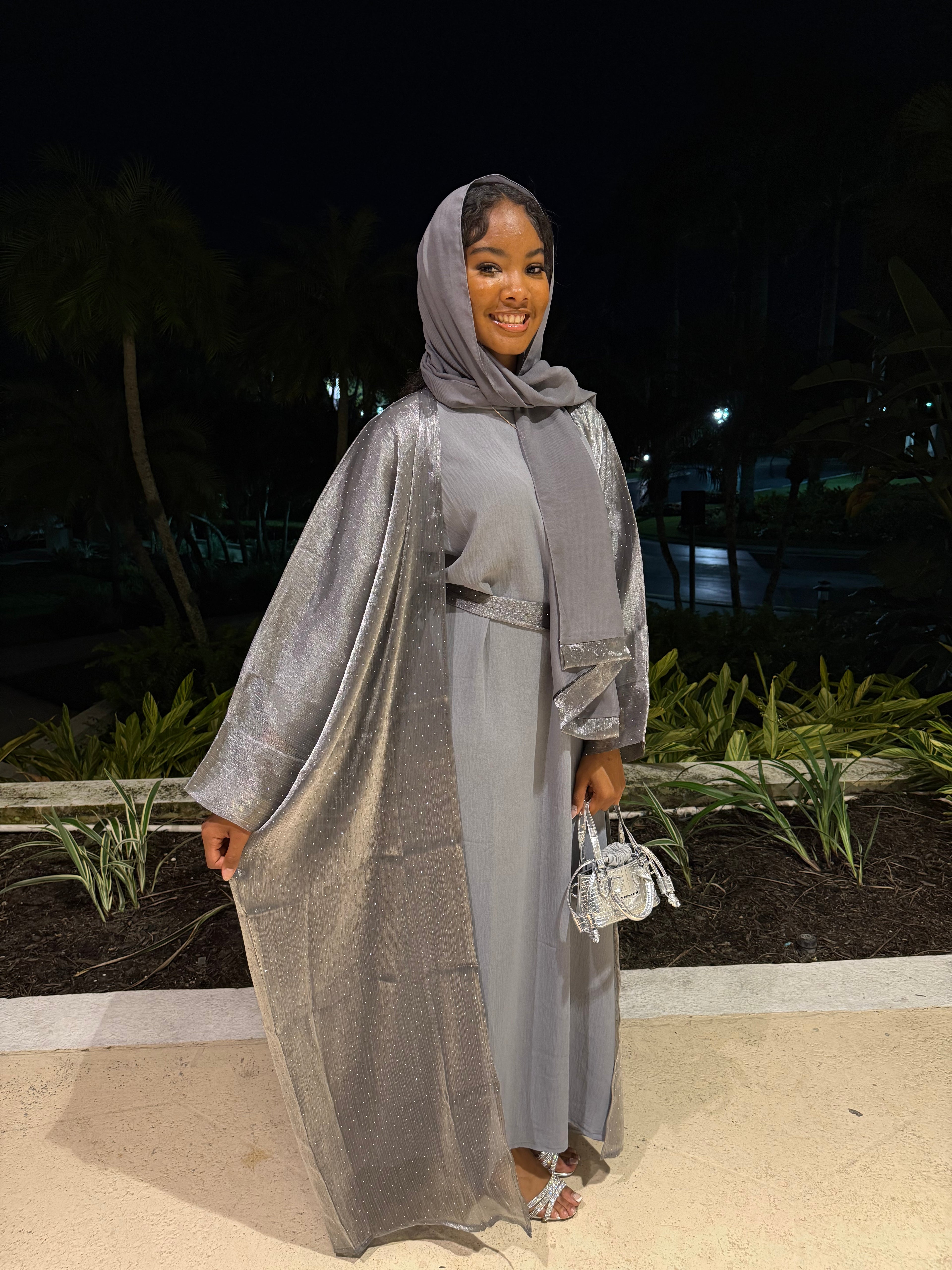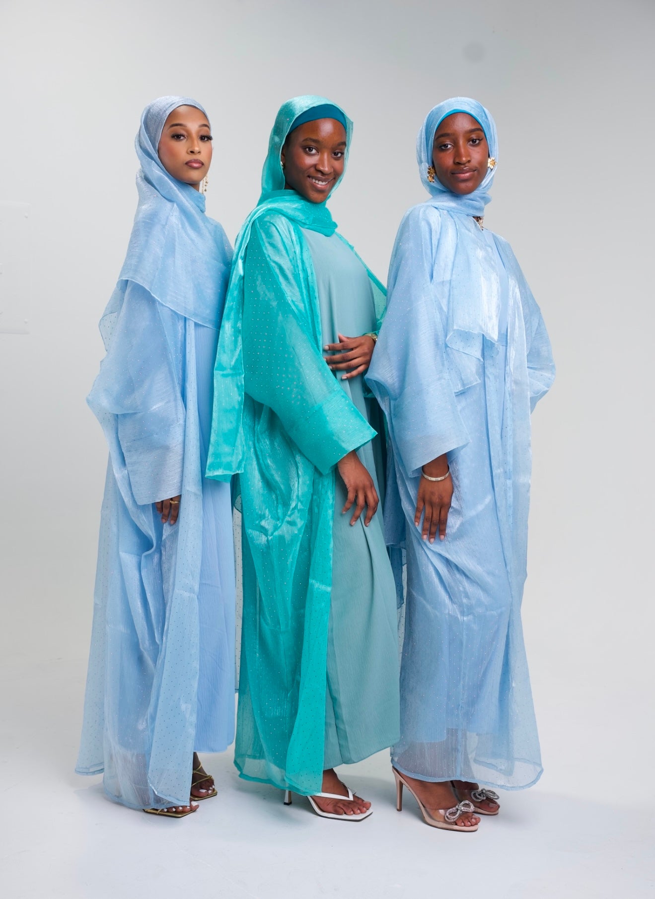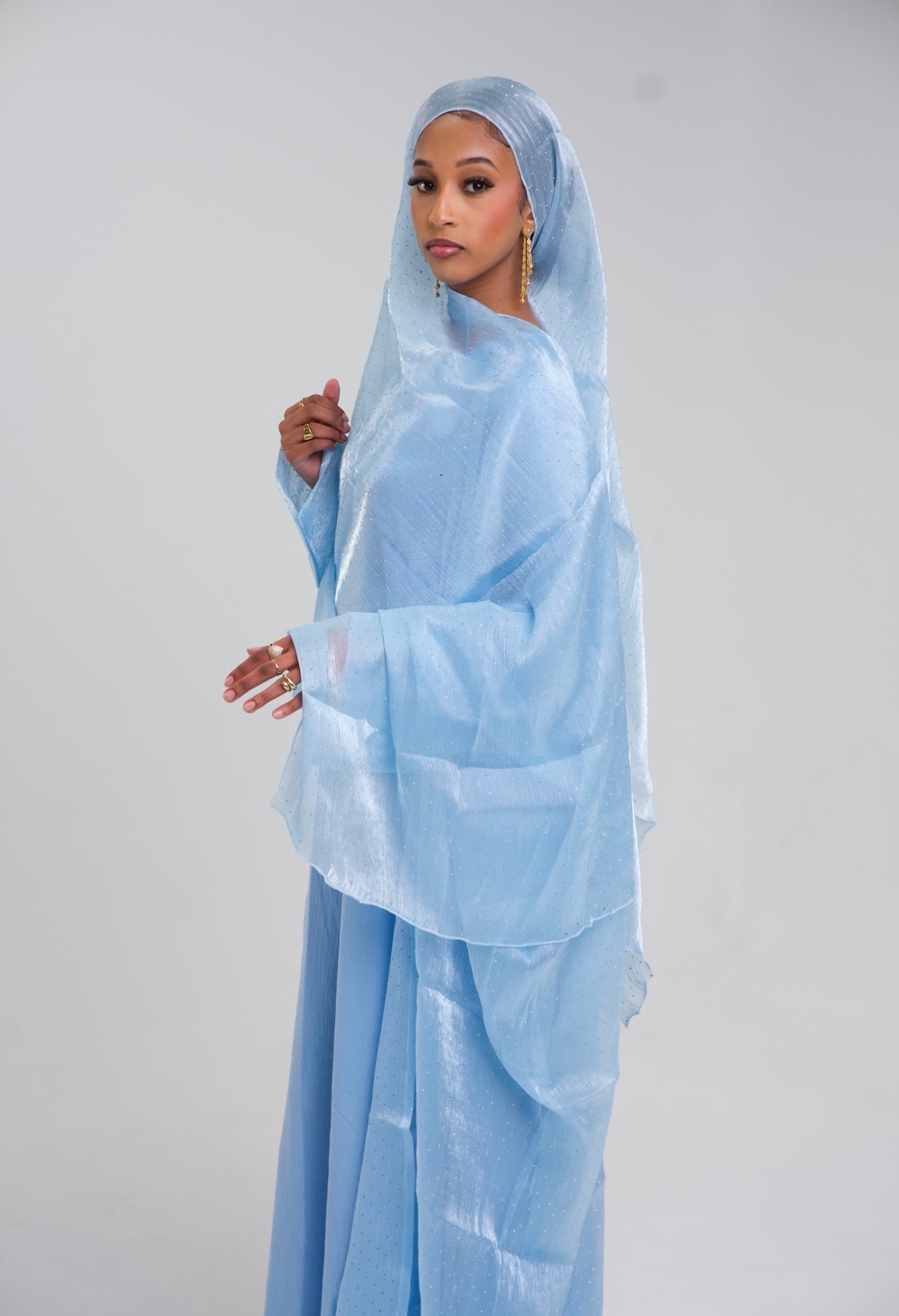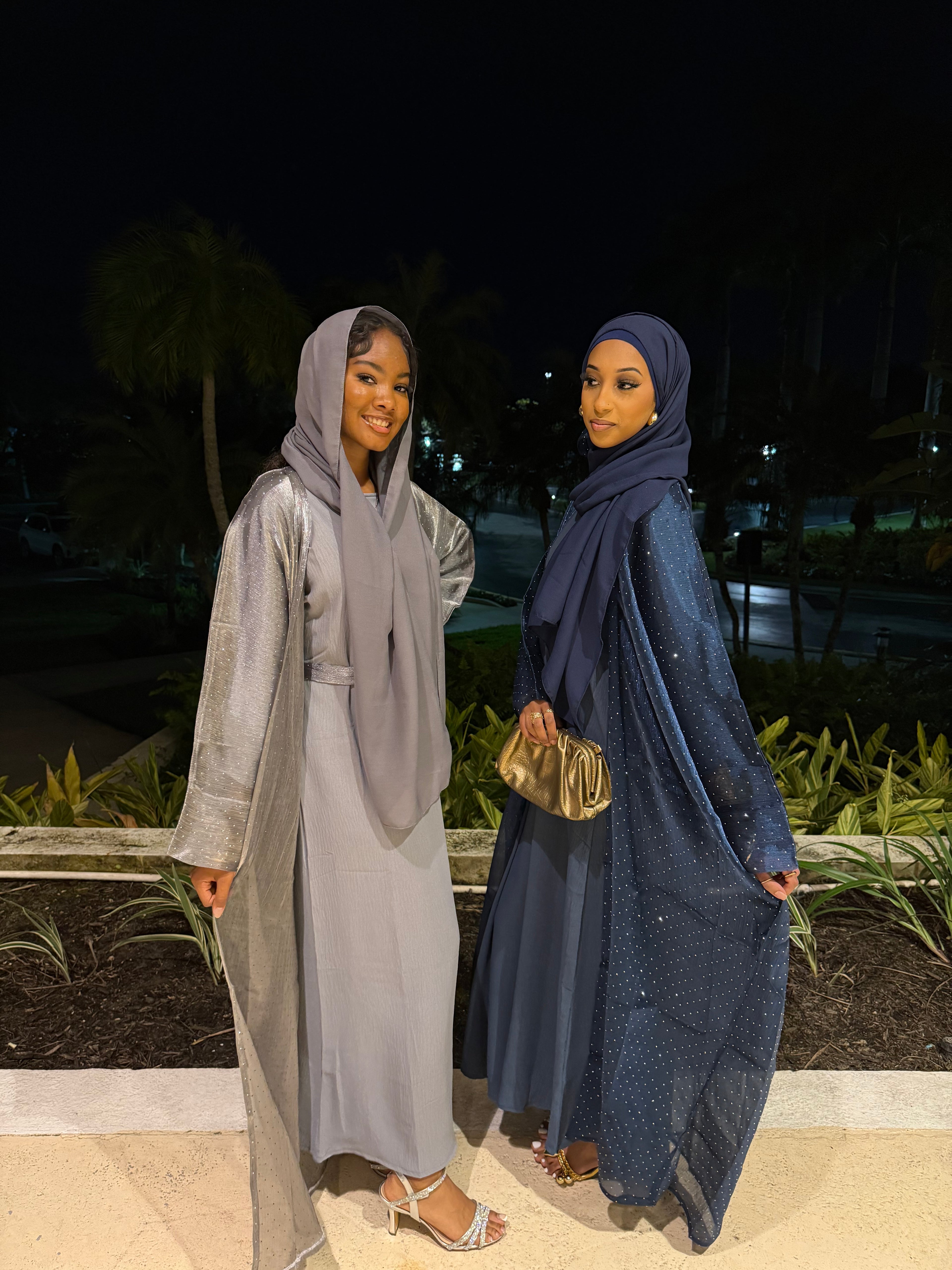 This elegant 4-piece set includes a rhinestone-embellished abaya, long-sleeved underdress, matching hijab, and coordinating belt. Available in five stunning shades—navy blue, pink, red, turquoise, and light blue—it offers both versatility and timeless style, perfect for special occasions or elevated everyday wear.