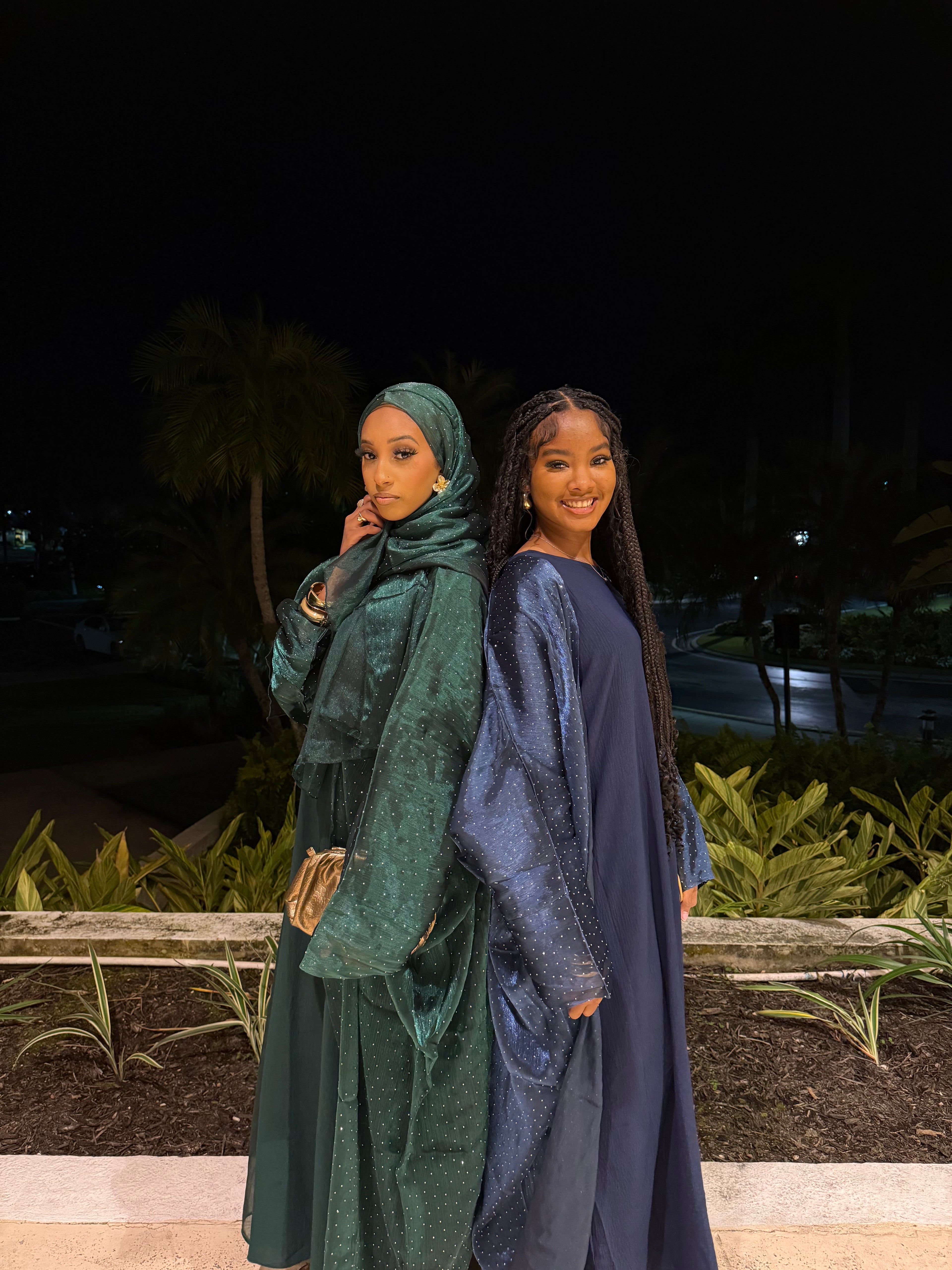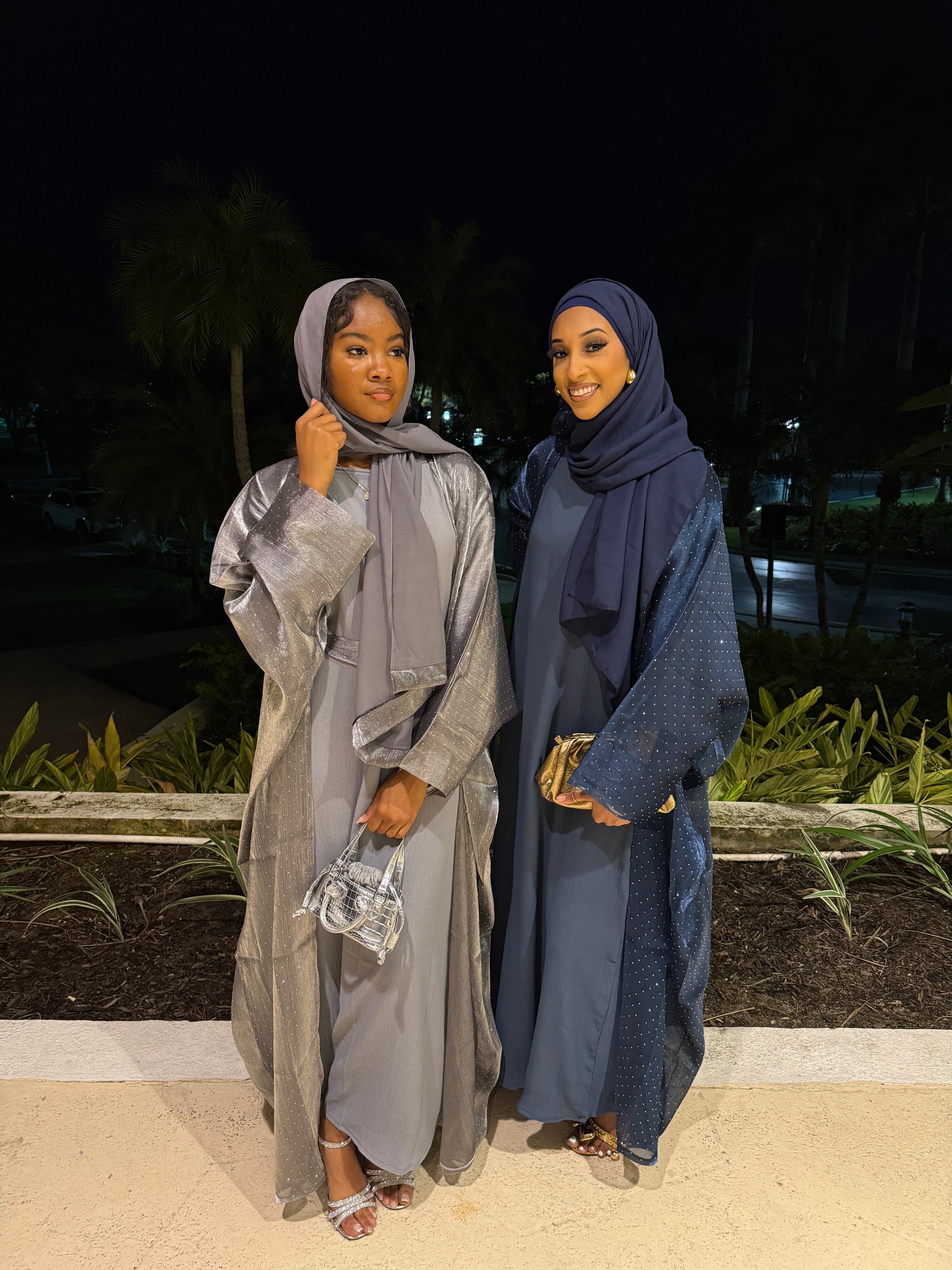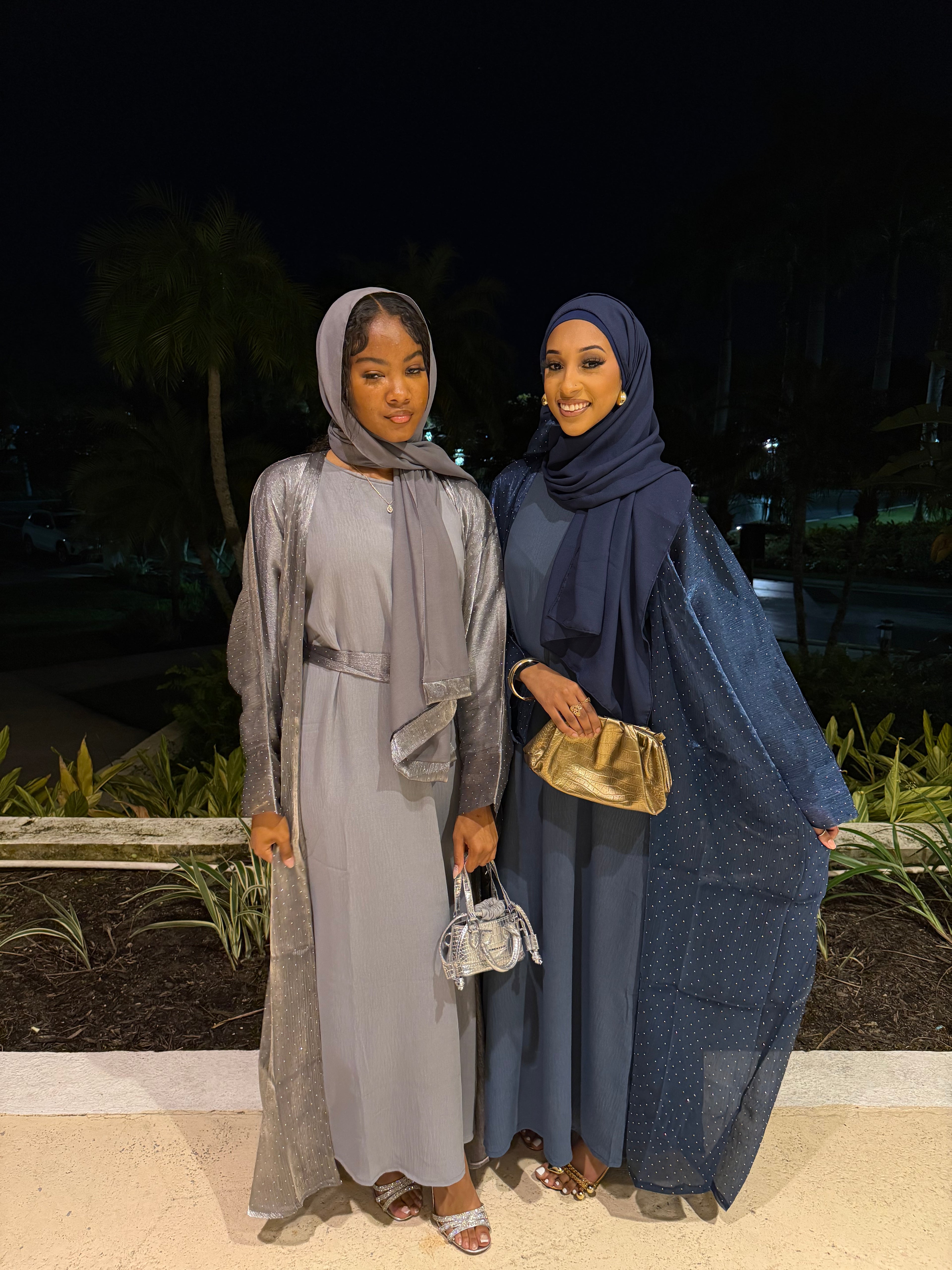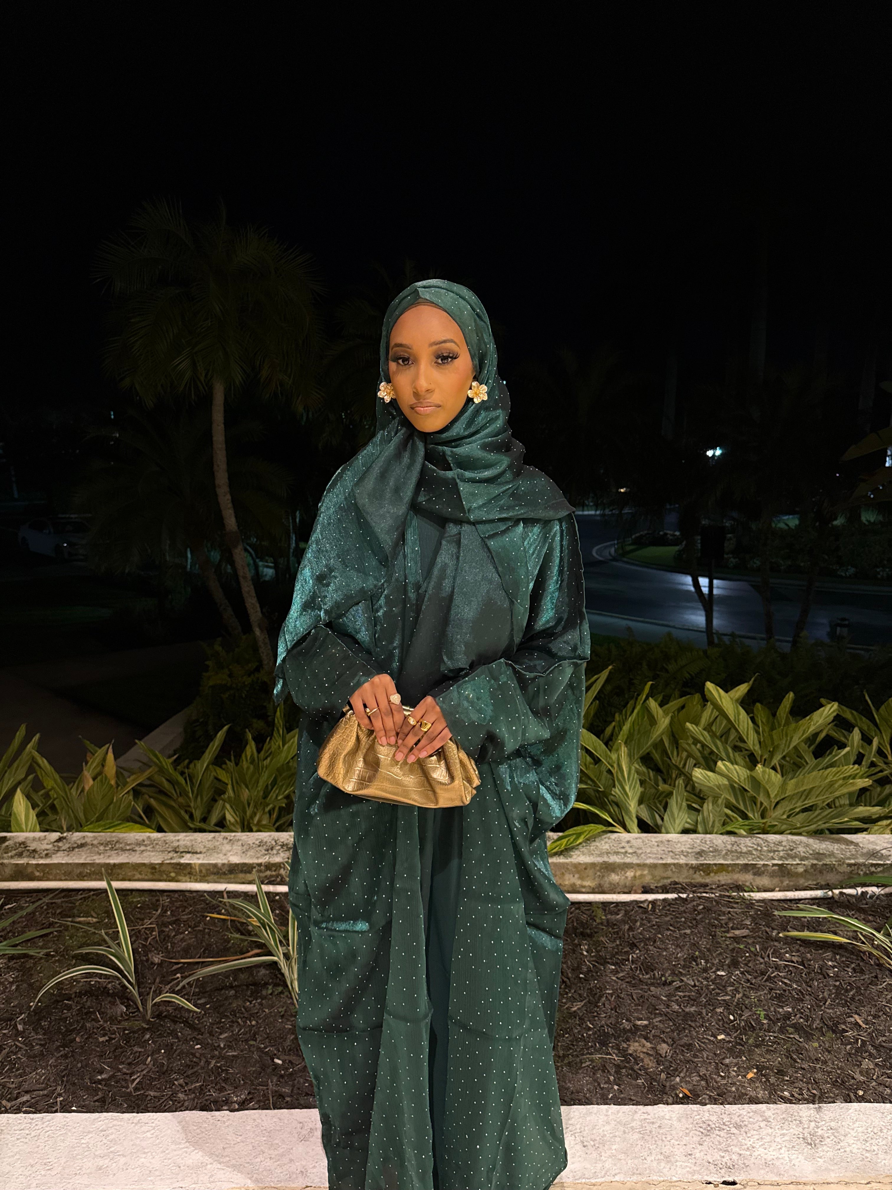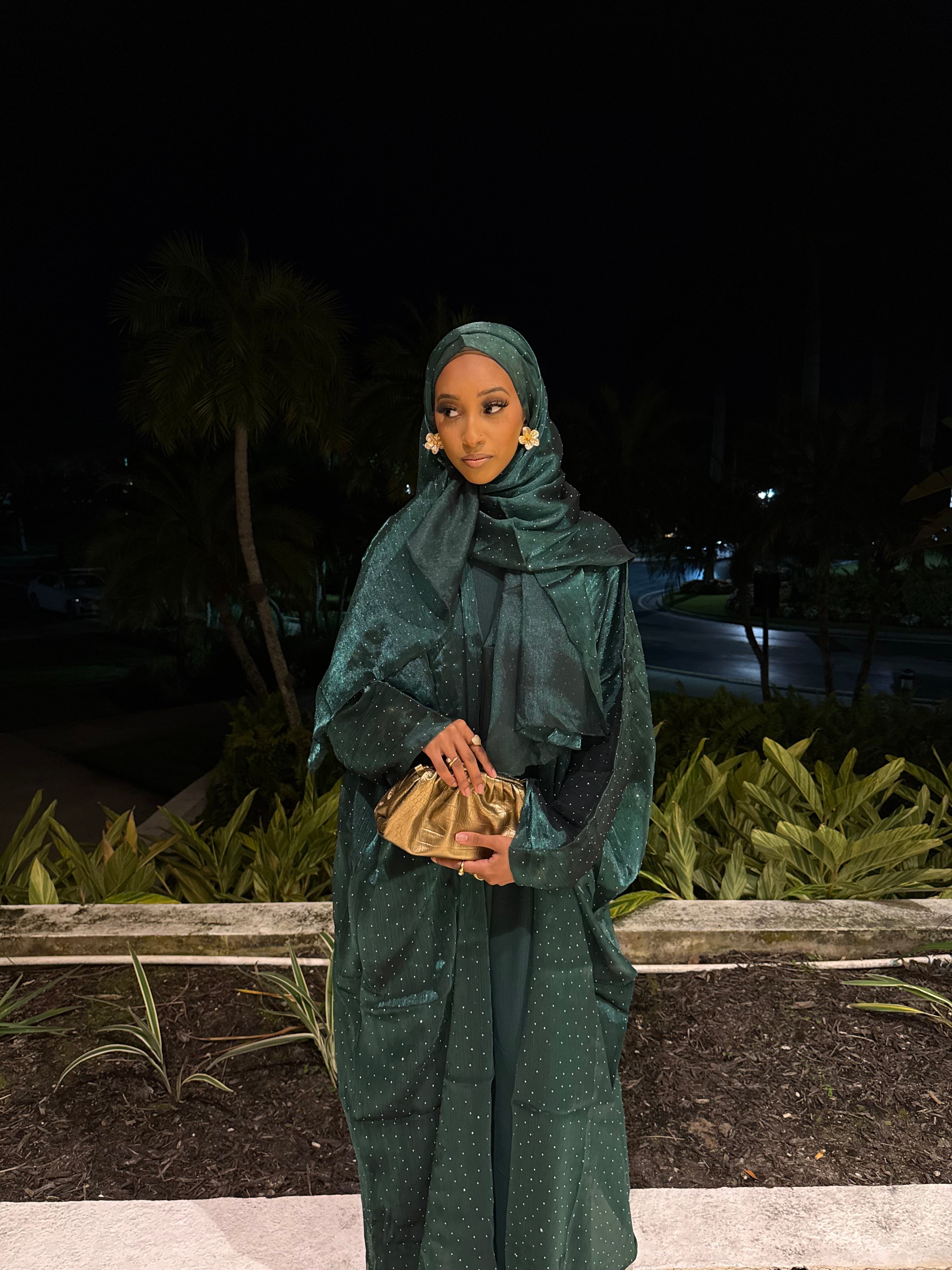 This elegant 4-piece set includes a rhinestone-embellished abaya, long-sleeved underdress, matching hijab, and coordinating belt. Available in five stunning shades—navy blue, pink, red, turquoise, and light blue—it offers both versatility and timeless style, perfect for special occasions or elevated everyday wear.