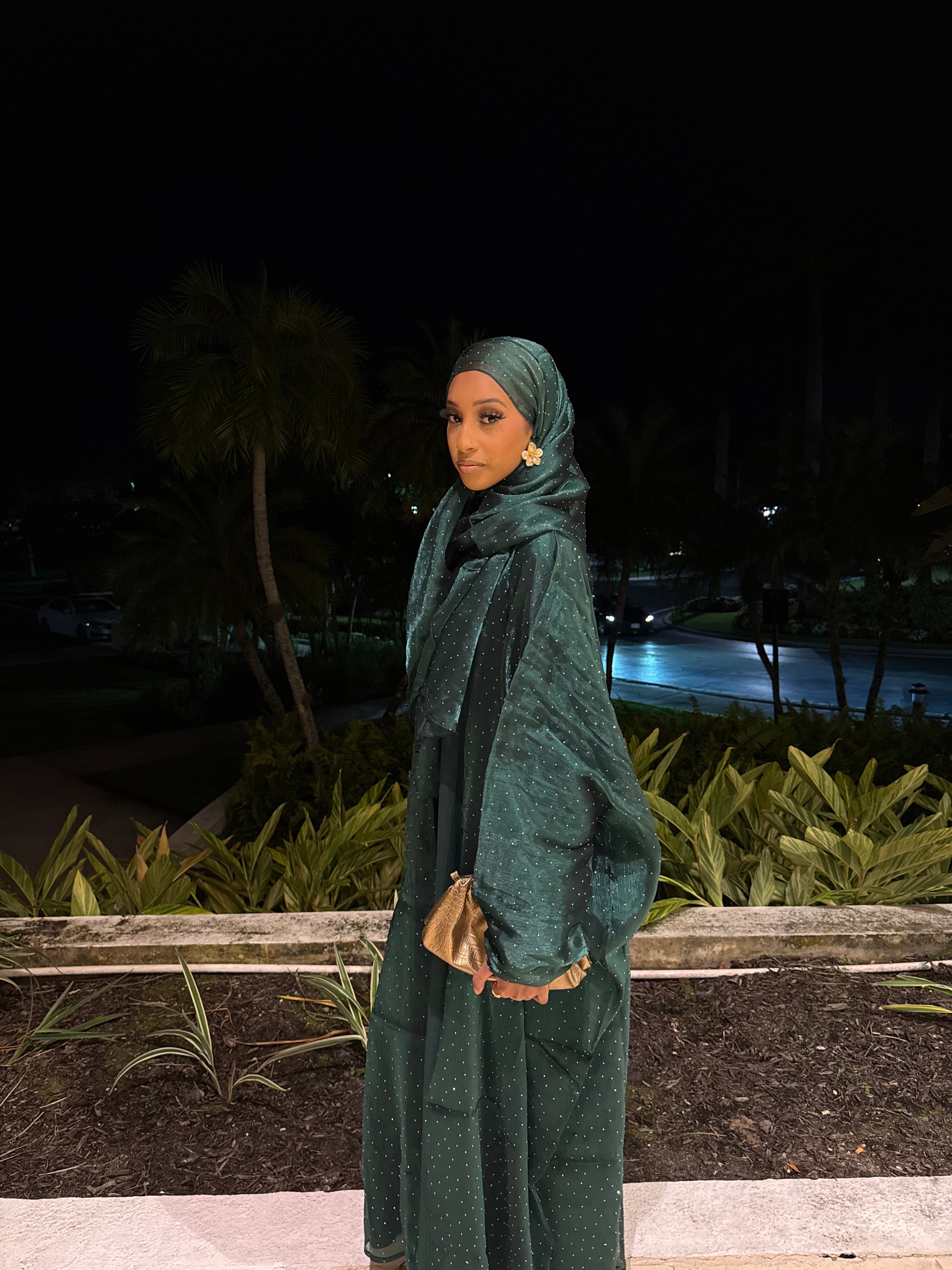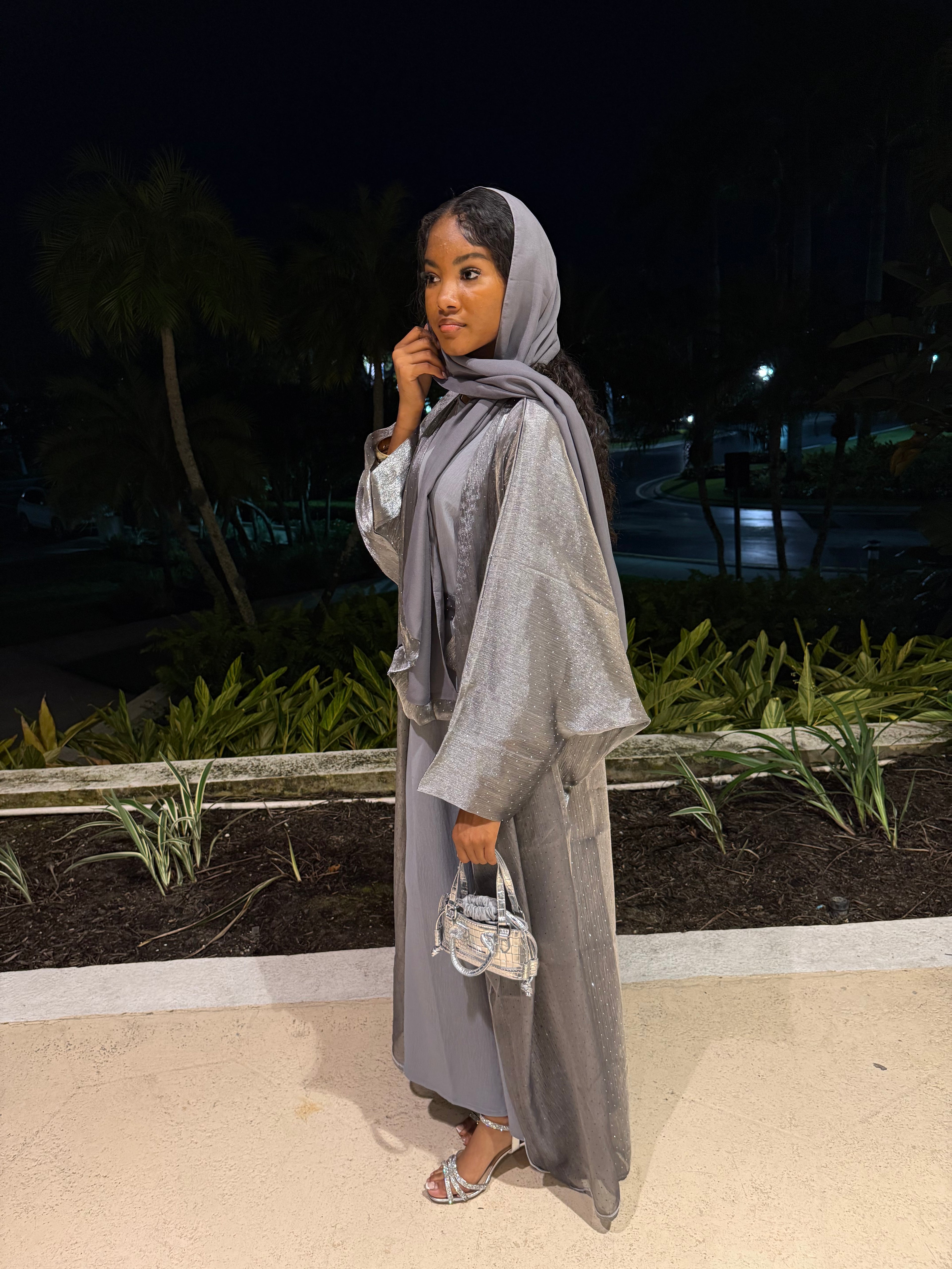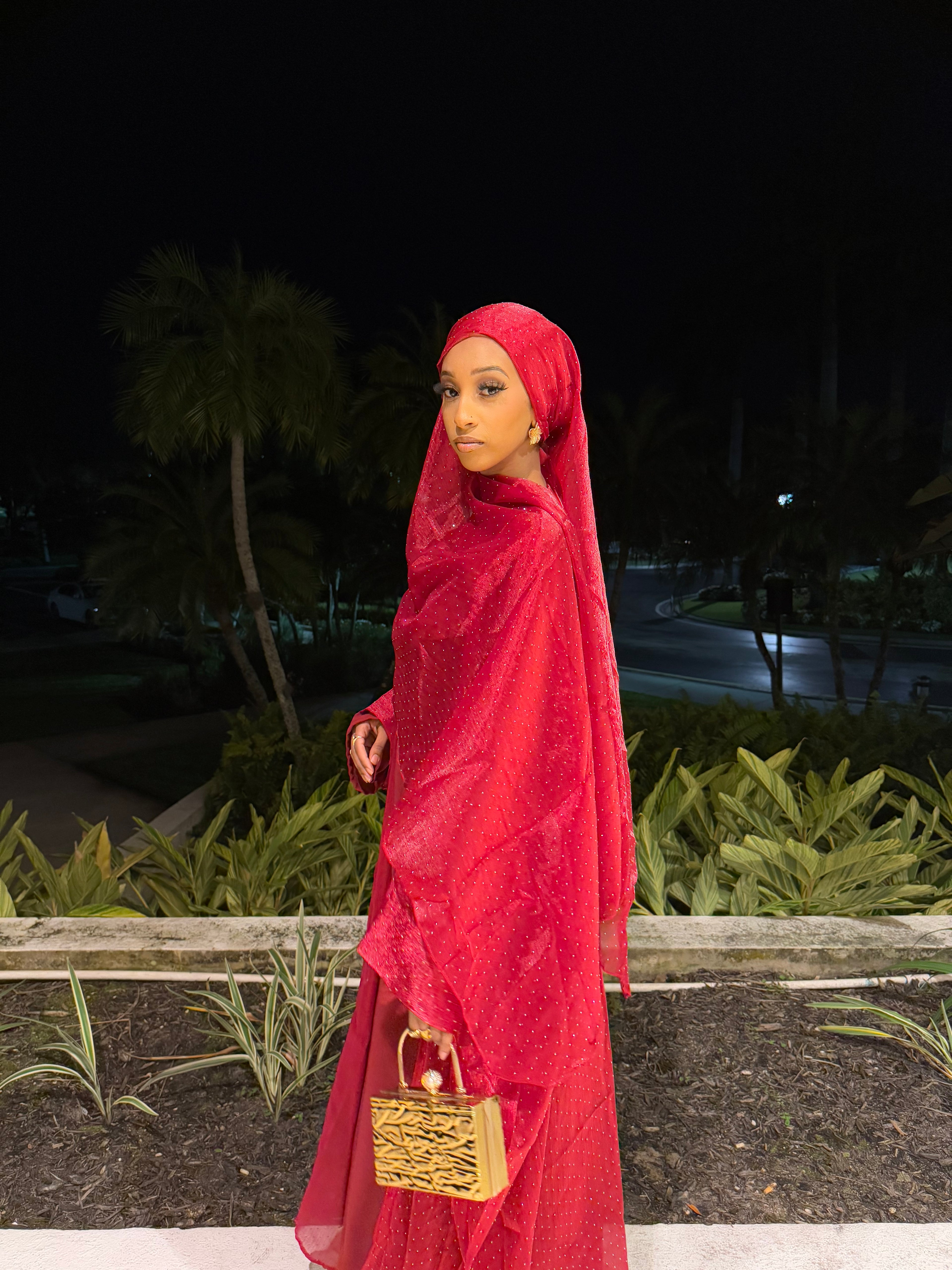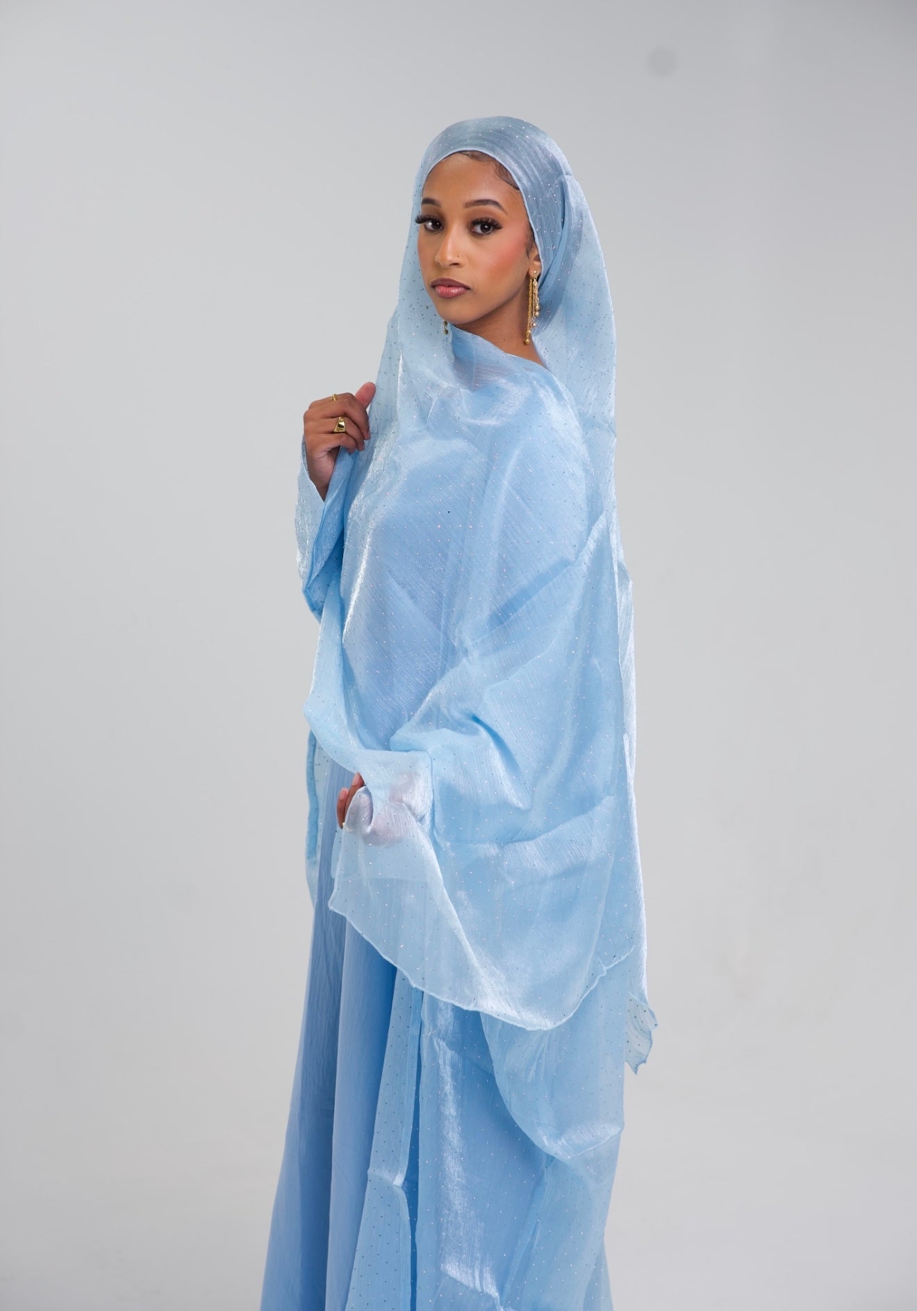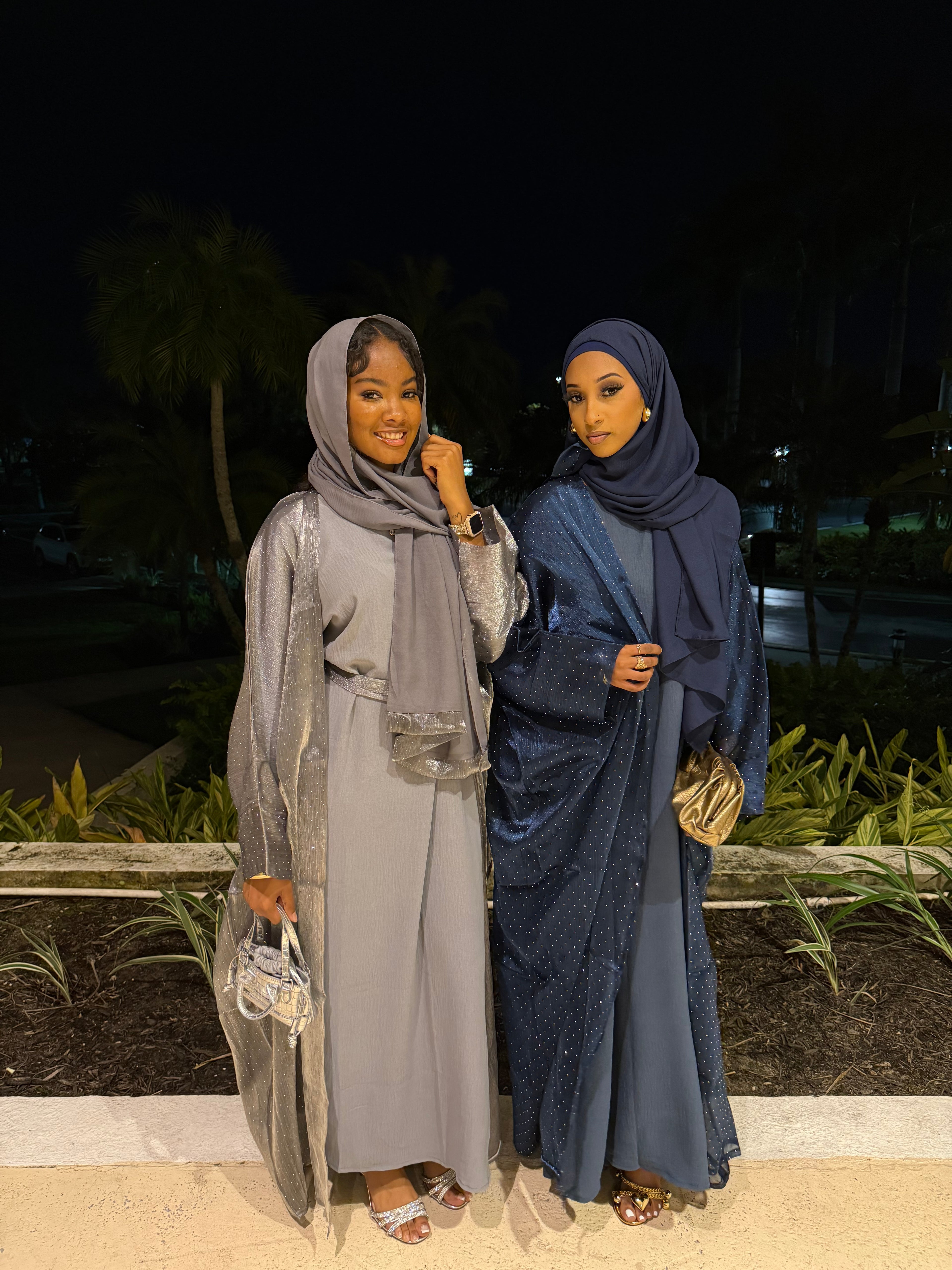 This elegant 4-piece set includes a rhinestone-embellished abaya, long-sleeved underdress, matching hijab, and coordinating belt. Available in five stunning shades—navy blue, pink, red, turquoise, and light blue—it offers both versatility and timeless style, perfect for special occasions or elevated everyday wear.
