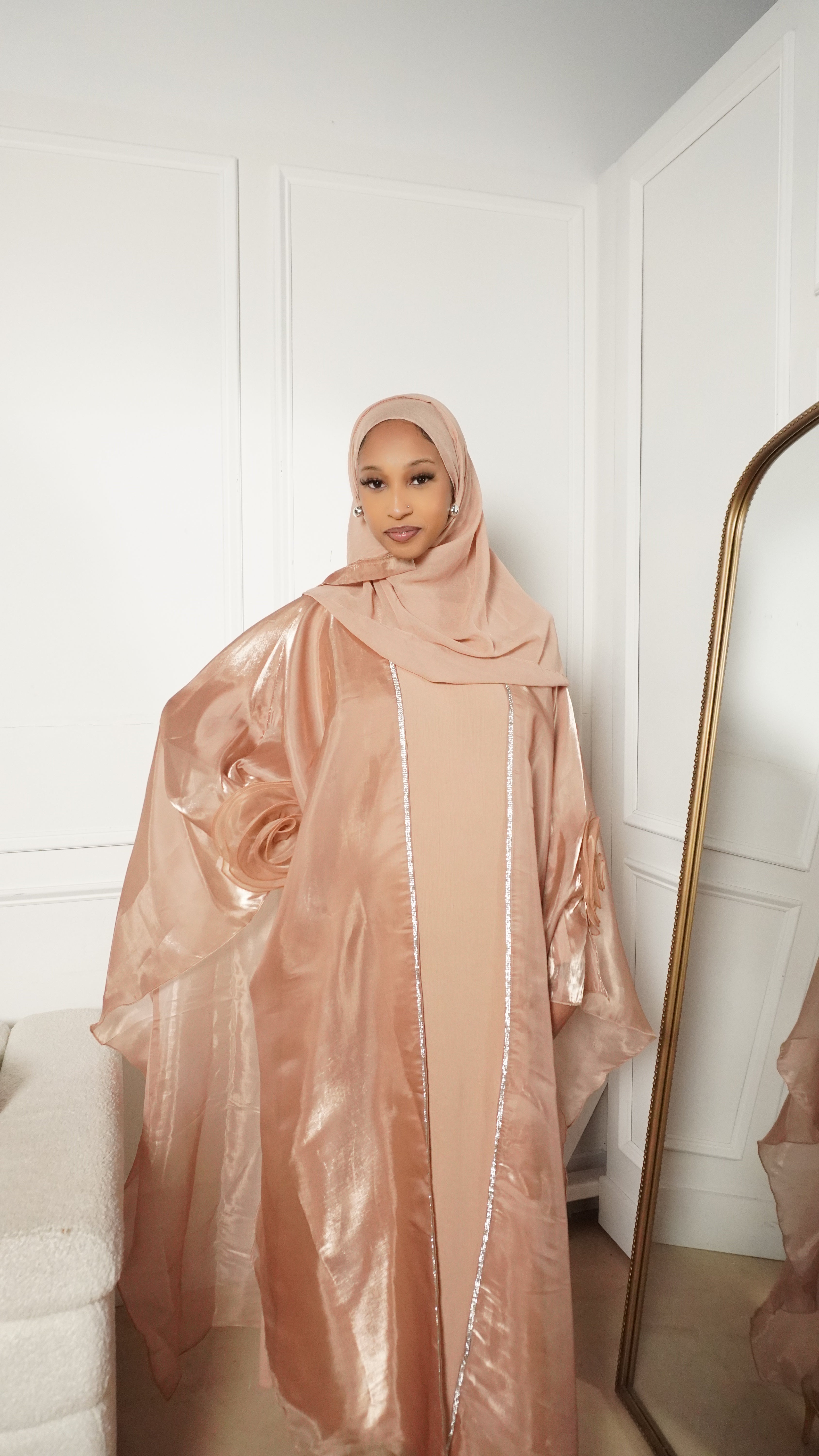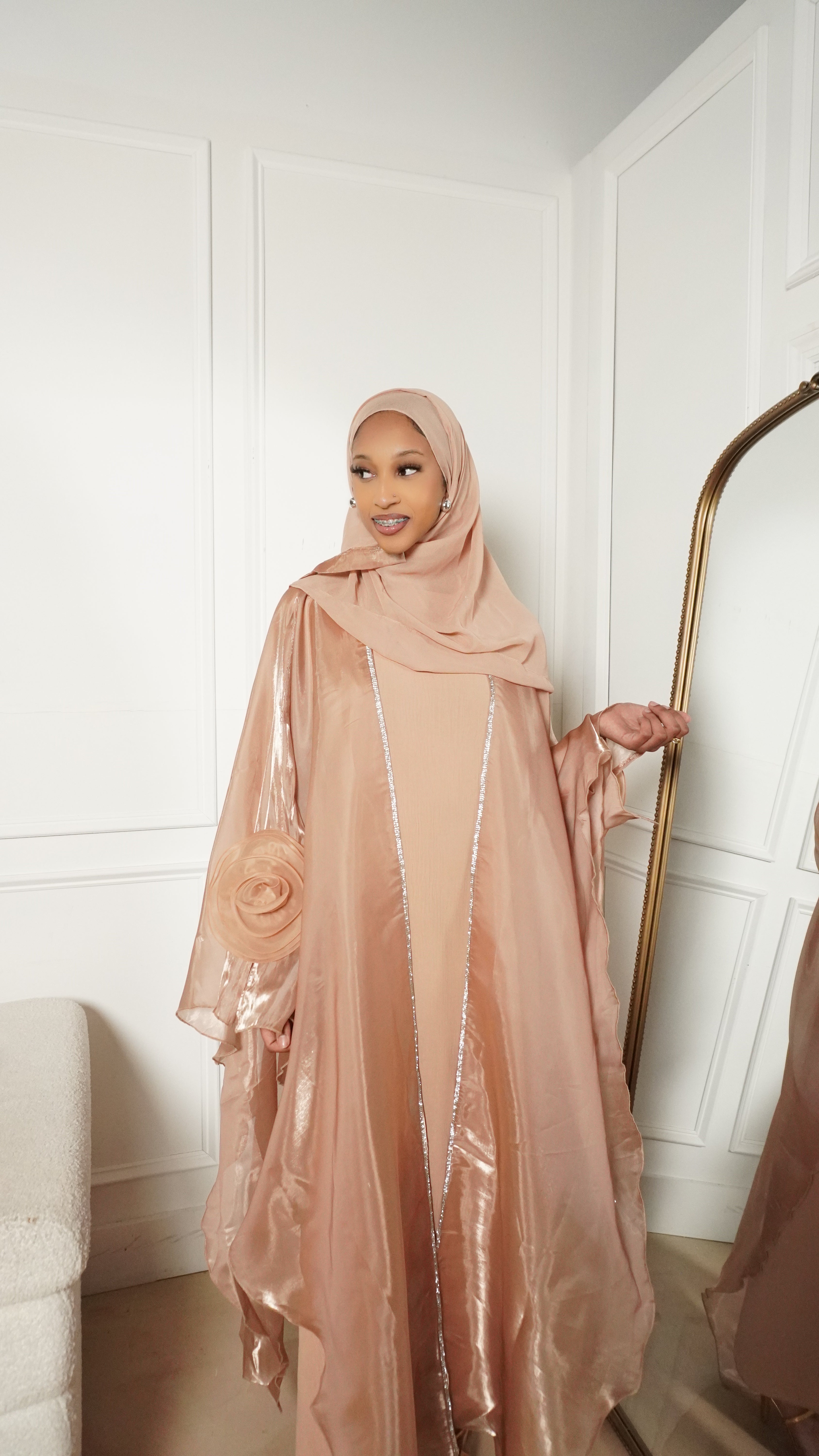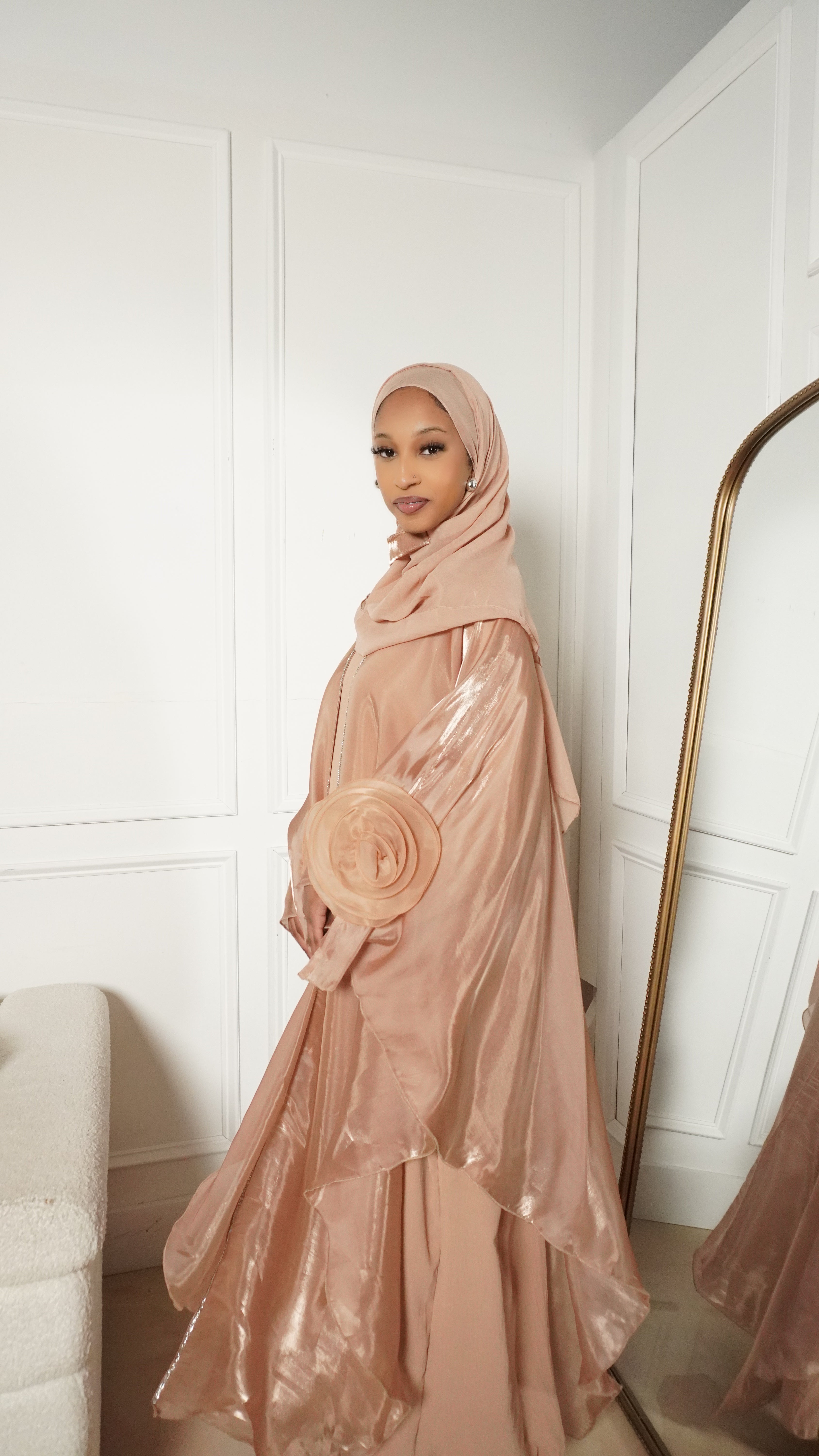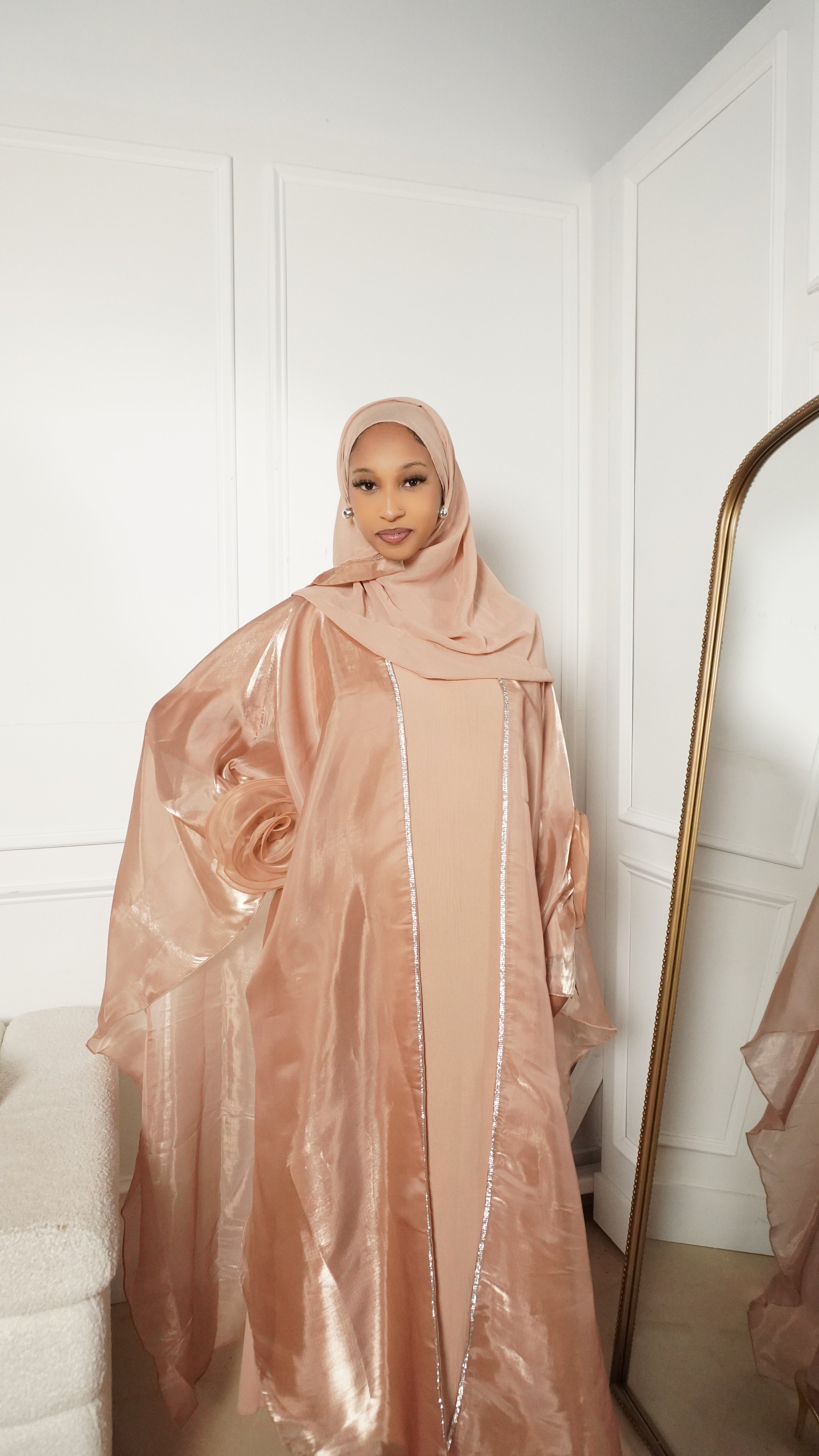 • Beautiful rose gold cream colored abaya with elegant flower detailing on the sleeve