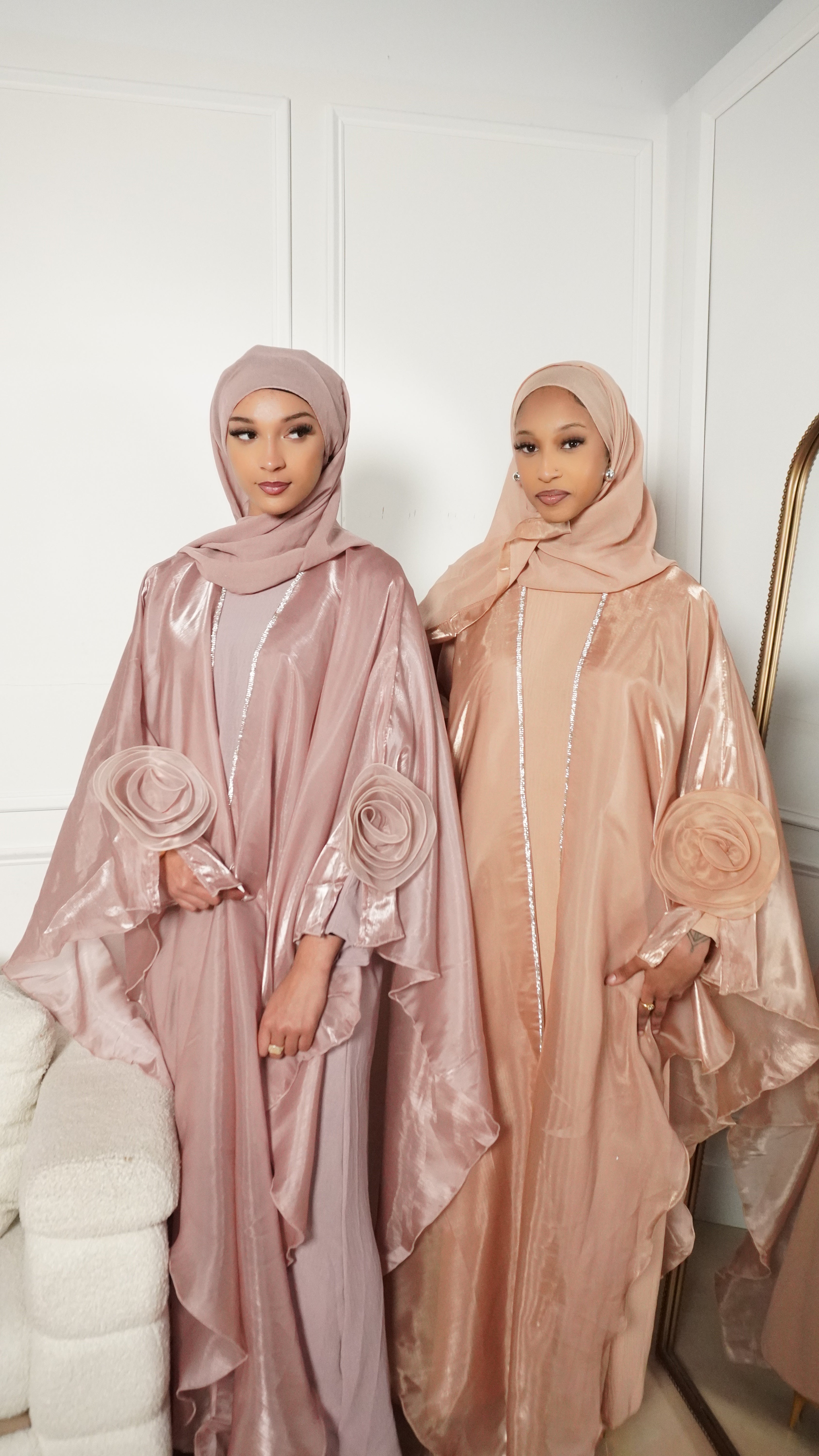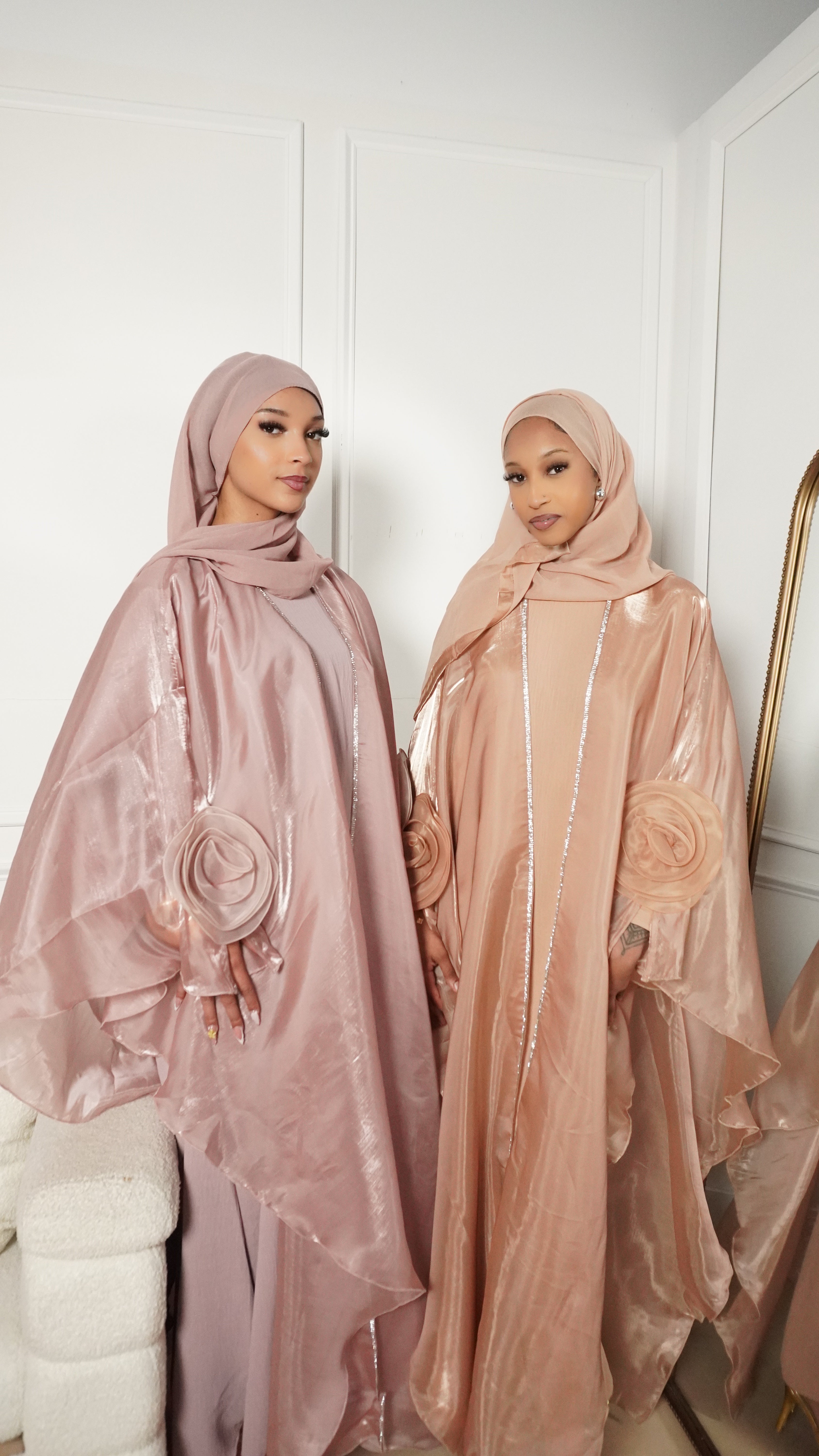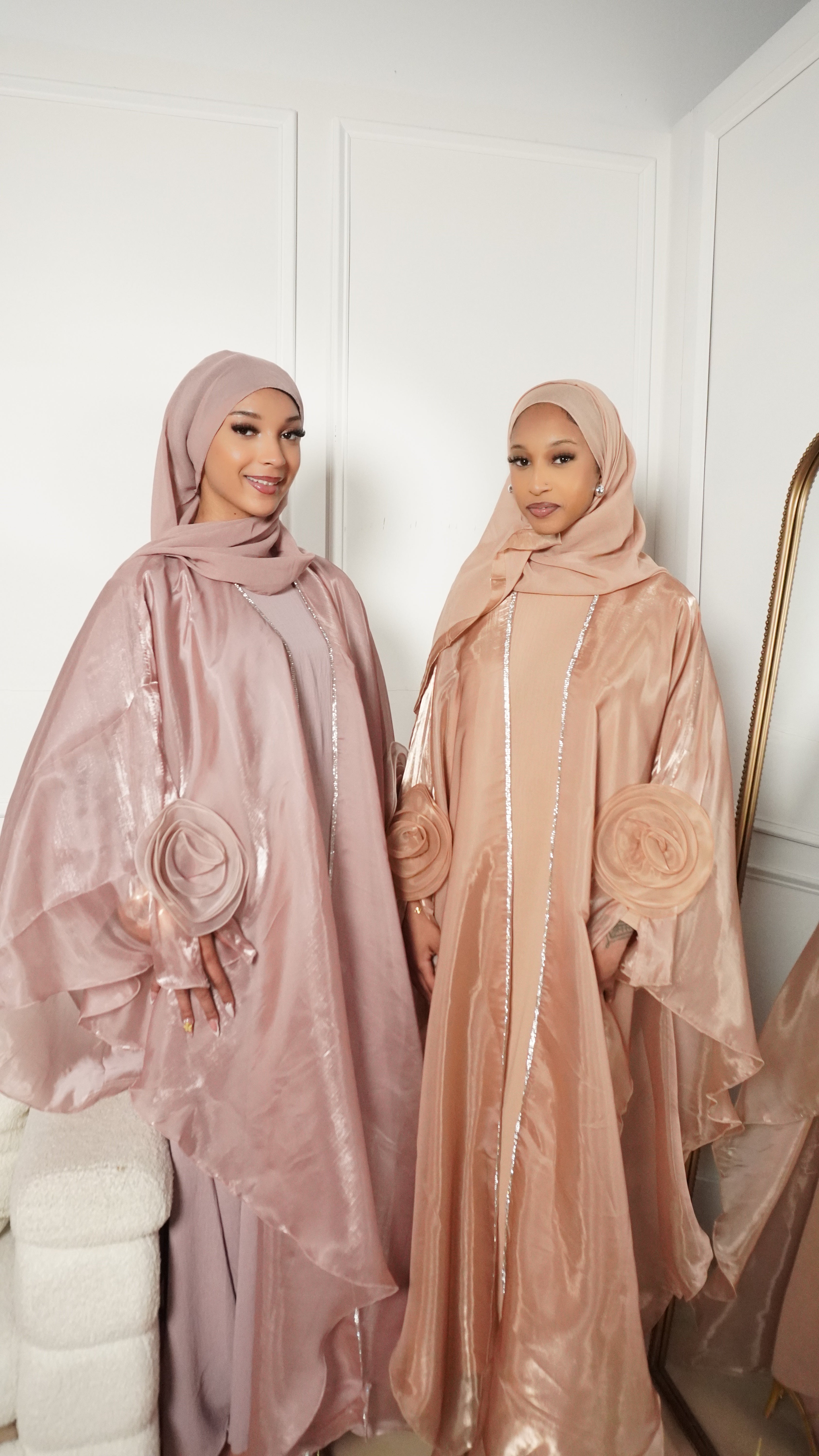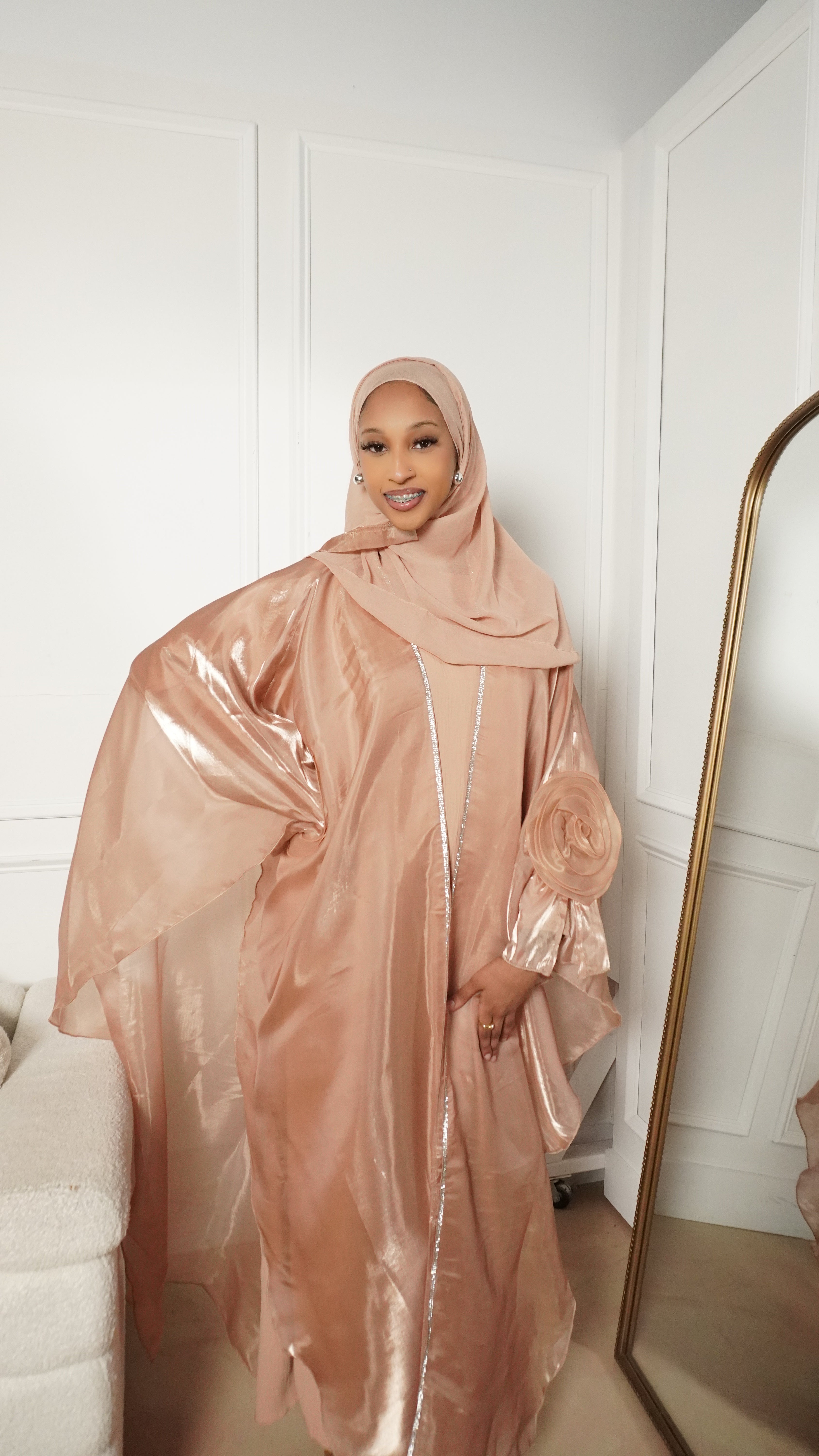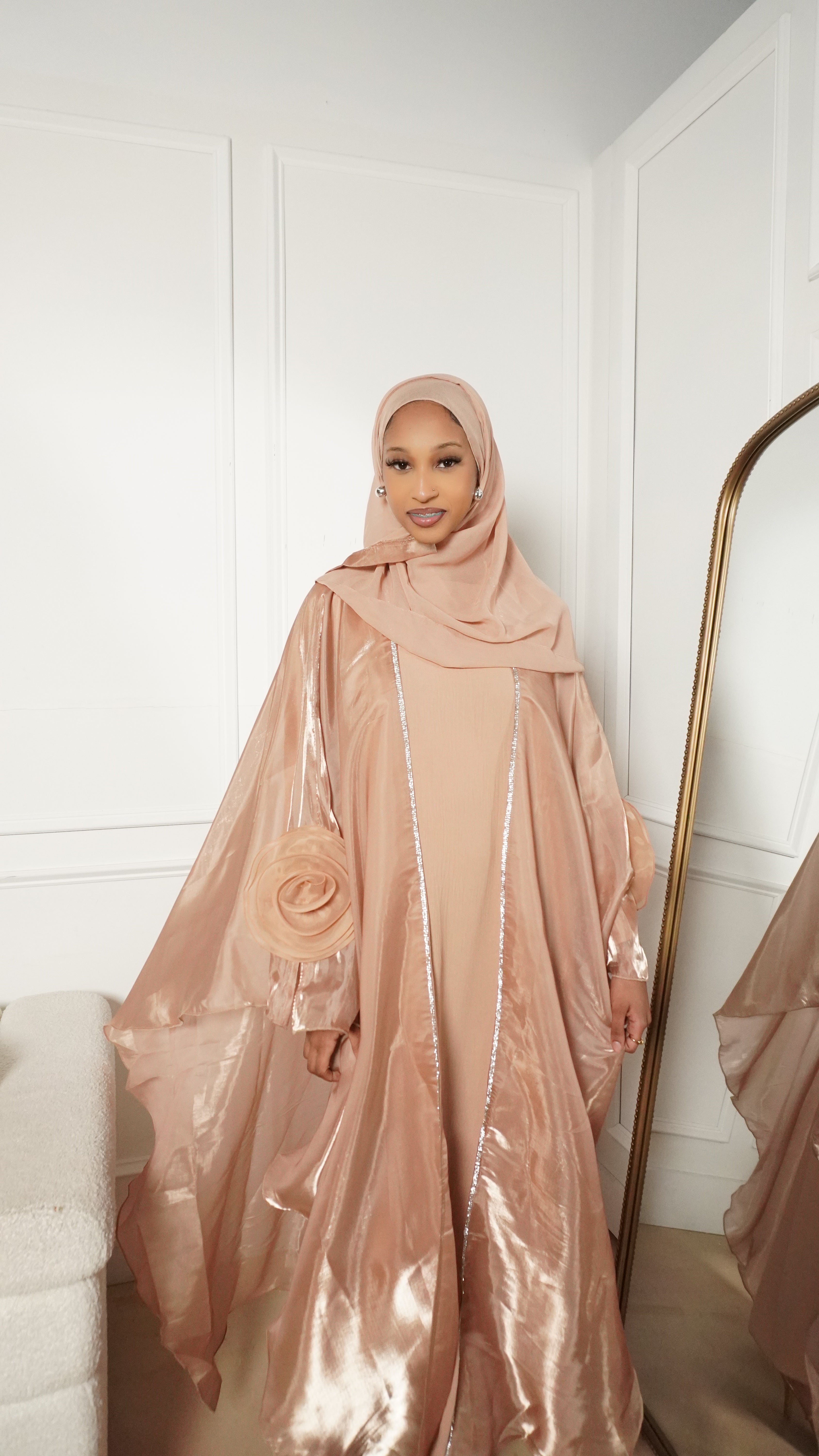 • Beautiful rose gold cream colored abaya with elegant flower detailing on the sleeve
