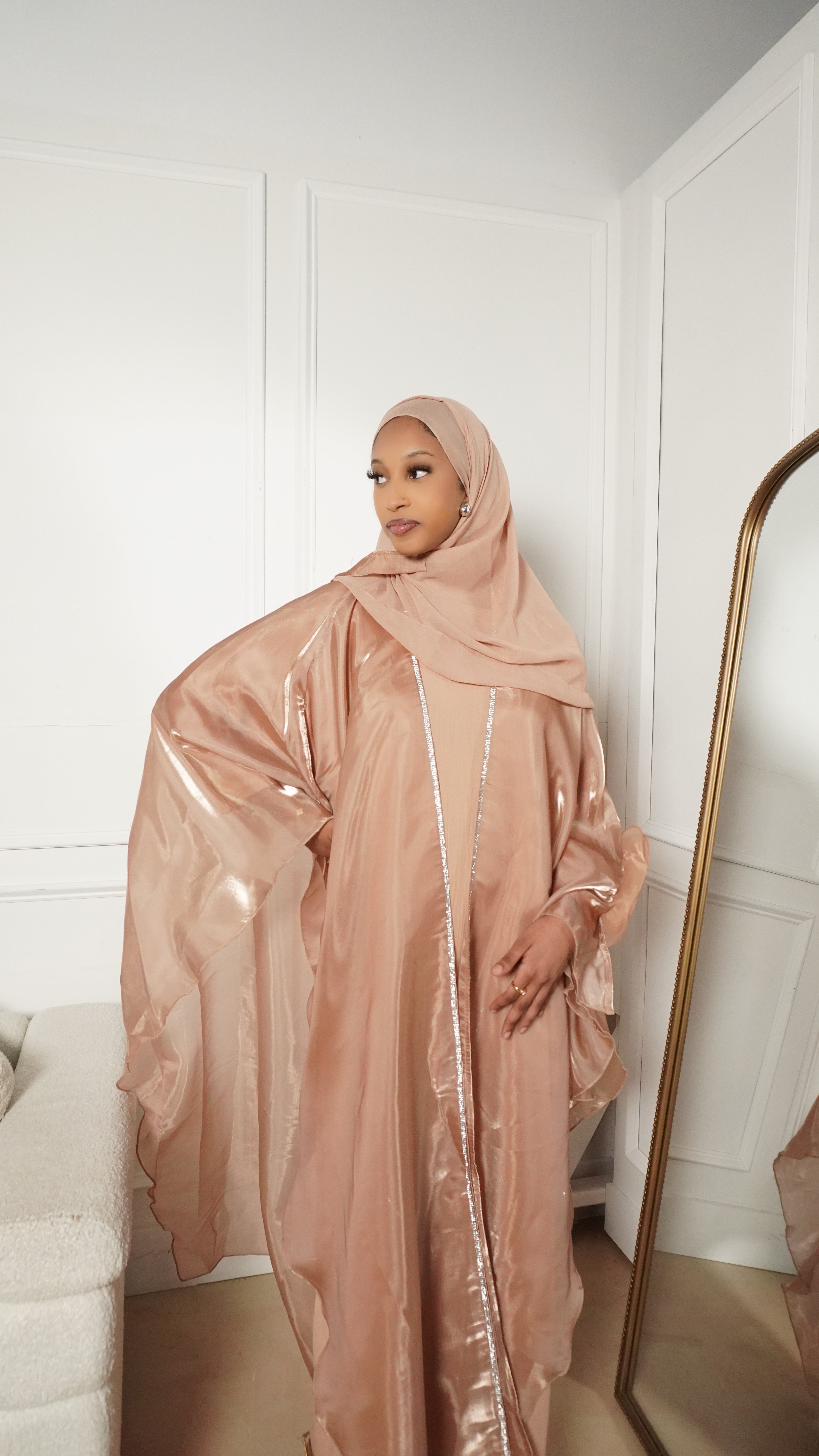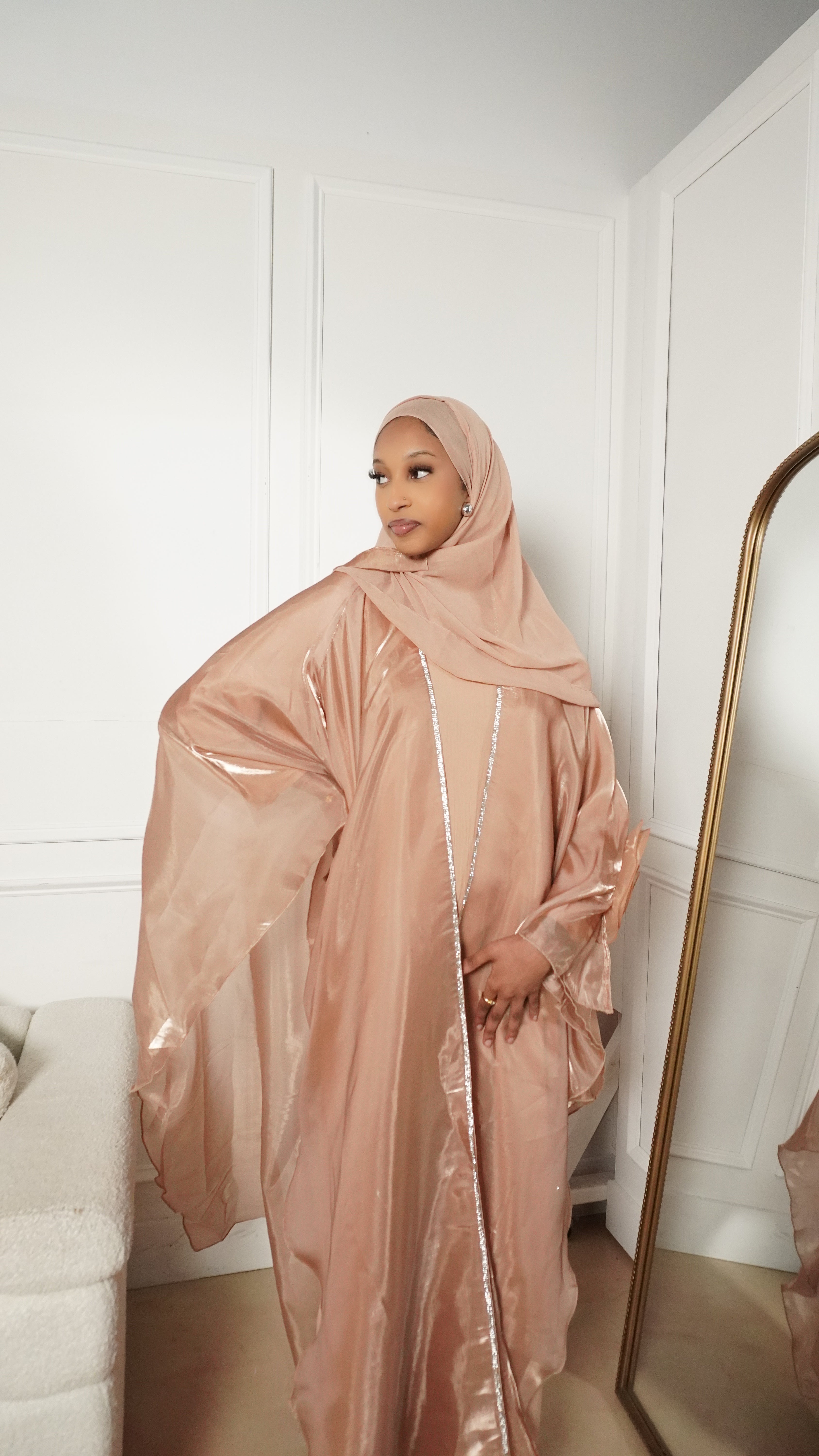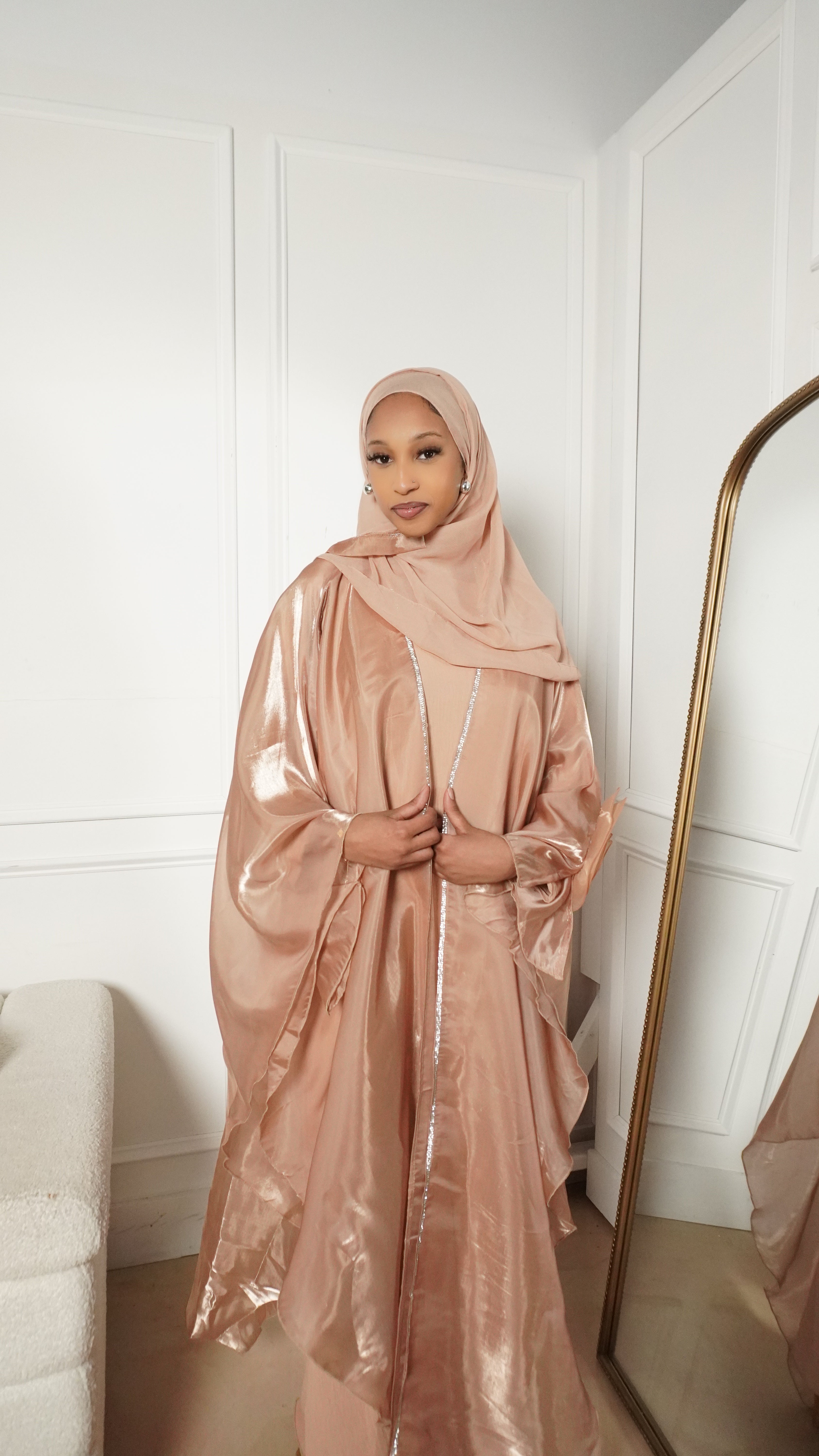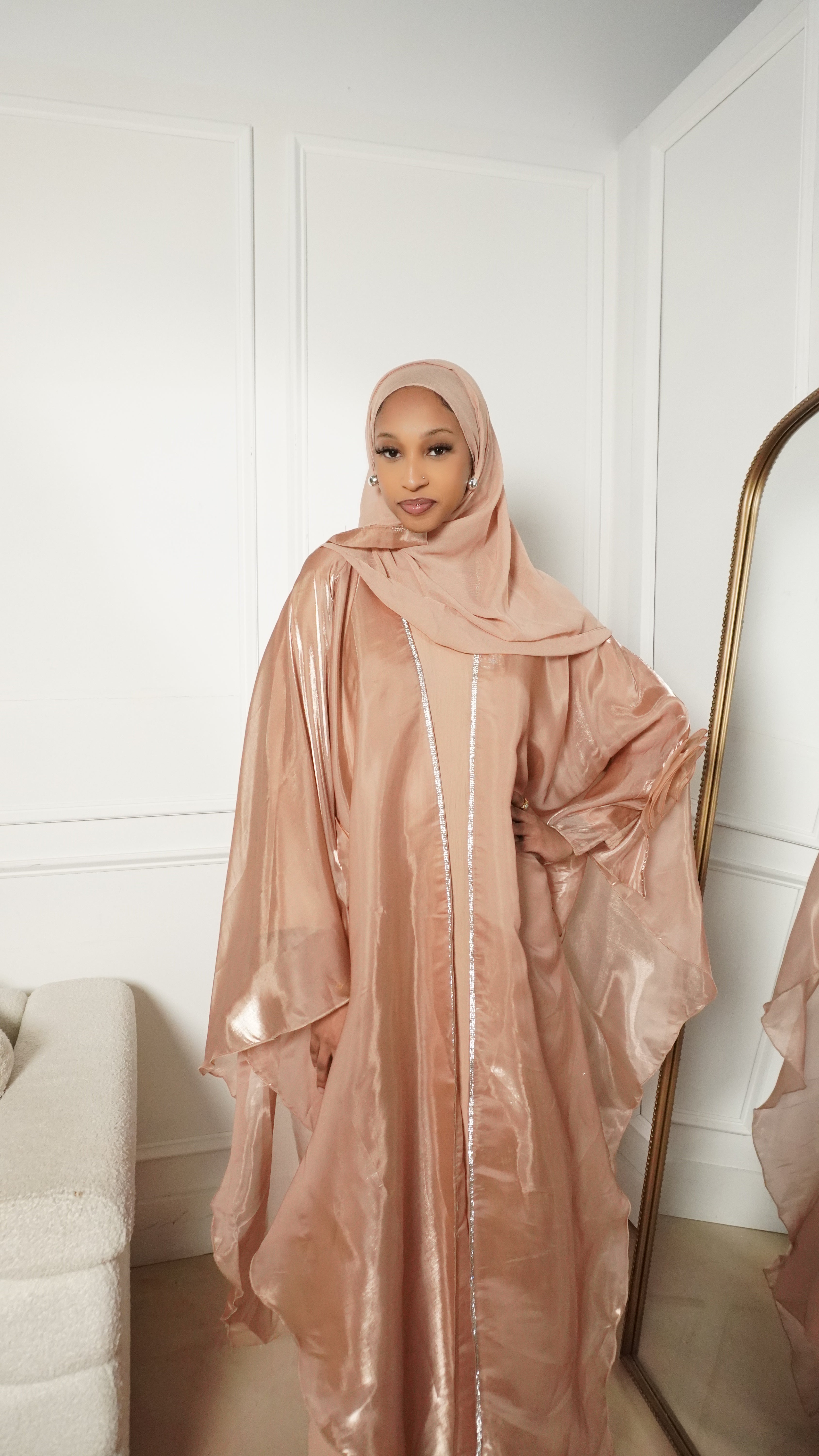 • Beautiful rose gold cream colored abaya with elegant flower detailing on the sleeve