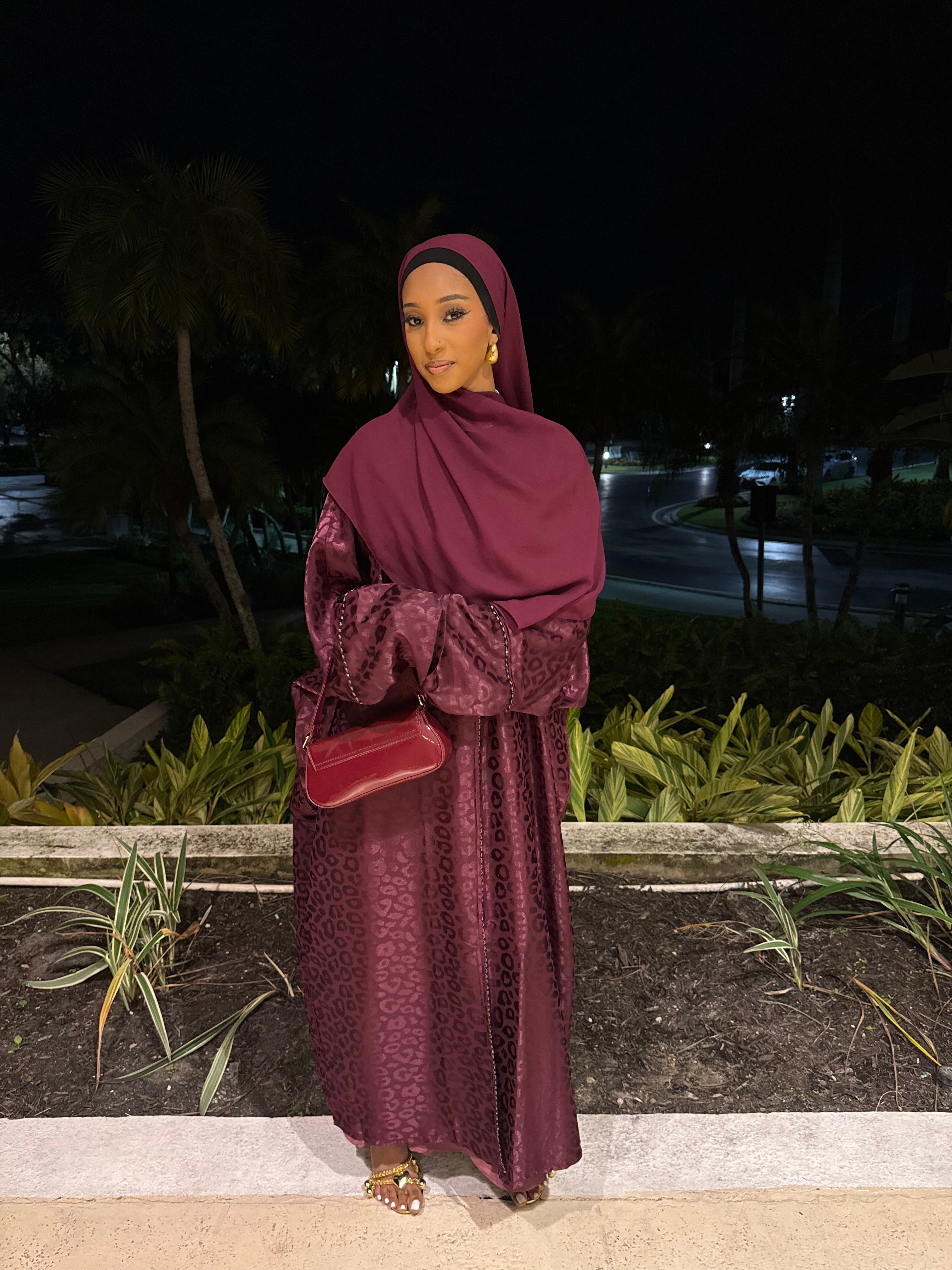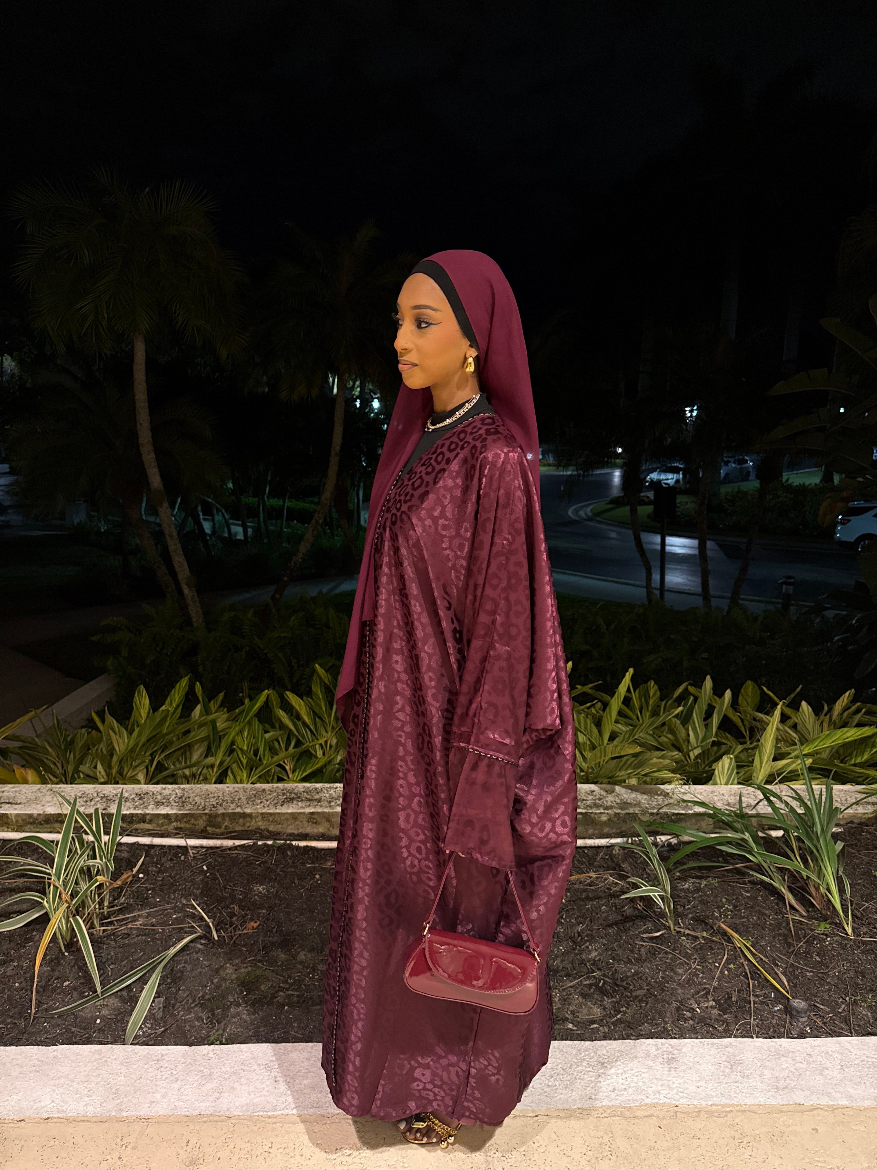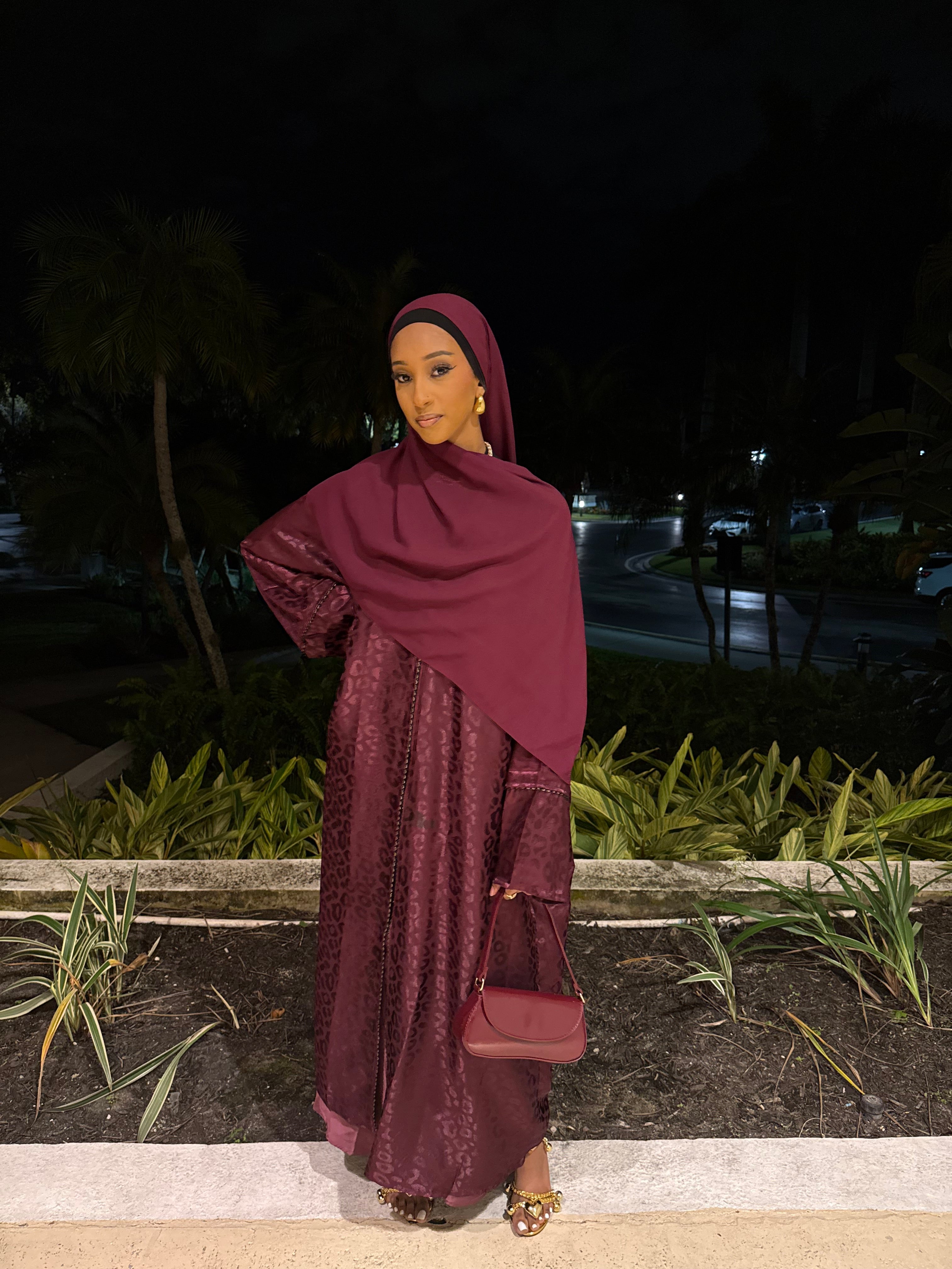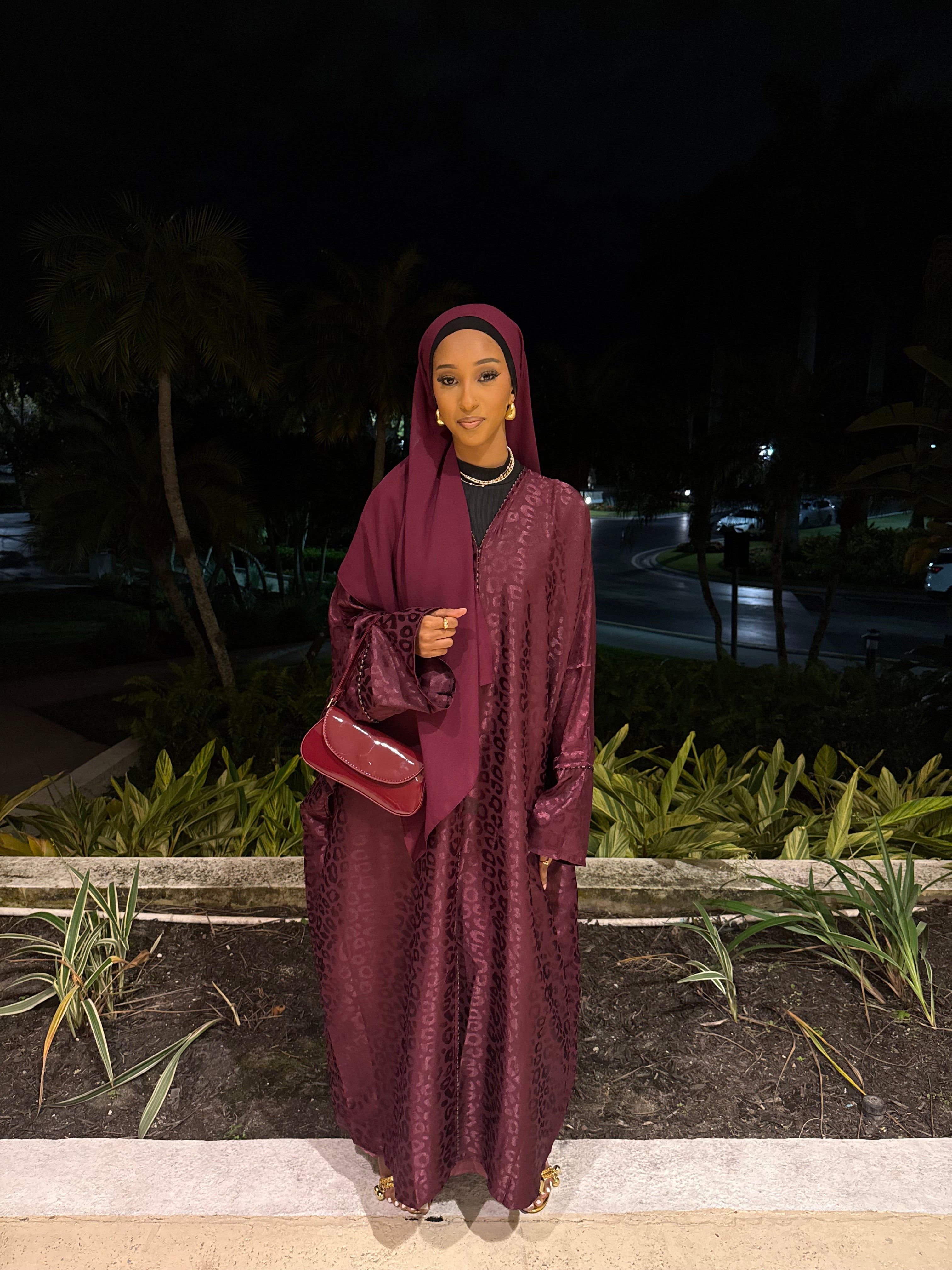 The Burgundy Kisses abaya set features a deep burgundy shade with a subtle jacquard texture, offering a rich and elegant look. Complete with a matching hijab, this set is perfect for formal events or special occasions, combining modesty with refined style.