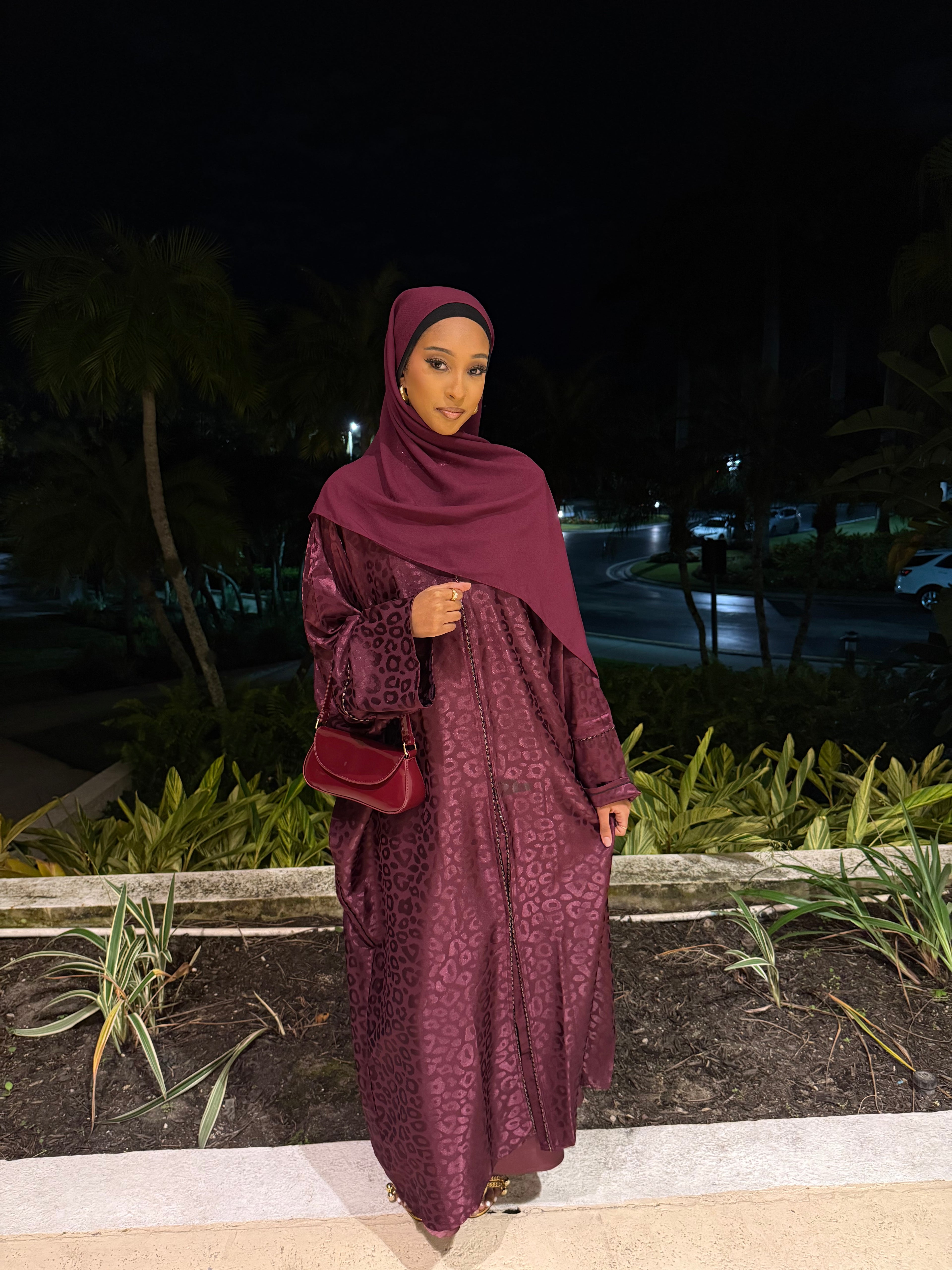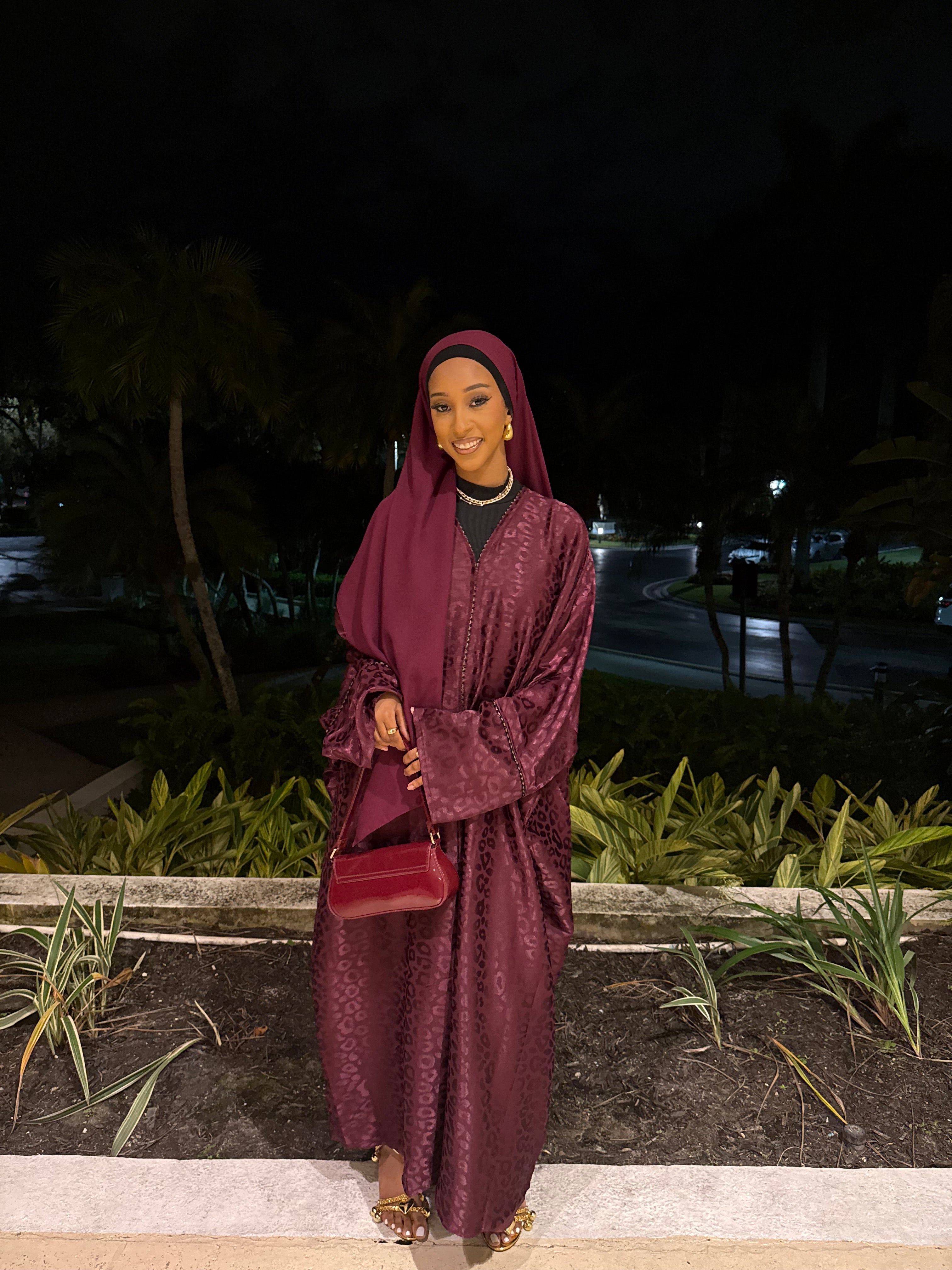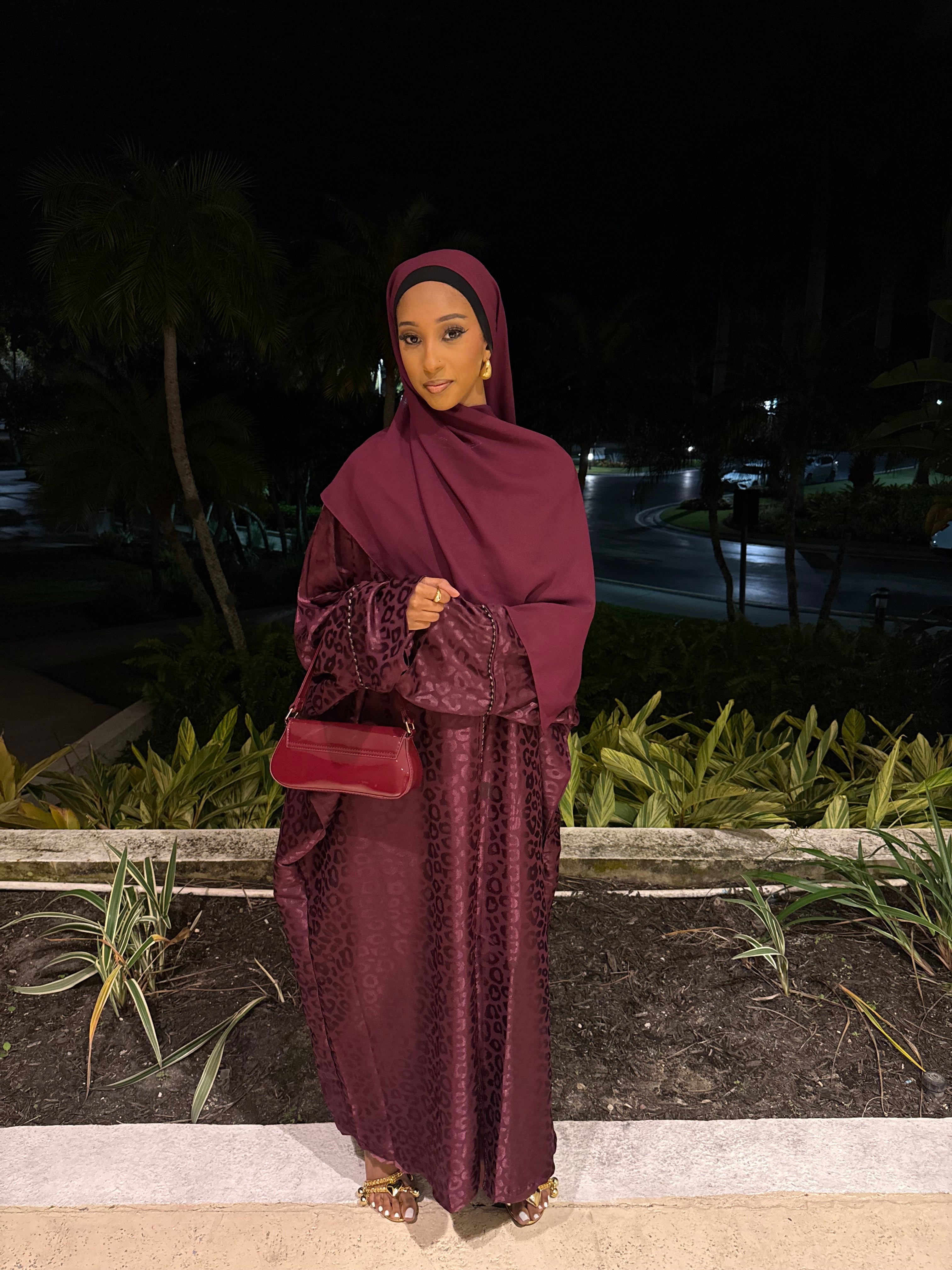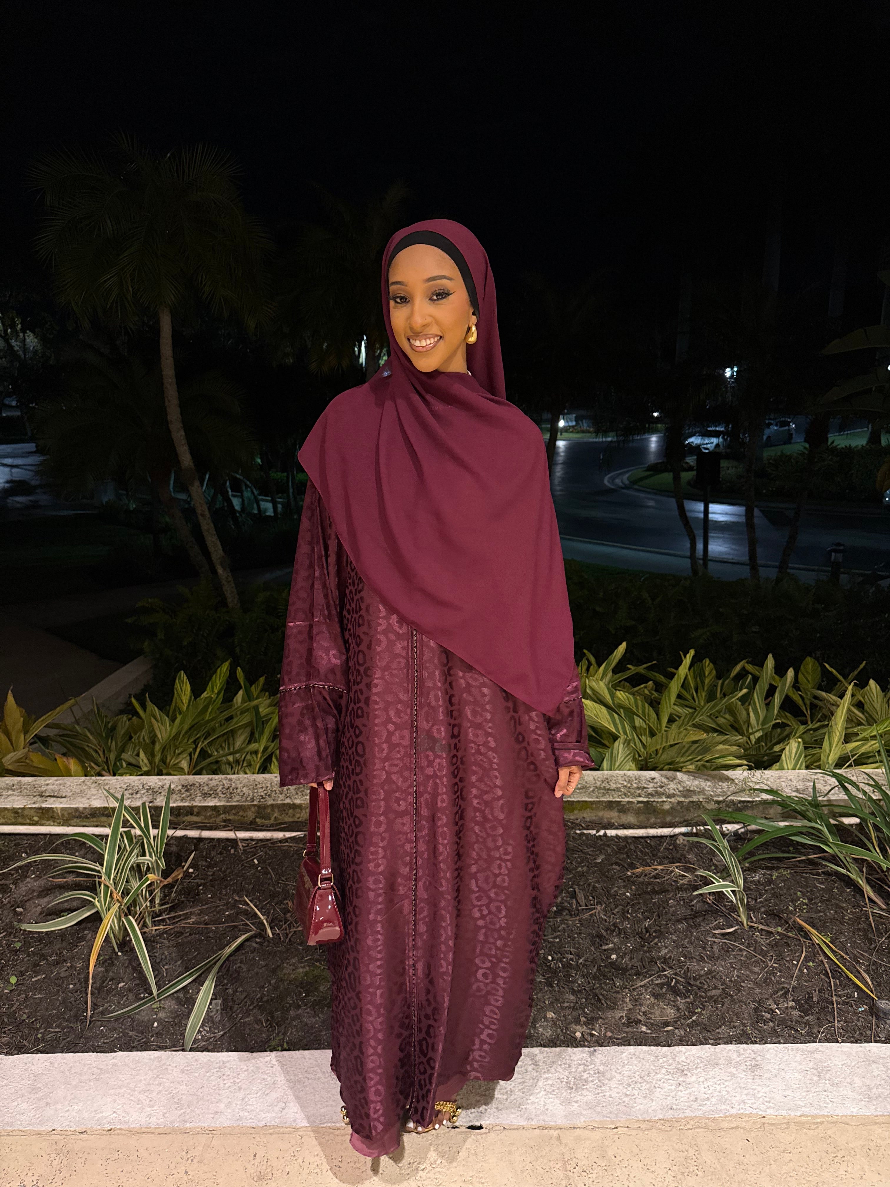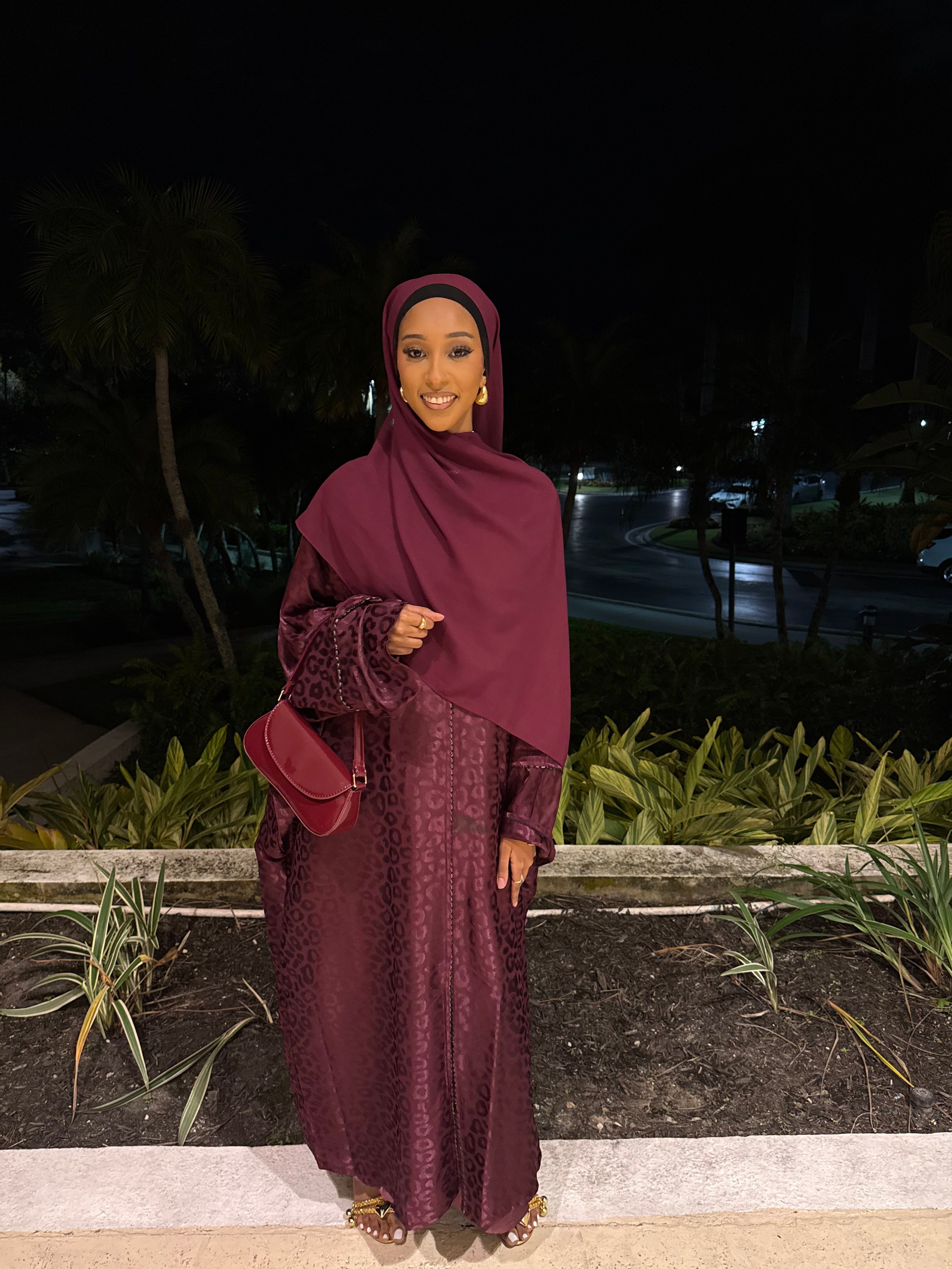 The Burgundy Kisses abaya set features a deep burgundy shade with a subtle jacquard texture, offering a rich and elegant look. Complete with a matching hijab, this set is perfect for formal events or special occasions, combining modesty with refined style.