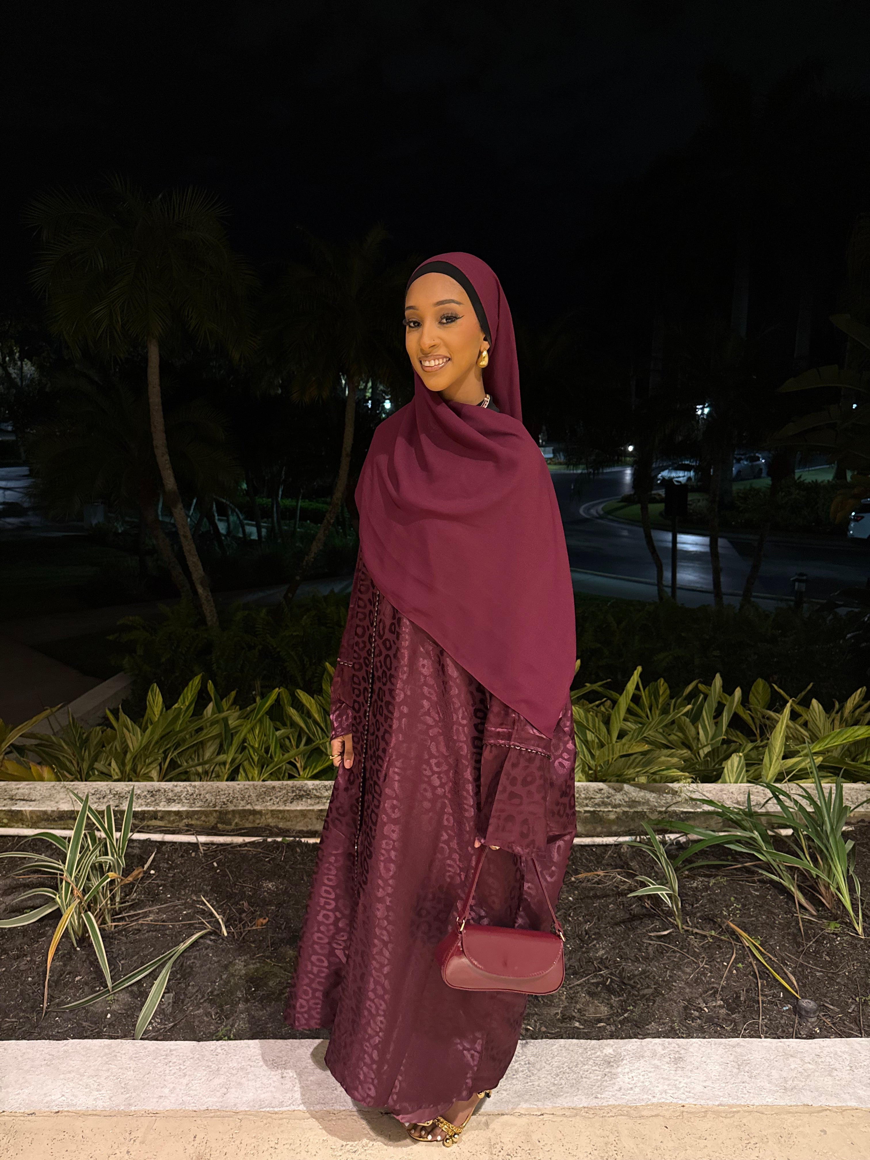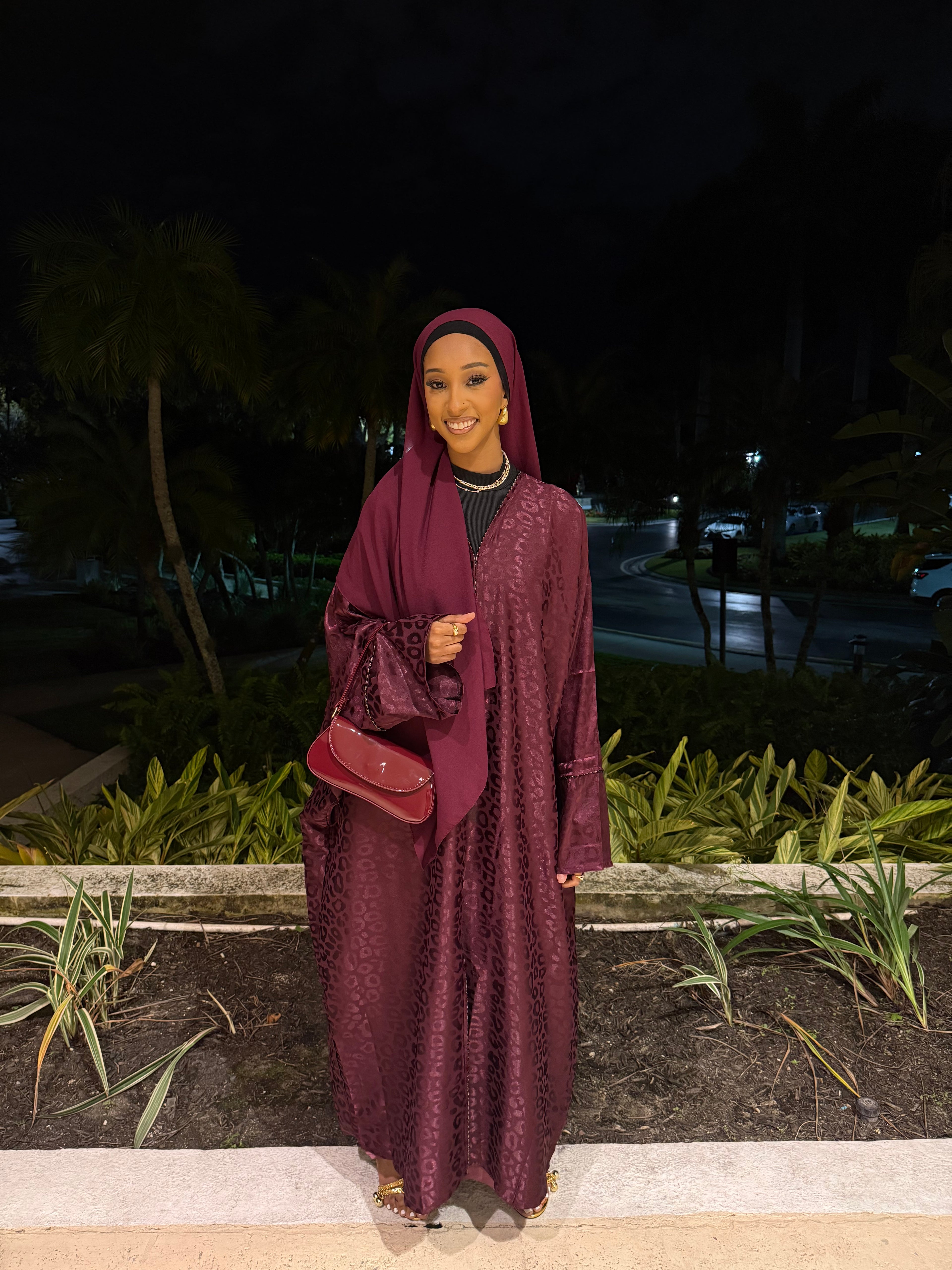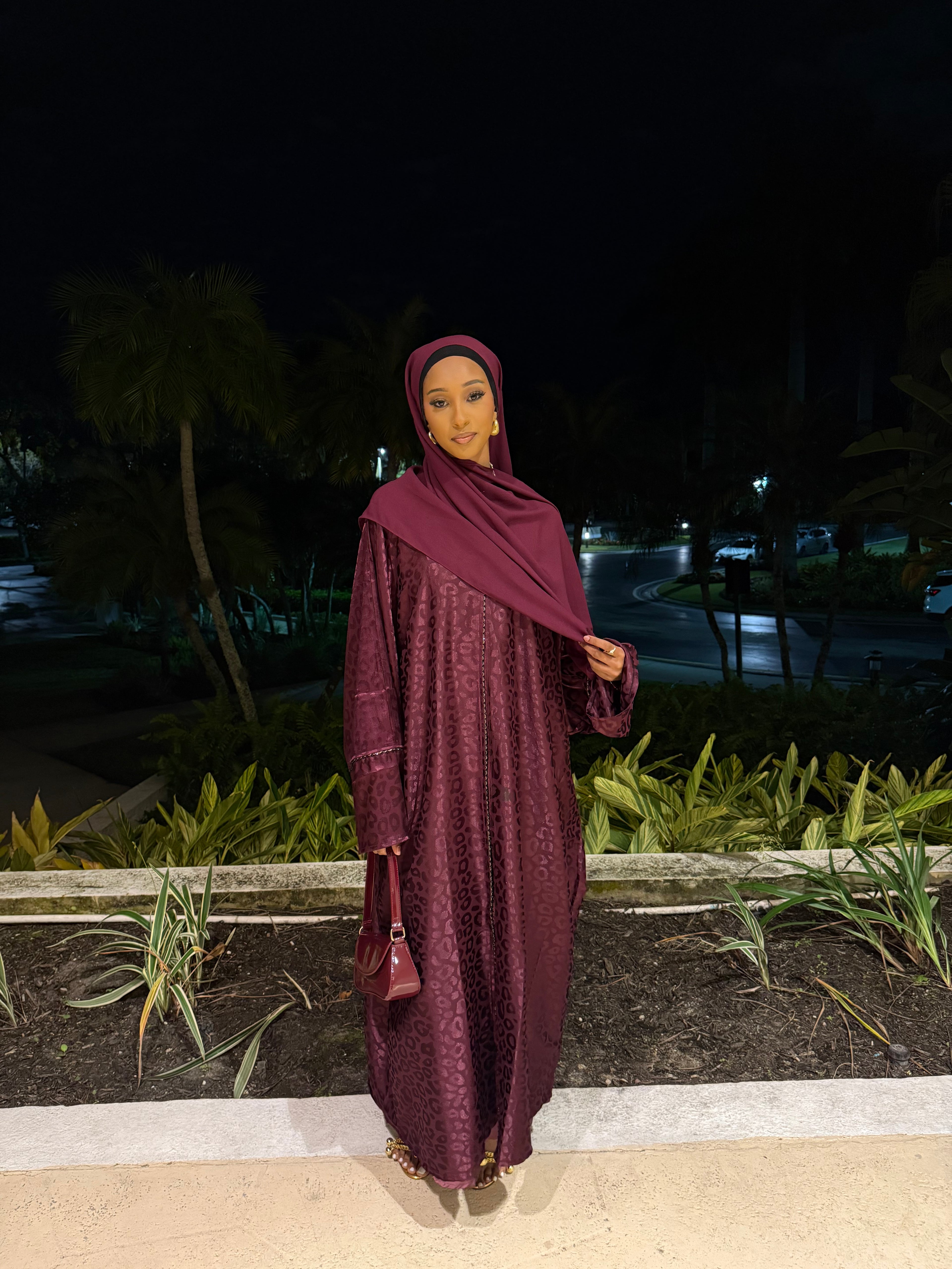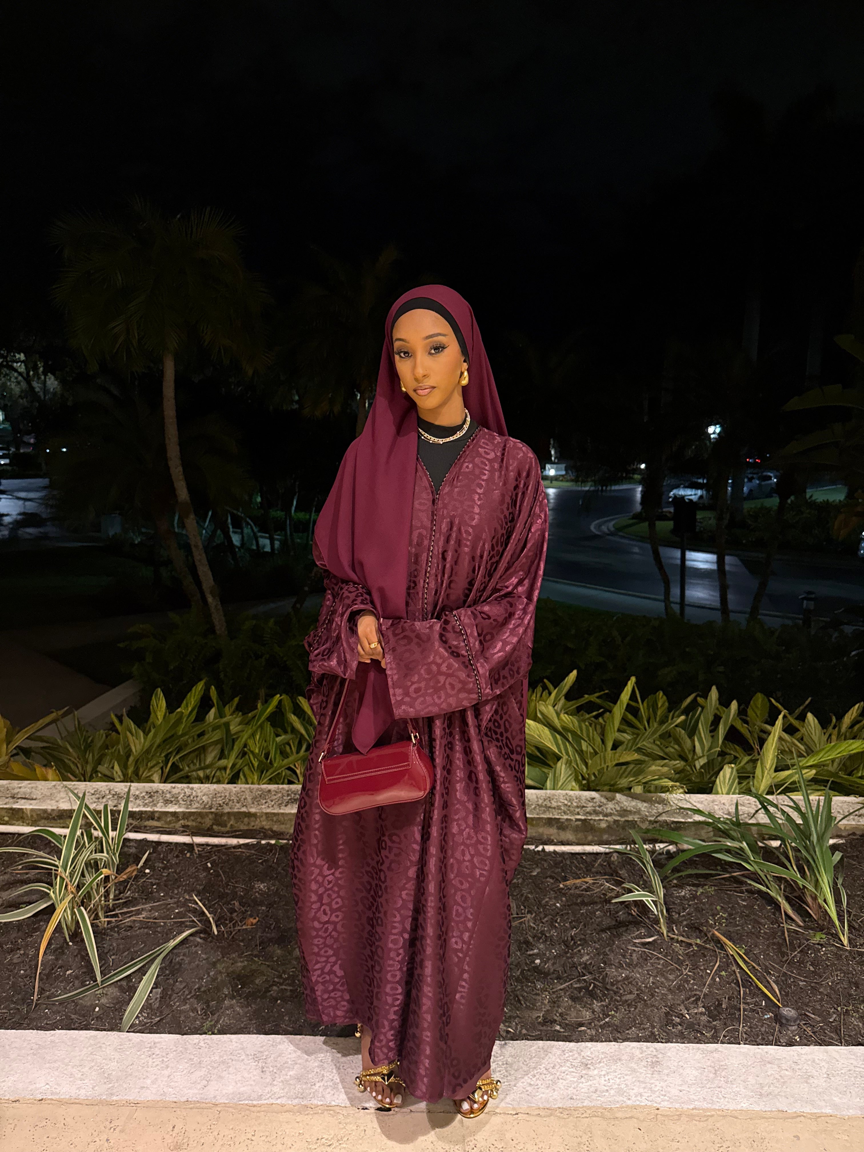 The Burgundy Kisses abaya set features a deep burgundy shade with a subtle jacquard texture, offering a rich and elegant look. Complete with a matching hijab, this set is perfect for formal events or special occasions, combining modesty with refined style.