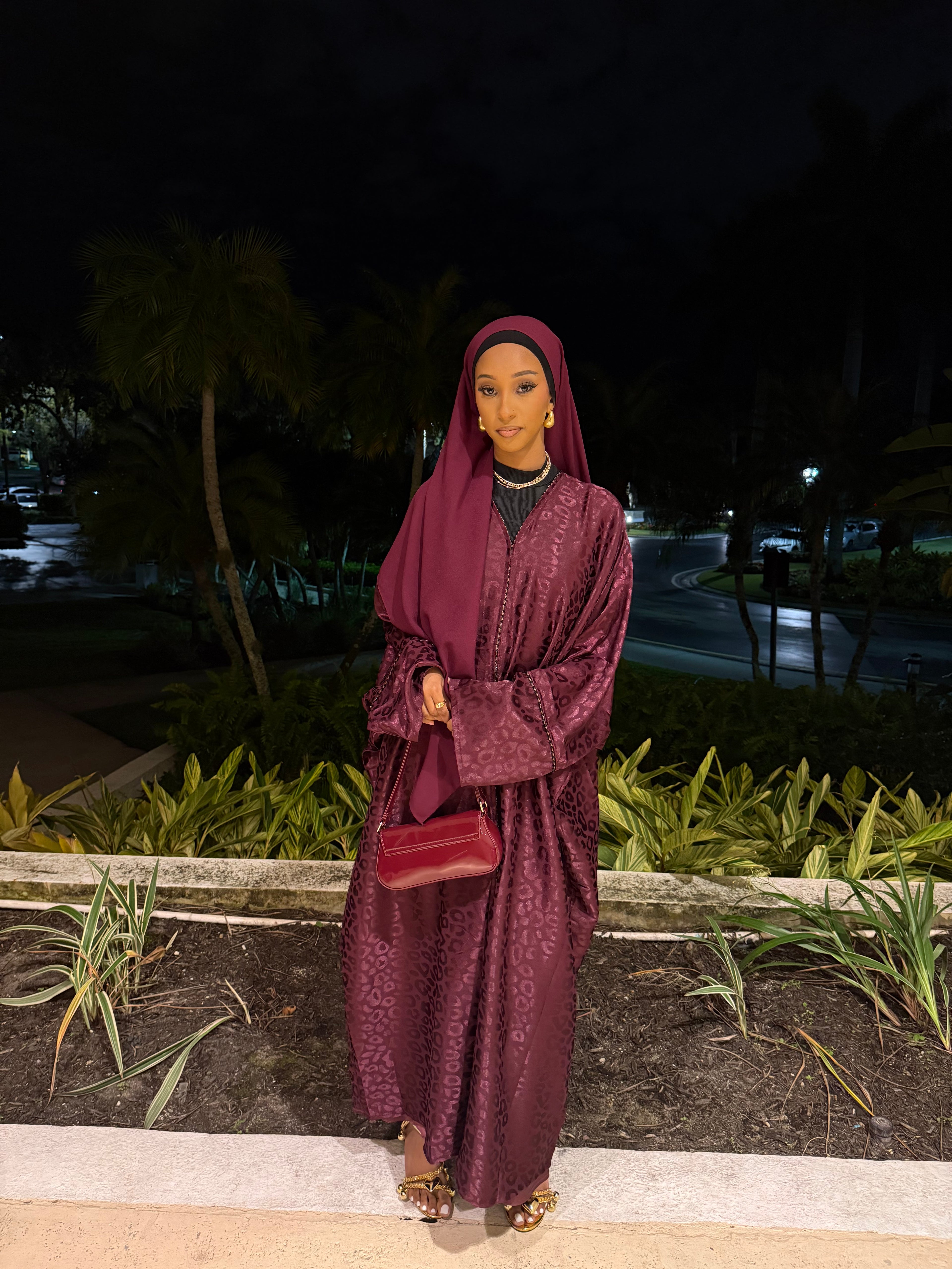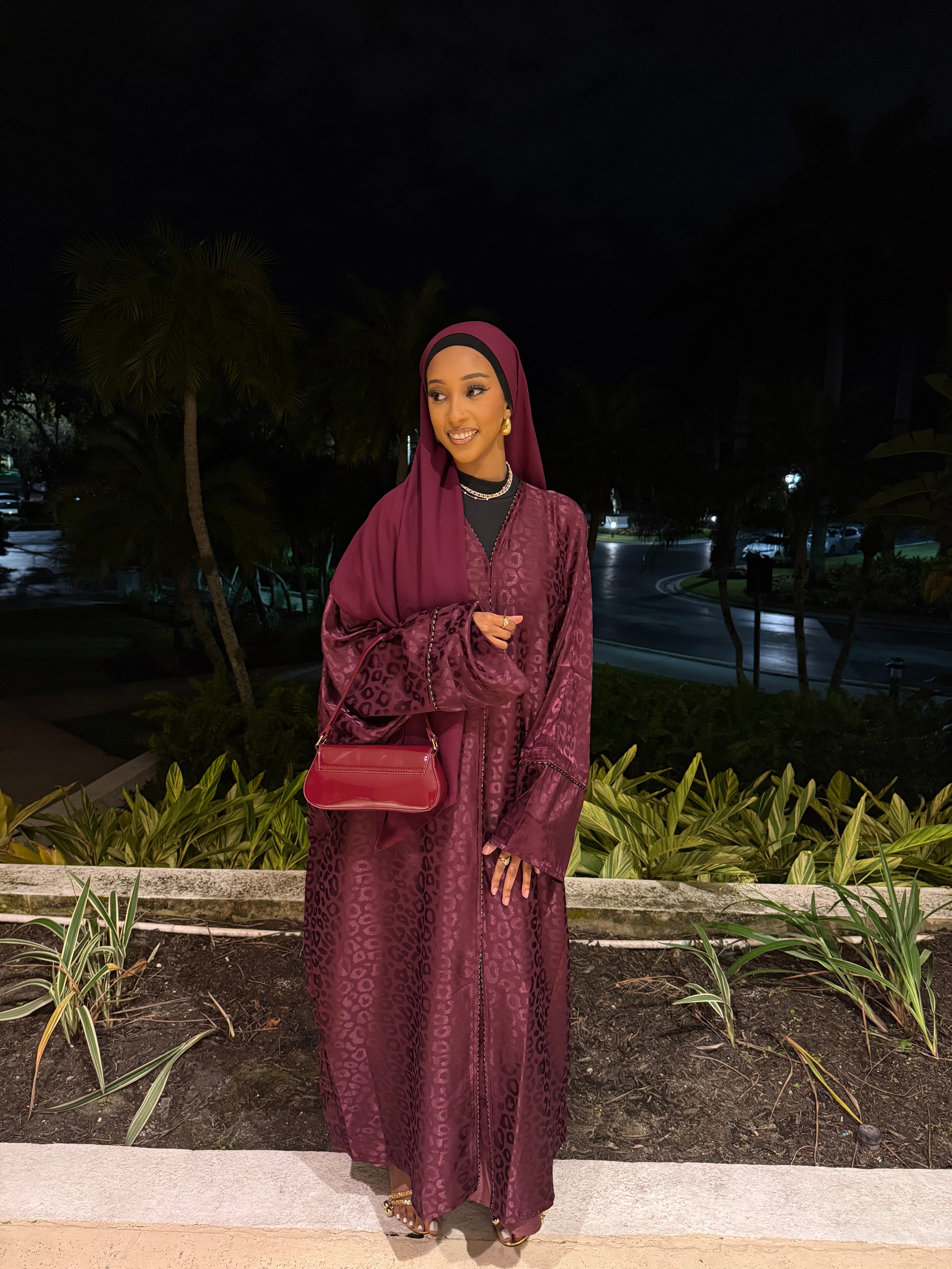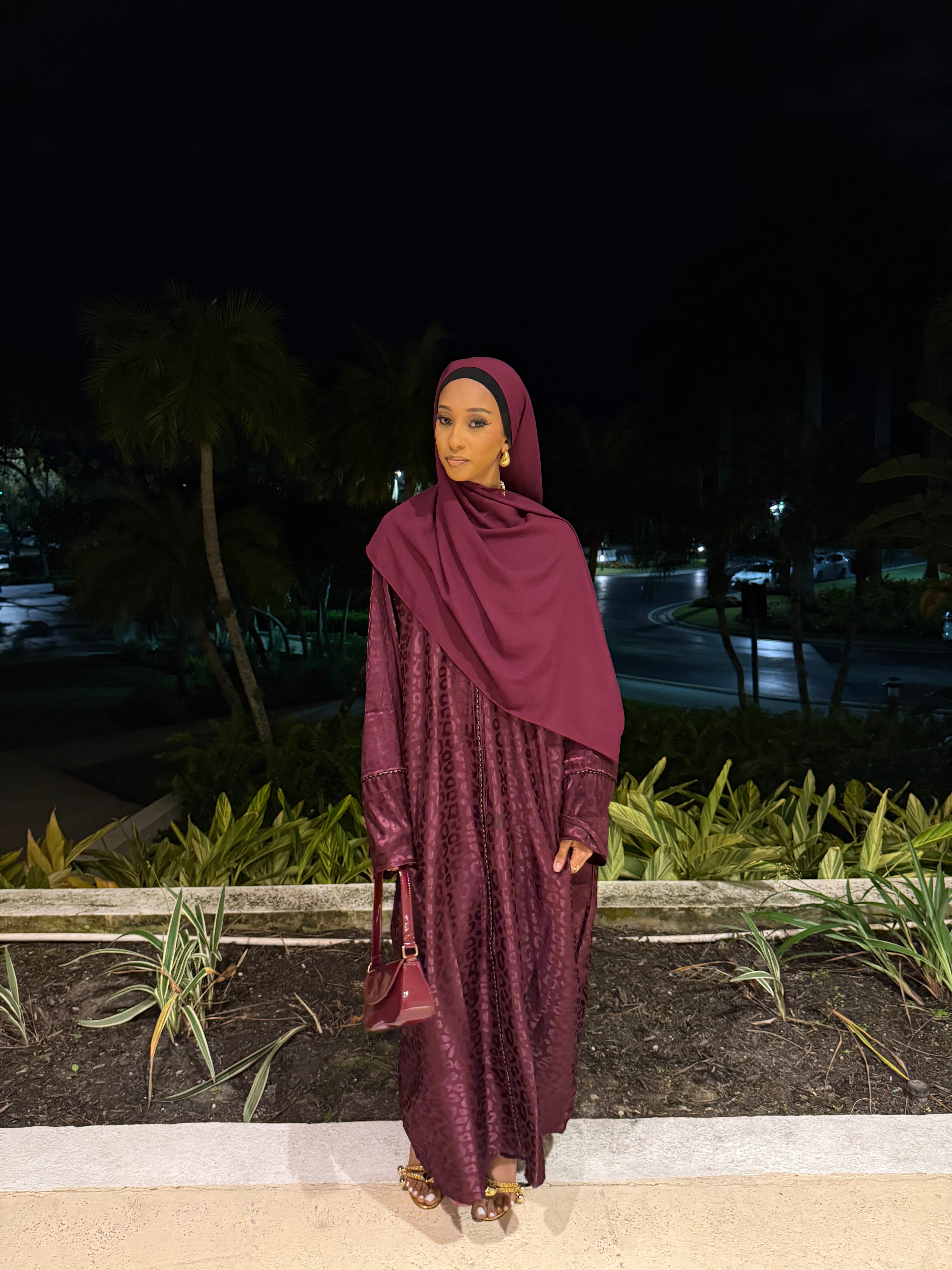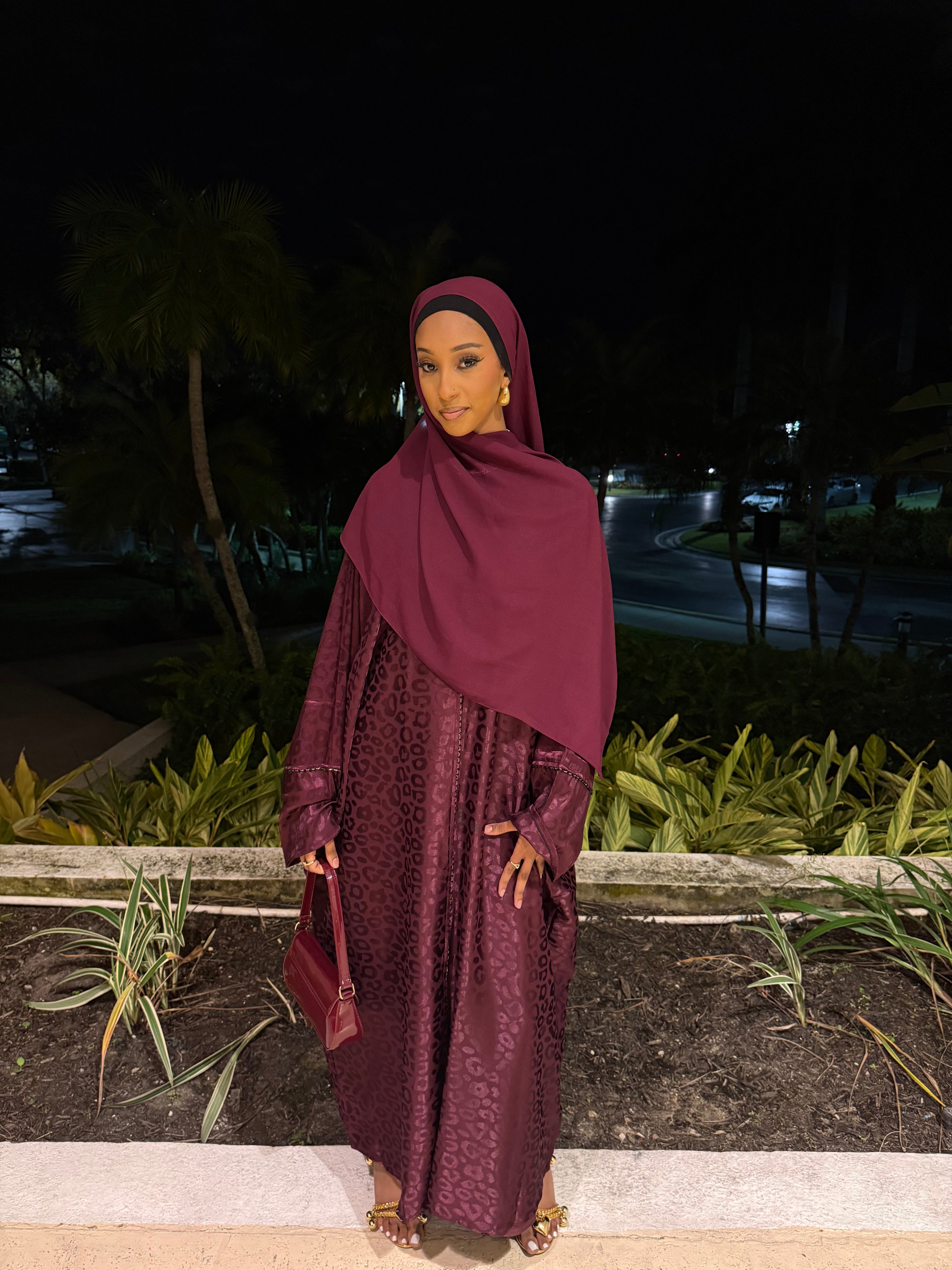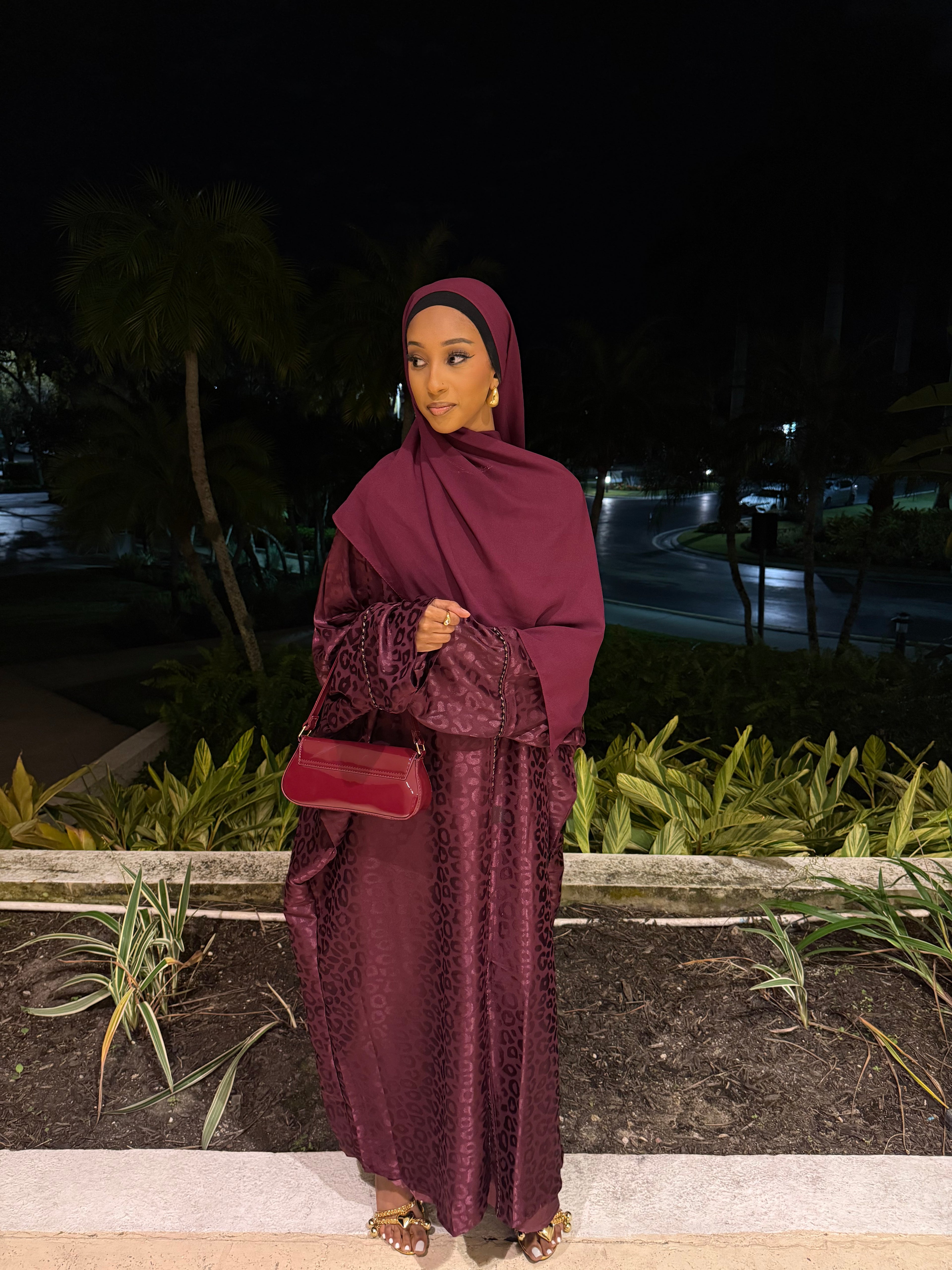 The Burgundy Kisses abaya set features a deep burgundy shade with a subtle jacquard texture, offering a rich and elegant look. Complete with a matching hijab, this set is perfect for formal events or special occasions, combining modesty with refined style.