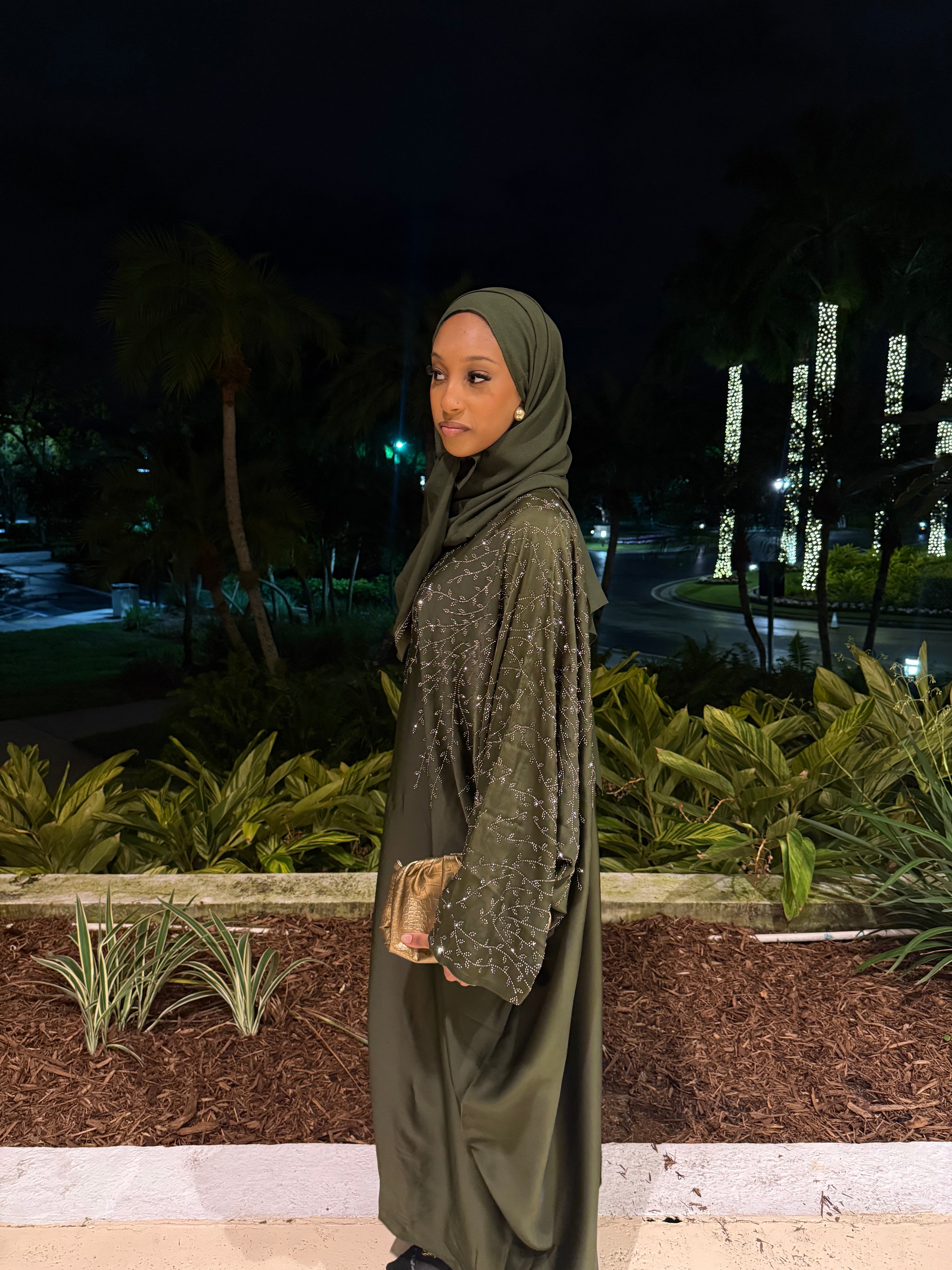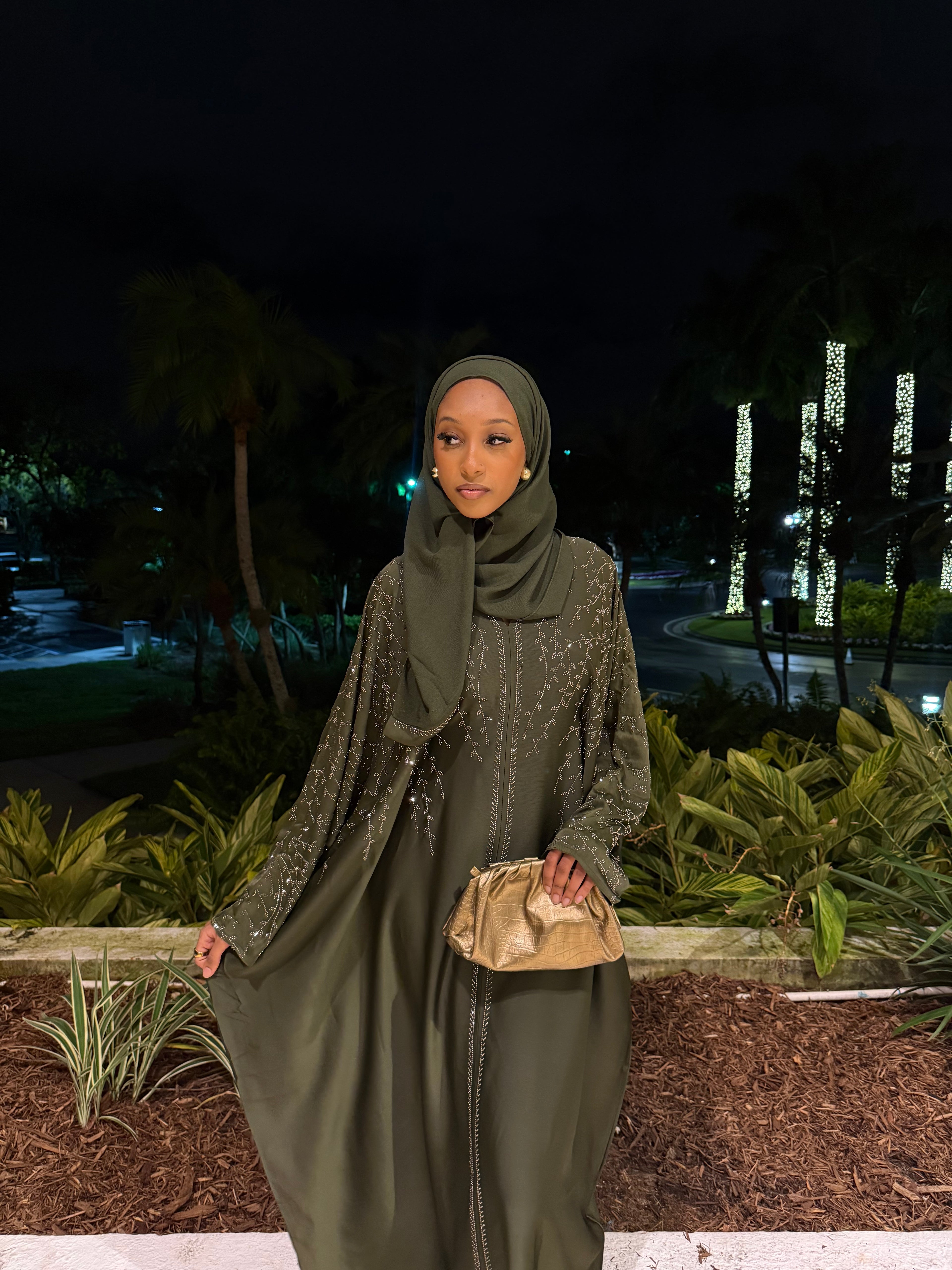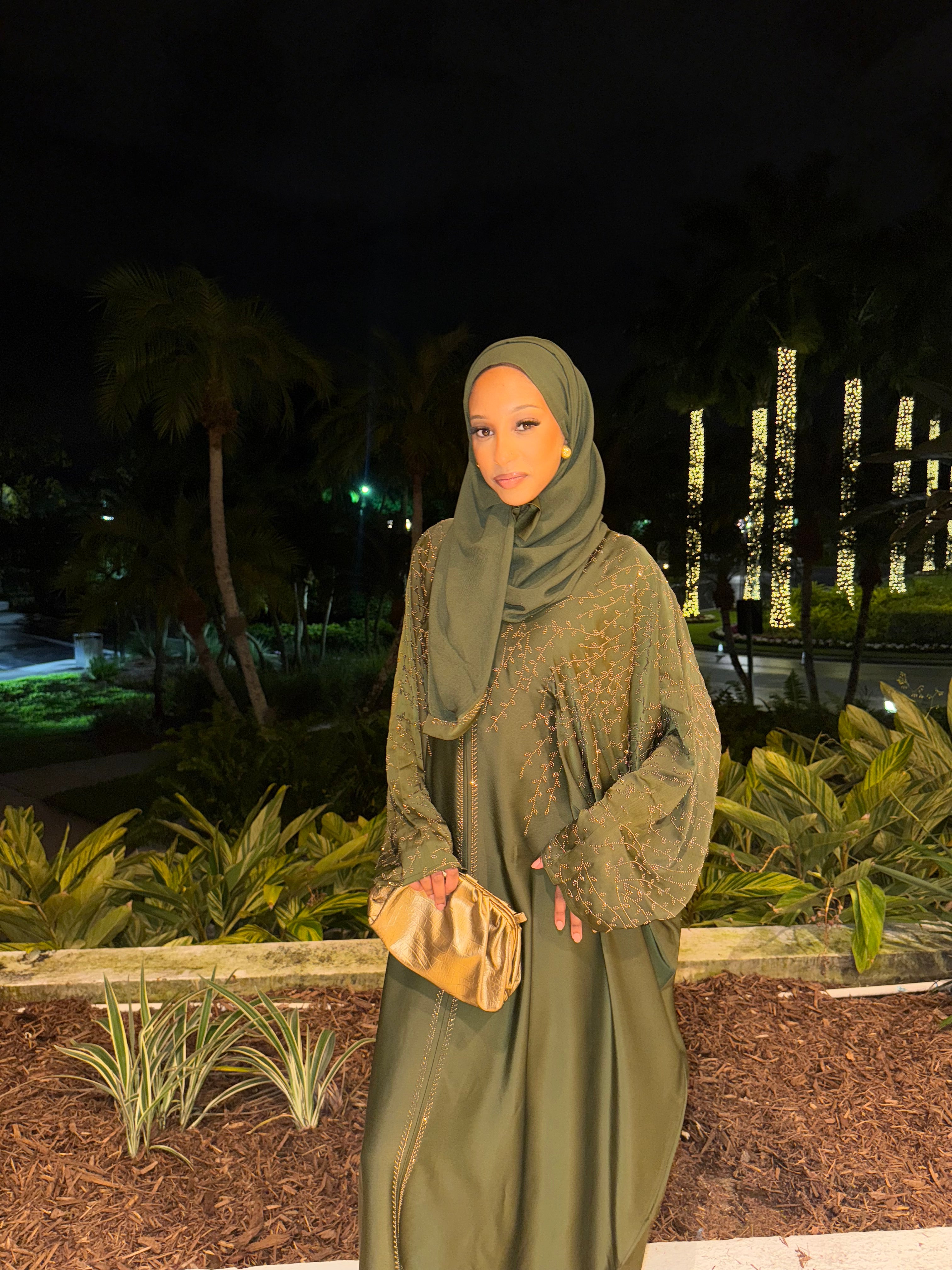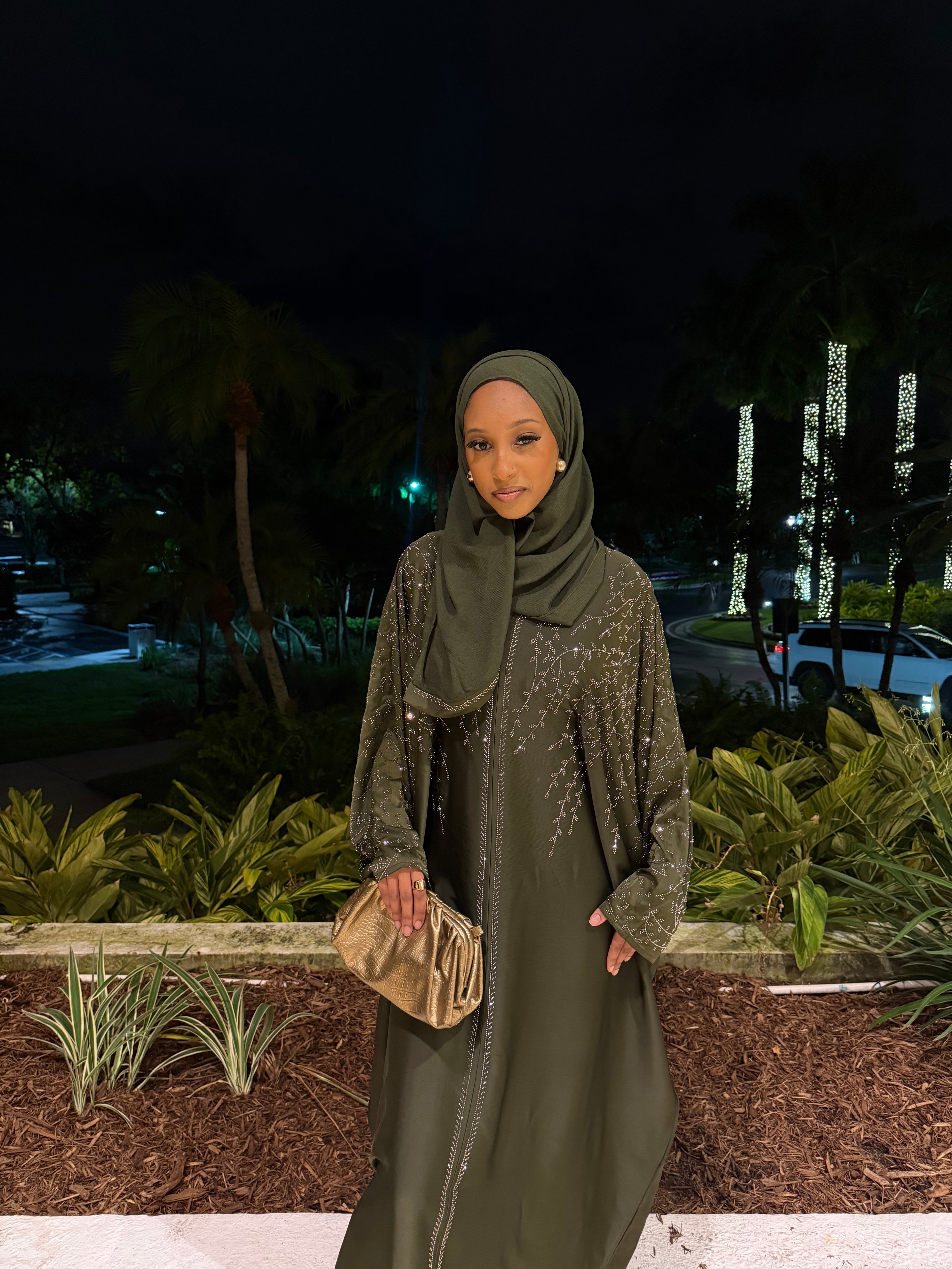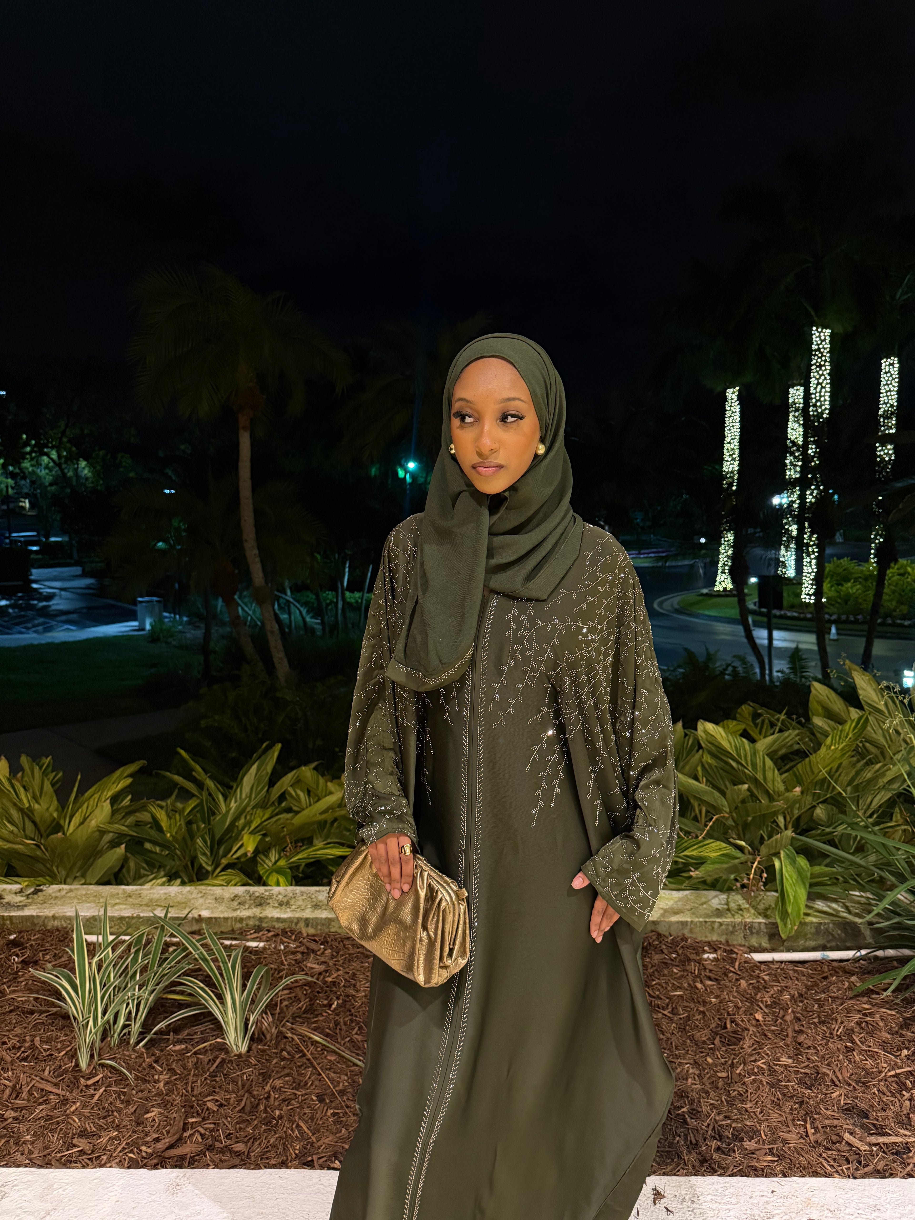 The Emerald Noor Abaya is one of those pieces that instantly makes you feel put together without trying too hard. The rich emerald-olive color is soft, elegant, and flattering, while the delicate gold embroidery adds just the right touch of luxury. It flows beautifully when you walk and feels comfortable all day or night.
