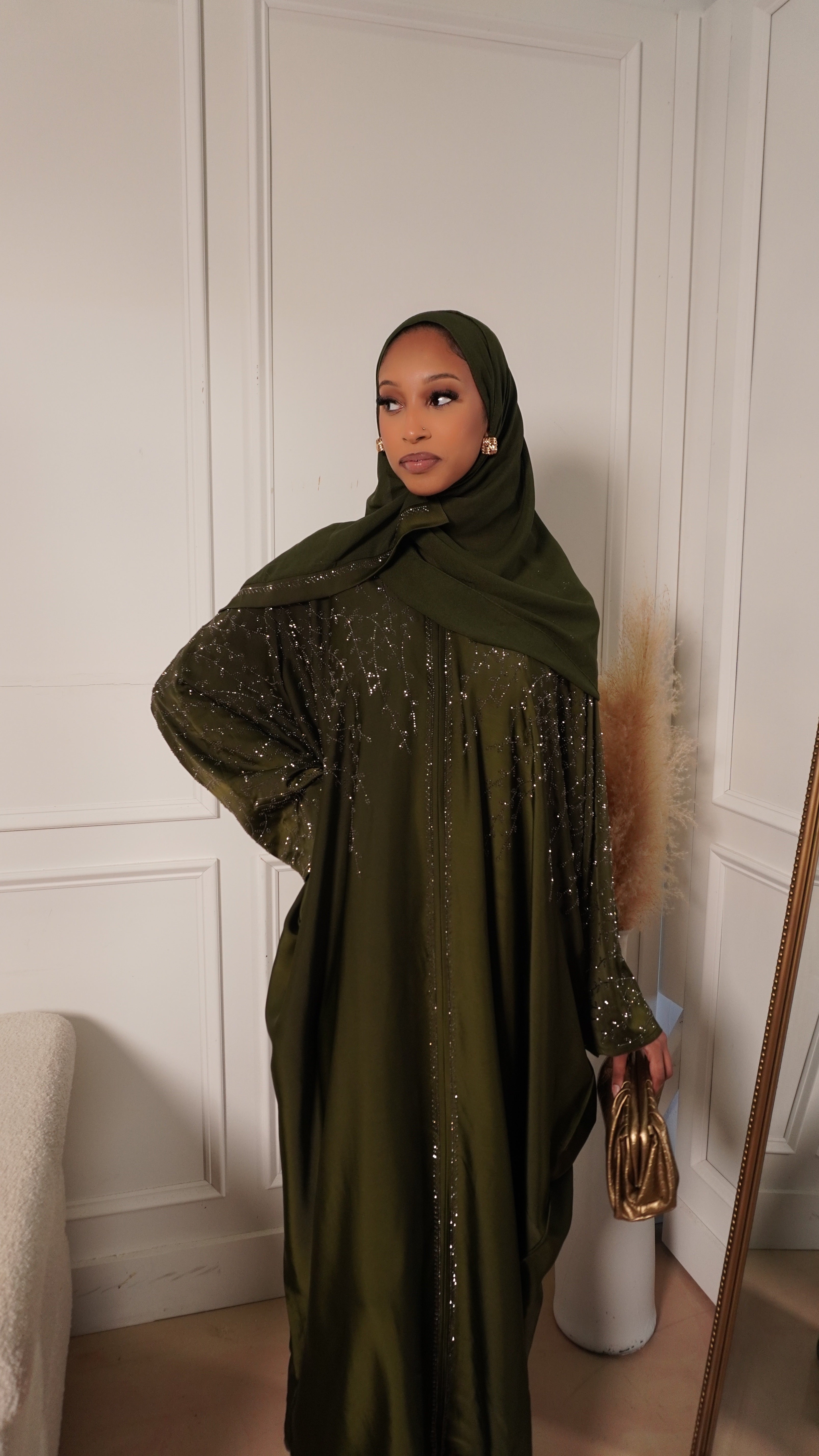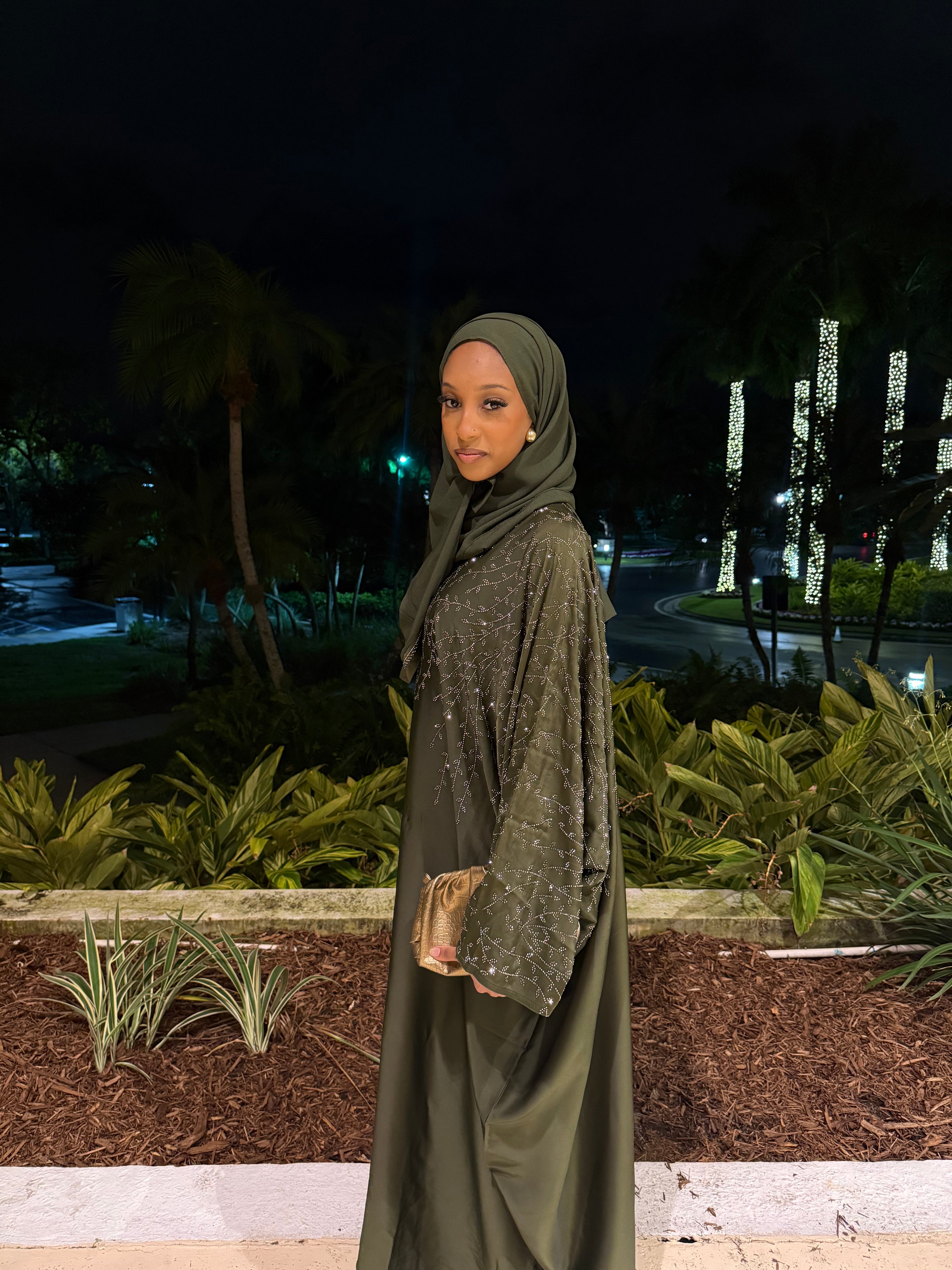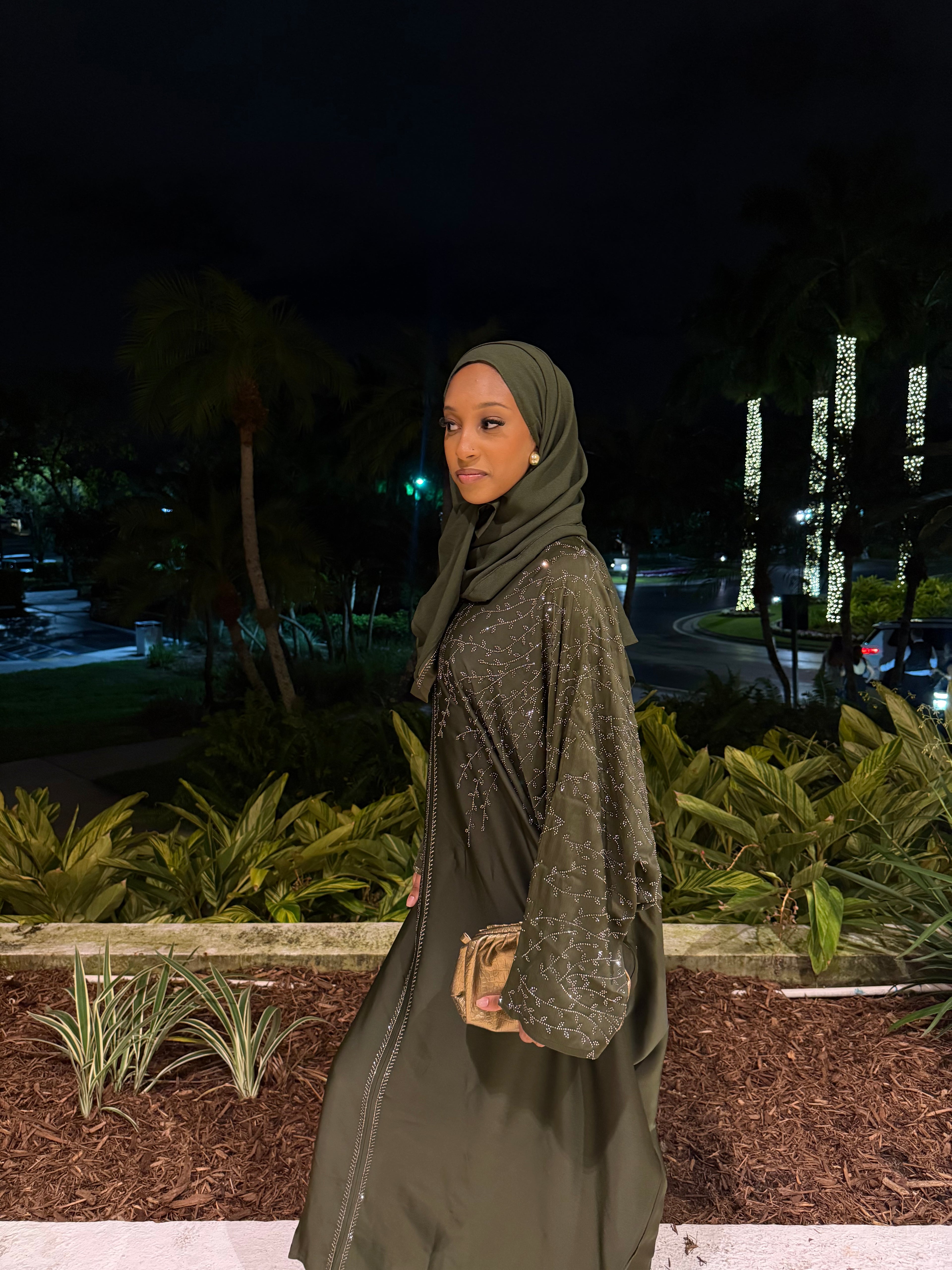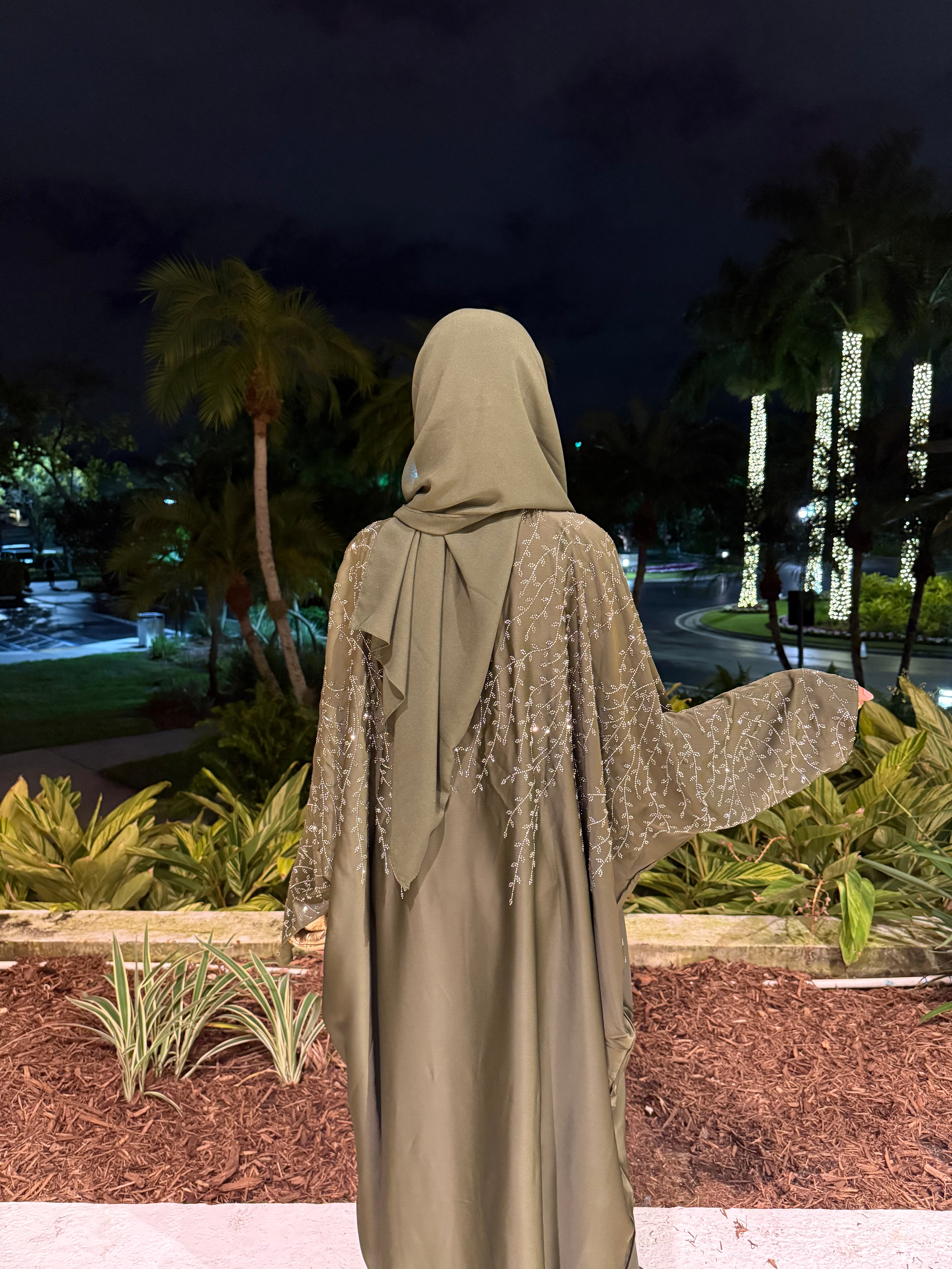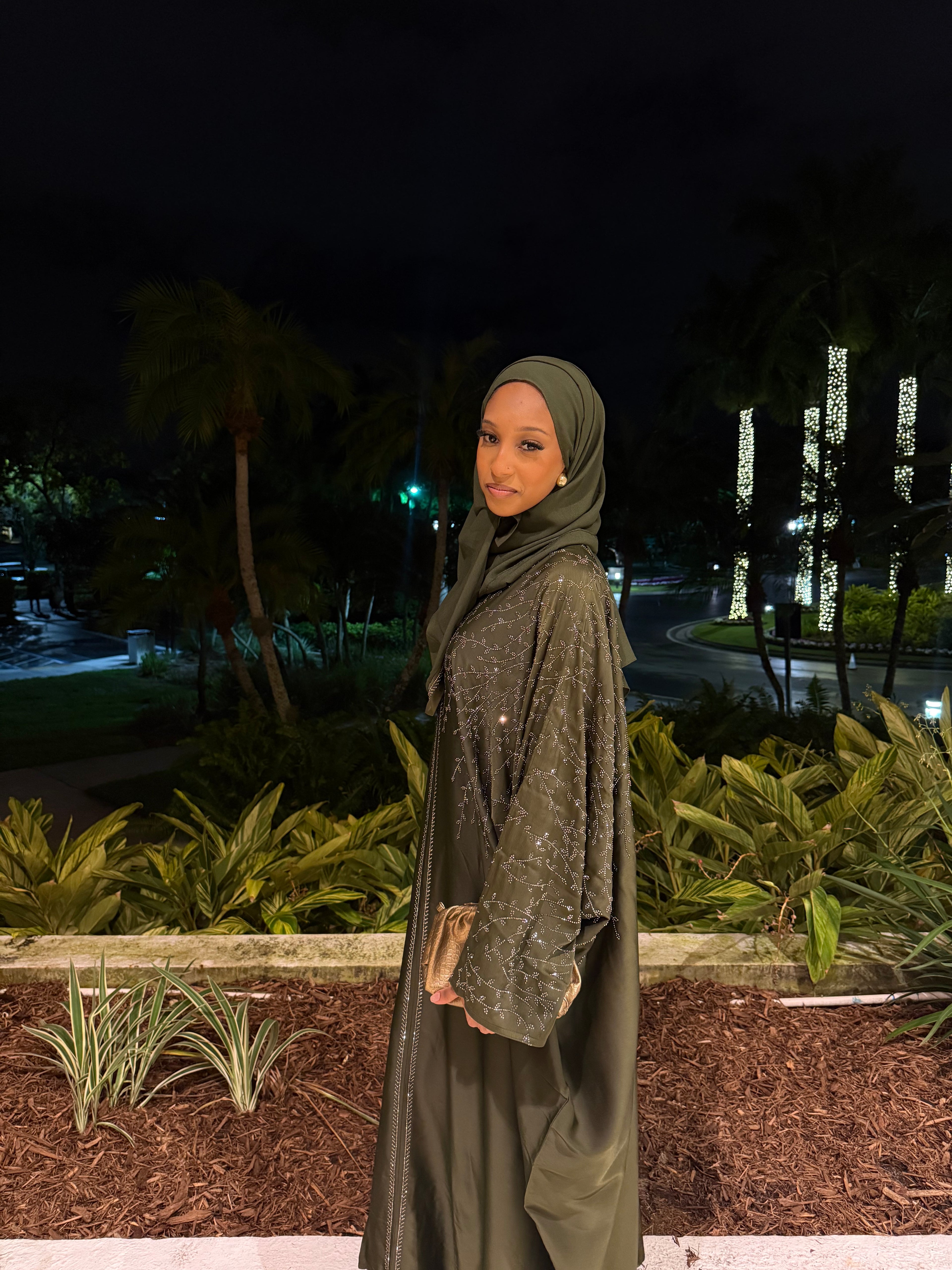 The Emerald Noor Abaya is one of those pieces that instantly makes you feel put together without trying too hard. The rich emerald-olive color is soft, elegant, and flattering, while the delicate gold embroidery adds just the right touch of luxury. It flows beautifully when you walk and feels comfortable all day or night.