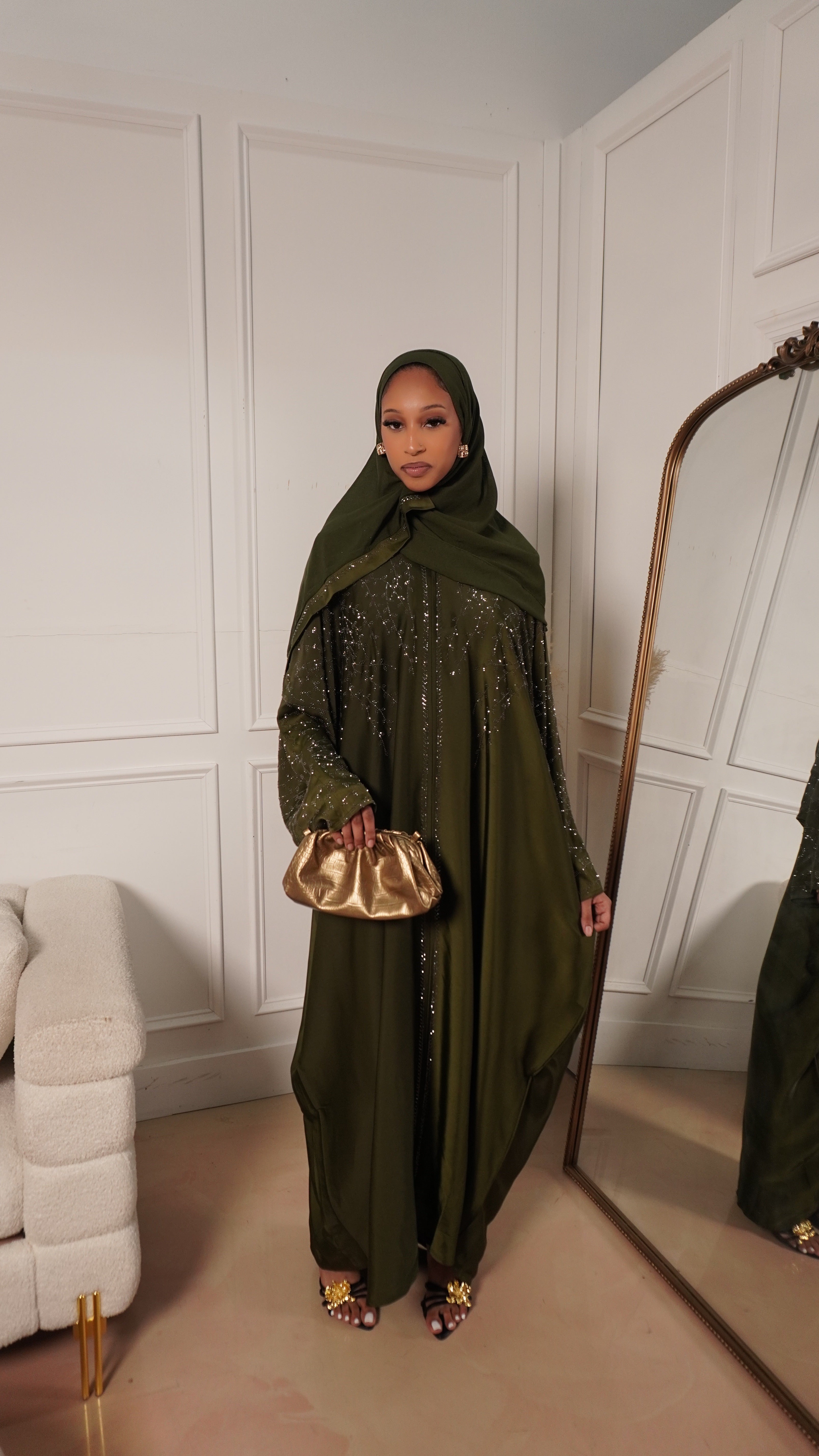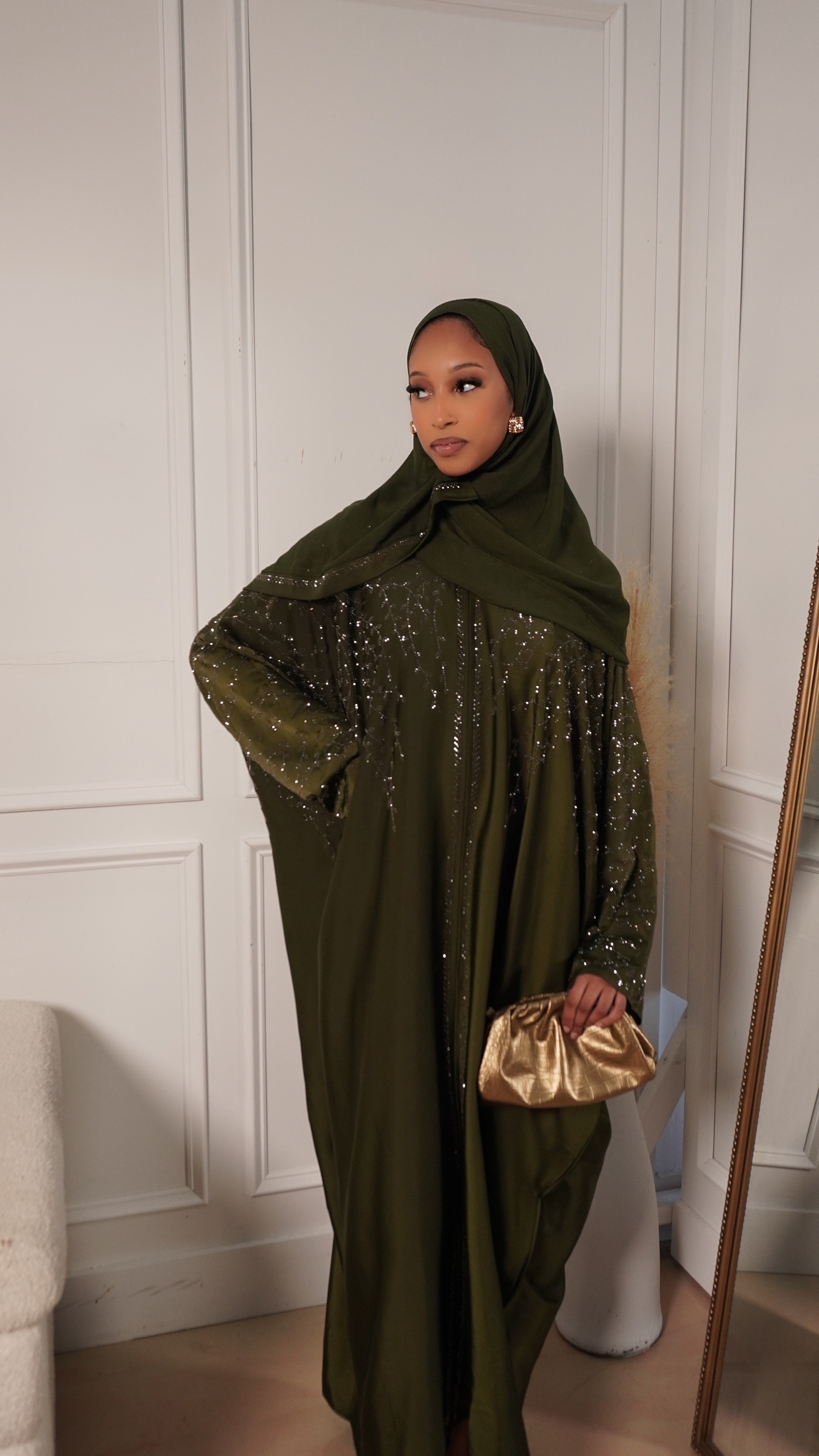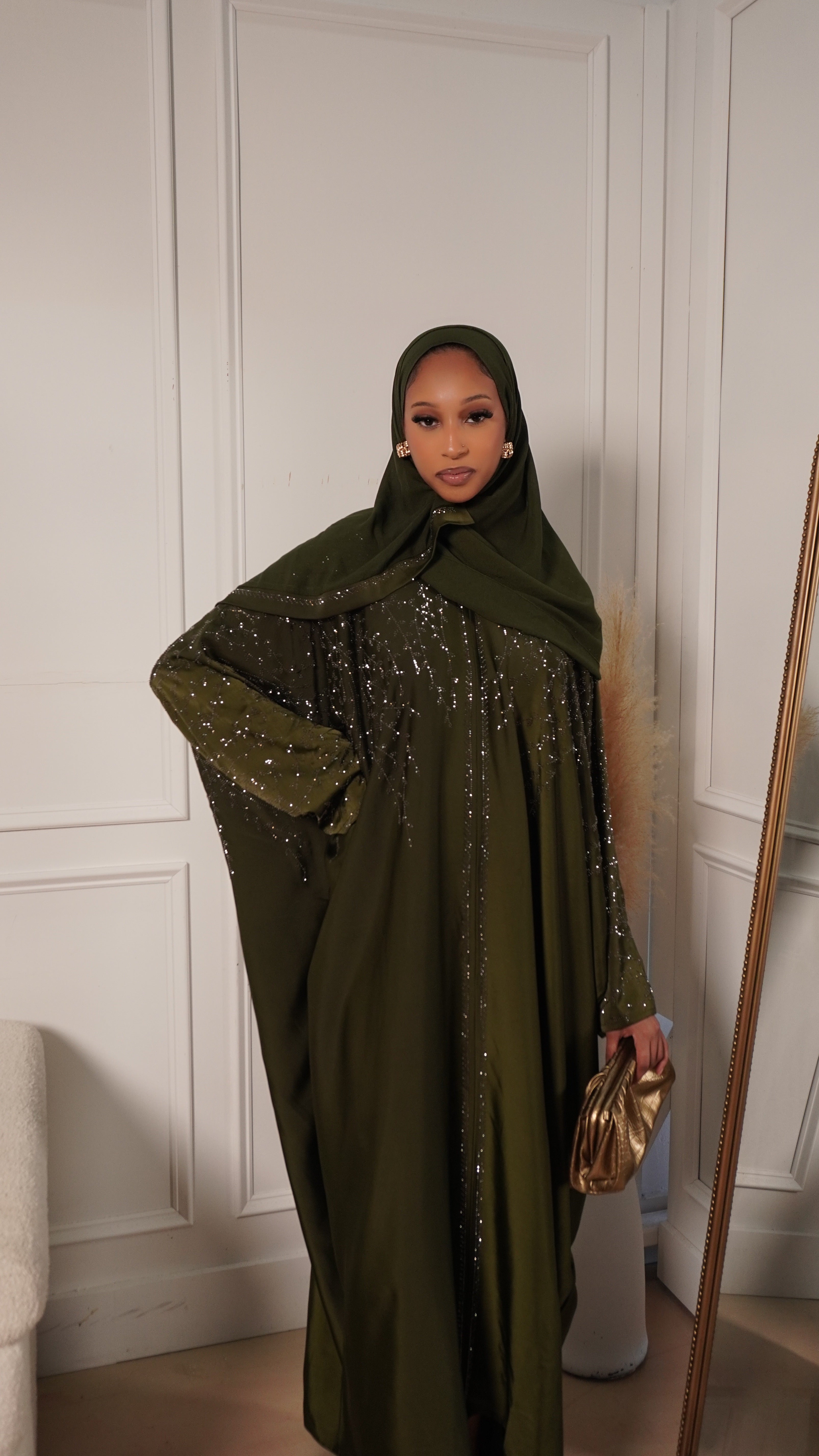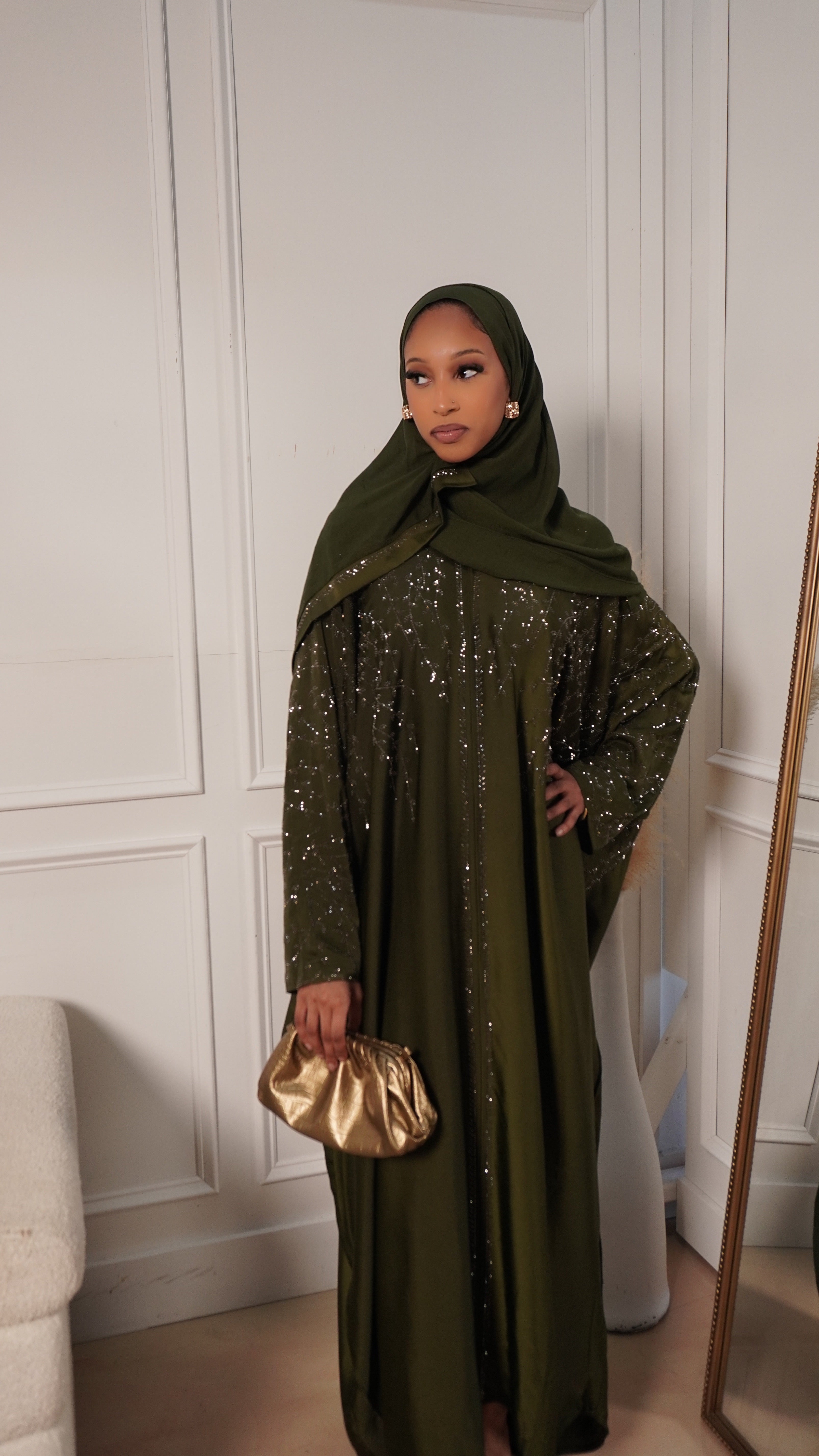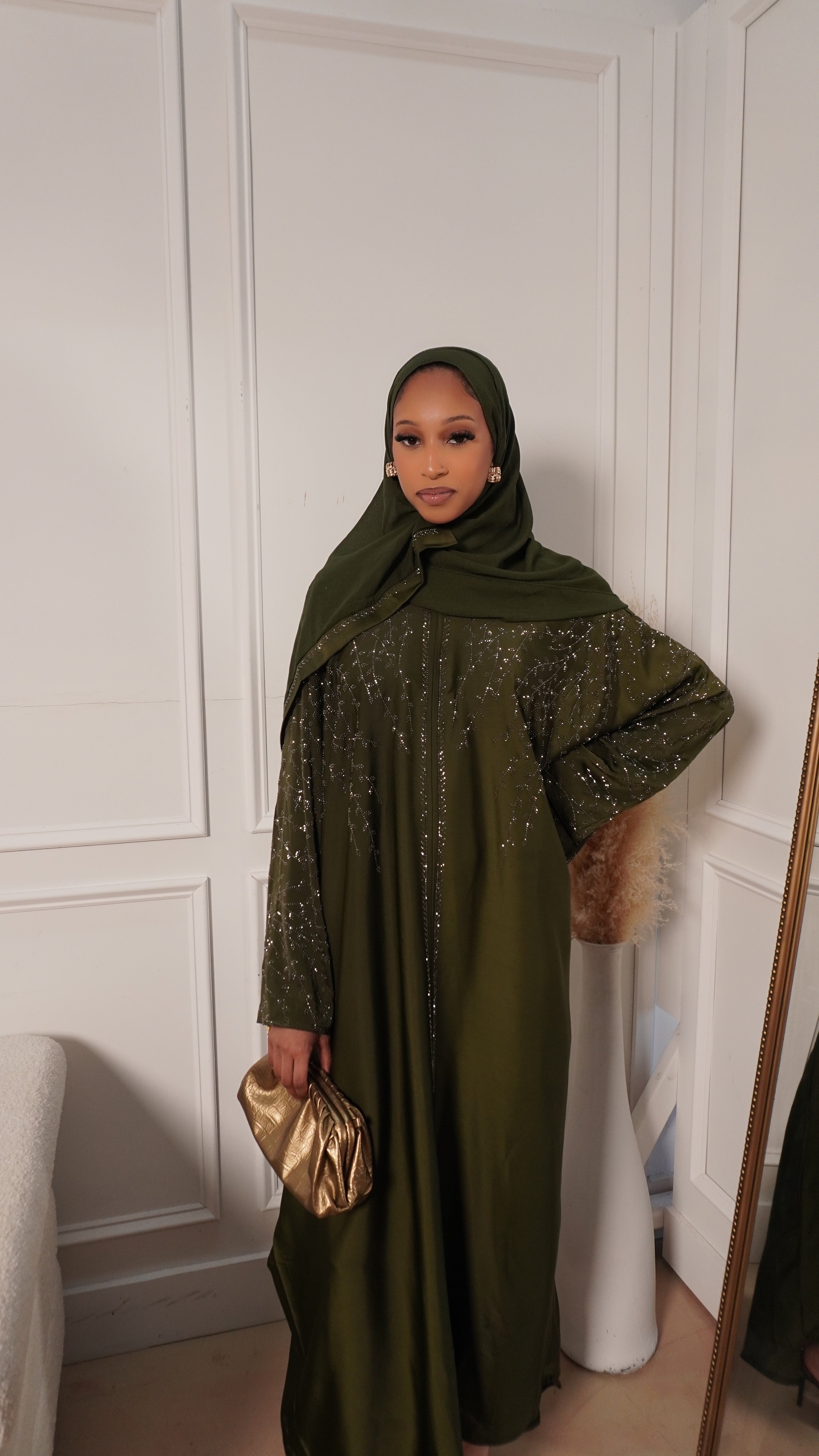 The Emerald Noor Abaya is one of those pieces that instantly makes you feel put together without trying too hard. The rich emerald-olive color is soft, elegant, and flattering, while the delicate gold embroidery adds just the right touch of luxury. It flows beautifully when you walk and feels comfortable all day or night.