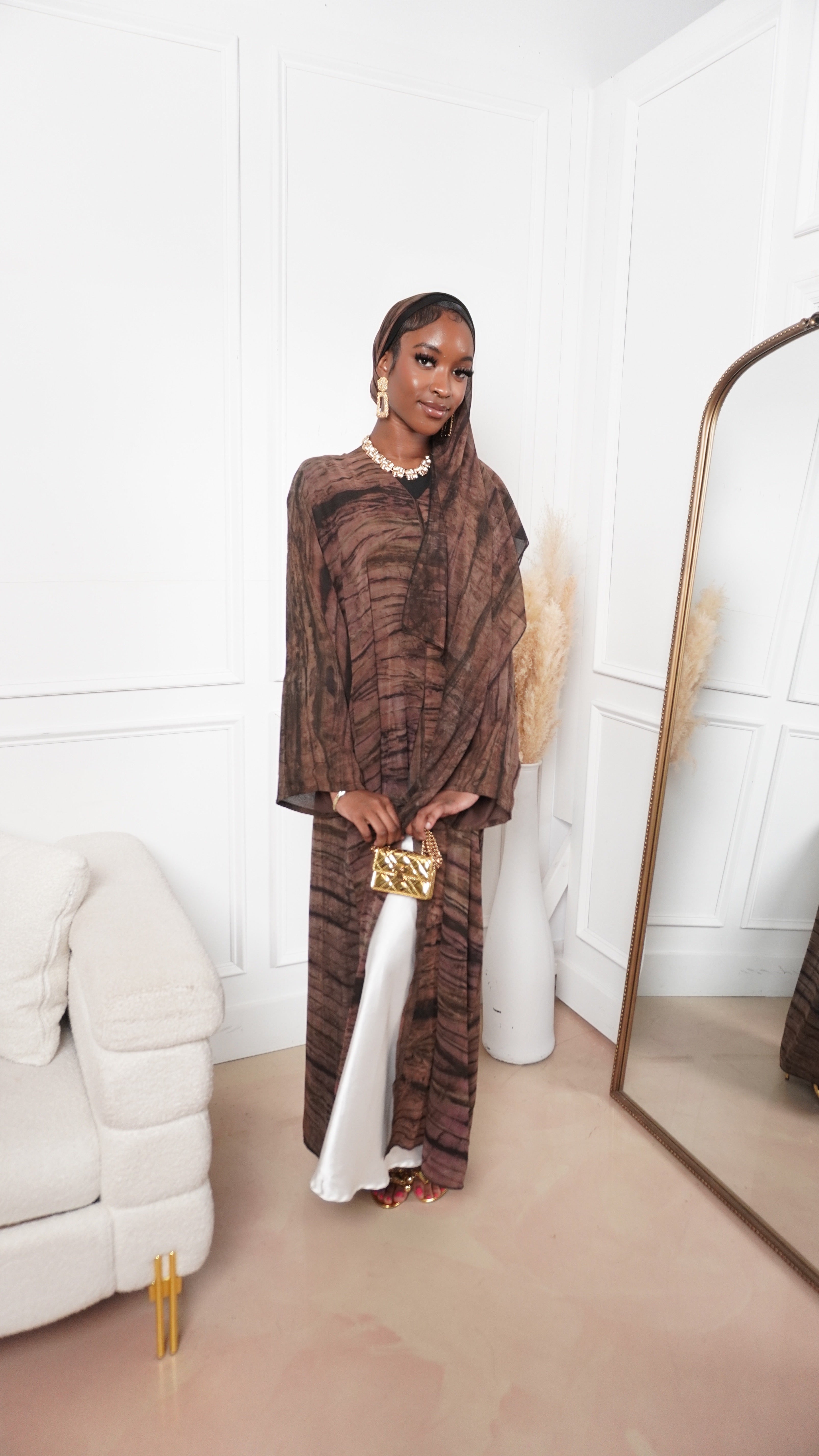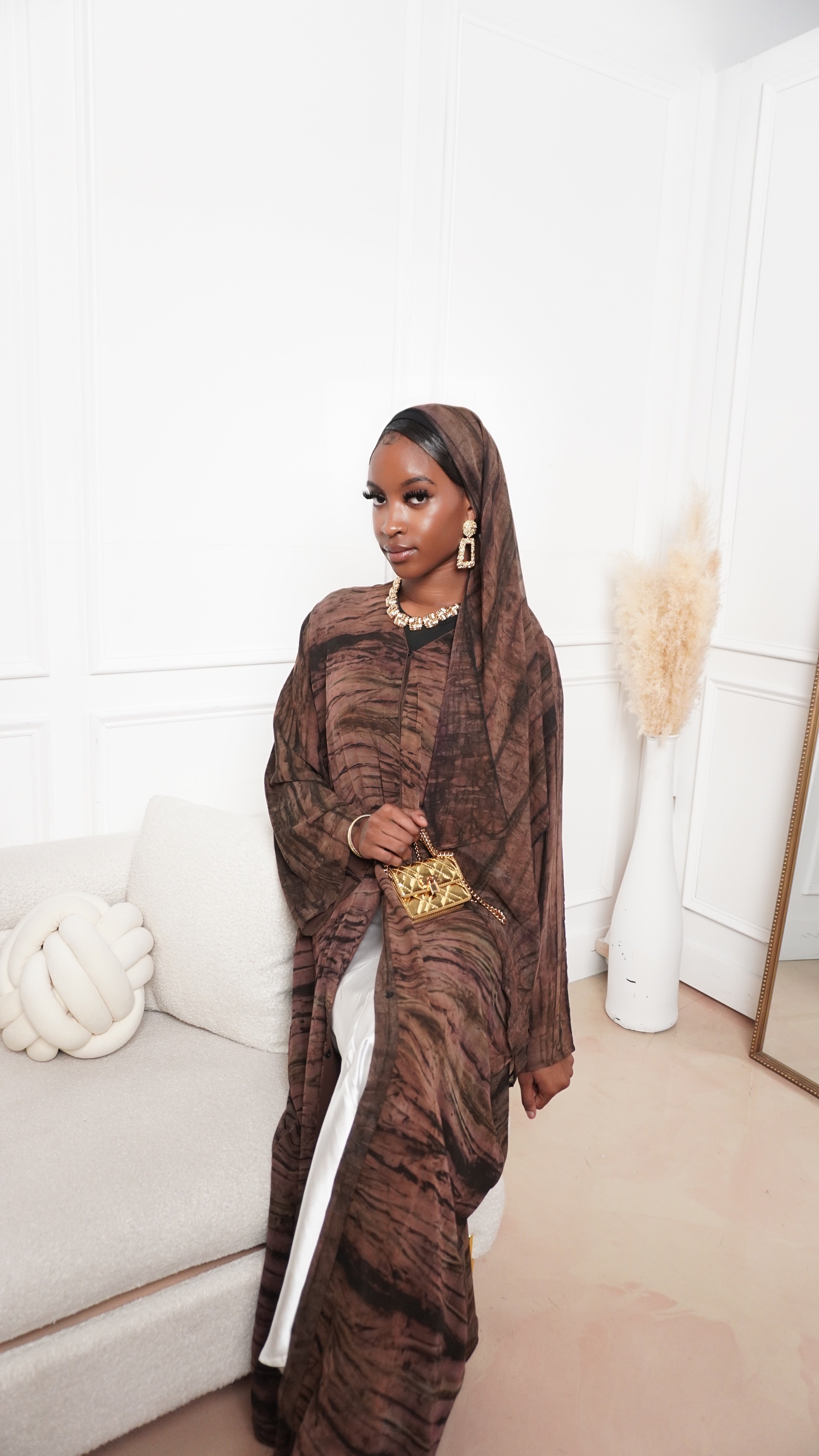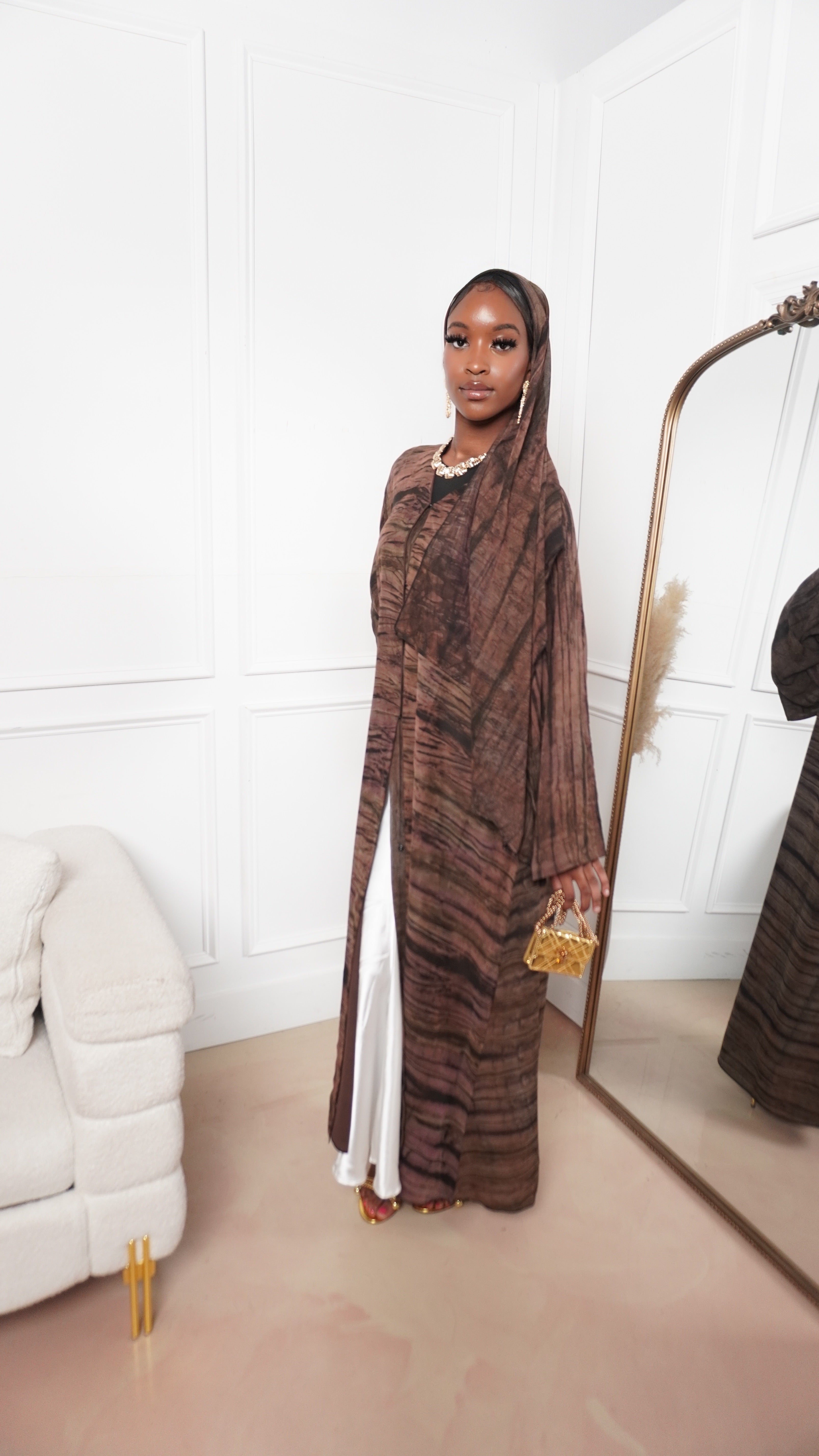 The Ihsan Abaya blends earthy tones with refined modesty. This closed abaya features a flowing silhouette and subtle texture that brings depth and elegance to any look. Perfect for both casual and formal settings, it comes with a matching hijab for a complete, polished finish.
