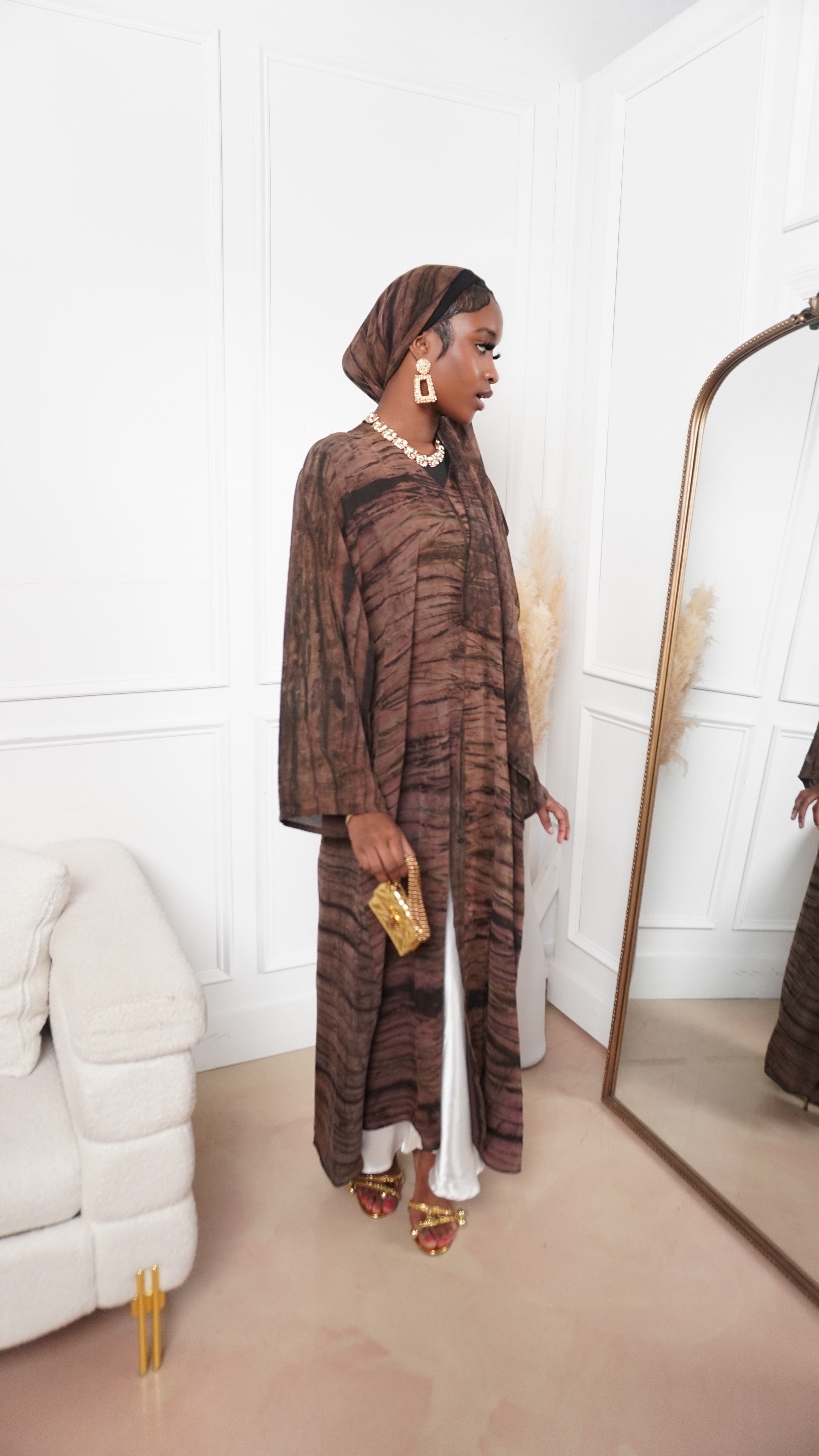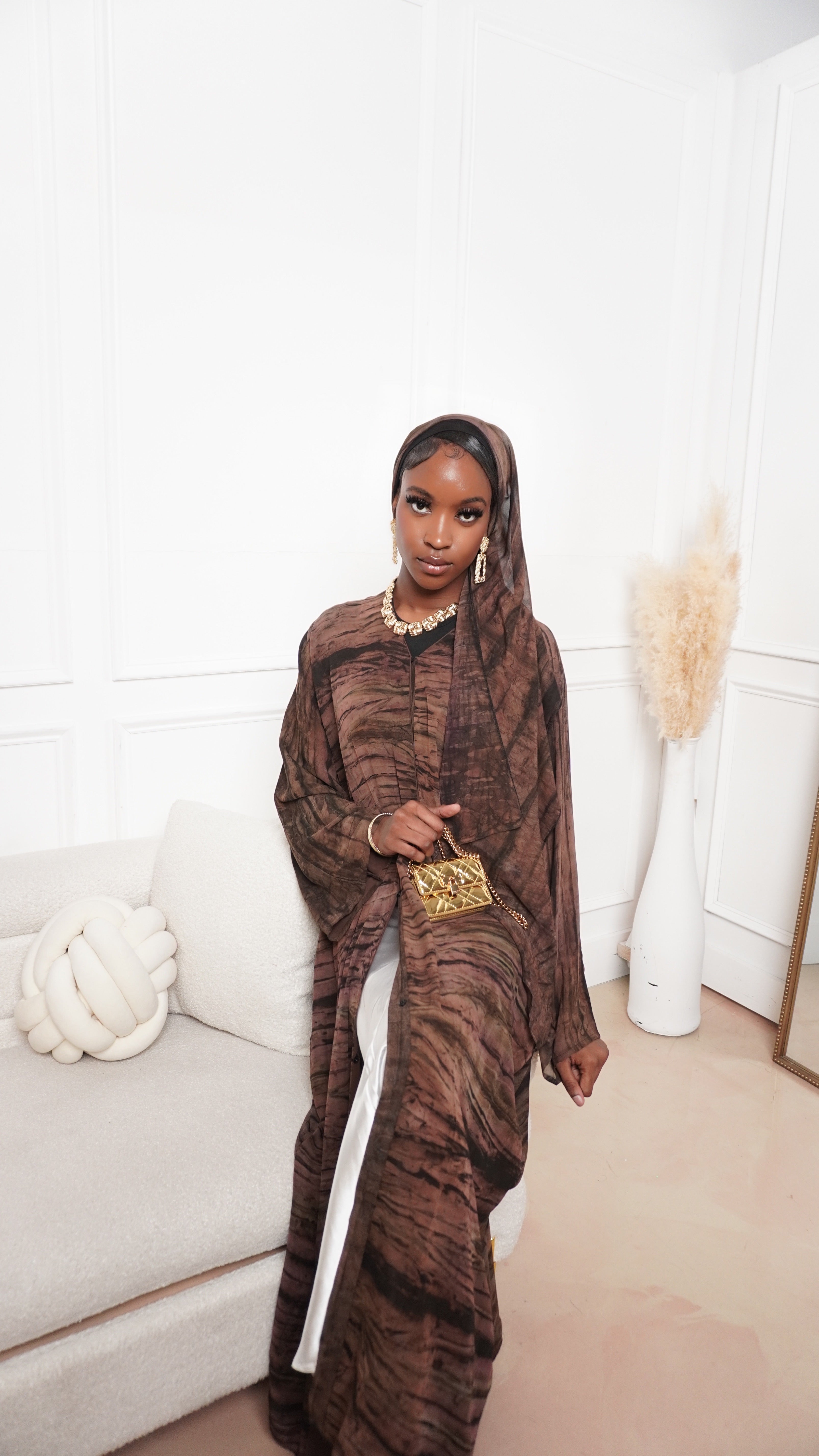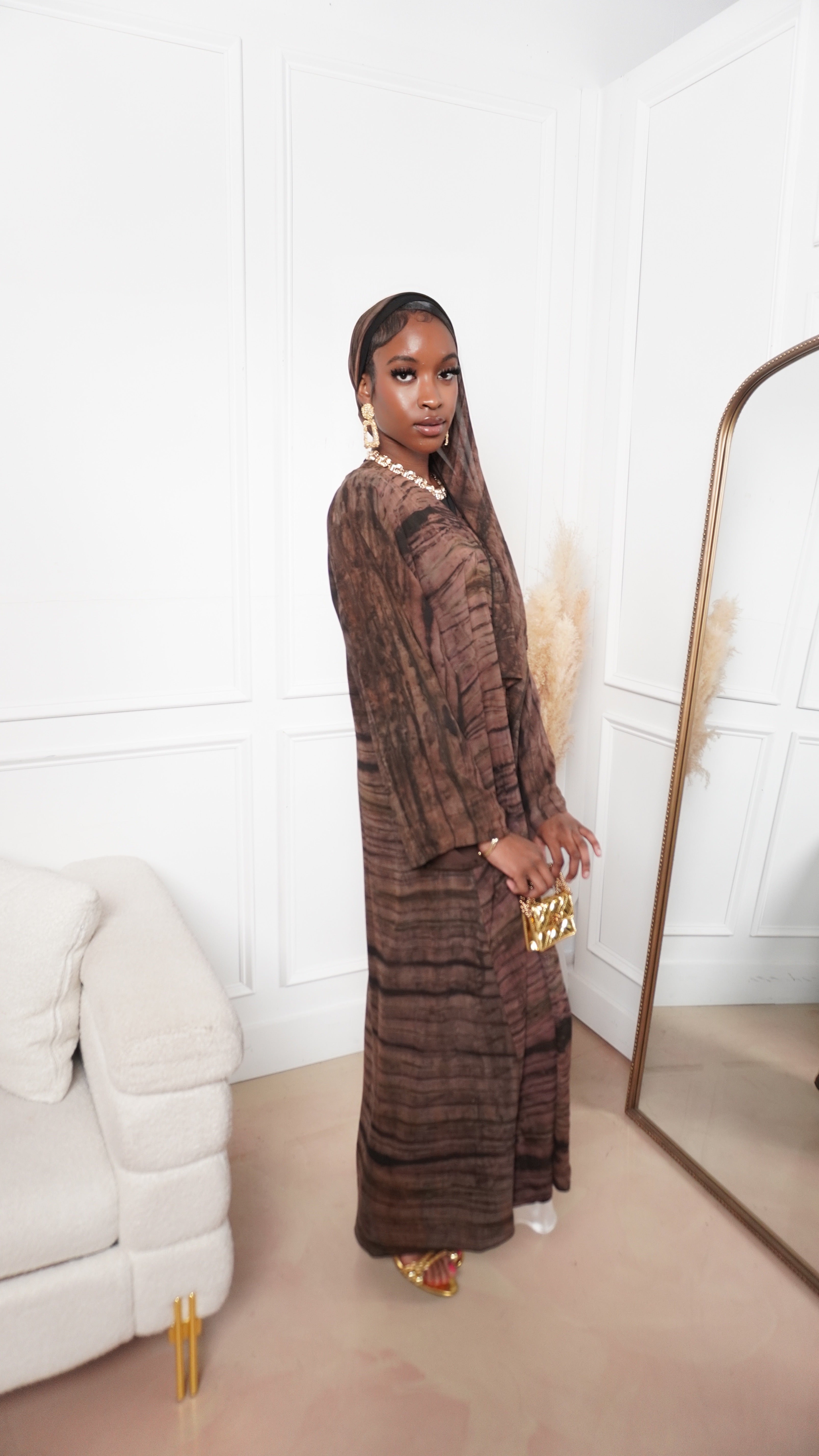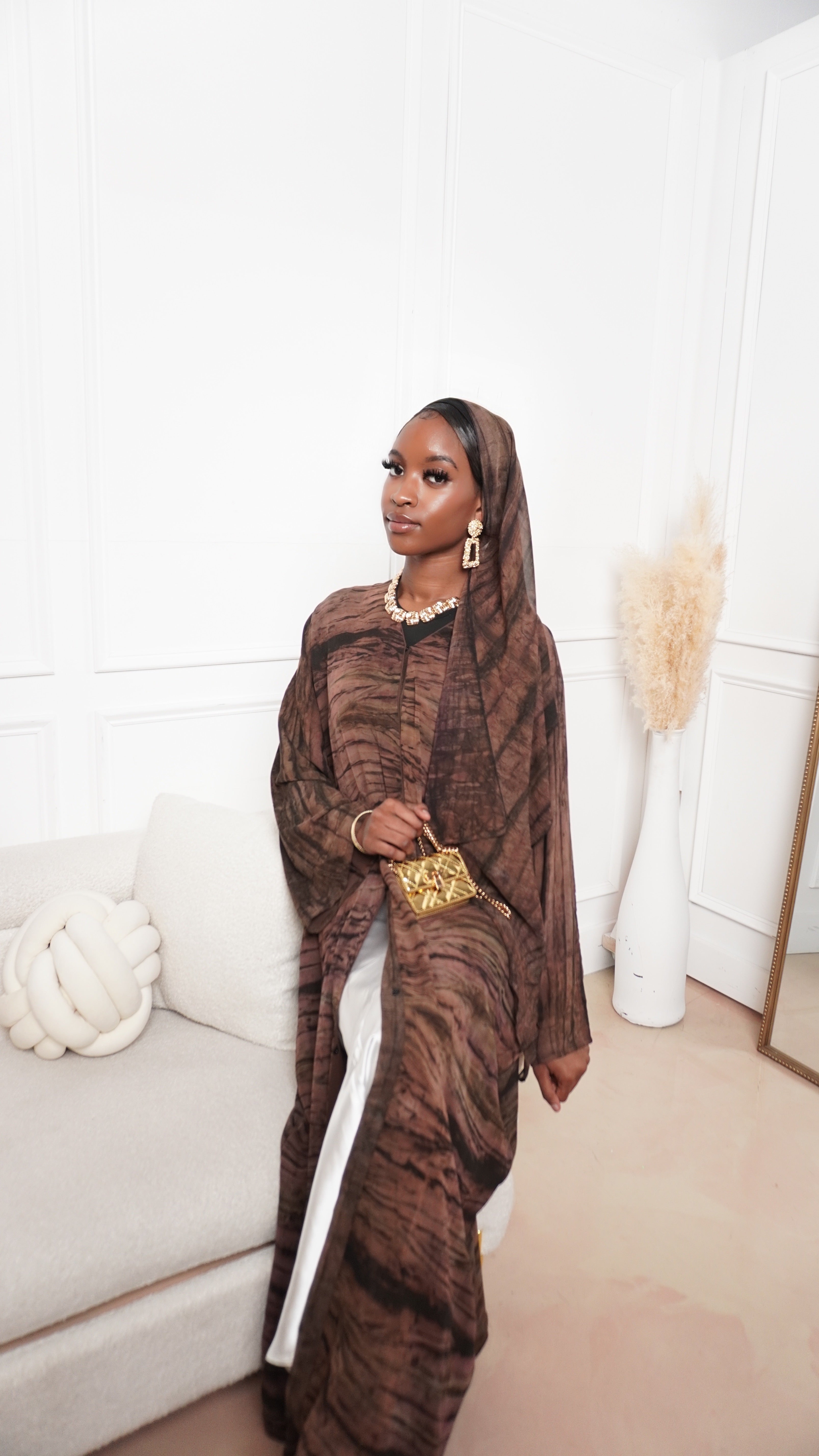 The Ihsan Abaya blends earthy tones with refined modesty. This closed abaya features a flowing silhouette and subtle texture that brings depth and elegance to any look. Perfect for both casual and formal settings, it comes with a matching hijab for a complete, polished finish.