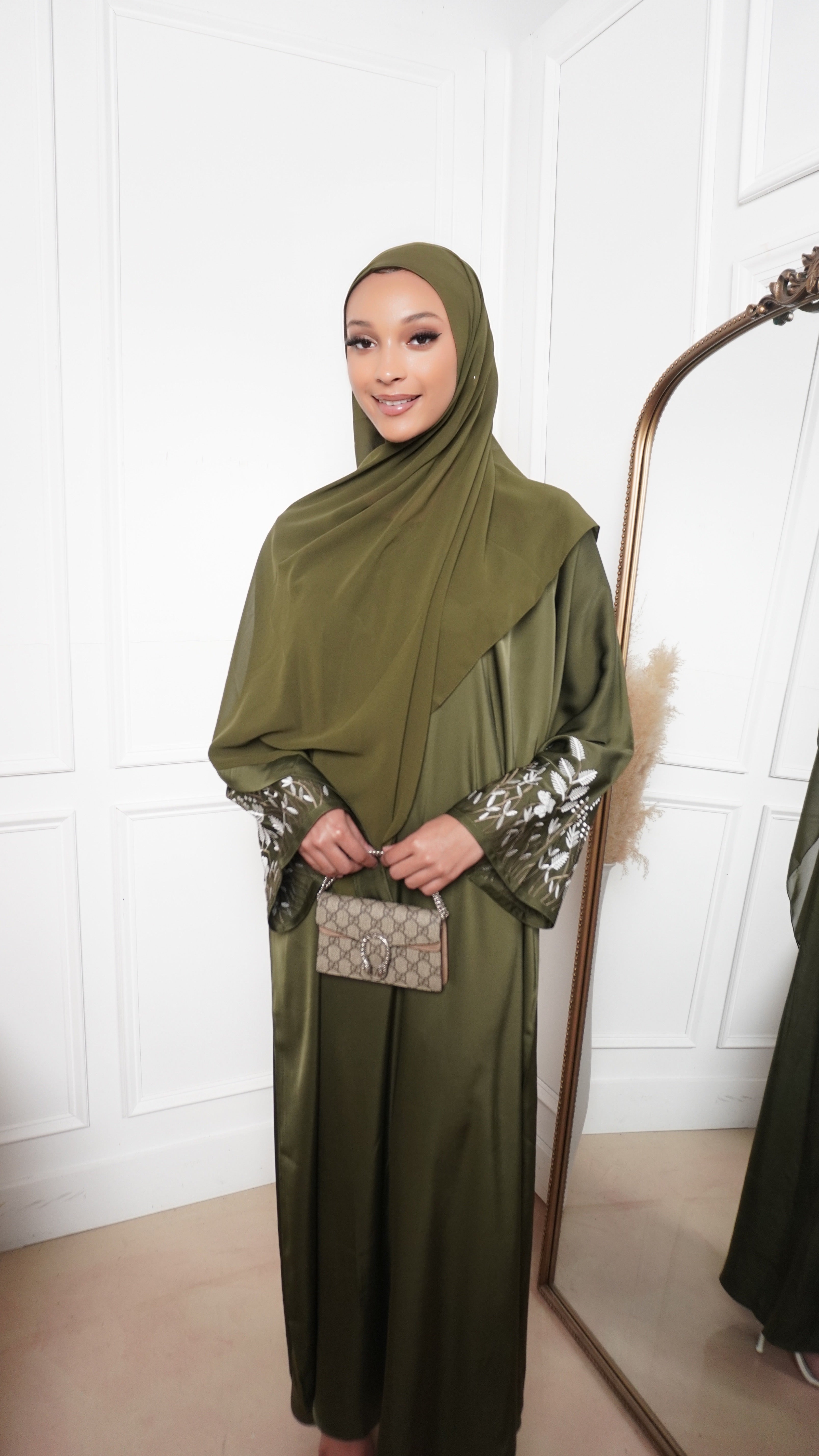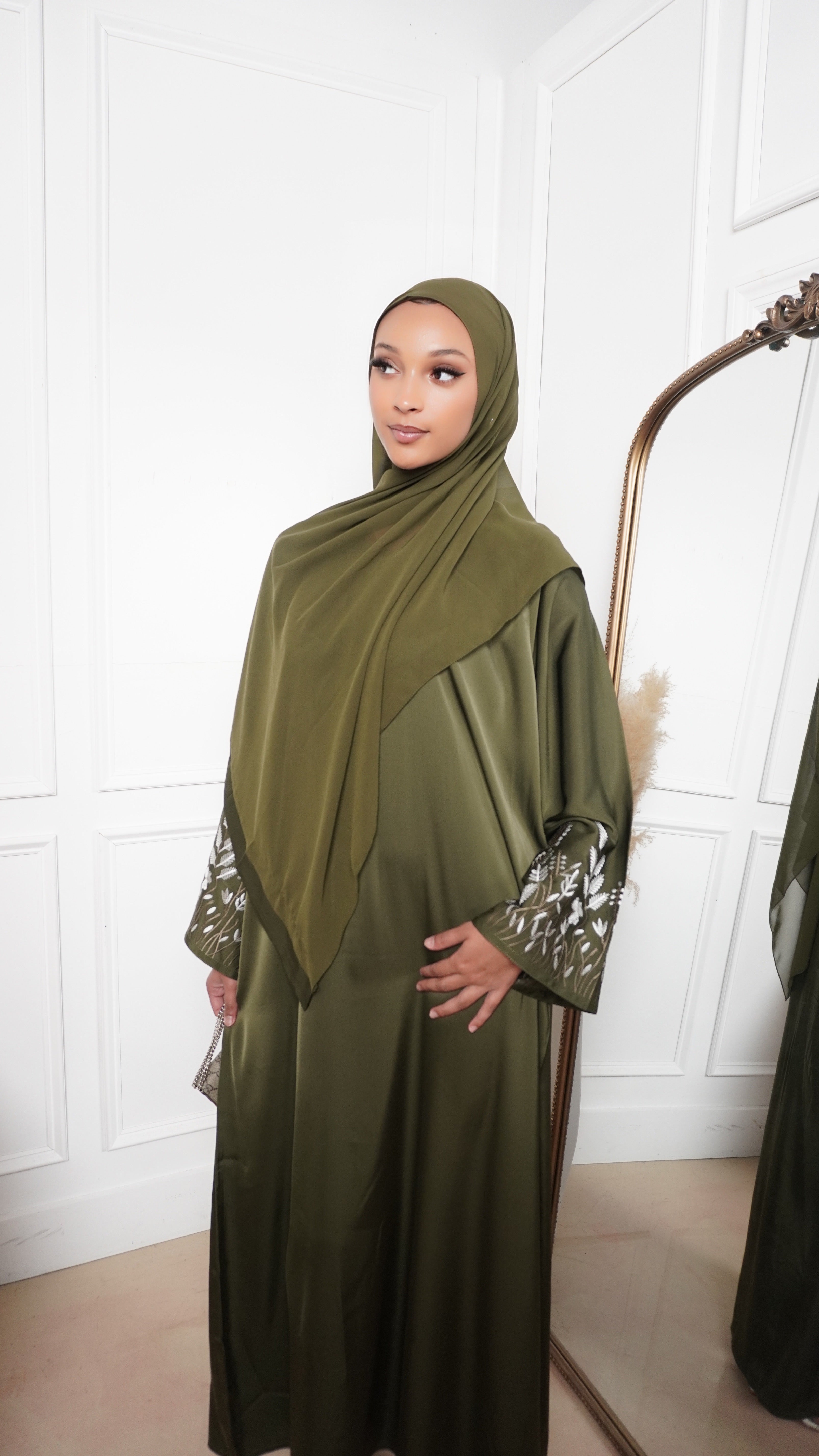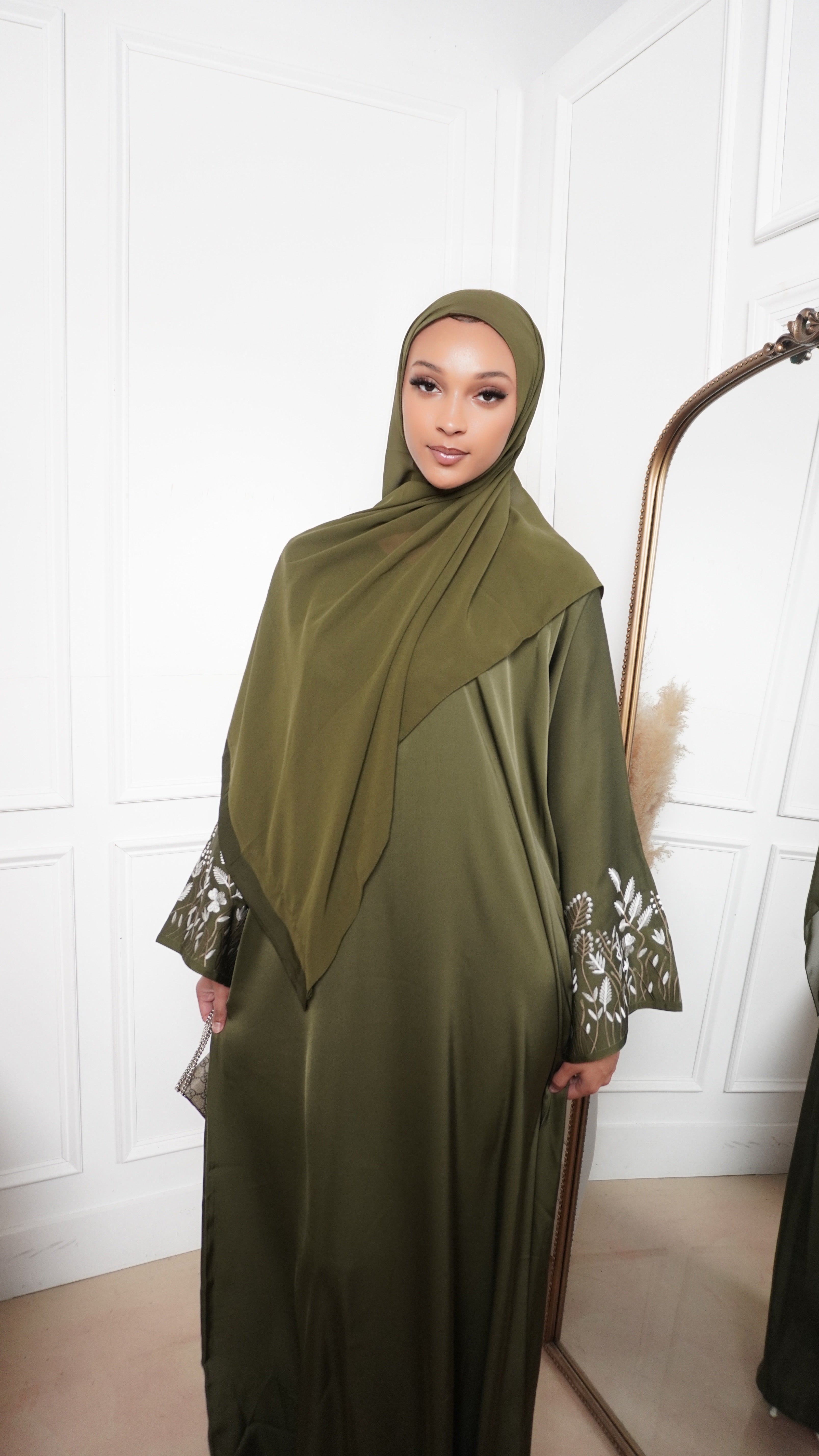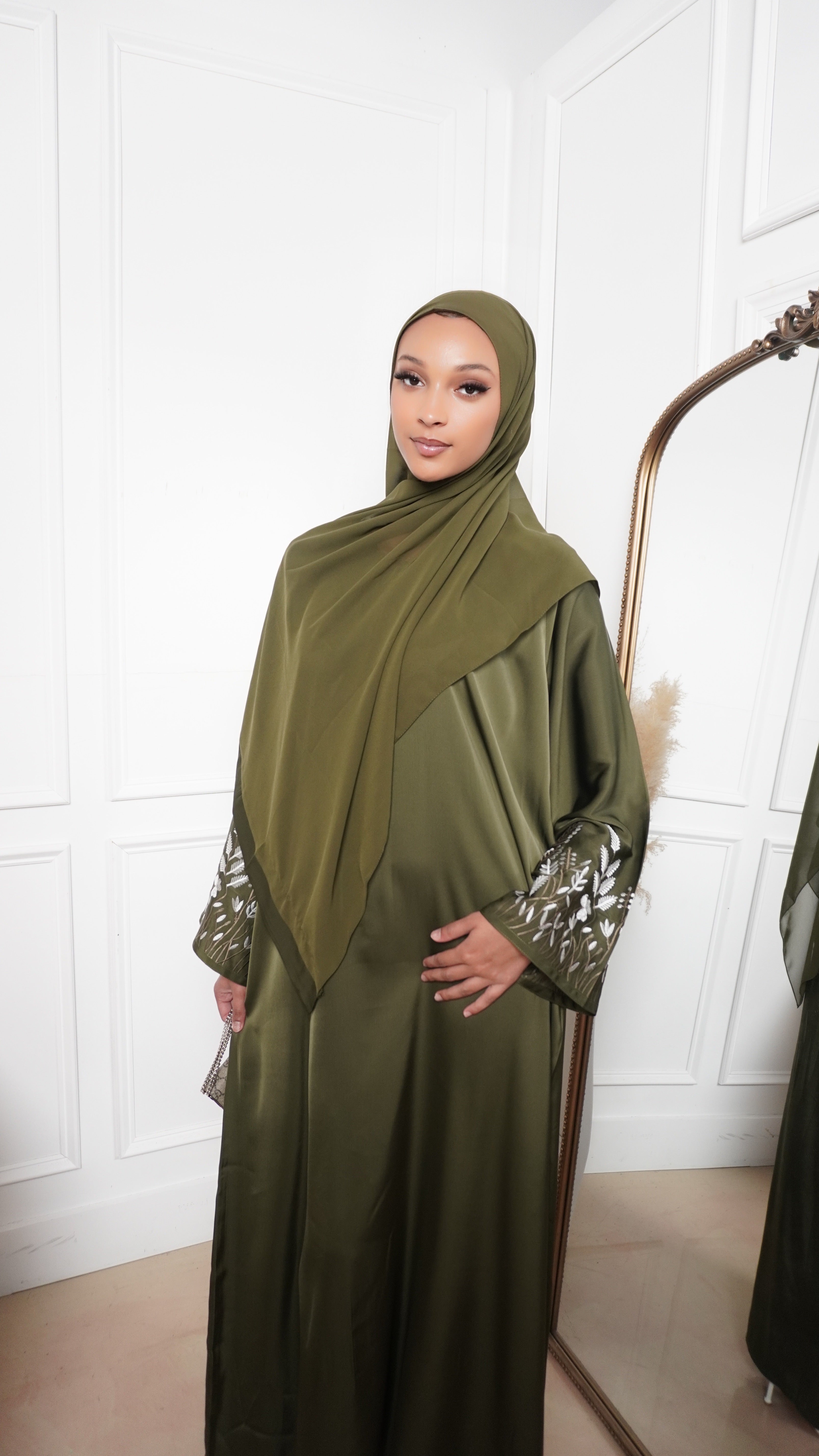 Elevate your fall wardrobe with this elegant green closed abaya, featuring delicate white embroidery on the sleeves for a touch of sophistication. Designed for a seamless look, it comes with a matching hijab and belt, making it perfect for effortless styling this season.