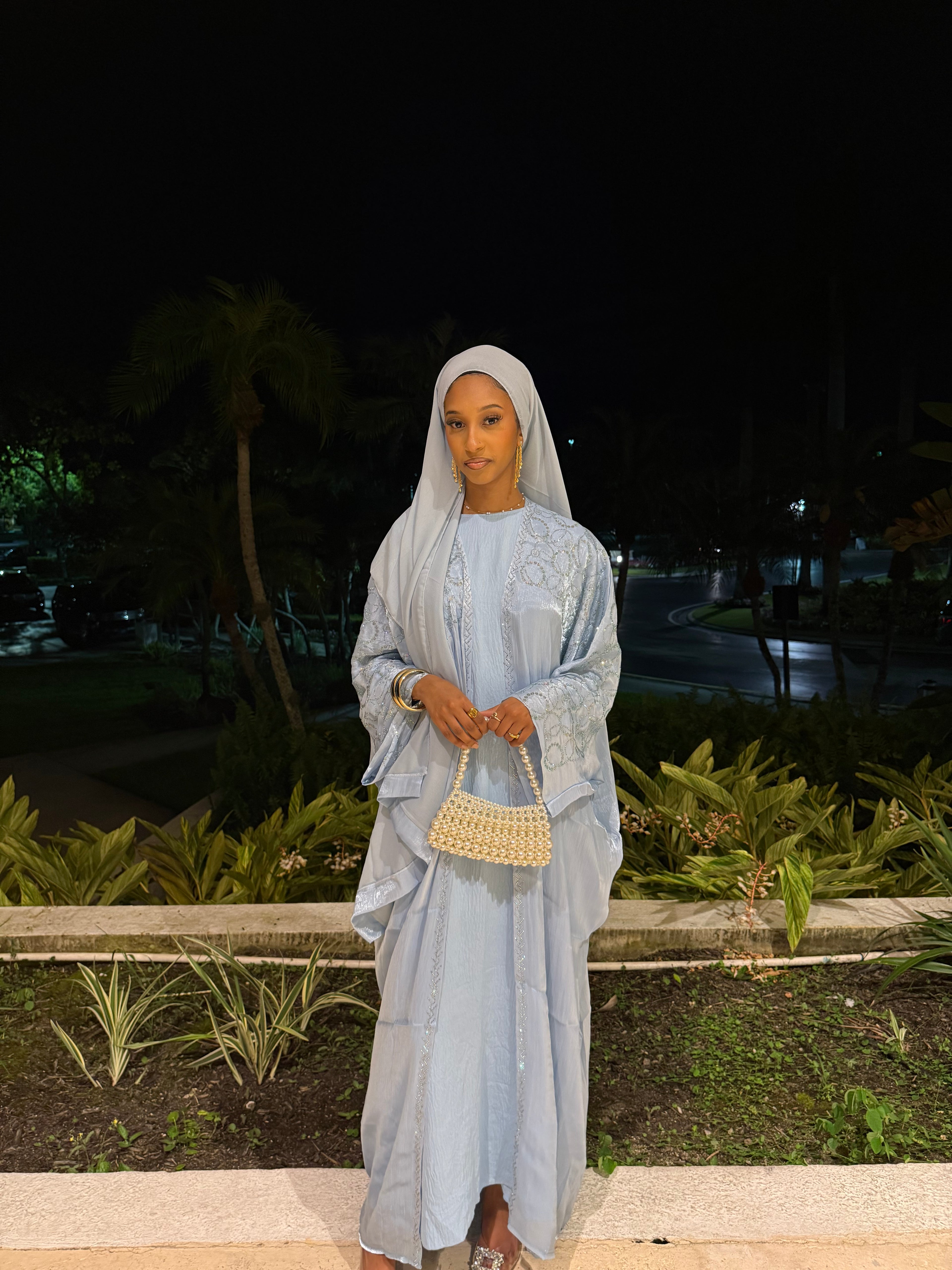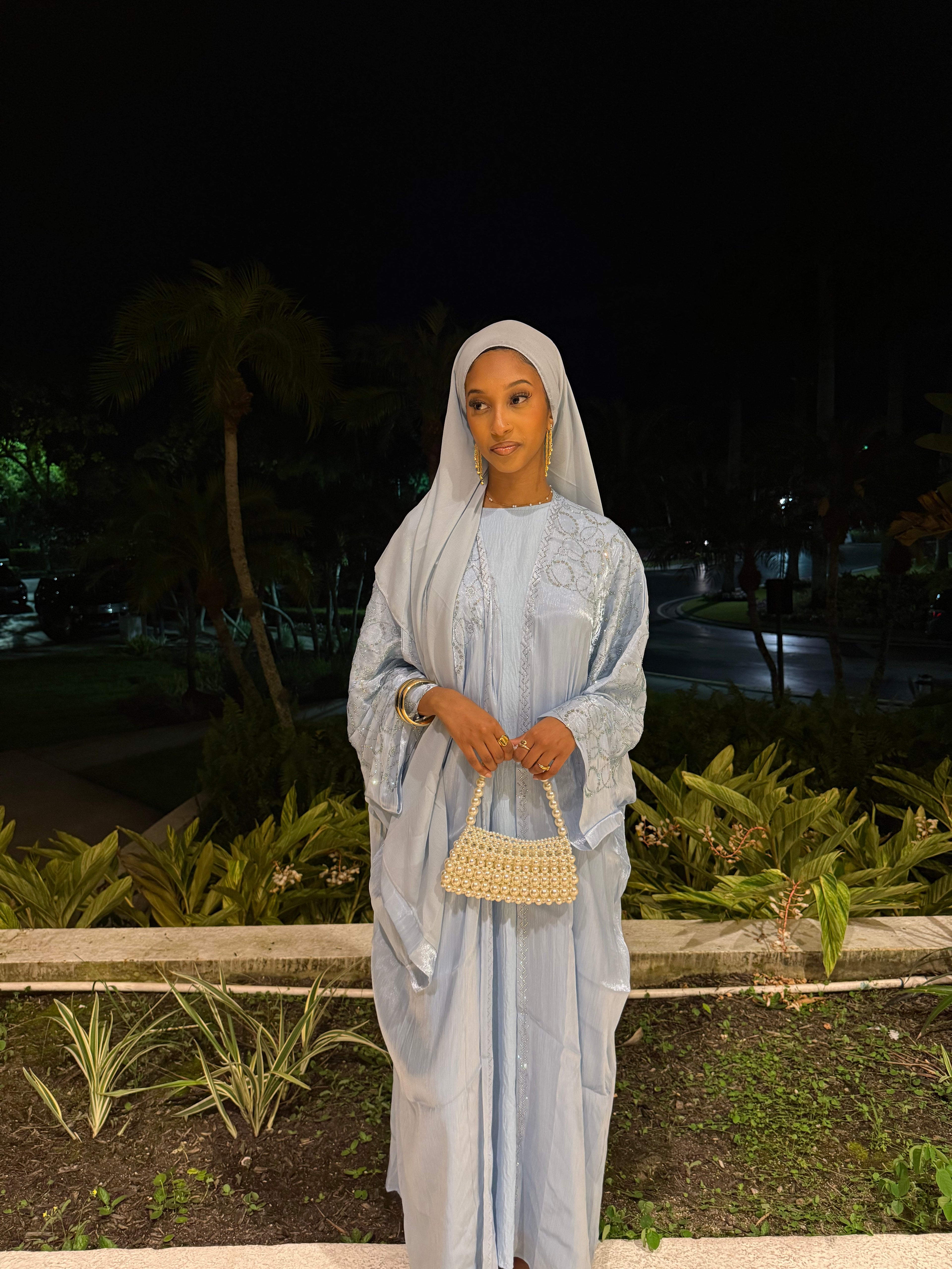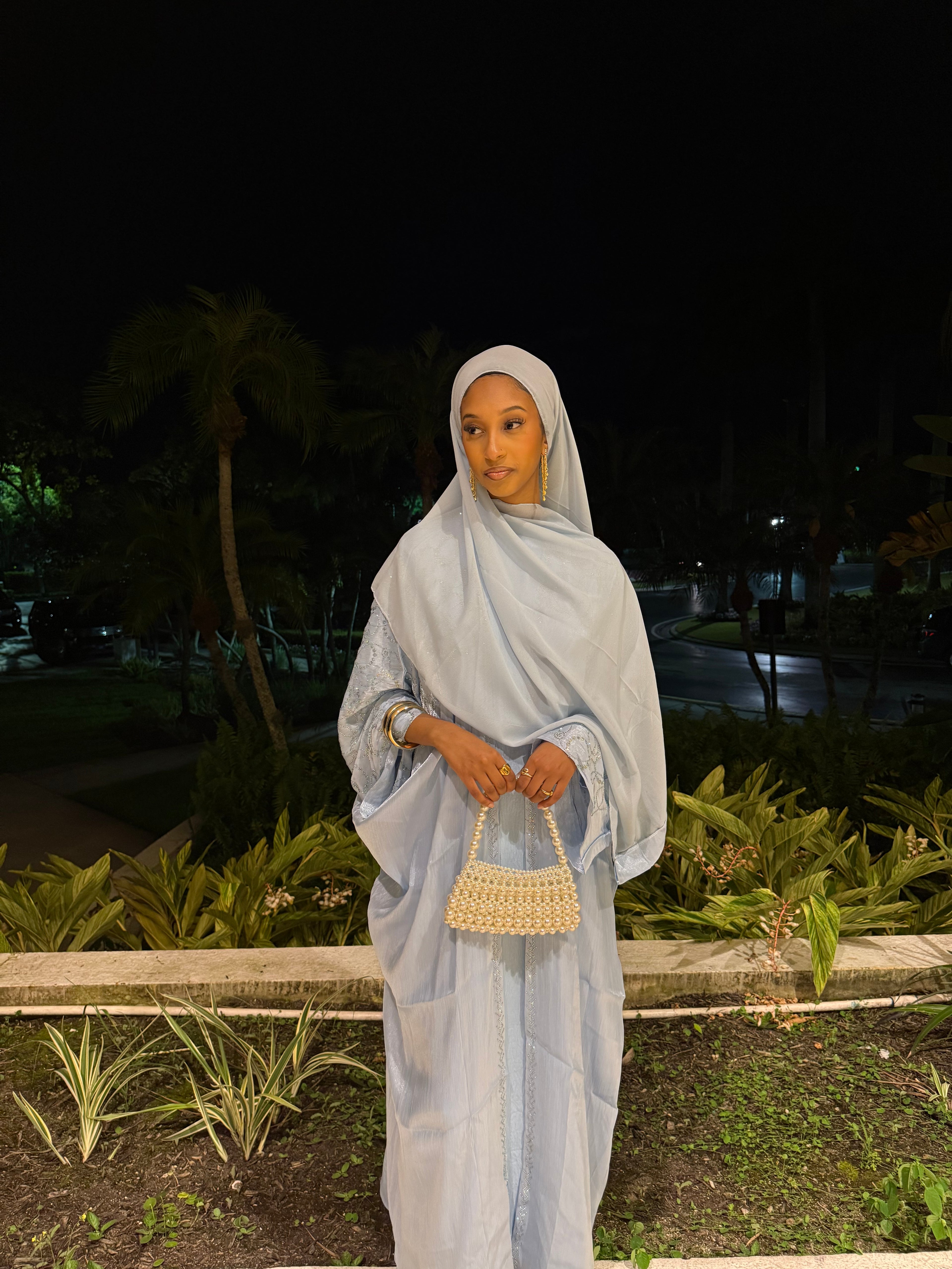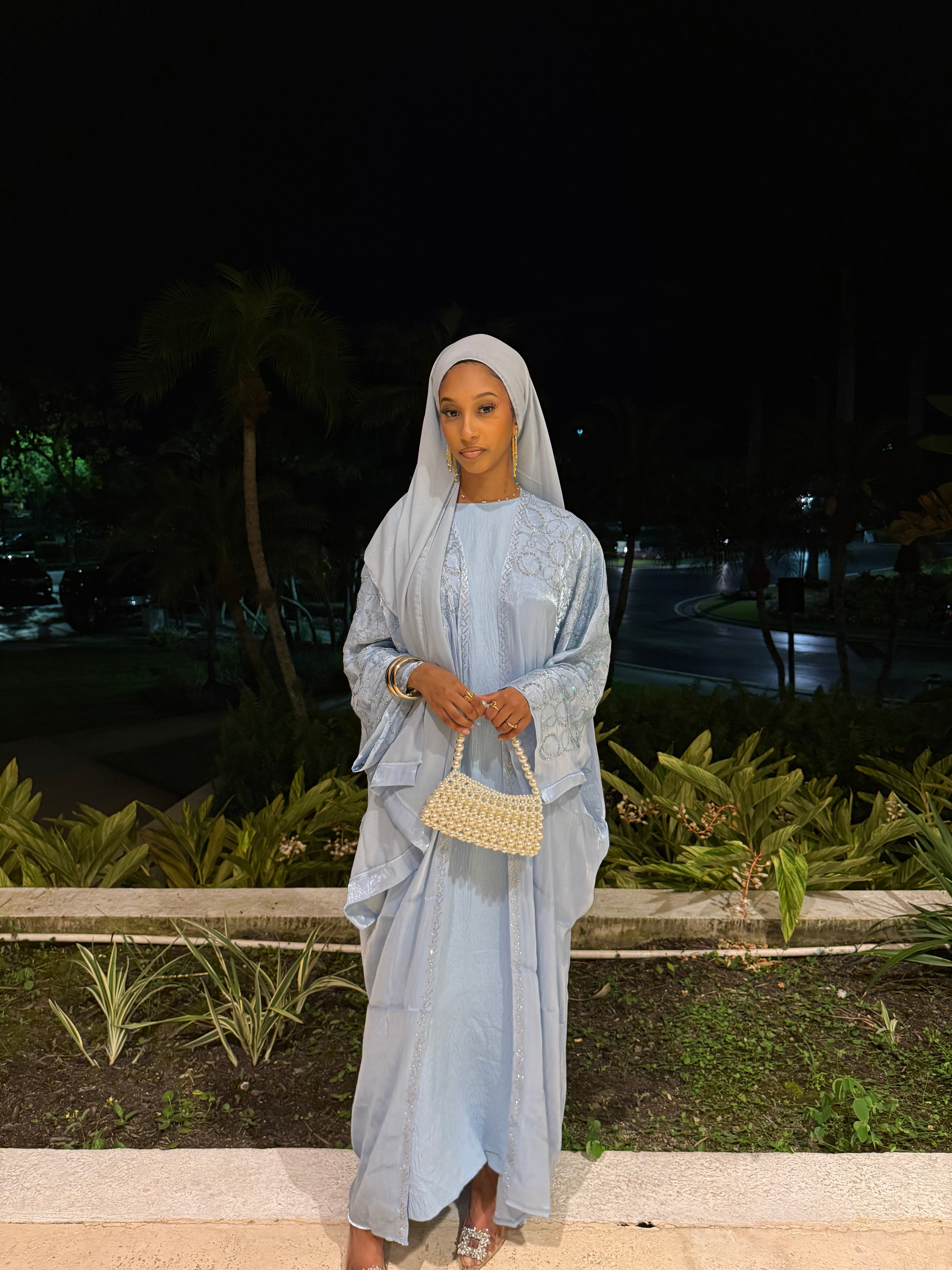 This elegant abaya set is available in two refined color options: classic white and soft baby blue. Designed with intricate embellishments, it includes a matching hijab, belt, and long-sleeve underdress for a complete, modest look. Perfect for formal occasions, this set blends timeless elegance with modern style.