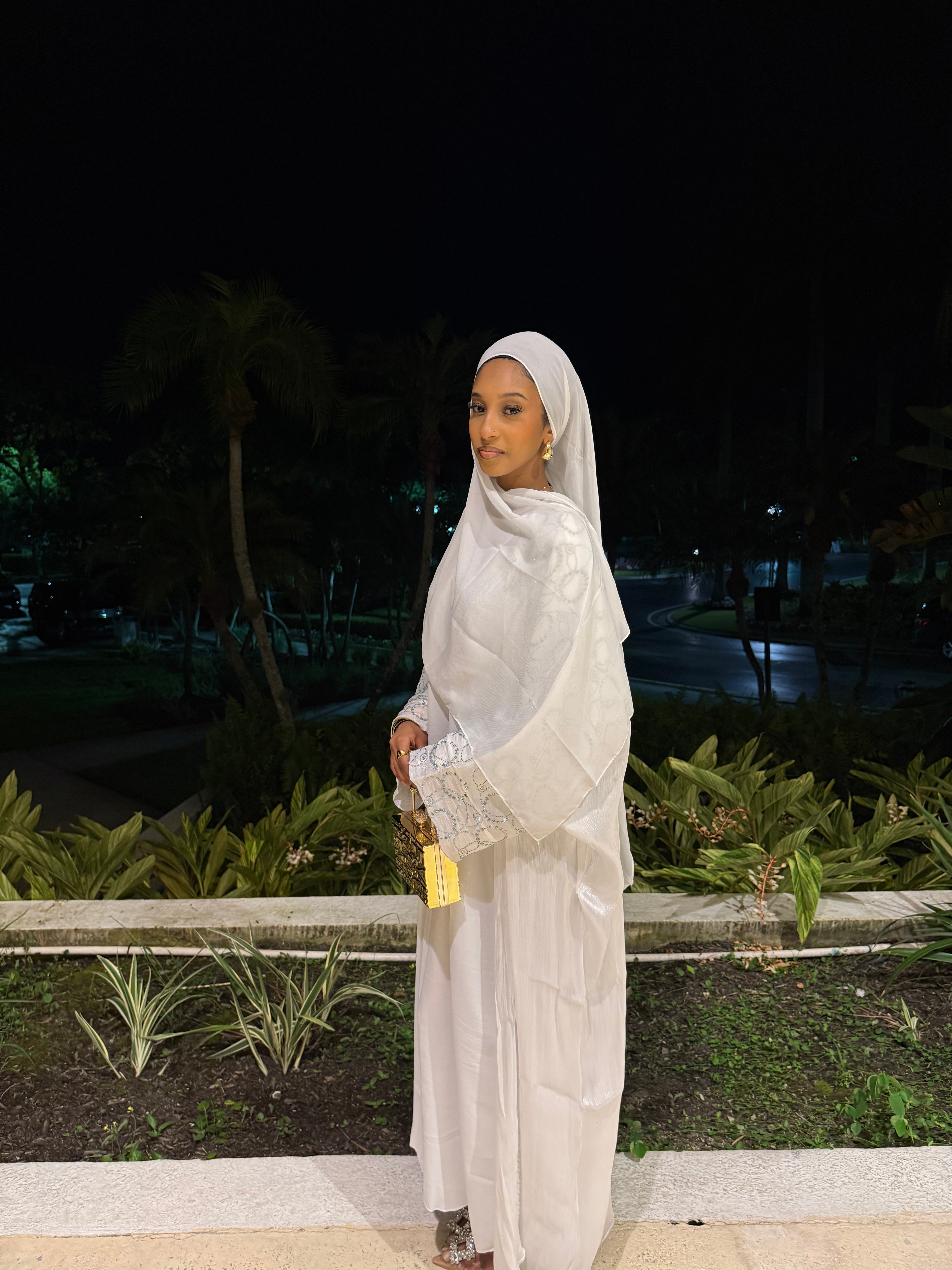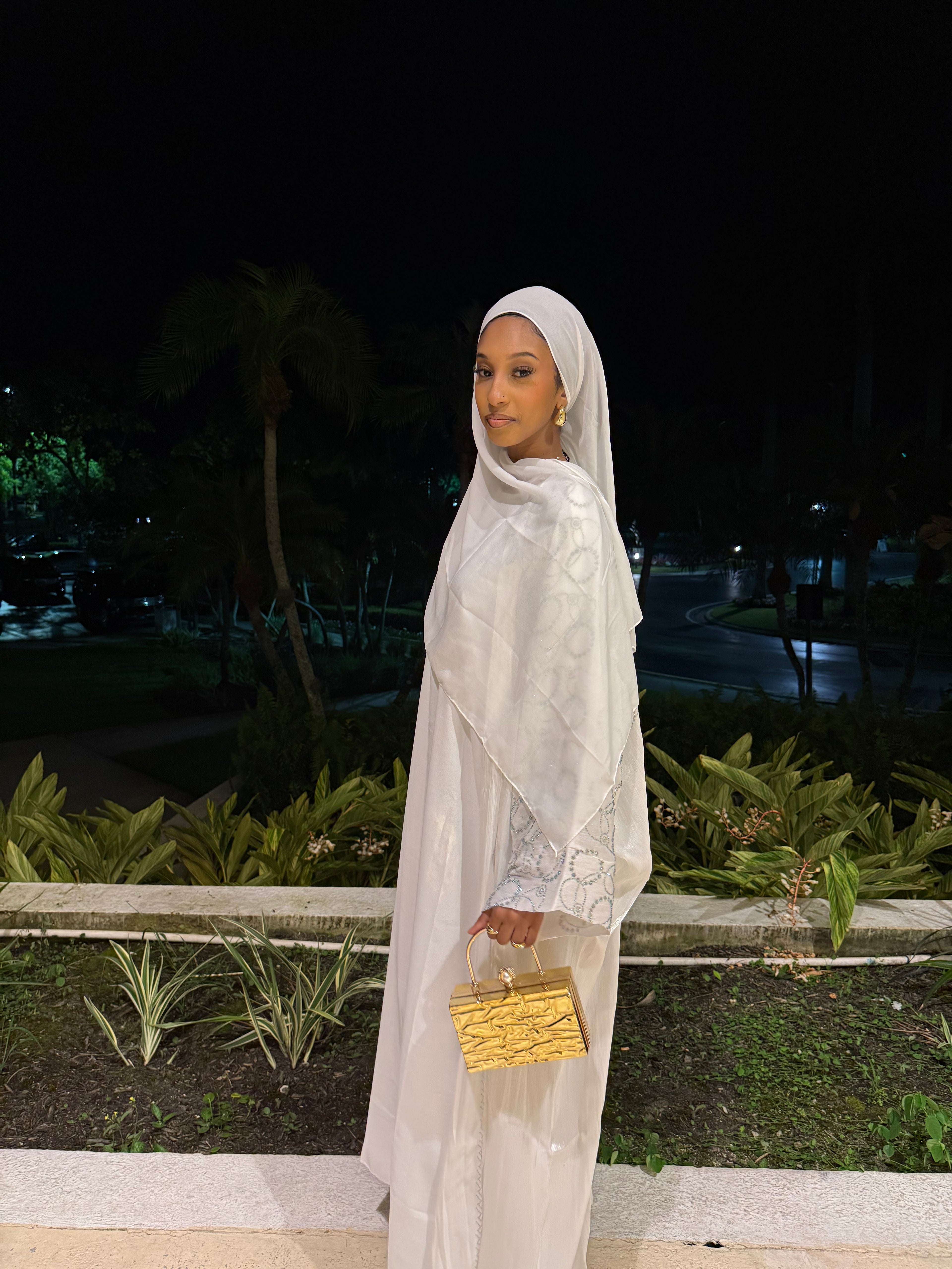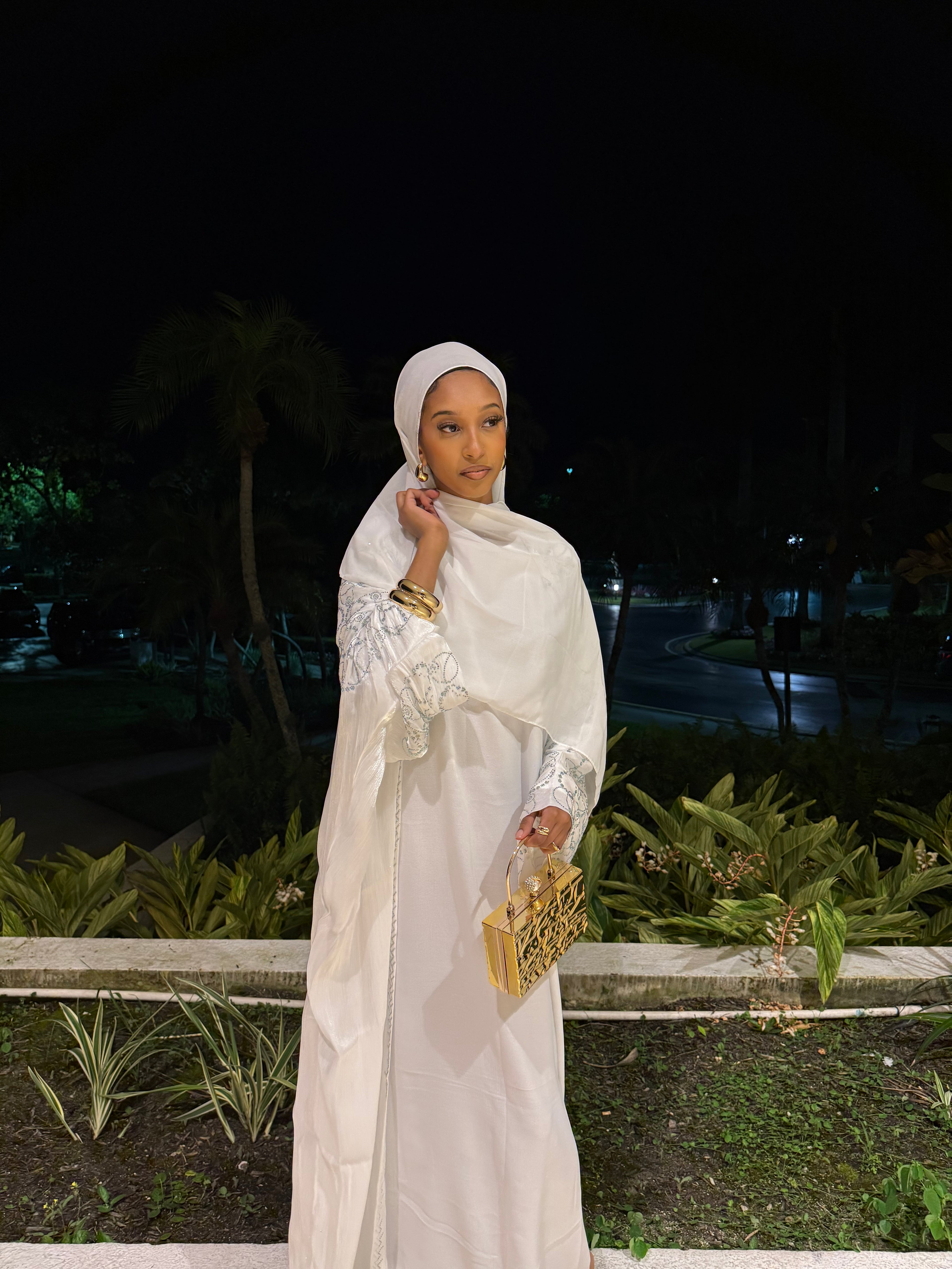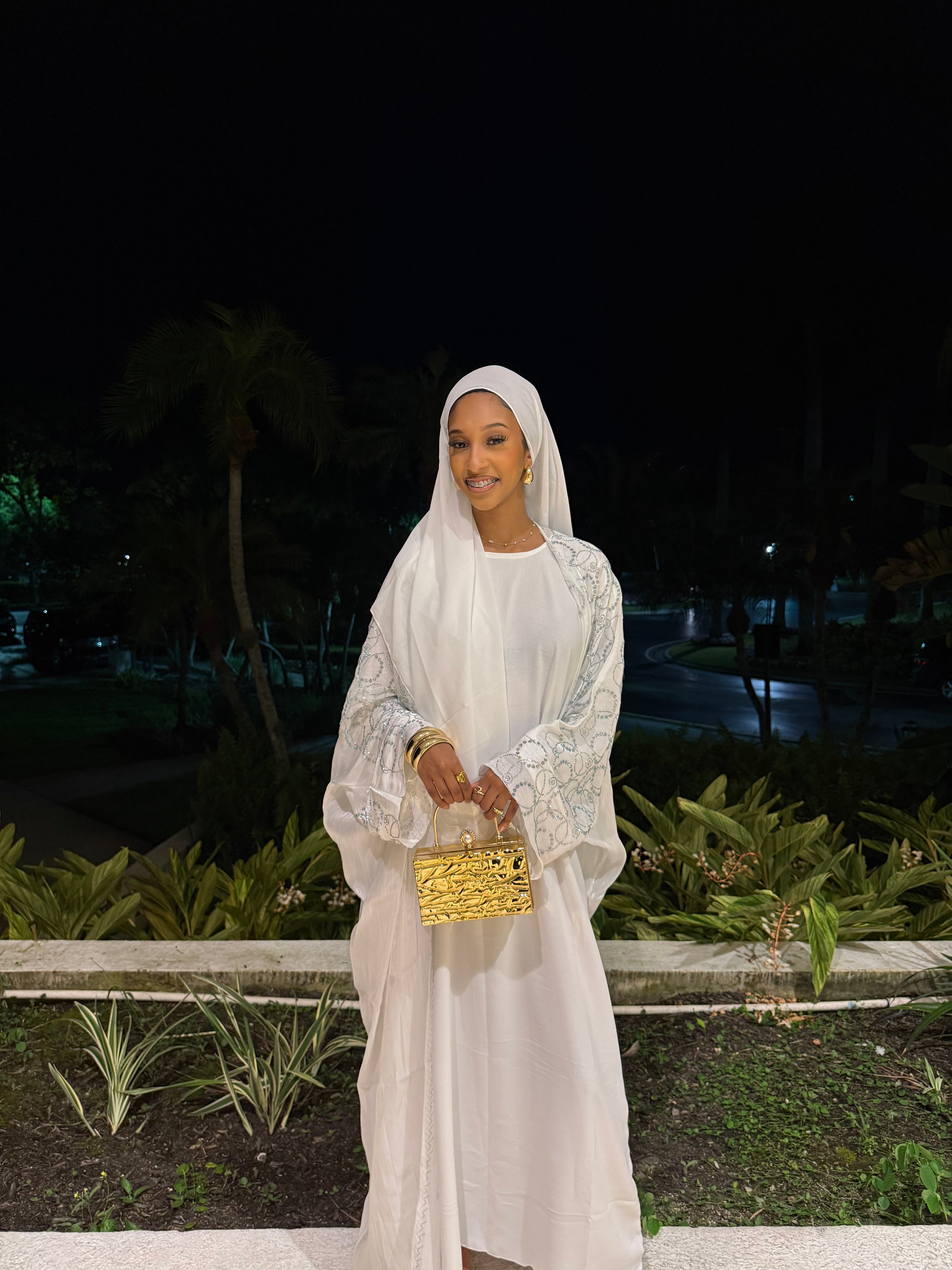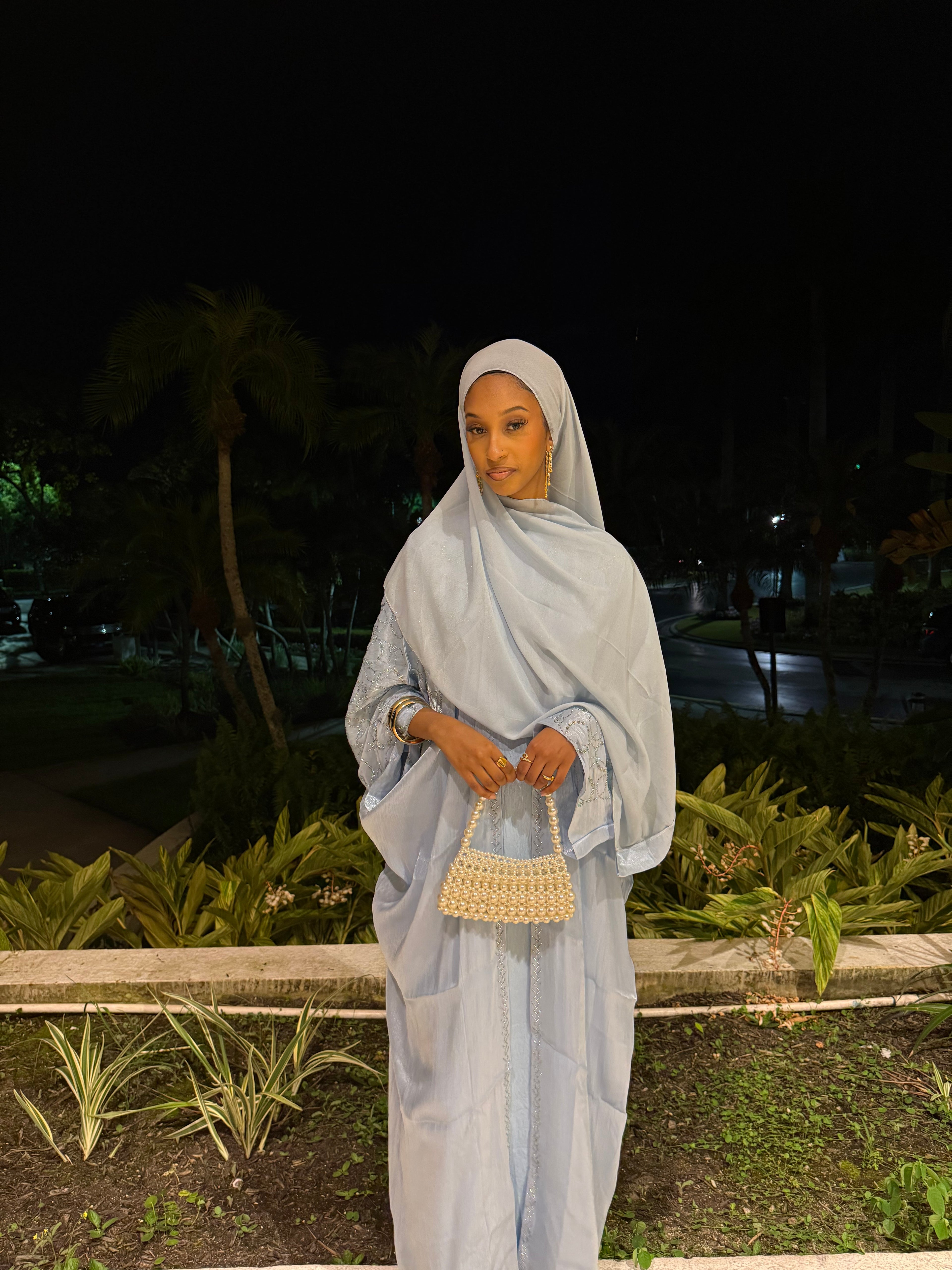 This elegant abaya set is available in two refined color options: classic white and soft baby blue. Designed with intricate embellishments, it includes a matching hijab, belt, and long-sleeve underdress for a complete, modest look. Perfect for formal occasions, this set blends timeless elegance with modern style.