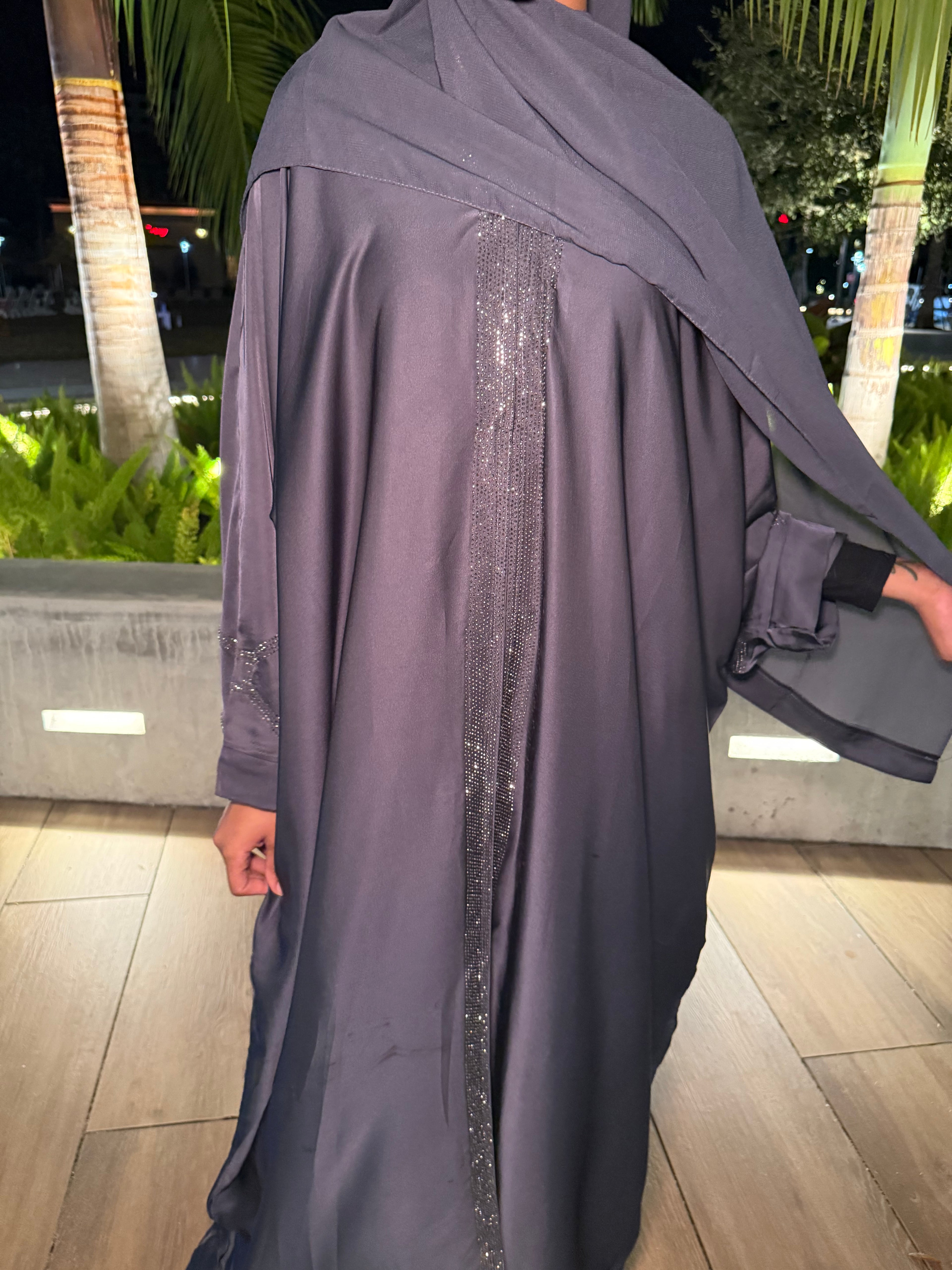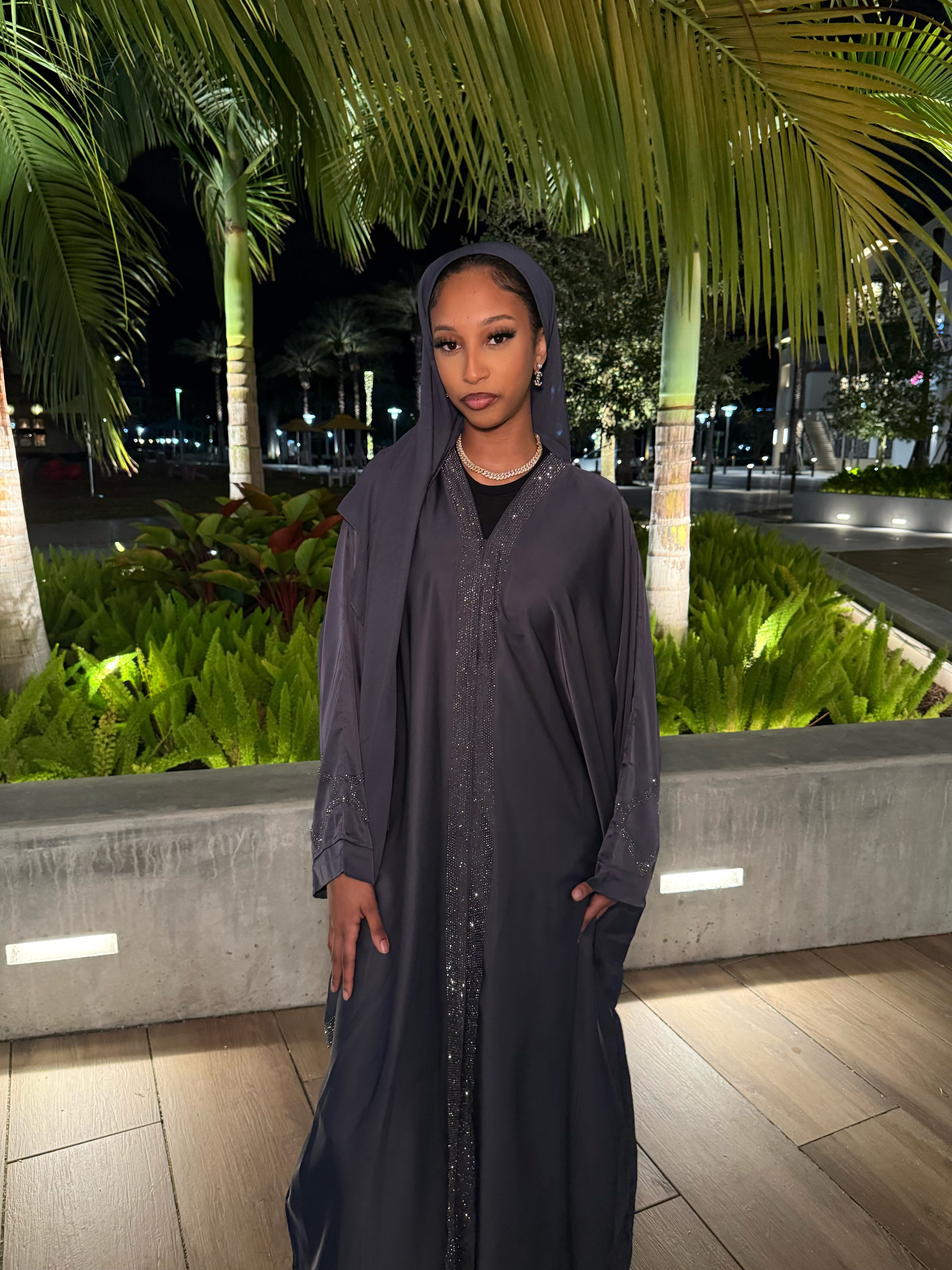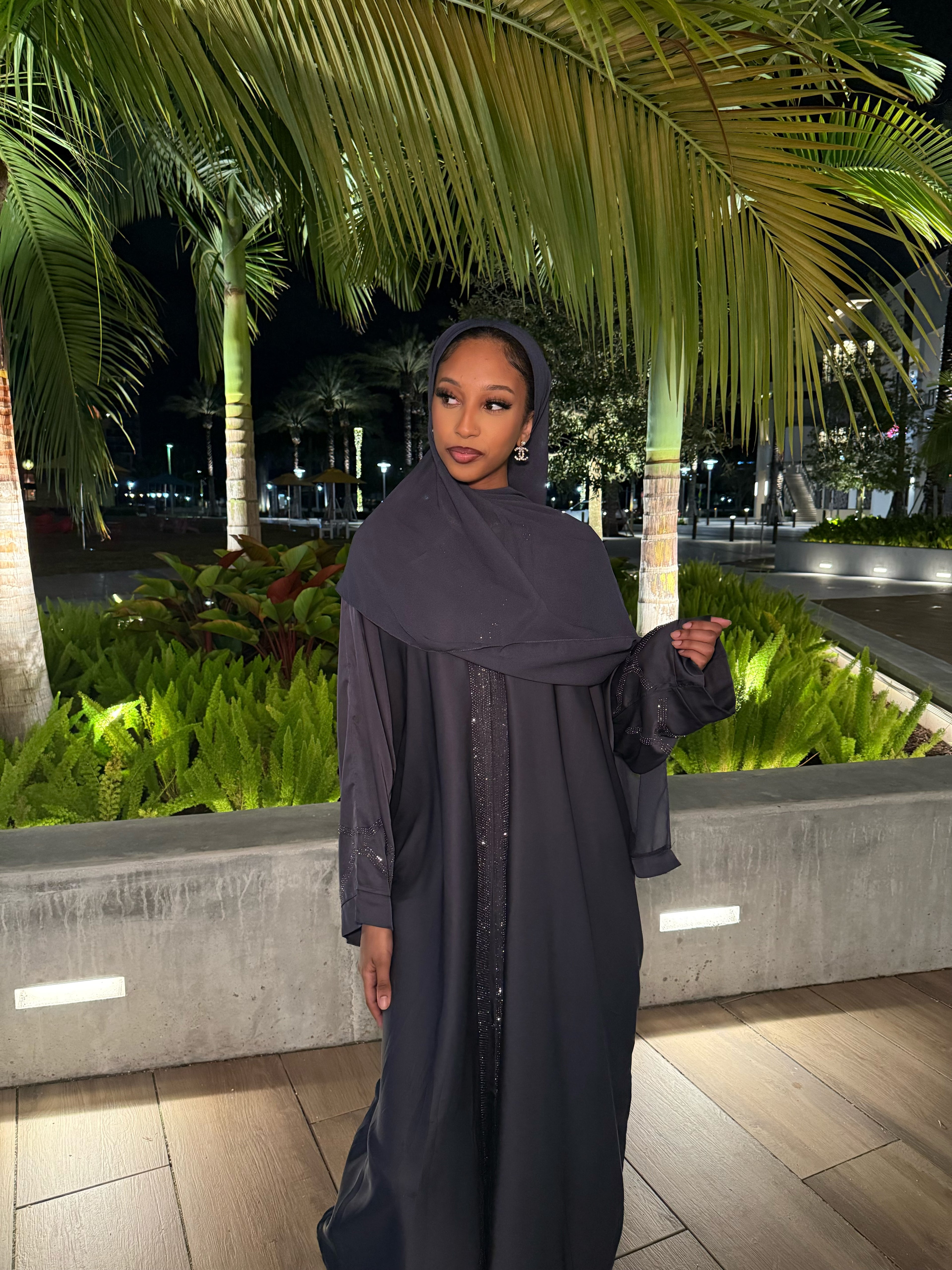 The Moonlight Abaya is a soft and elegant piece designed to shine day or night. This button abaya can be worn open for a flowing layered look or closed for a sleek modest silhouette. Subtle shimmer detailing adds a touch of luxury, and a matching hijab completes the look.