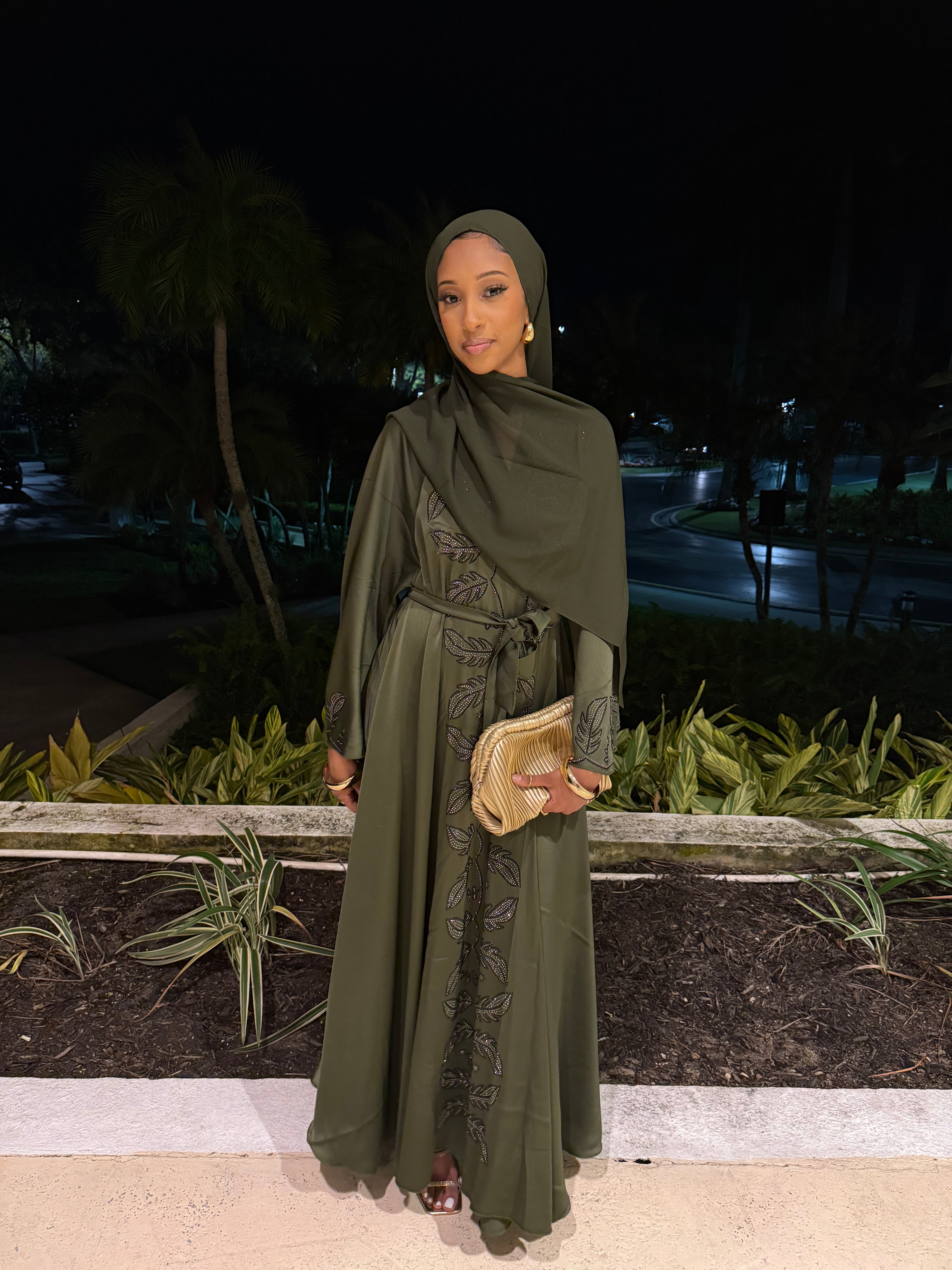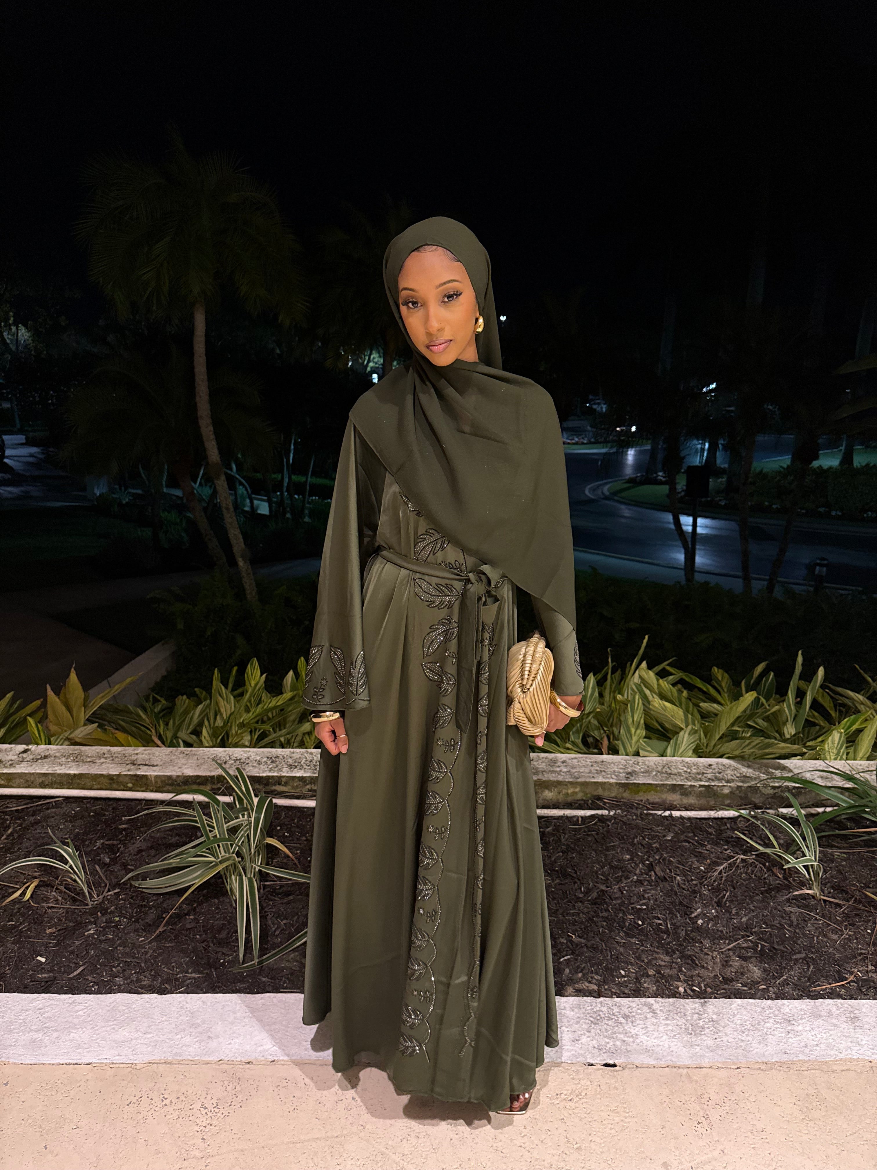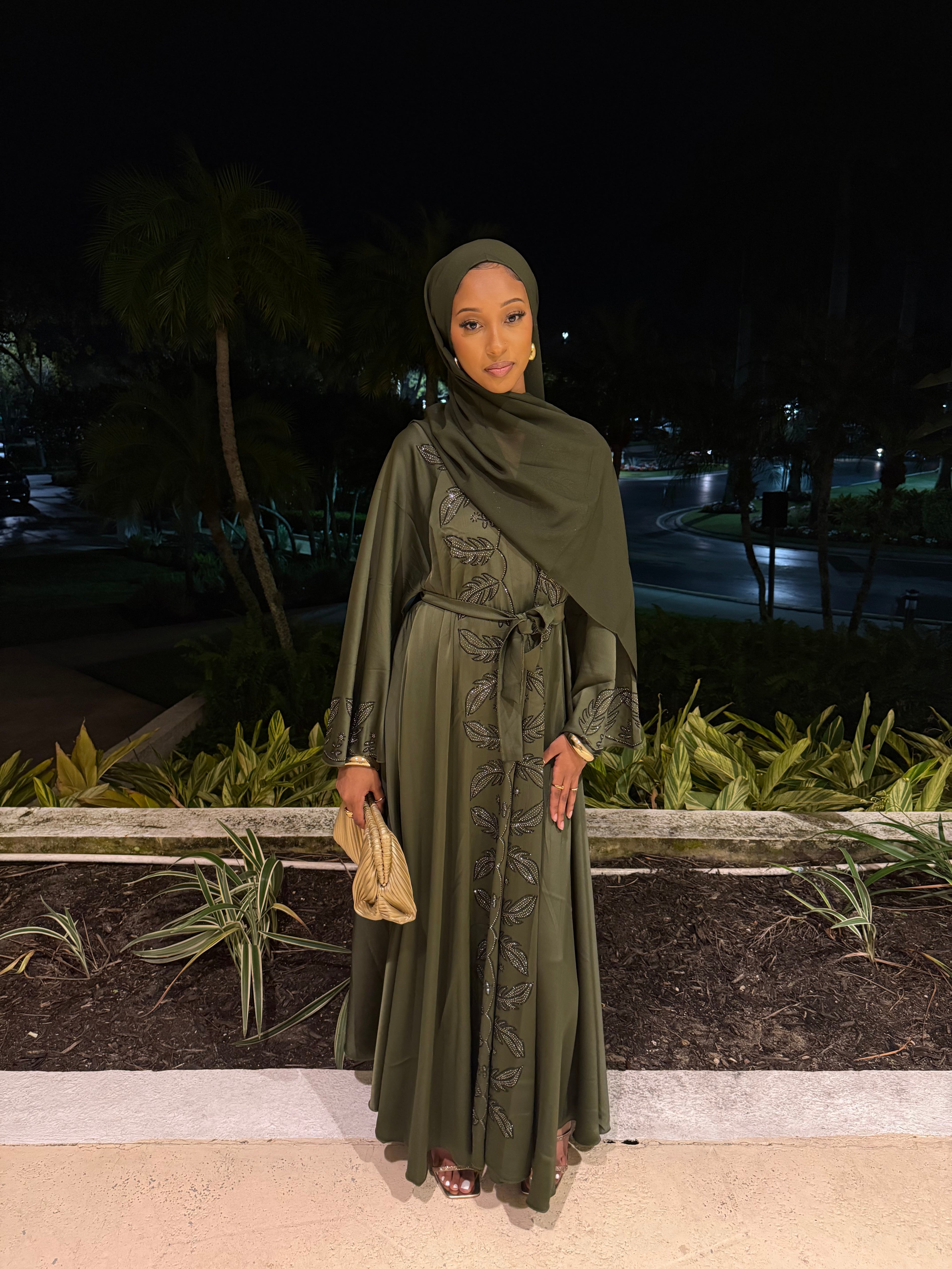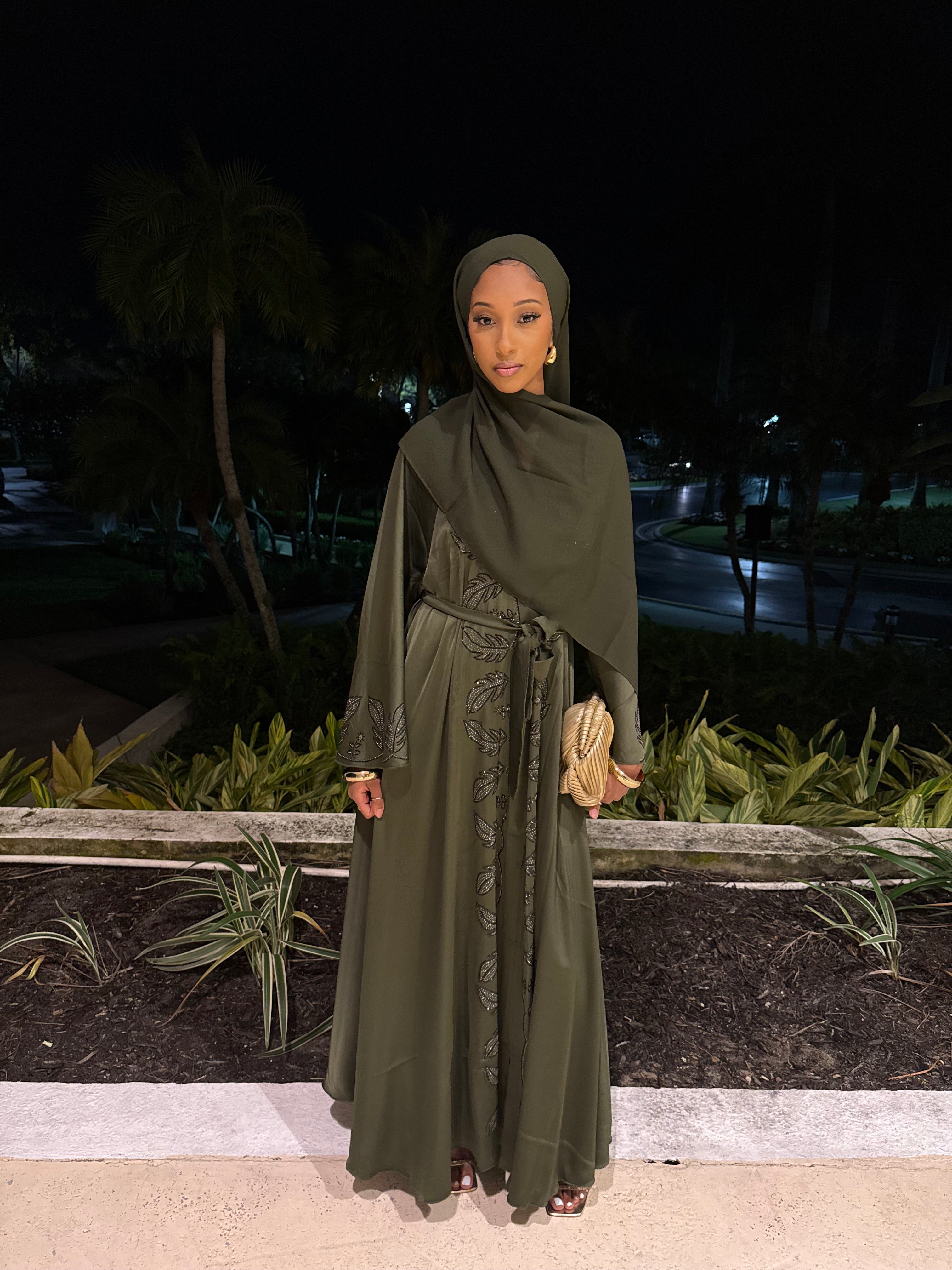 Effortlessly elegant and easy to wear, this closed abaya set is all about timeless beauty. Designed with soft embroidery and a flattering flow, it comes with a matching hijab and belt so you can style it your way. Perfect for evenings out or polished everyday looks; simple, graceful, and made to feel good.