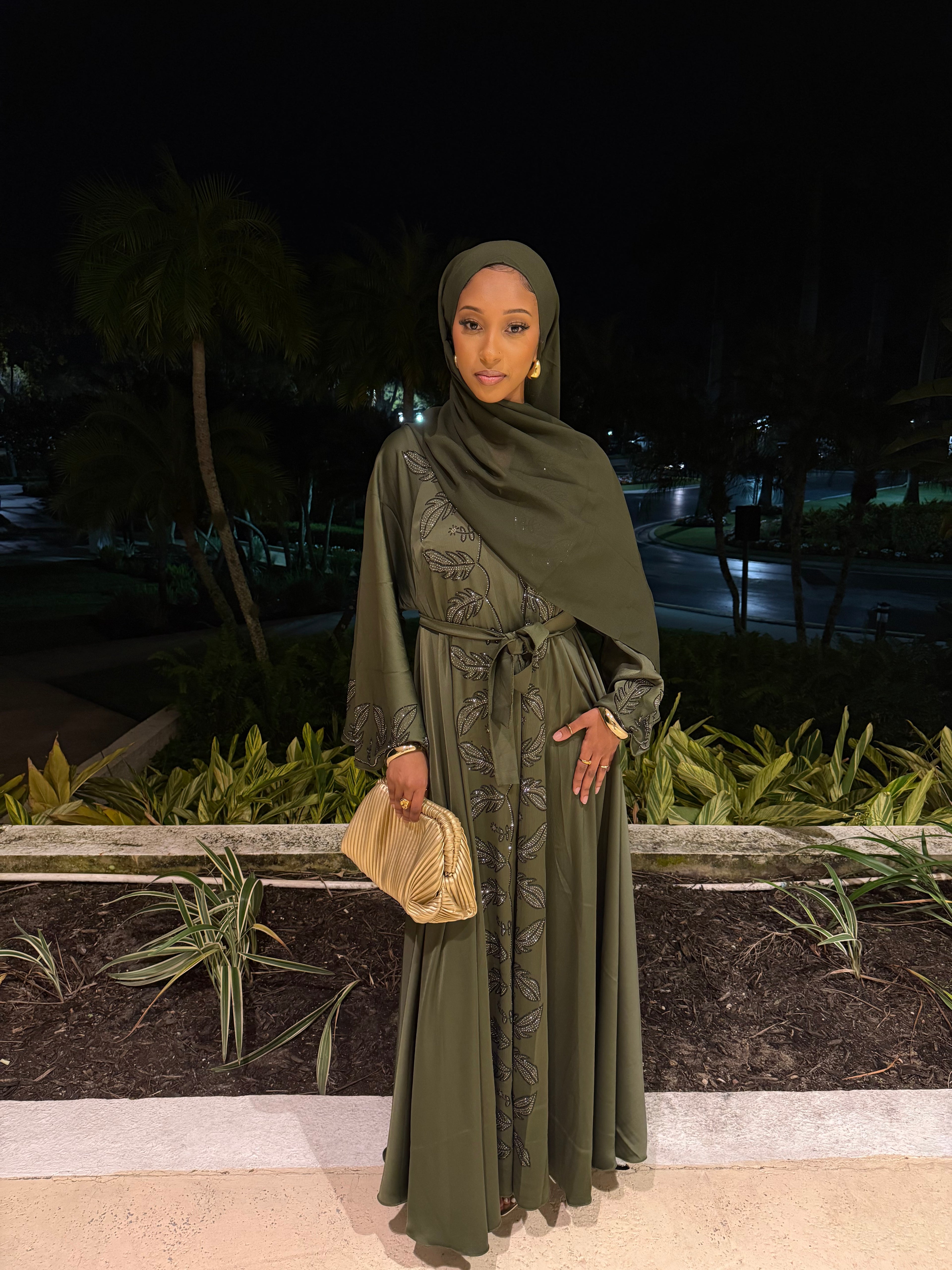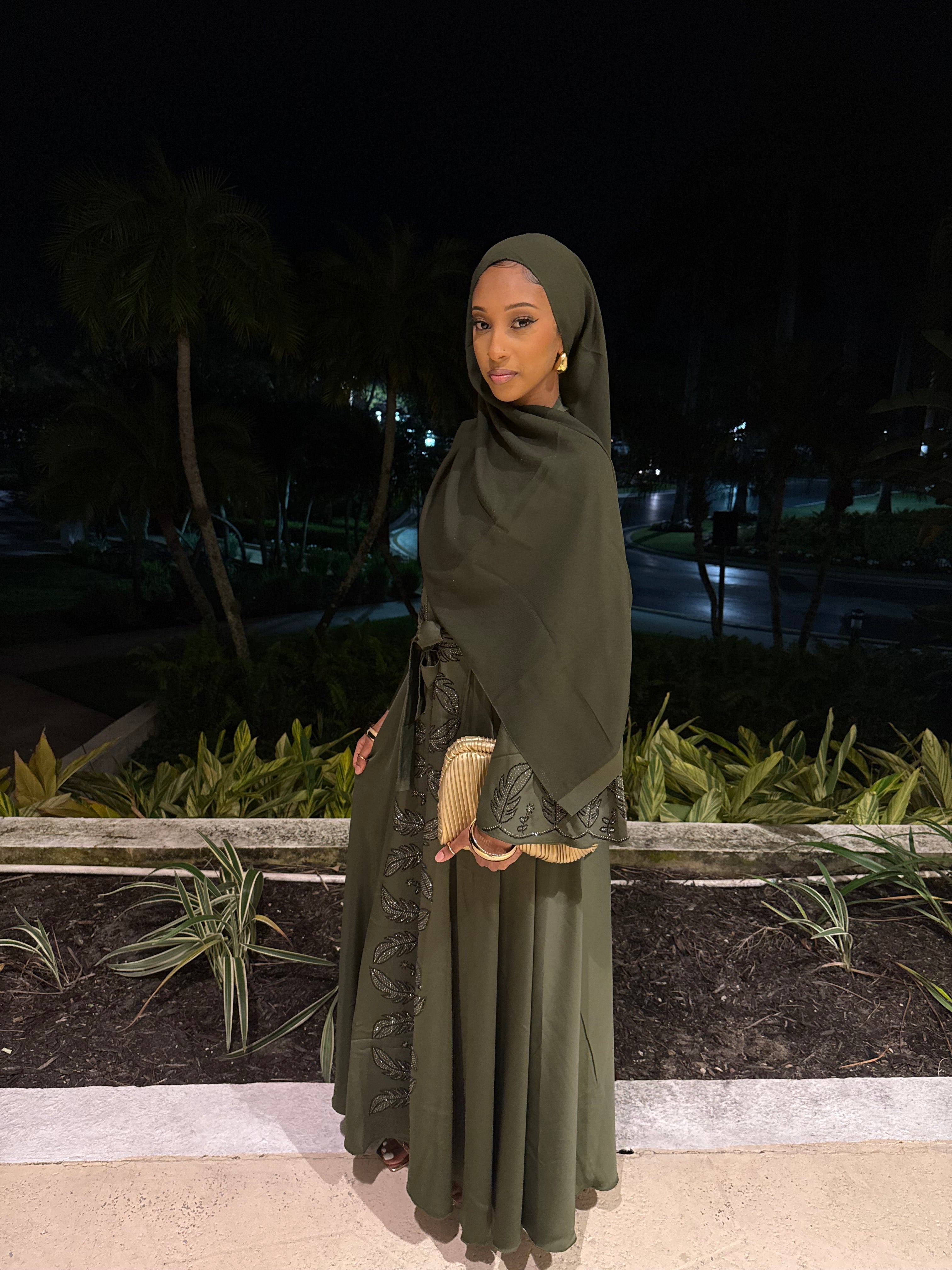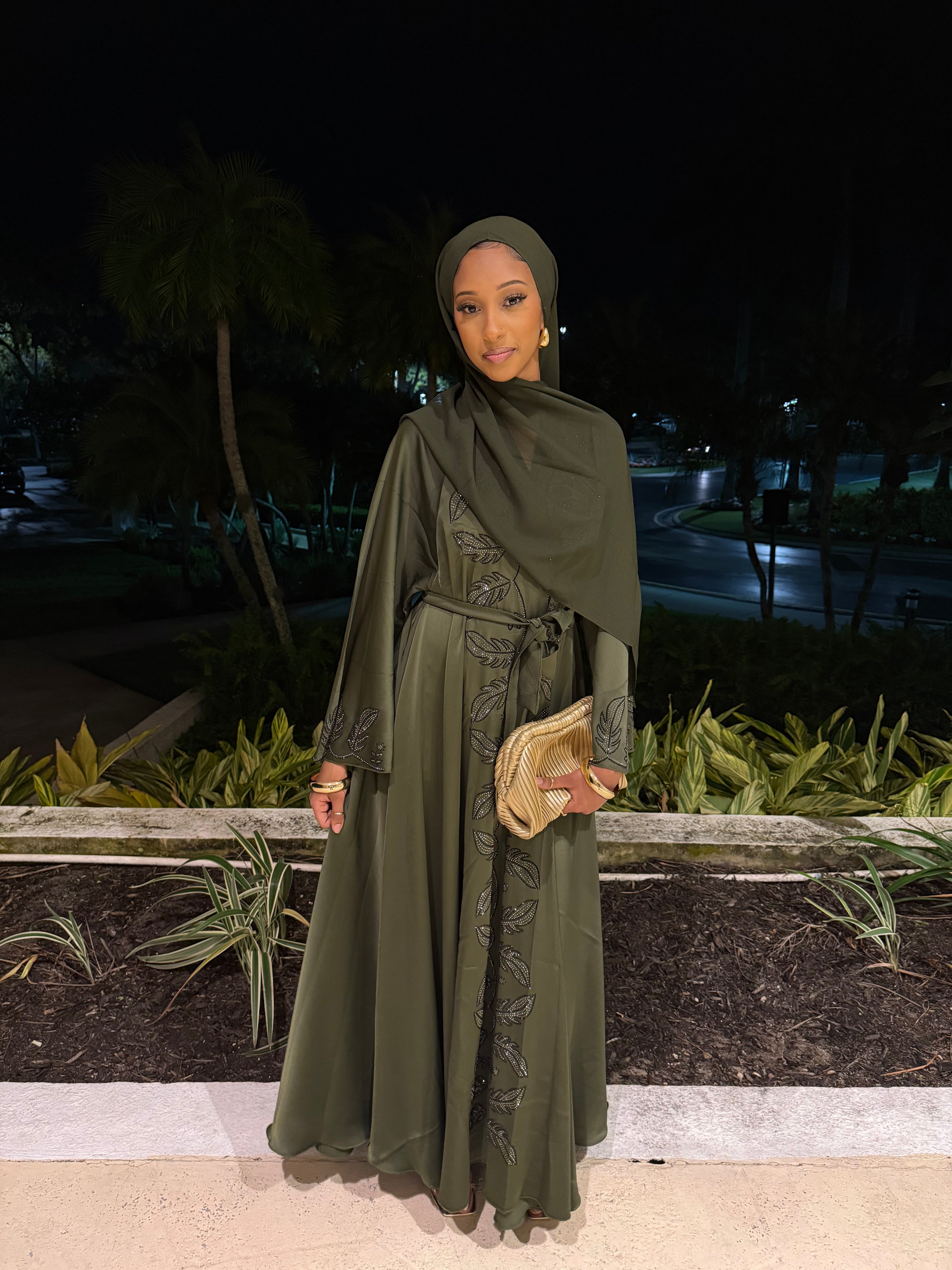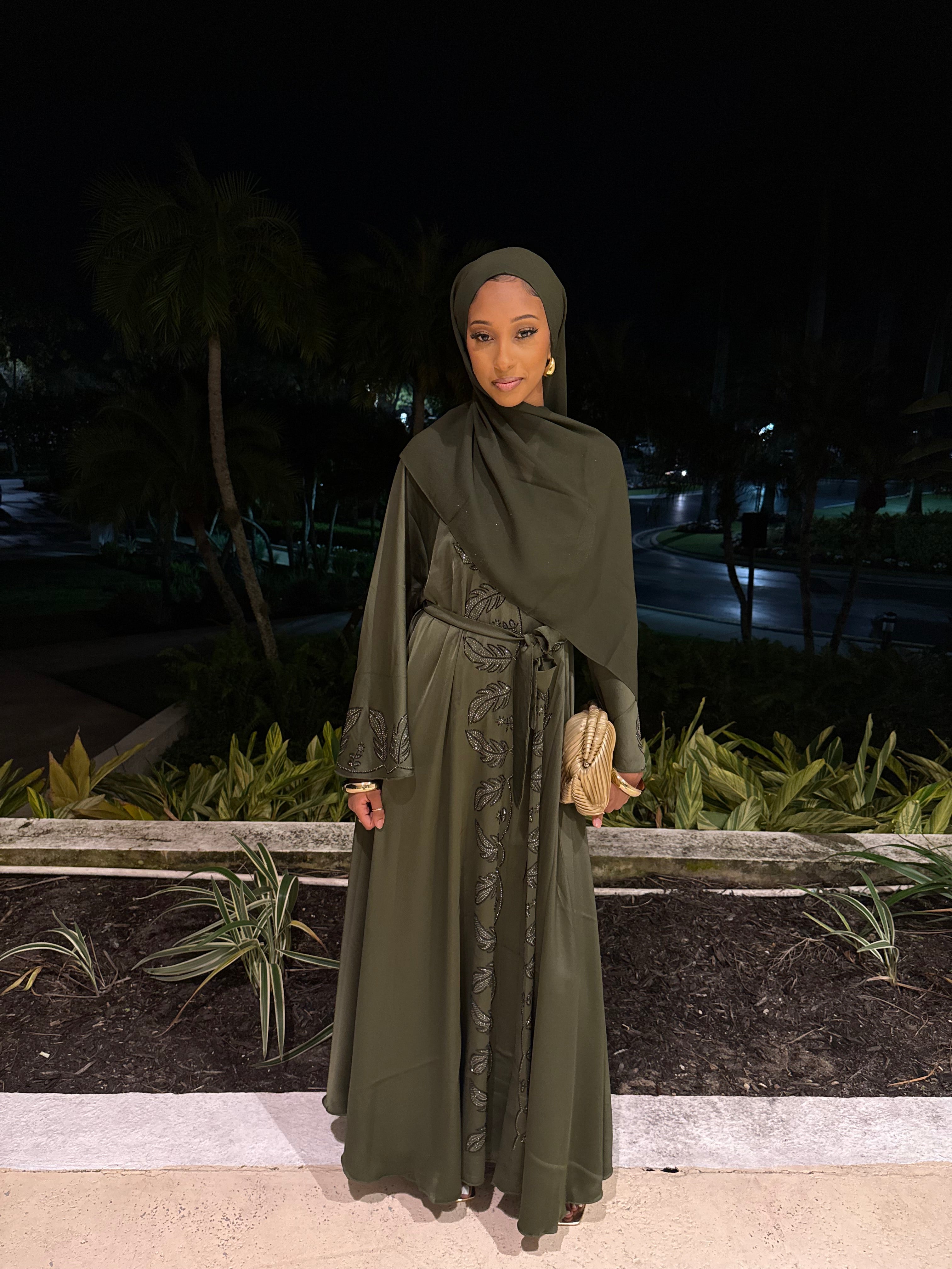 Effortlessly elegant and easy to wear, this closed abaya set is all about timeless beauty. Designed with soft embroidery and a flattering flow, it comes with a matching hijab and belt so you can style it your way. Perfect for evenings out or polished everyday looks; simple, graceful, and made to feel good.