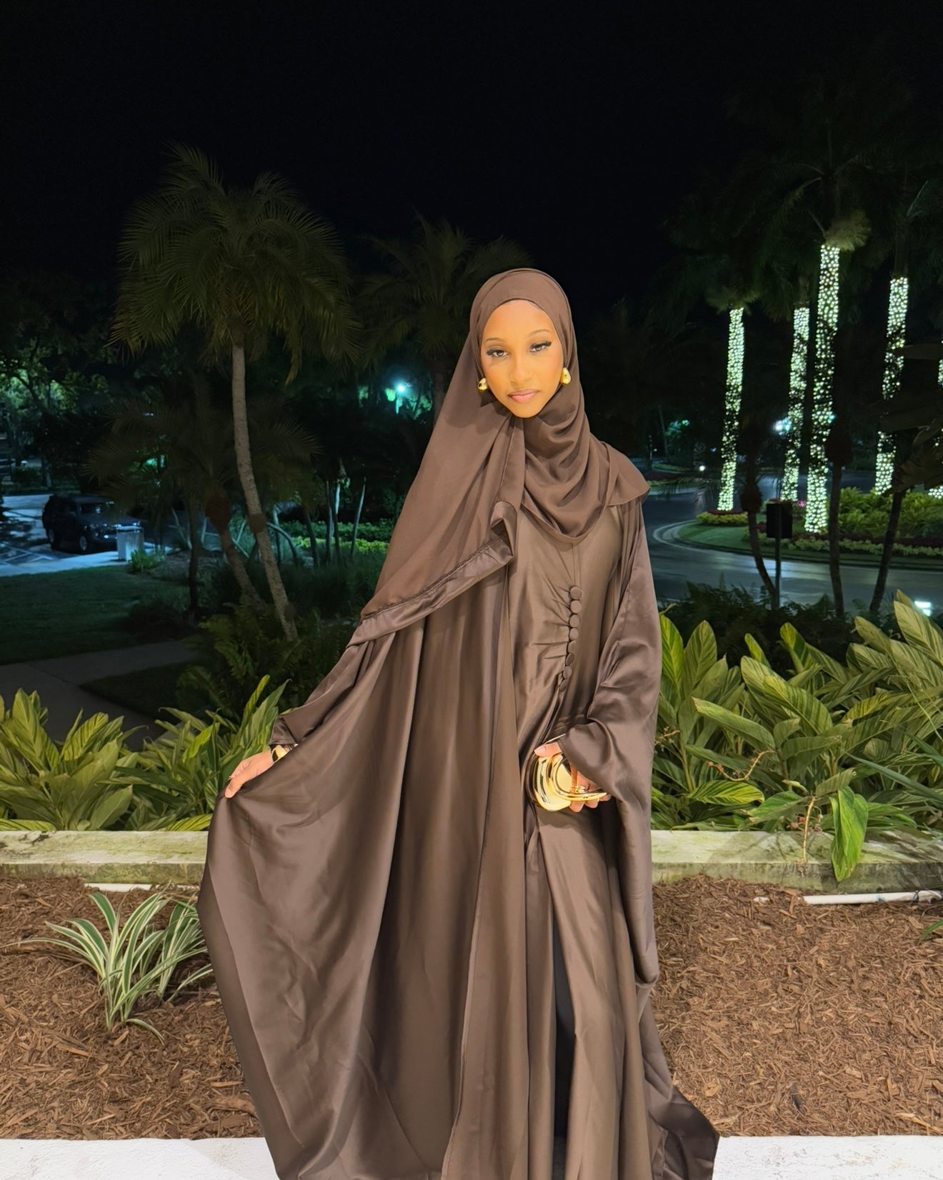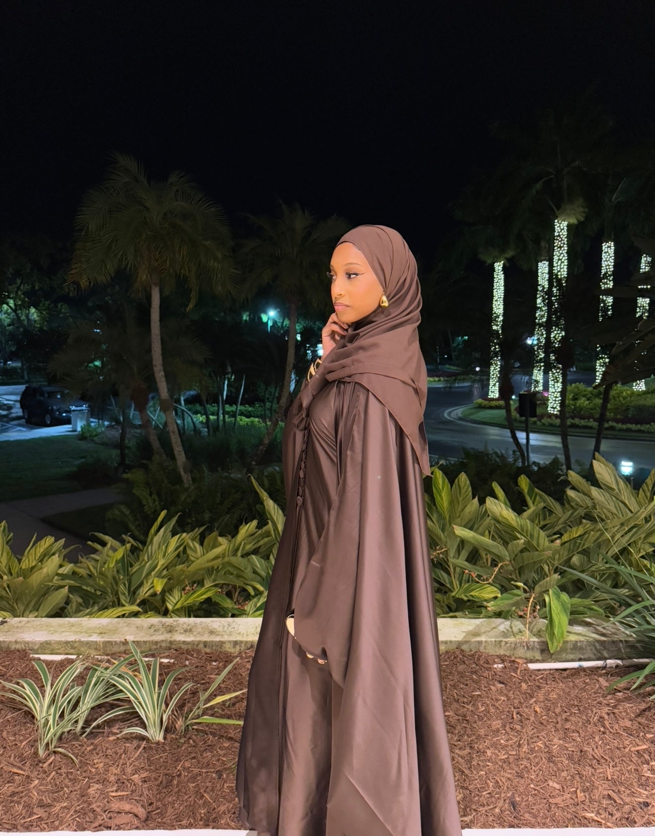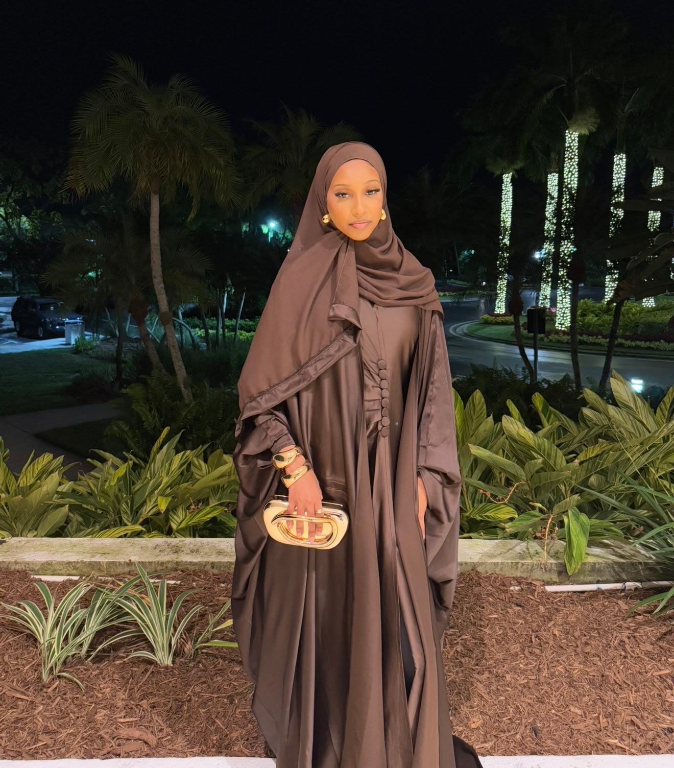 * Elegant Design: This beautiful silk abaya comes with a hijab and dress included. The brown color is perfect for fall and special occasions. ๐