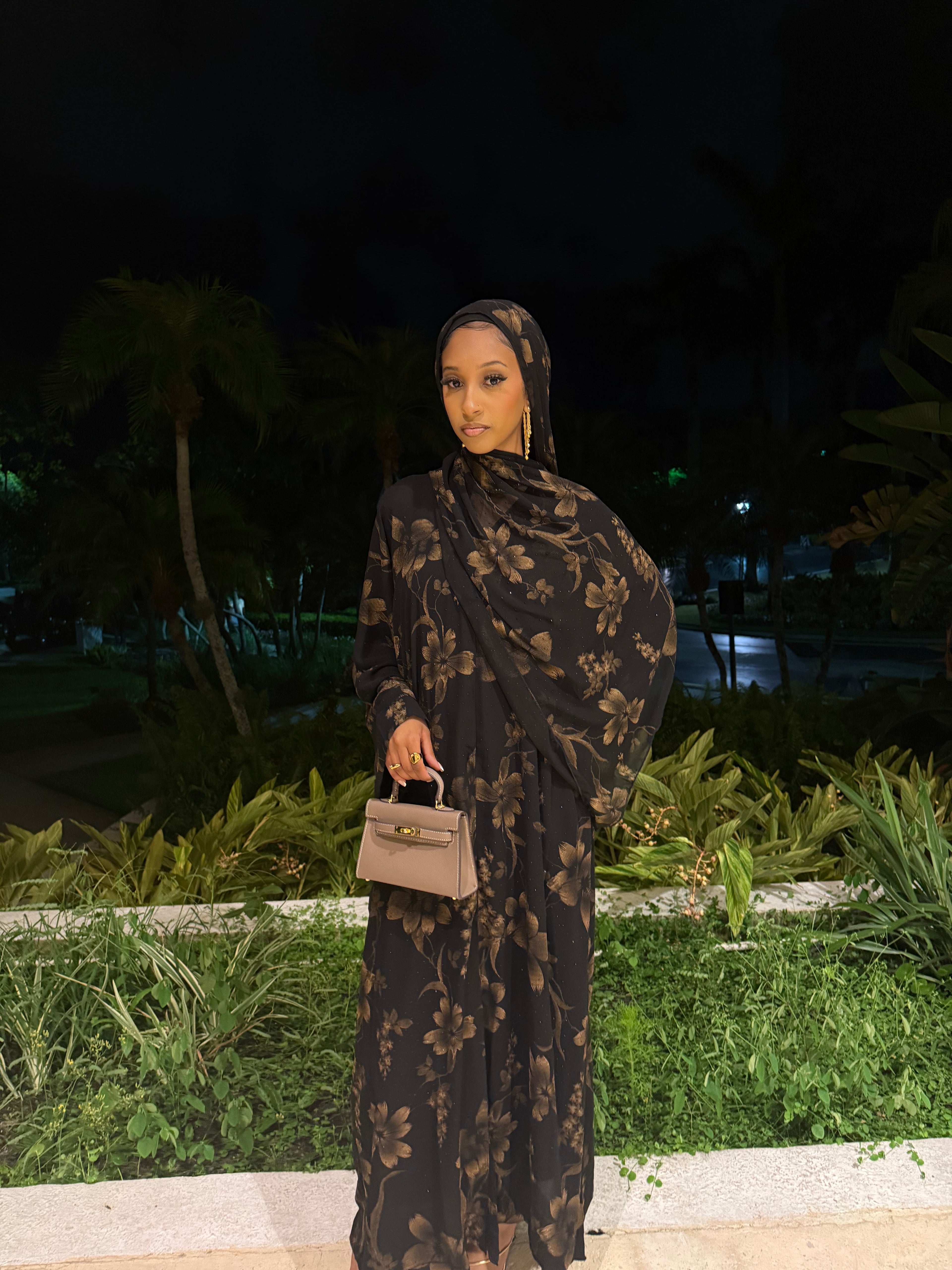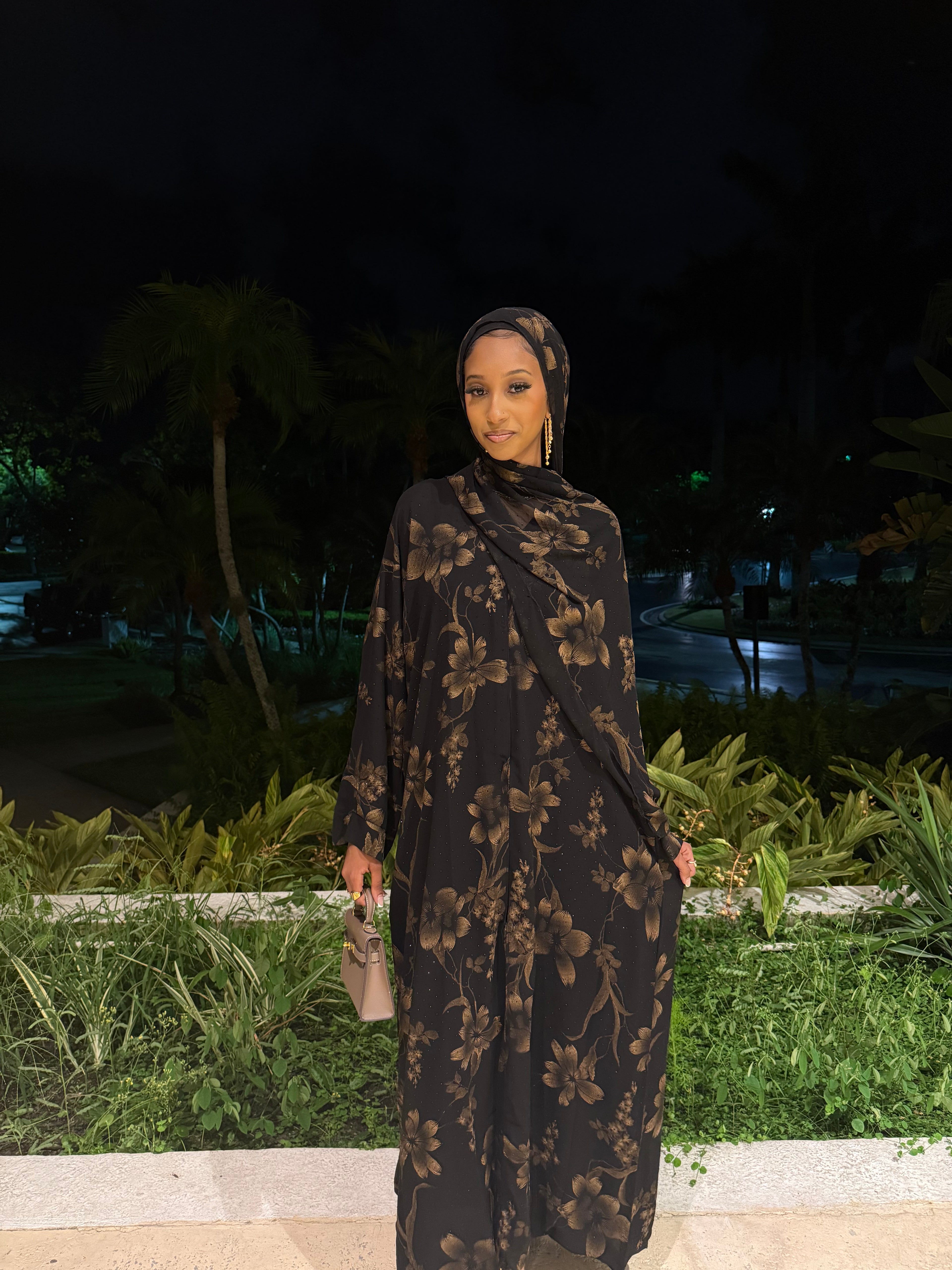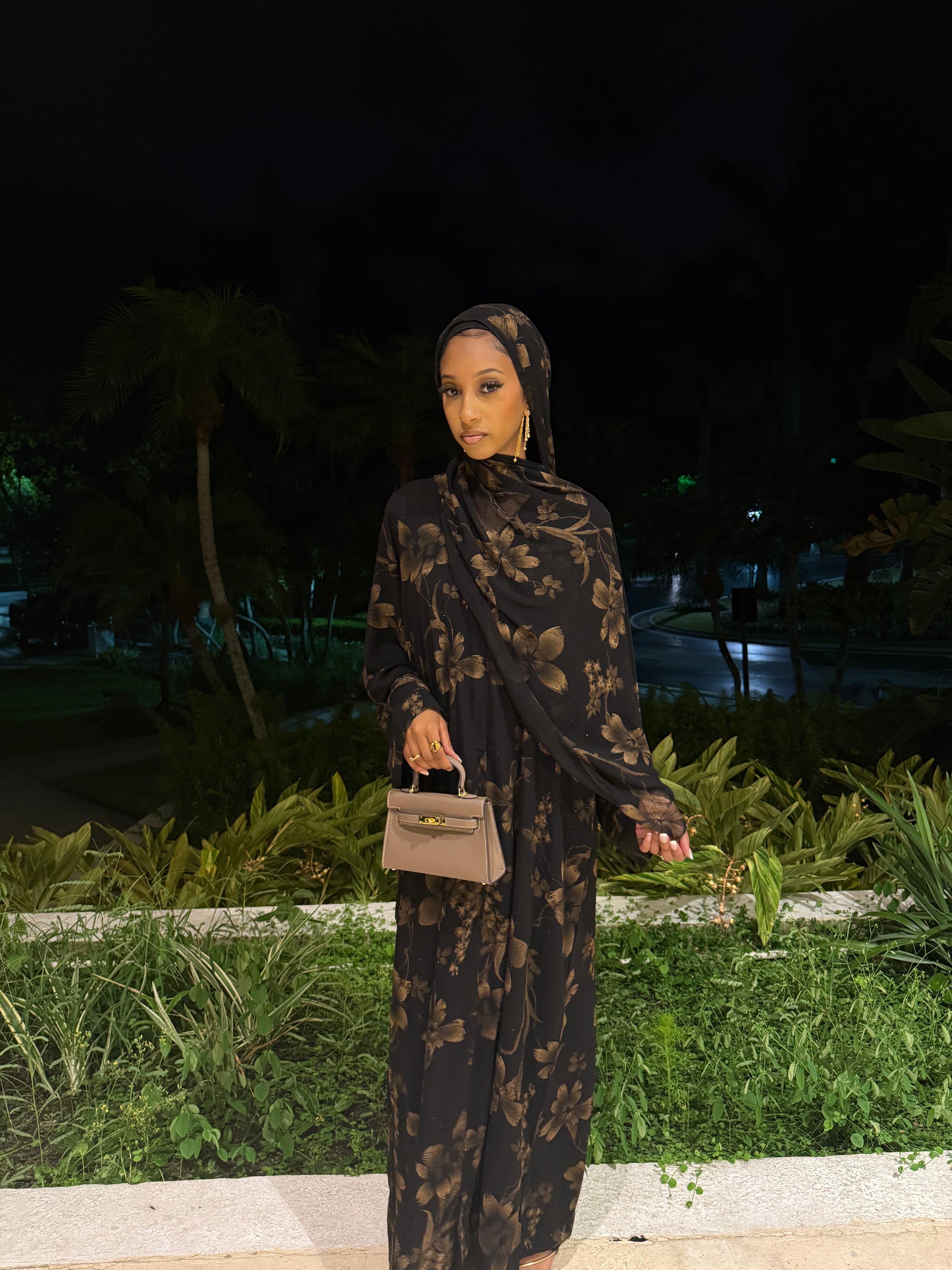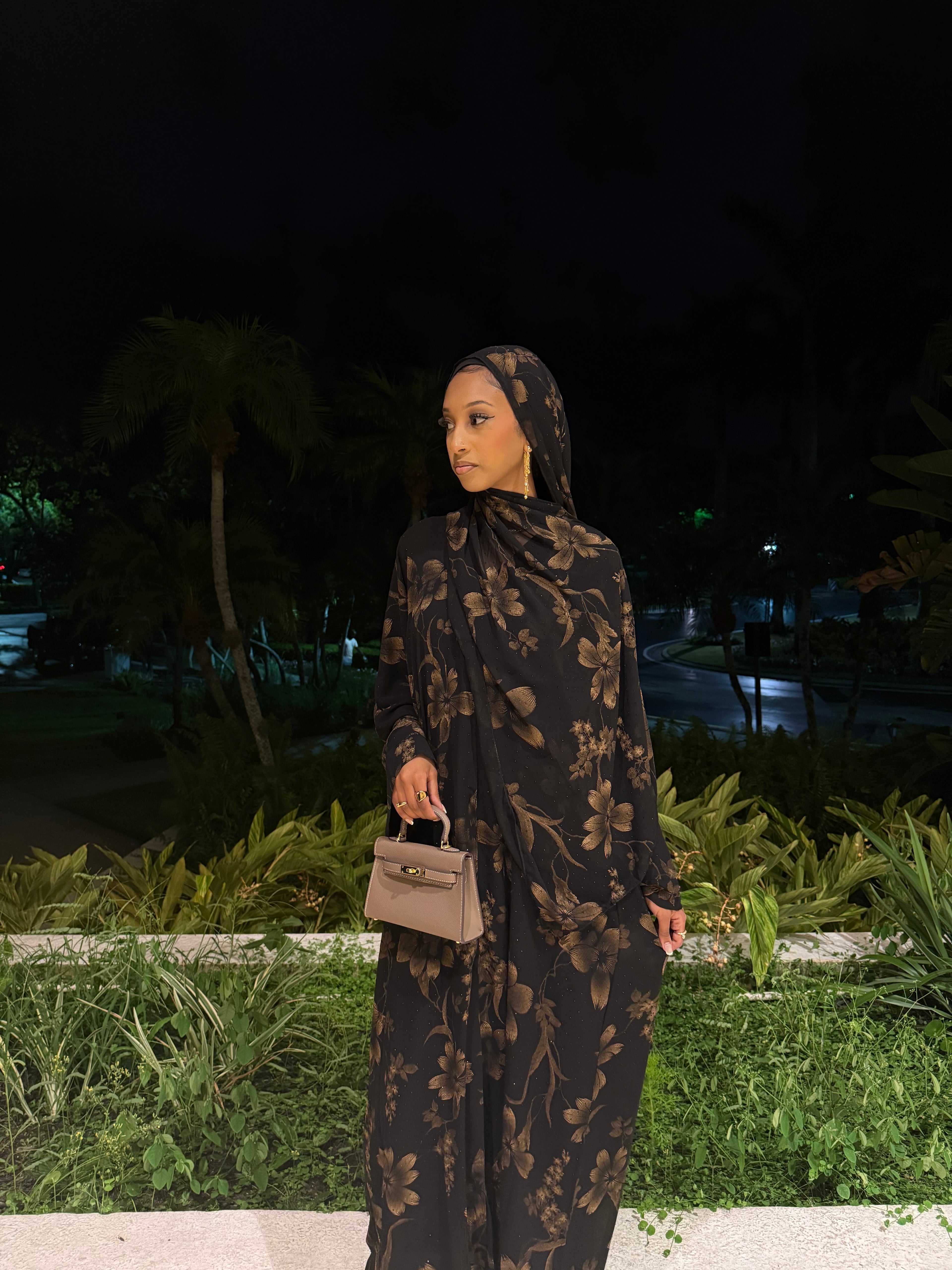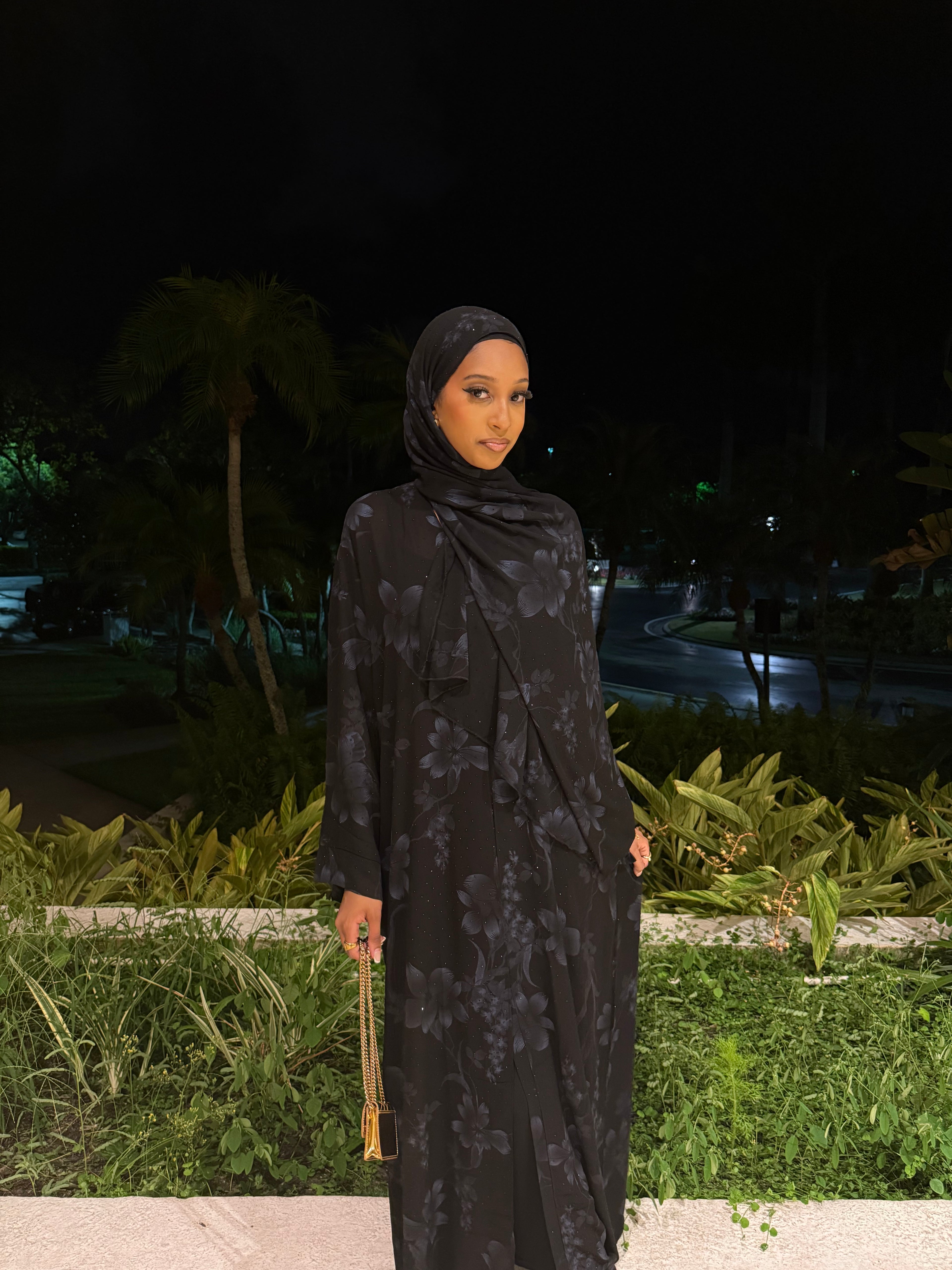 Stunning printed abaya covered in black rhinestones, on chiffon material with a matching scarf.