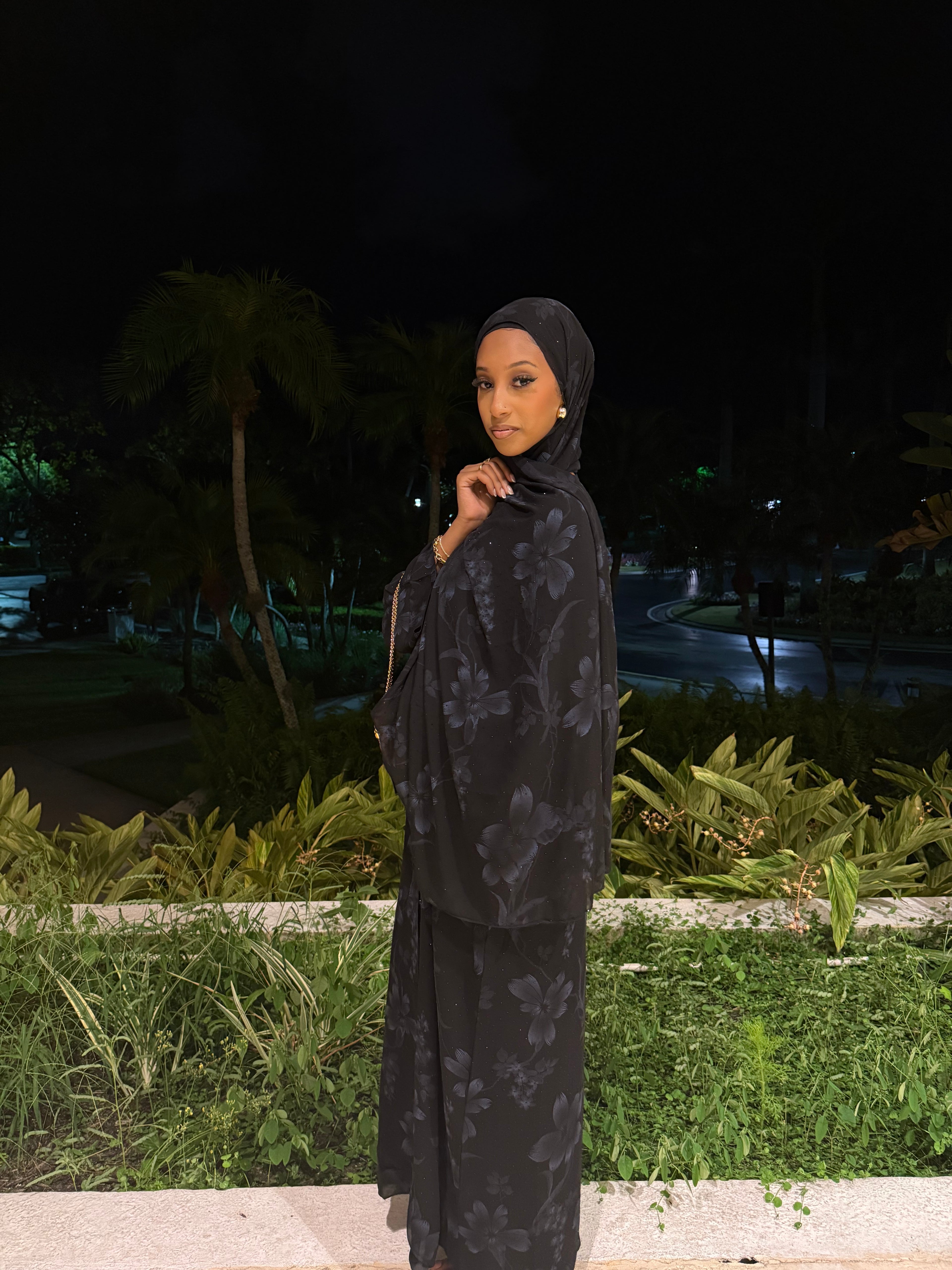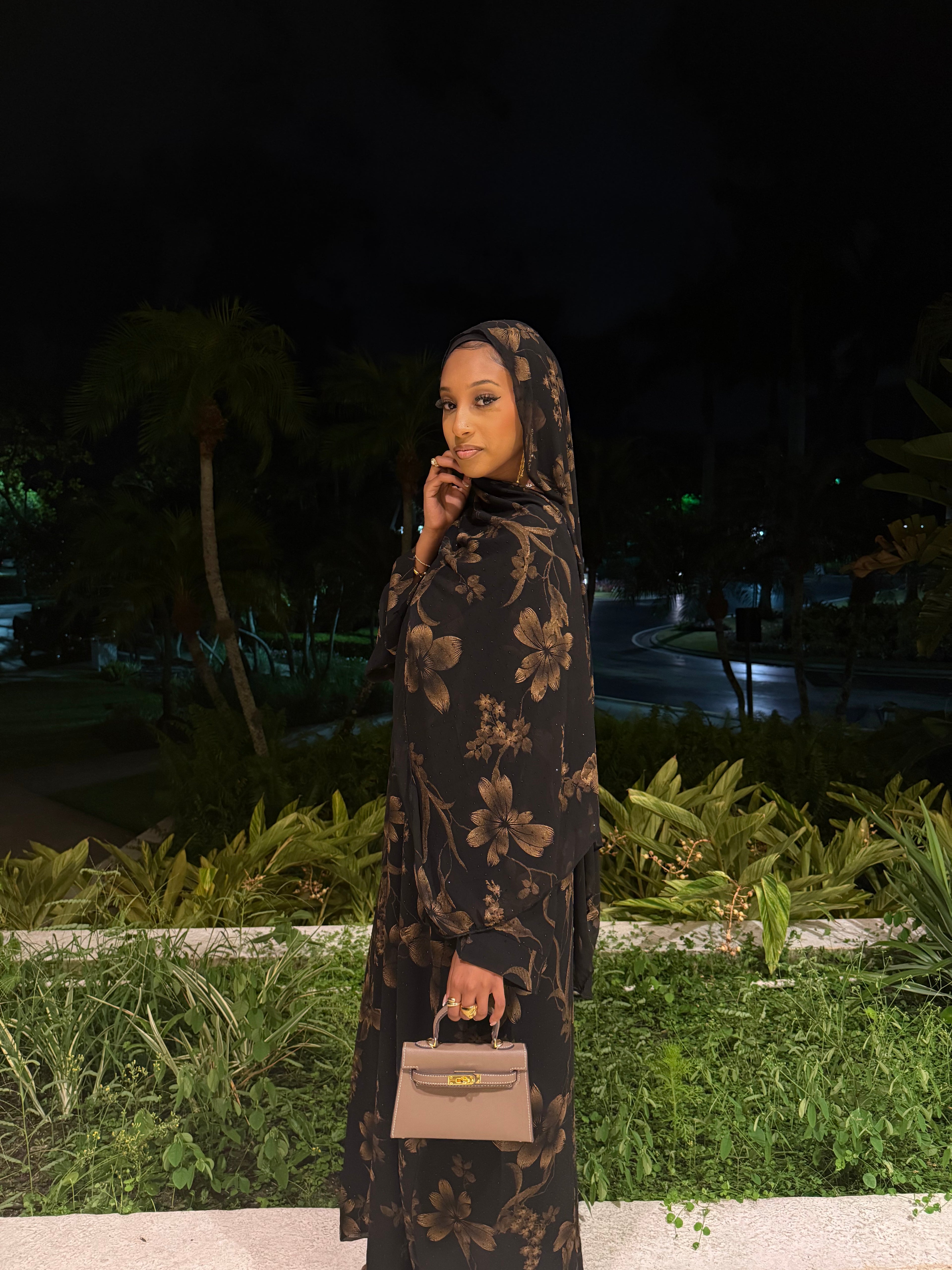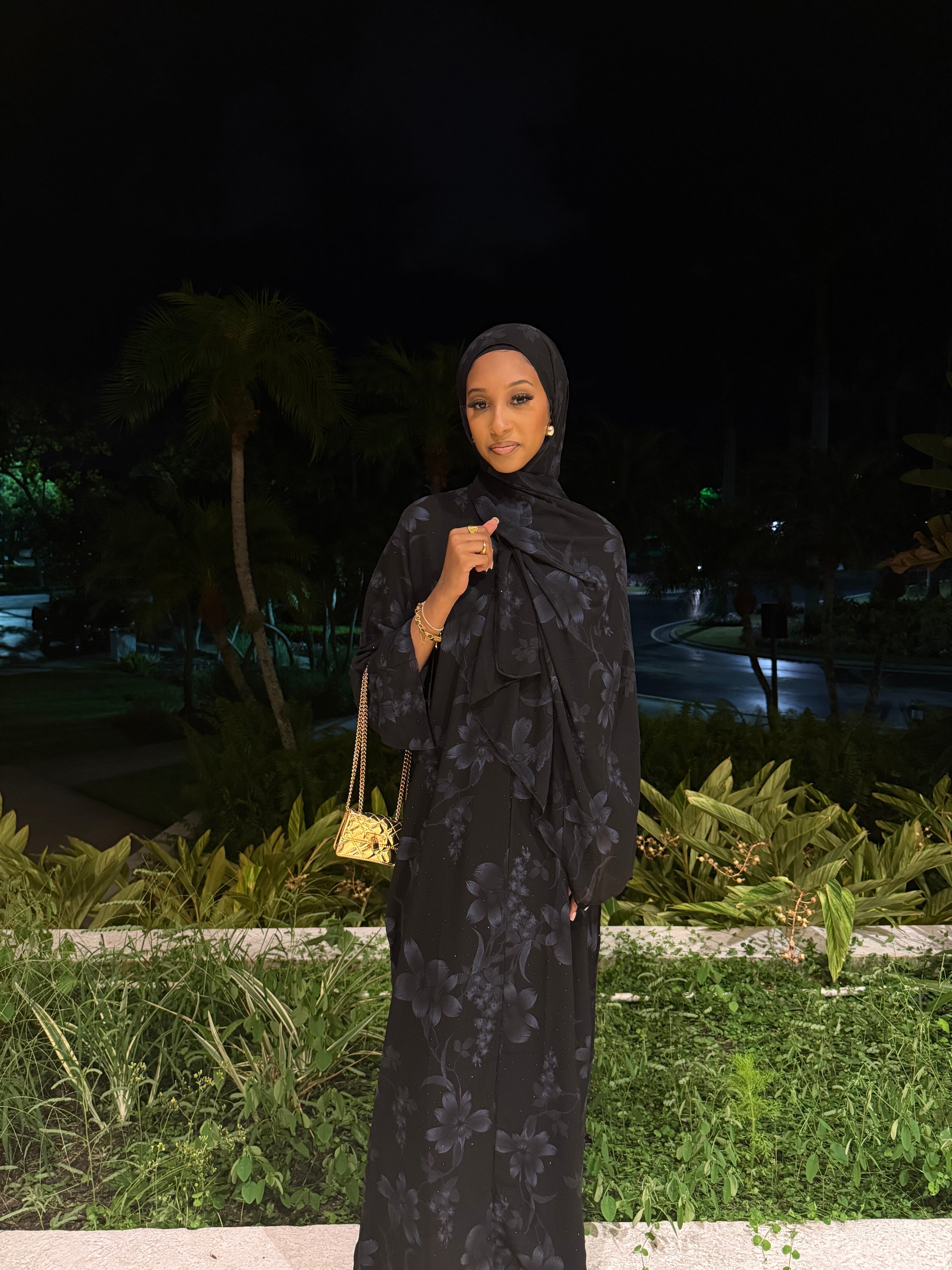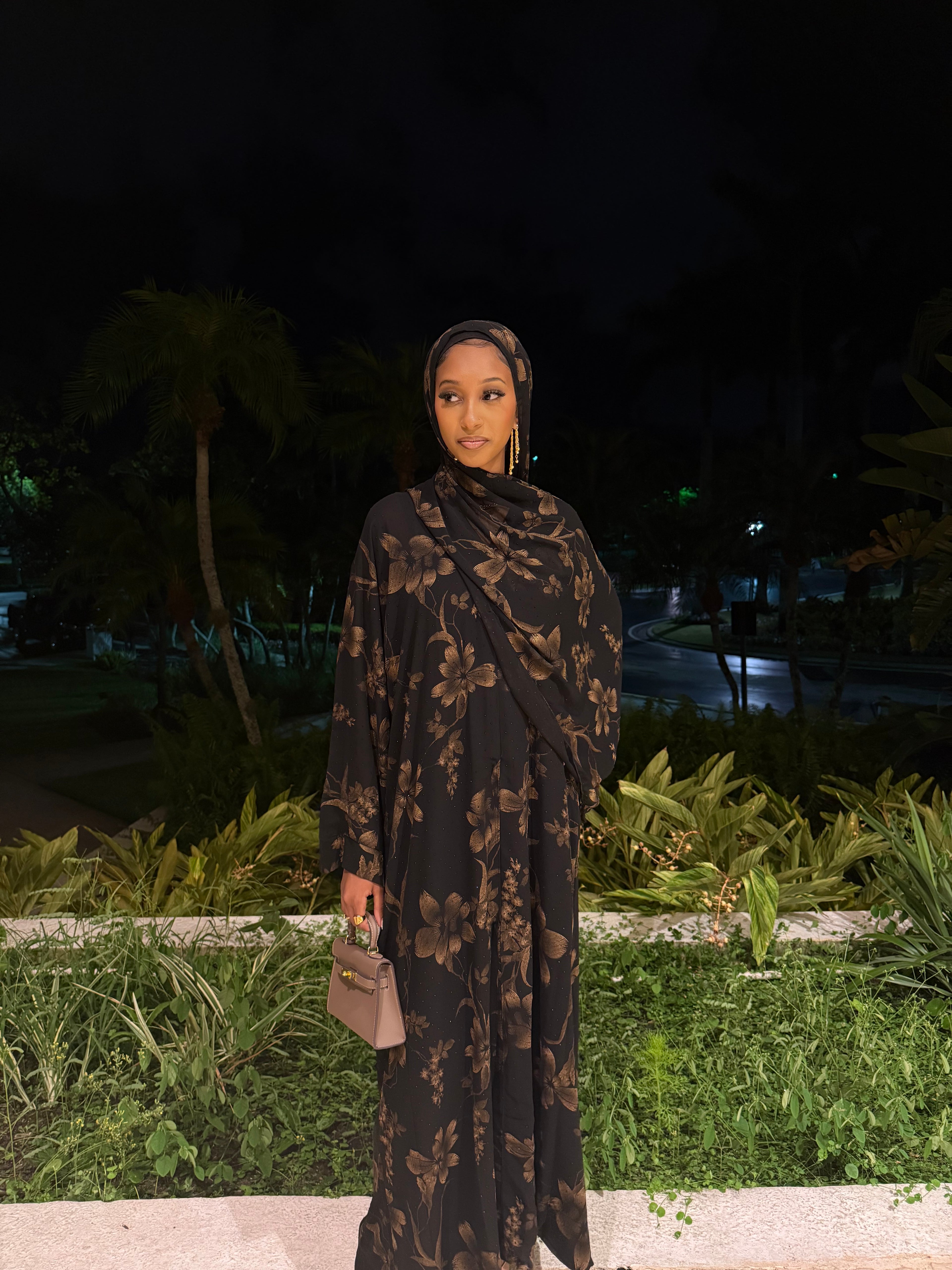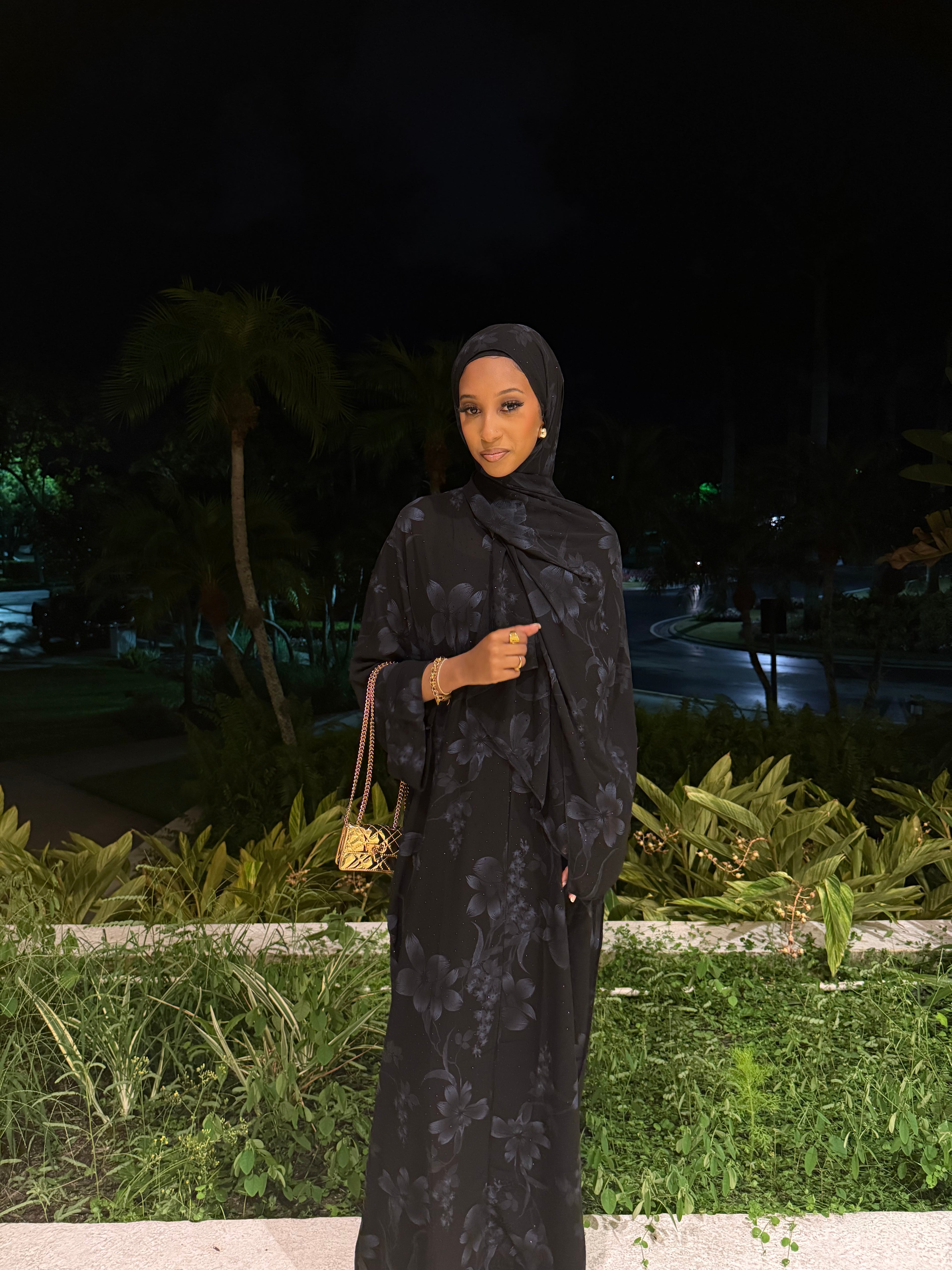 Stunning printed abaya covered in black rhinestones, on chiffon material with a matching scarf.