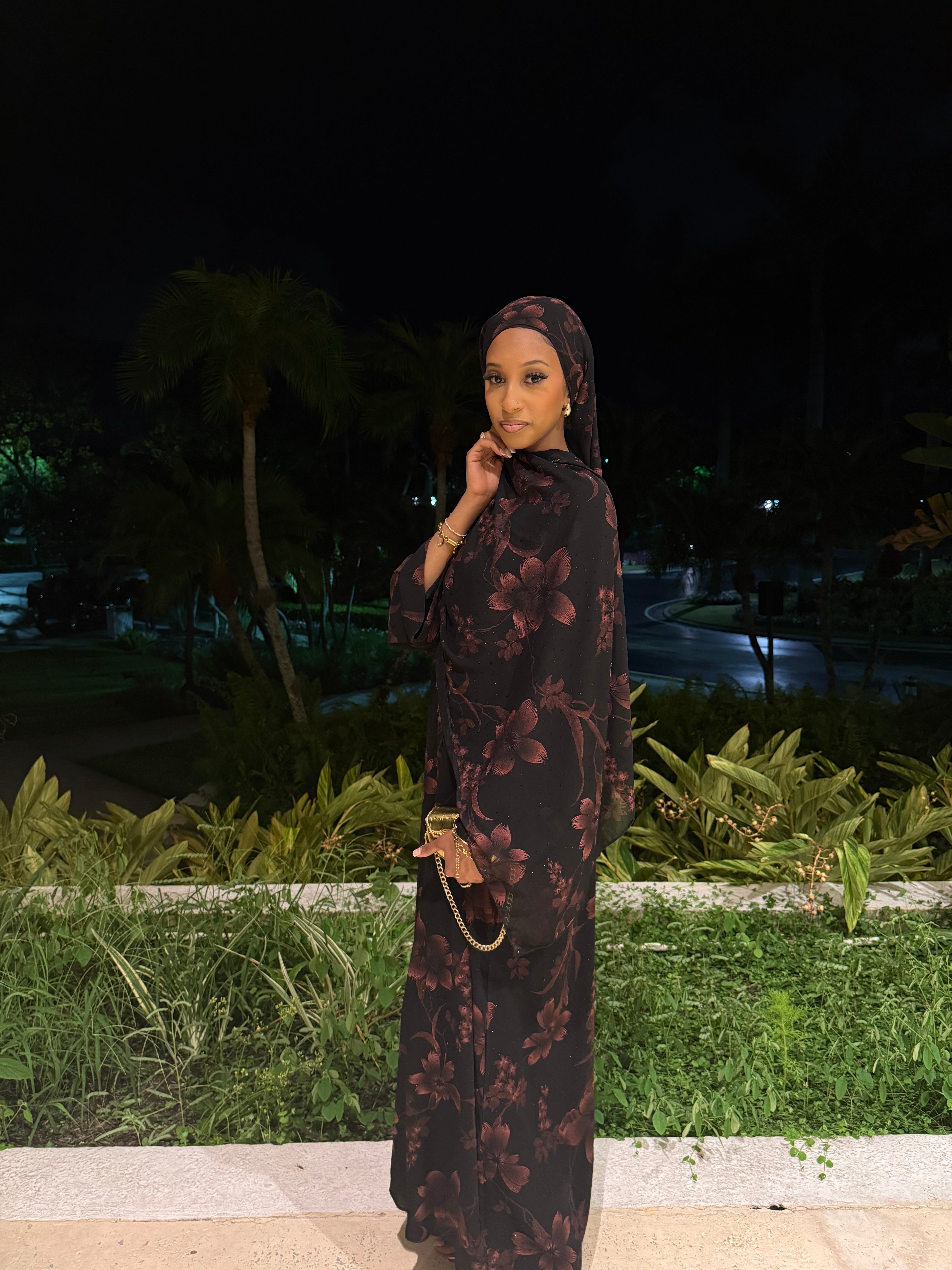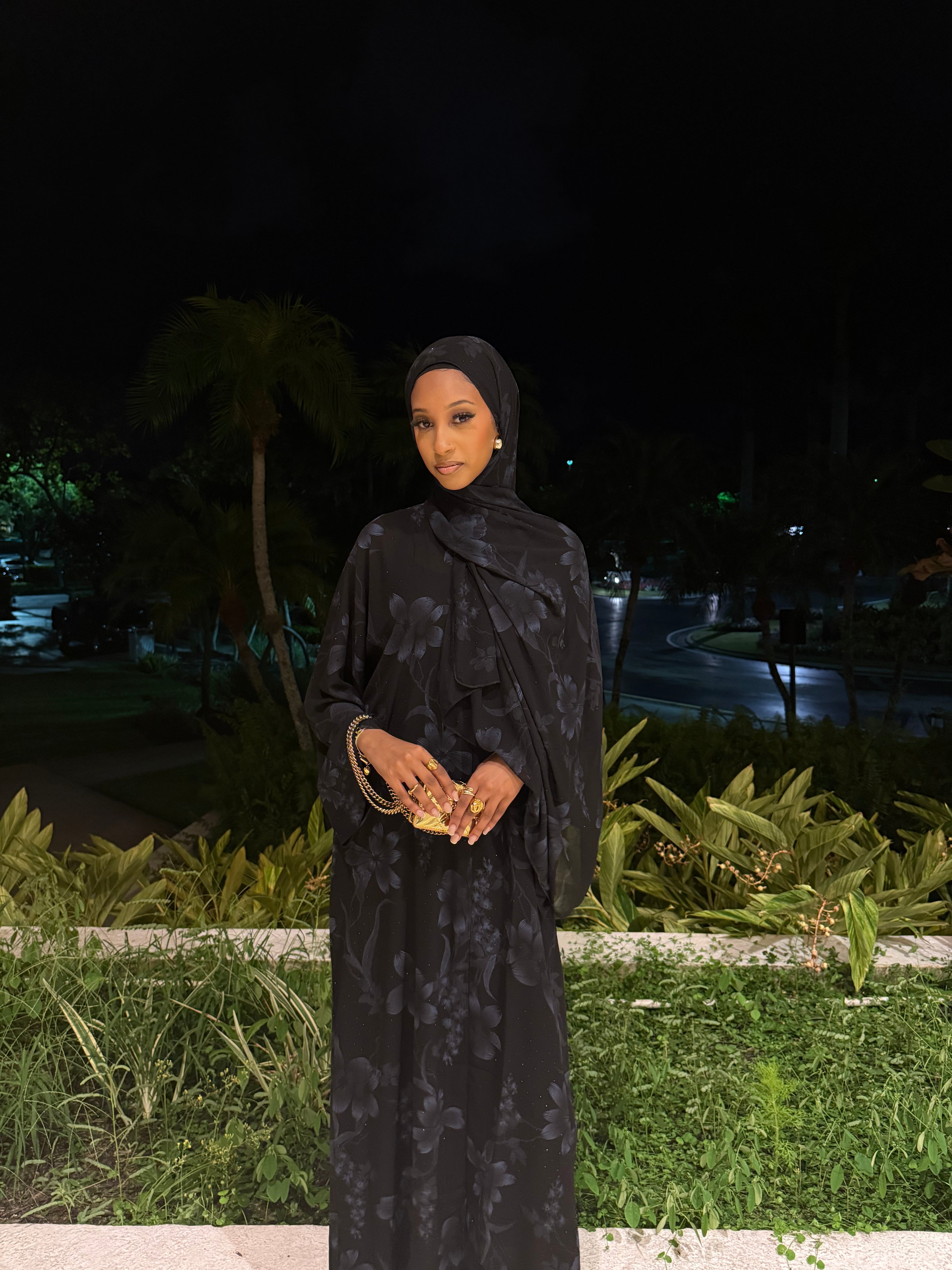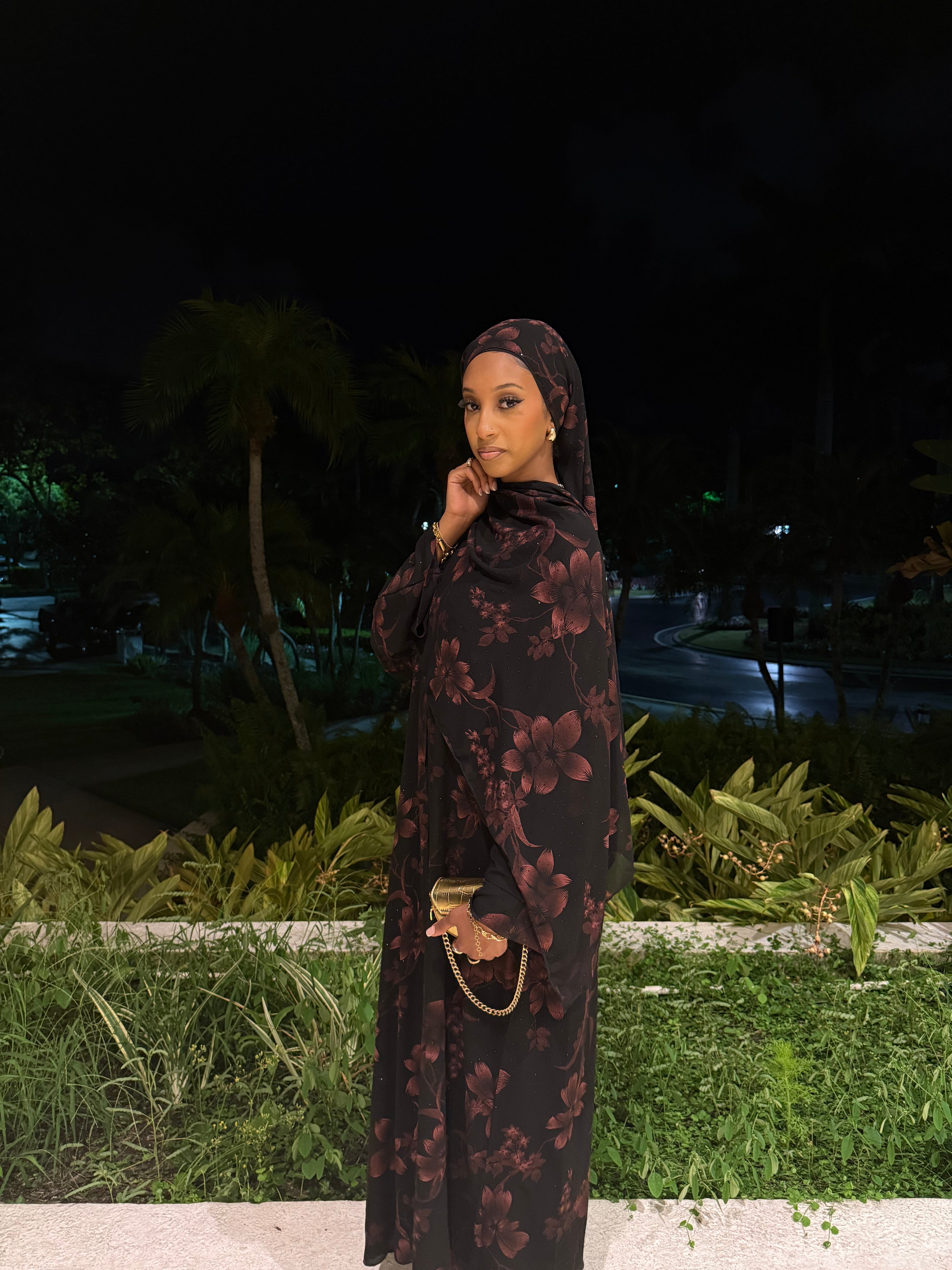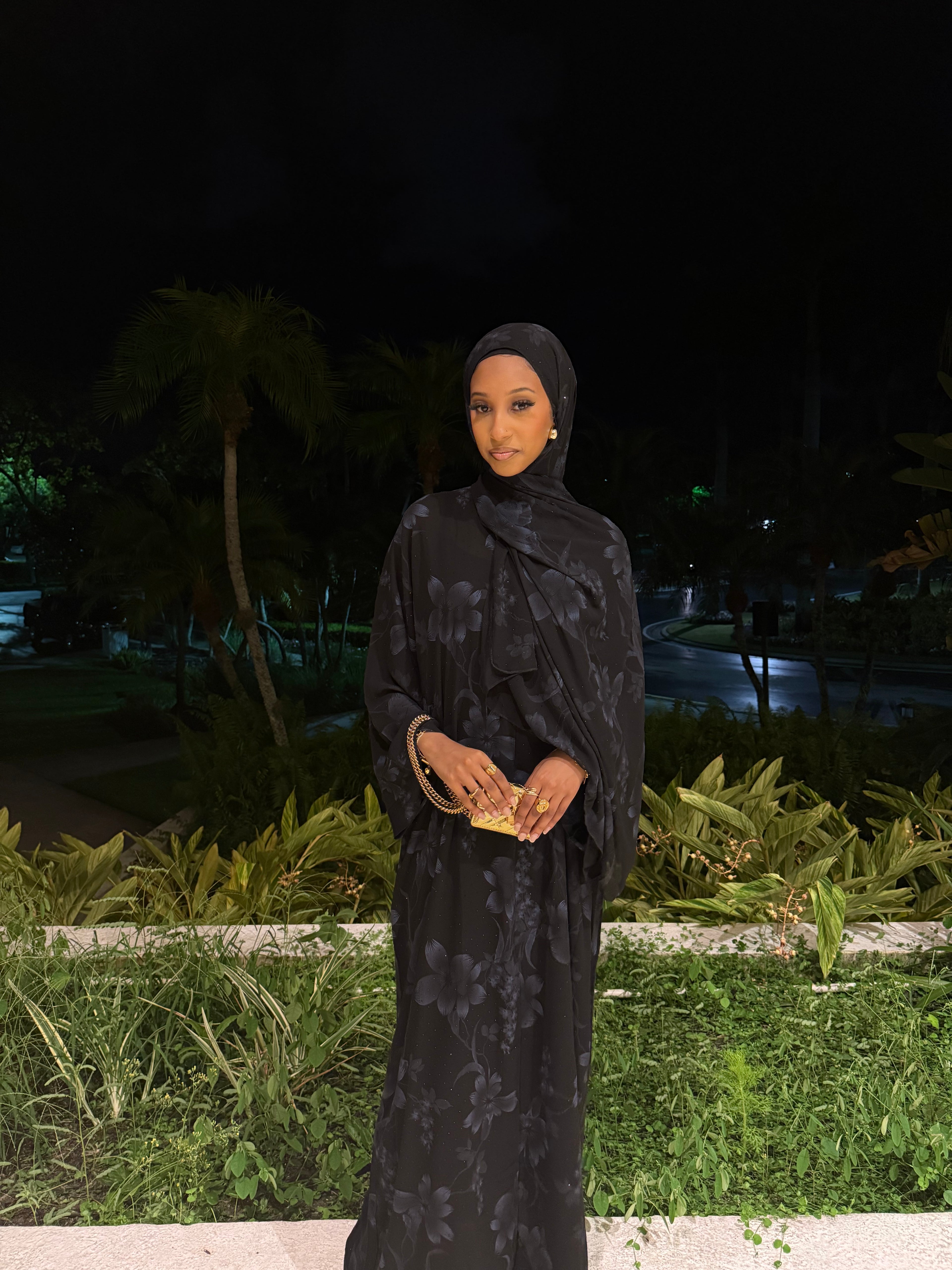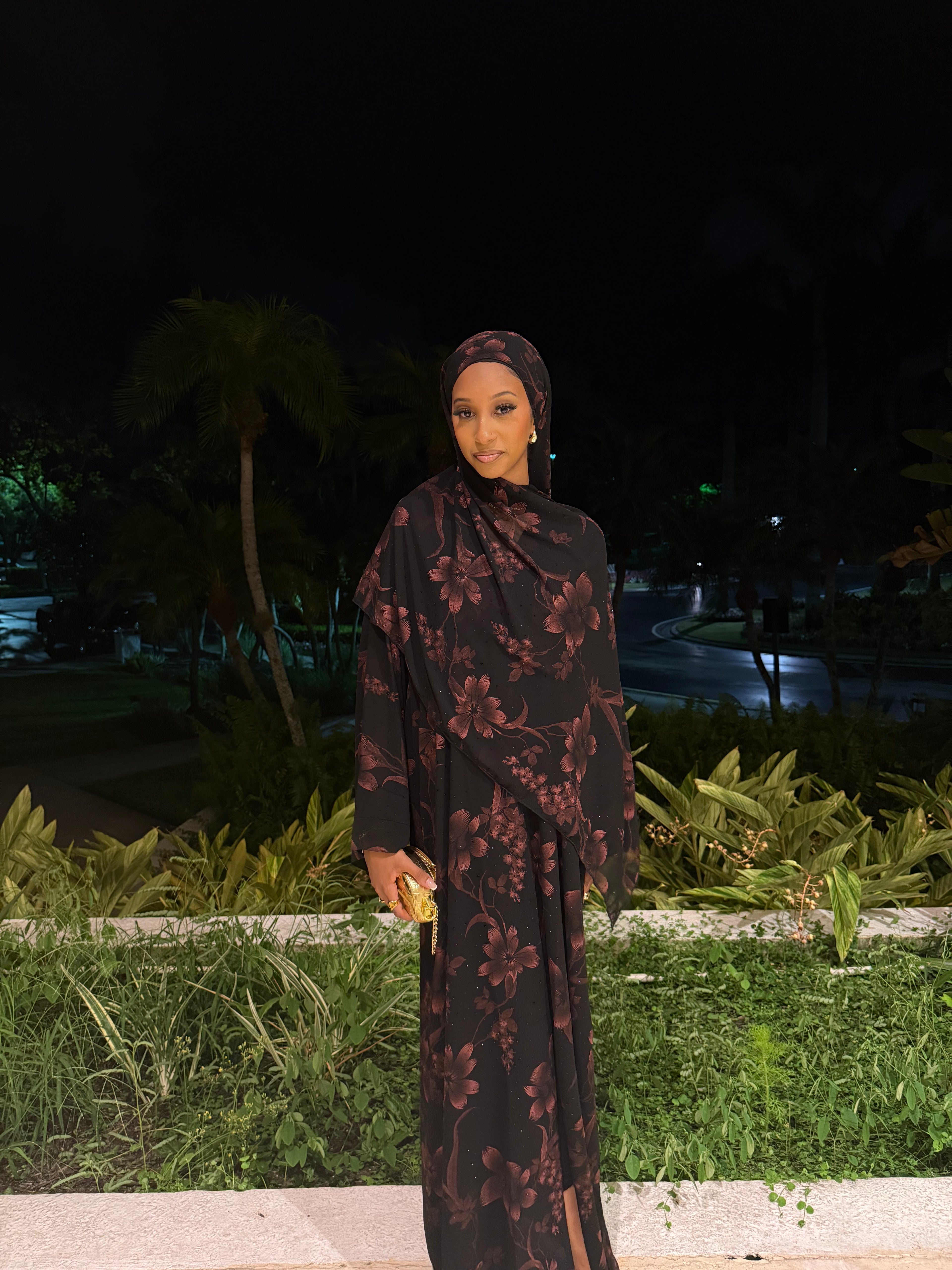 Stunning printed abaya covered in black rhinestones, on chiffon material with a matching scarf.