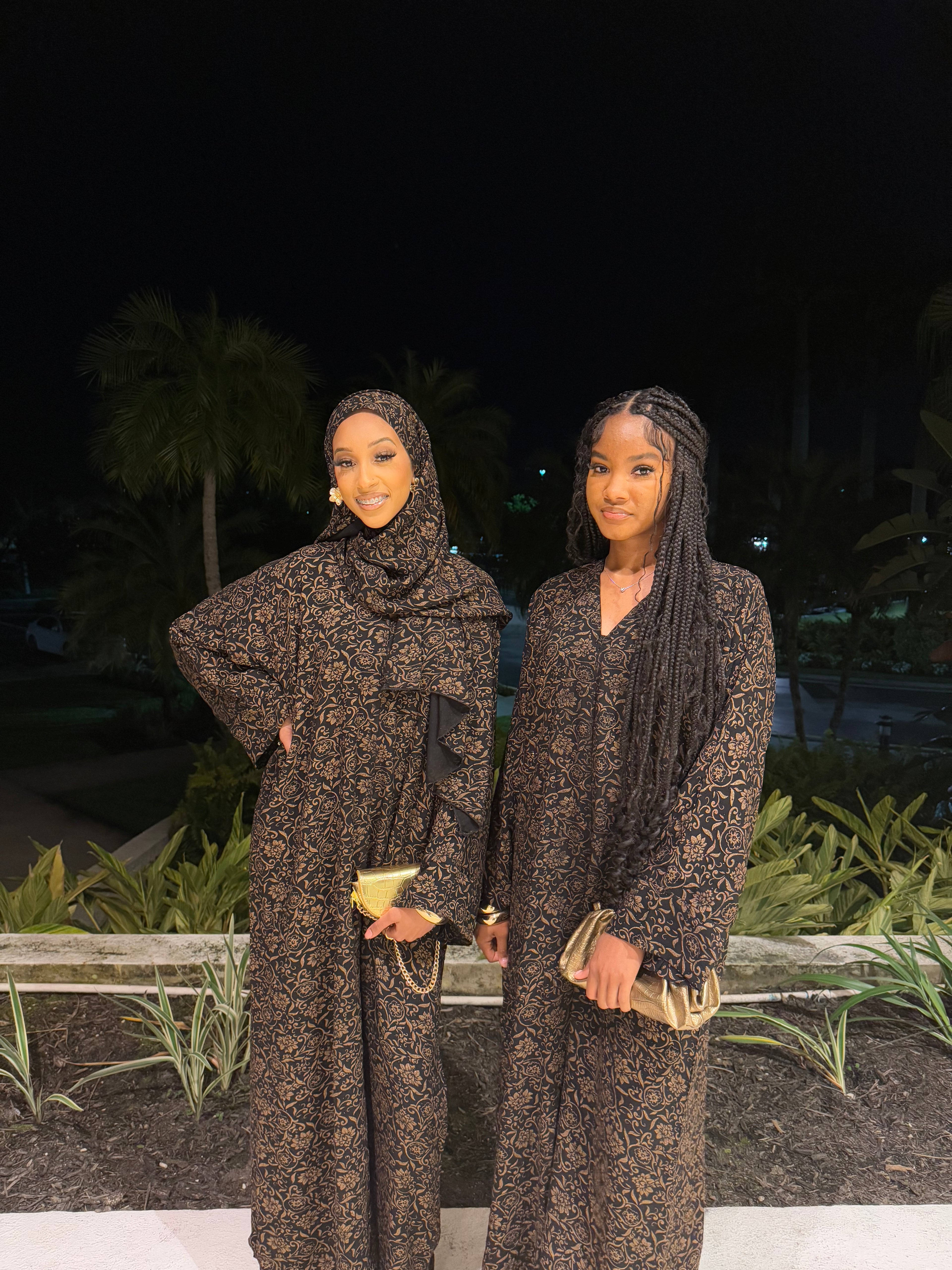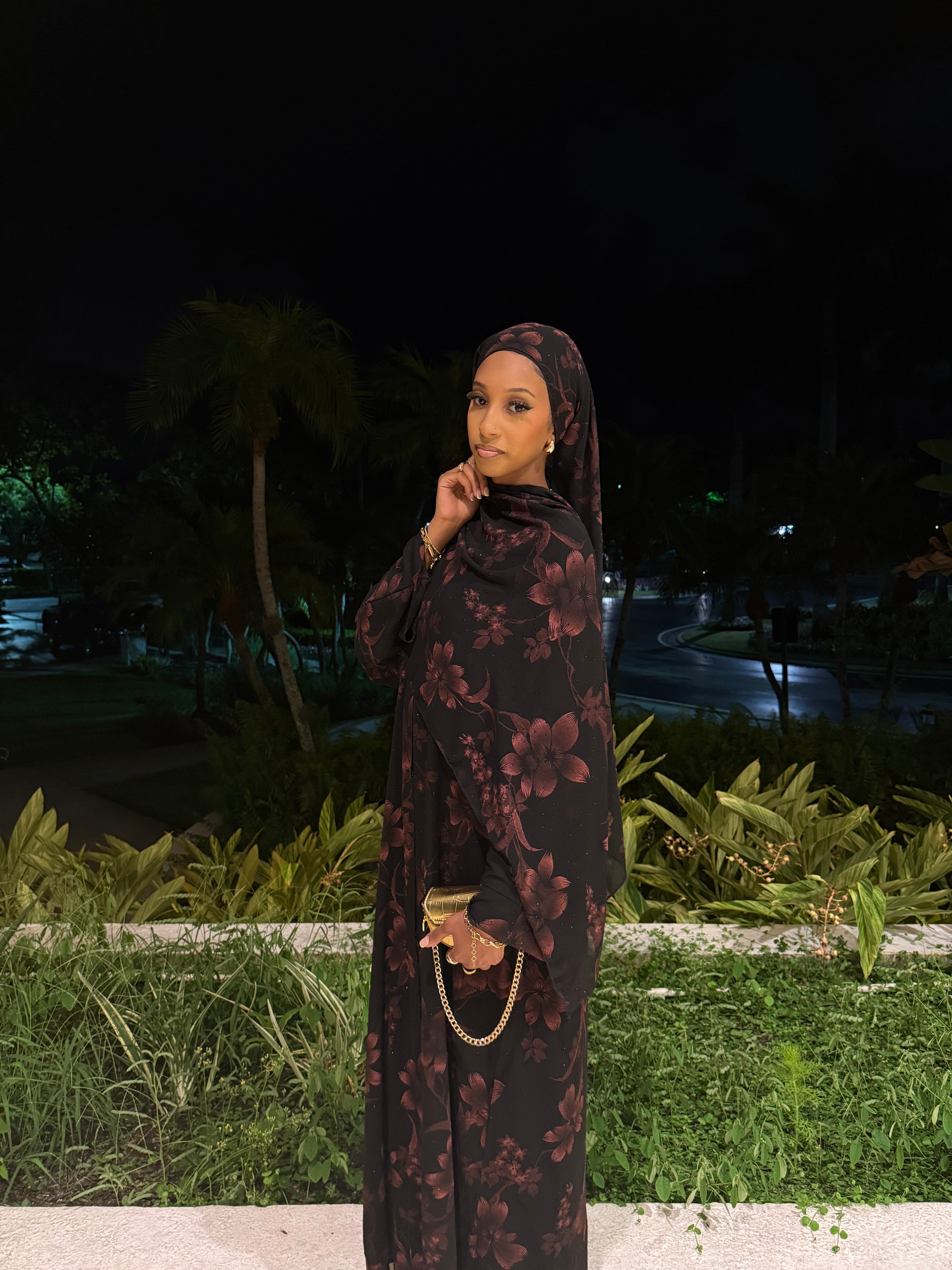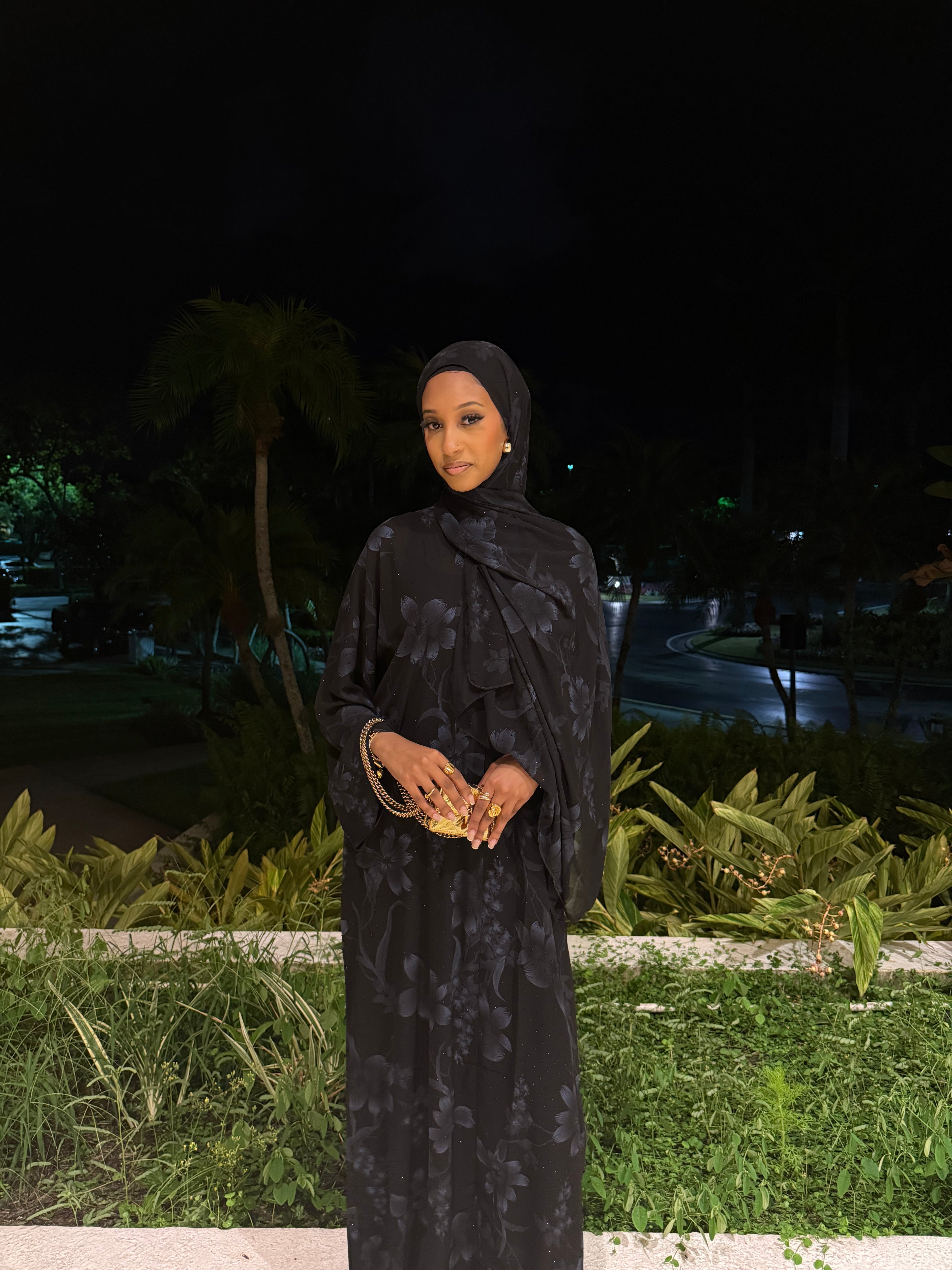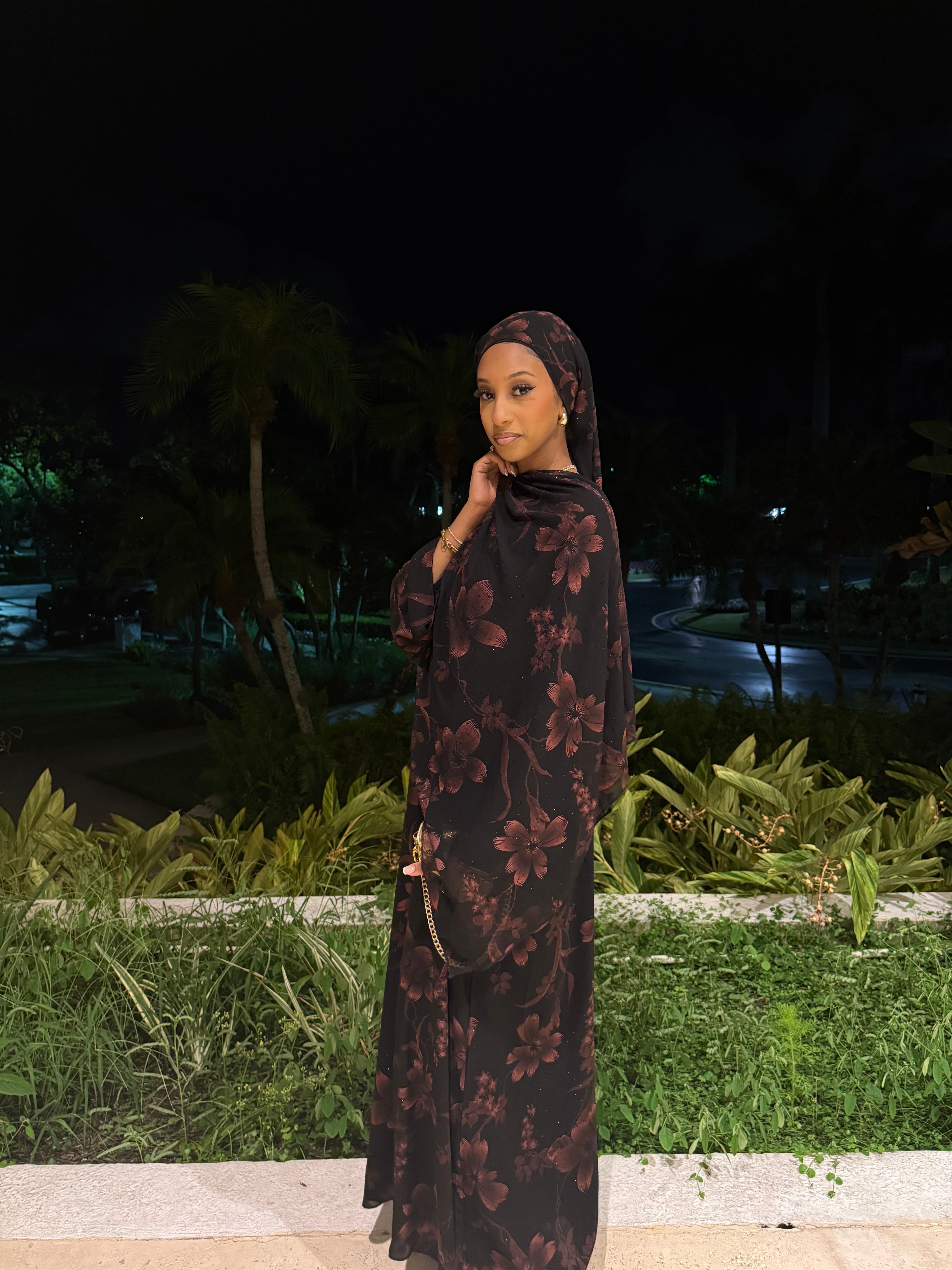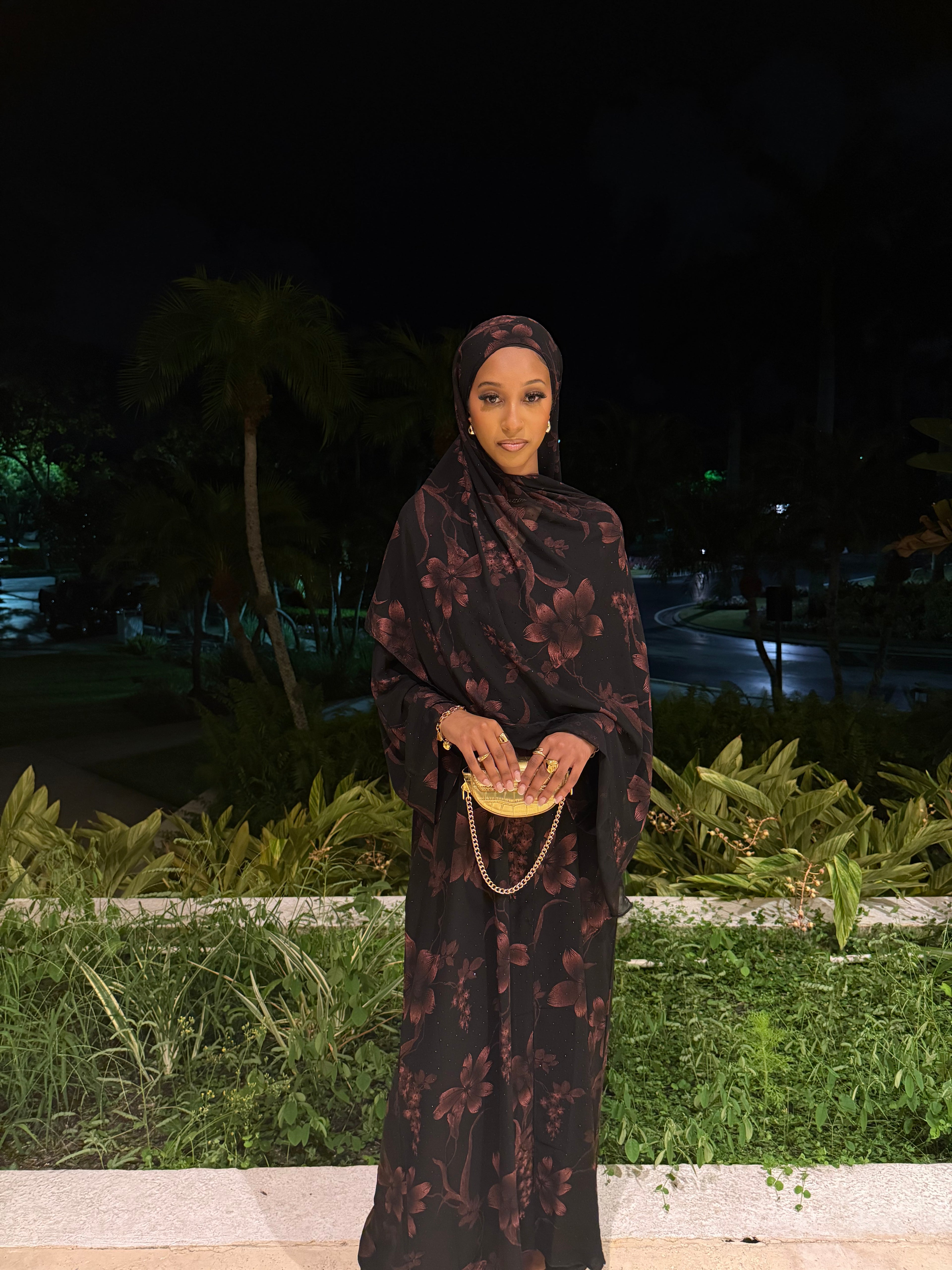 Stunning printed abaya covered in black rhinestones, on chiffon material with a matching scarf.